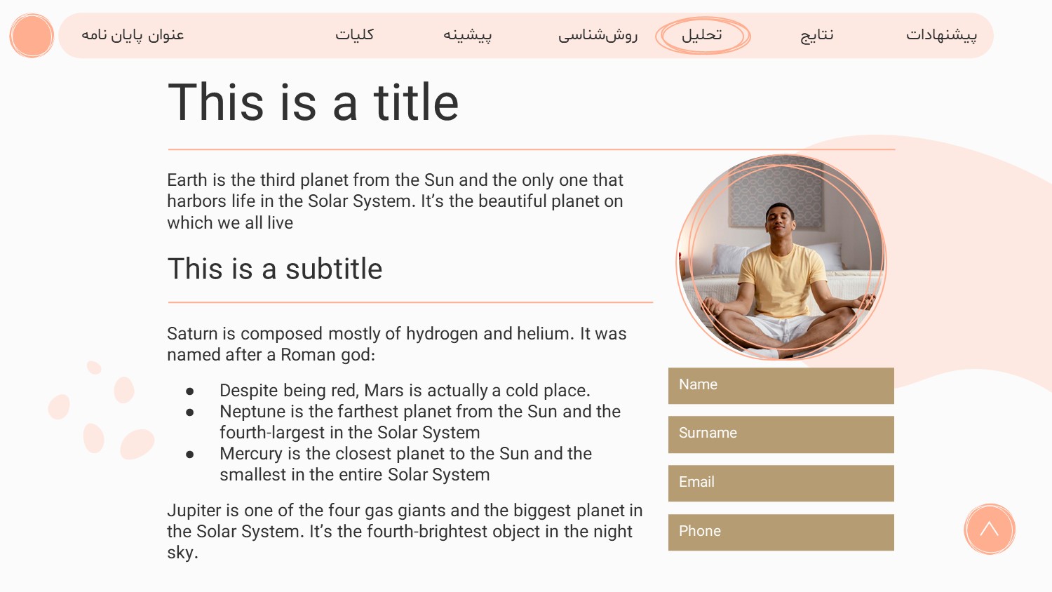 مناسب برای انواع ارائههای پایان نامه: با توجه به نوع طراحی این قالب، میتوانید از آن برای انواع ارائه های پایان نامه و دانشگاهی و … استفاده کنید.