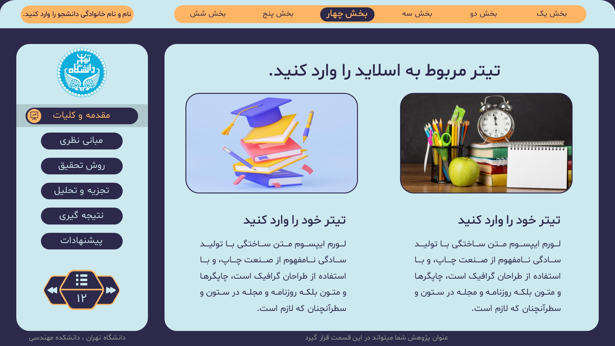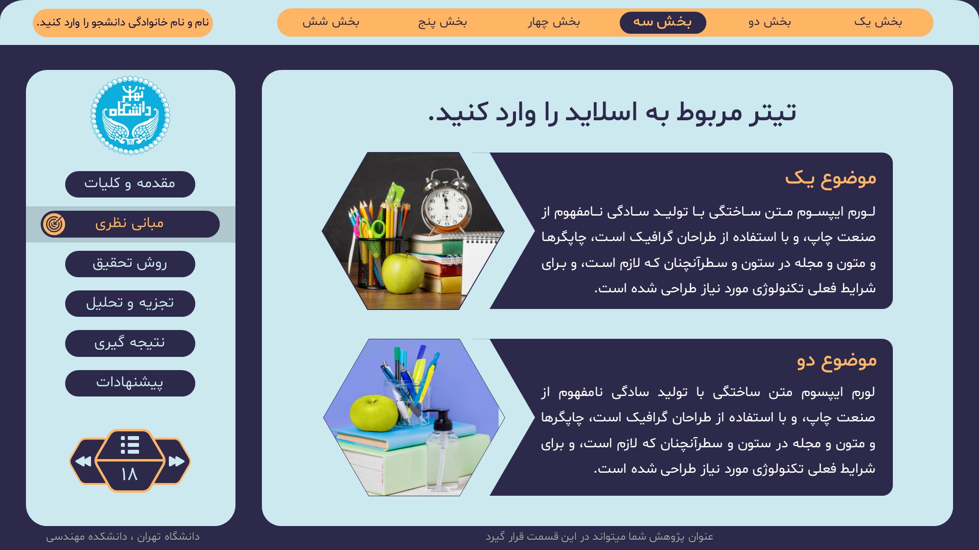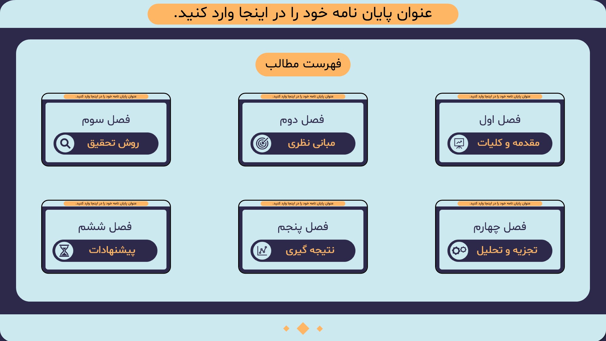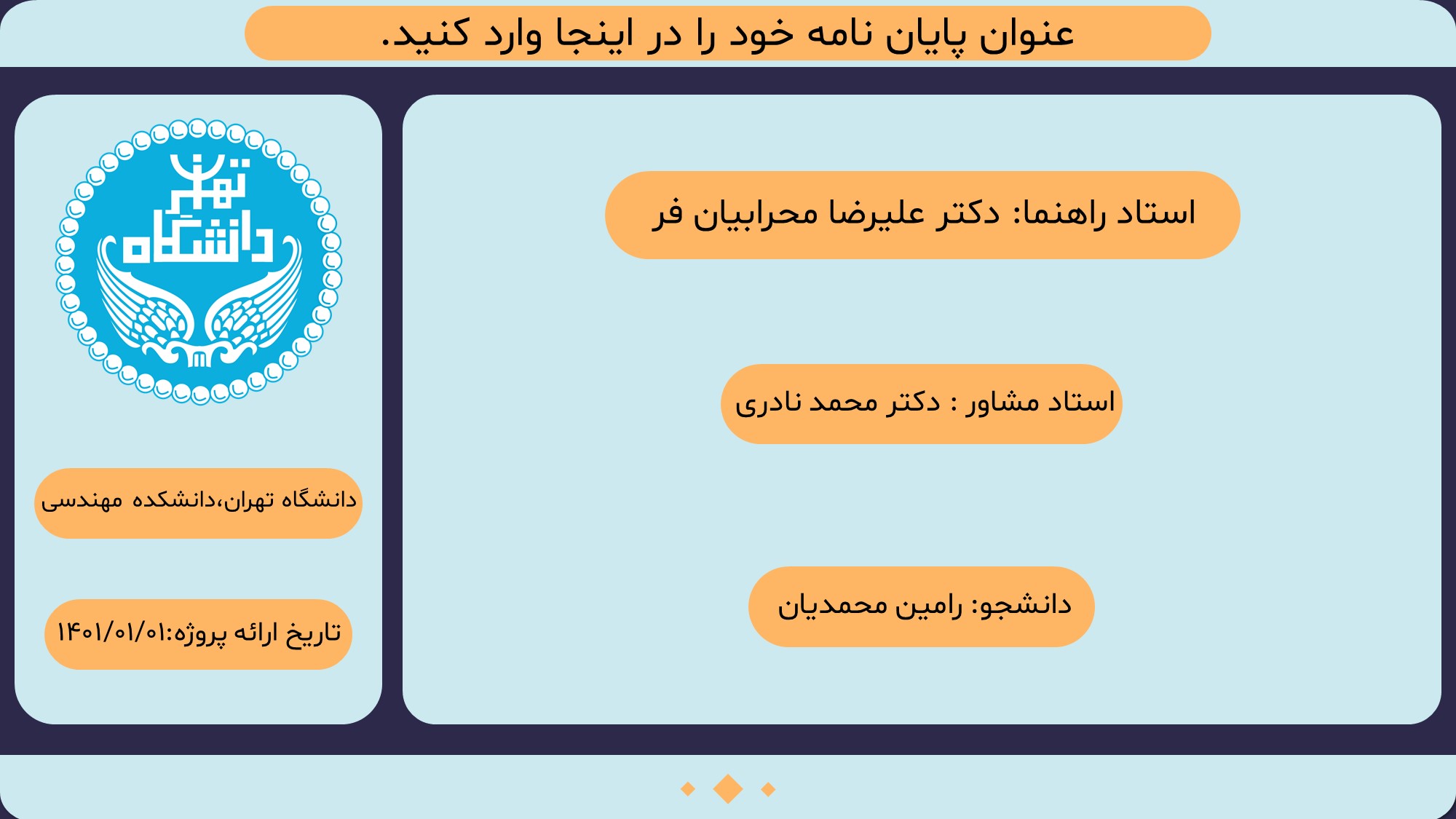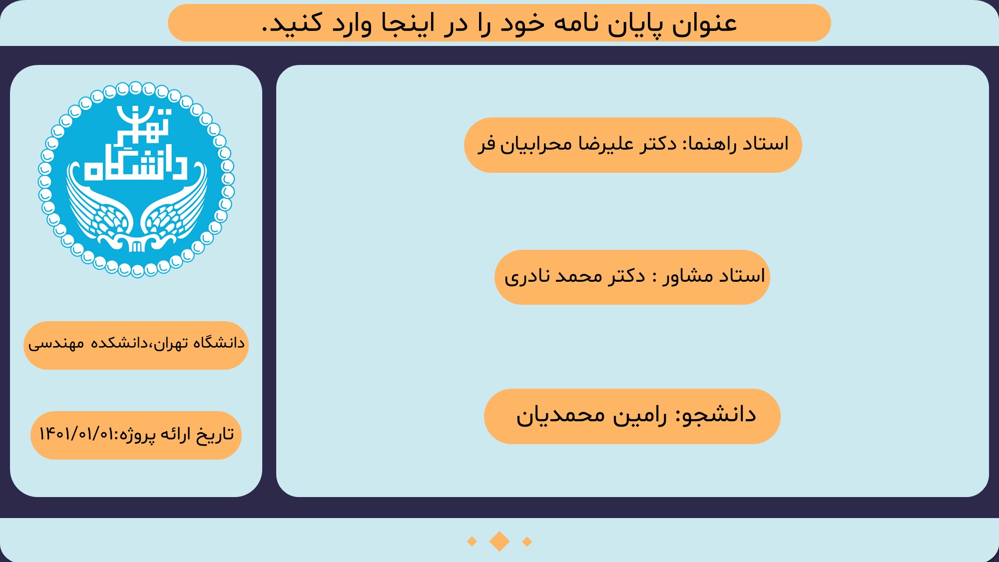 مناسب برای انواع ارائههای پایان نامه: با توجه به نوع طراحی این قالب، میتوانید از آن برای انواع ارائه های پایان نامه ارشد و دکتری و دانشگاهی و … استفاده کنید.