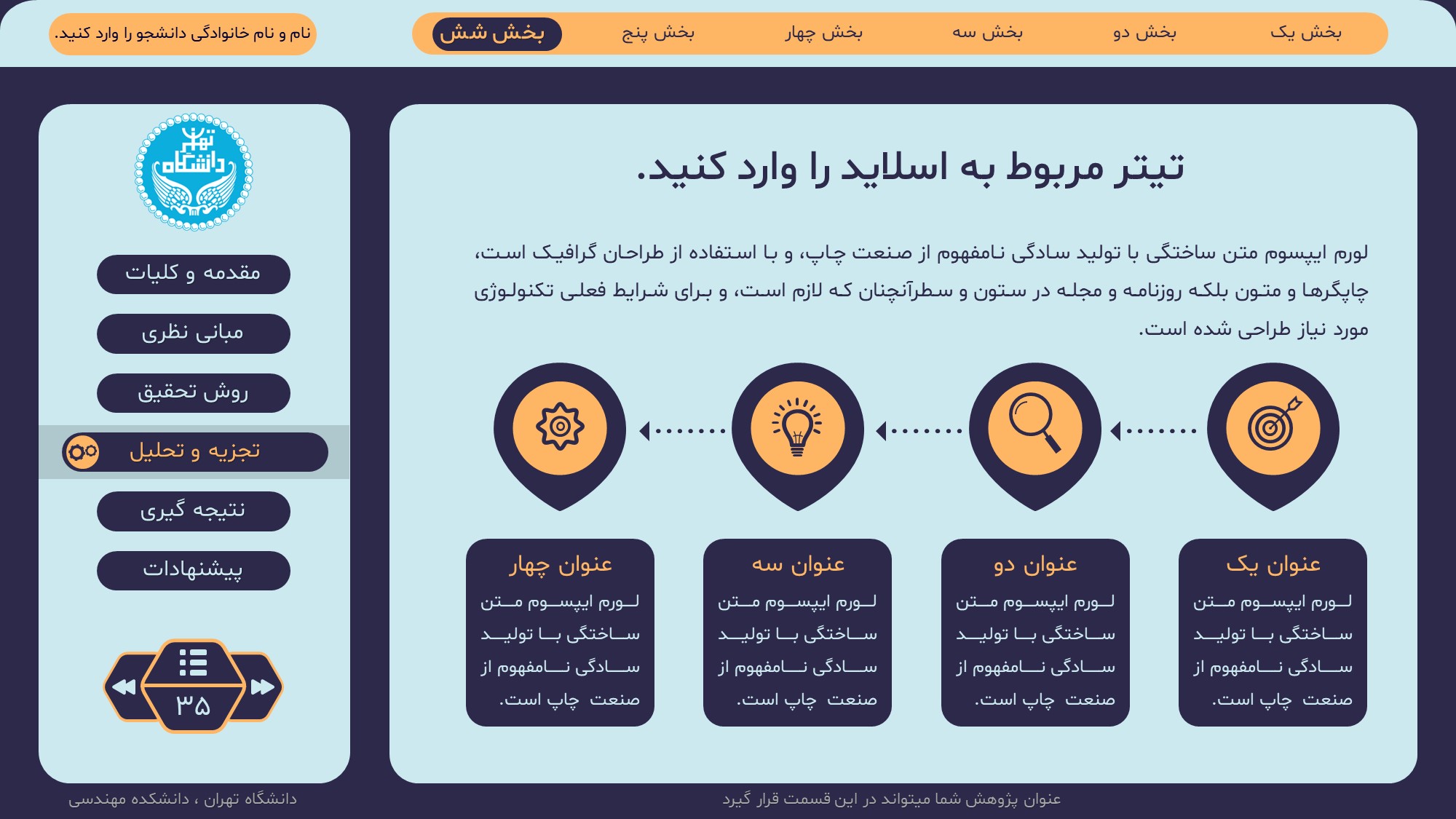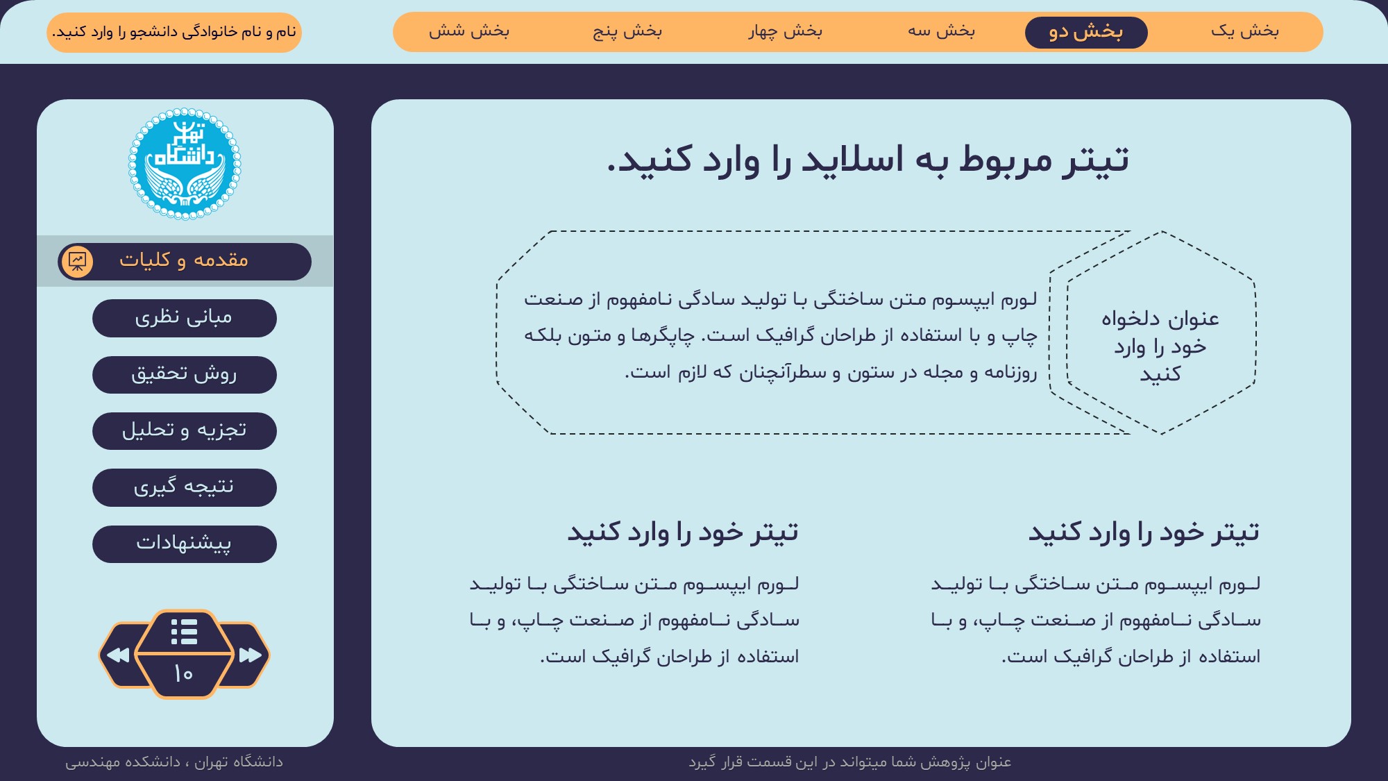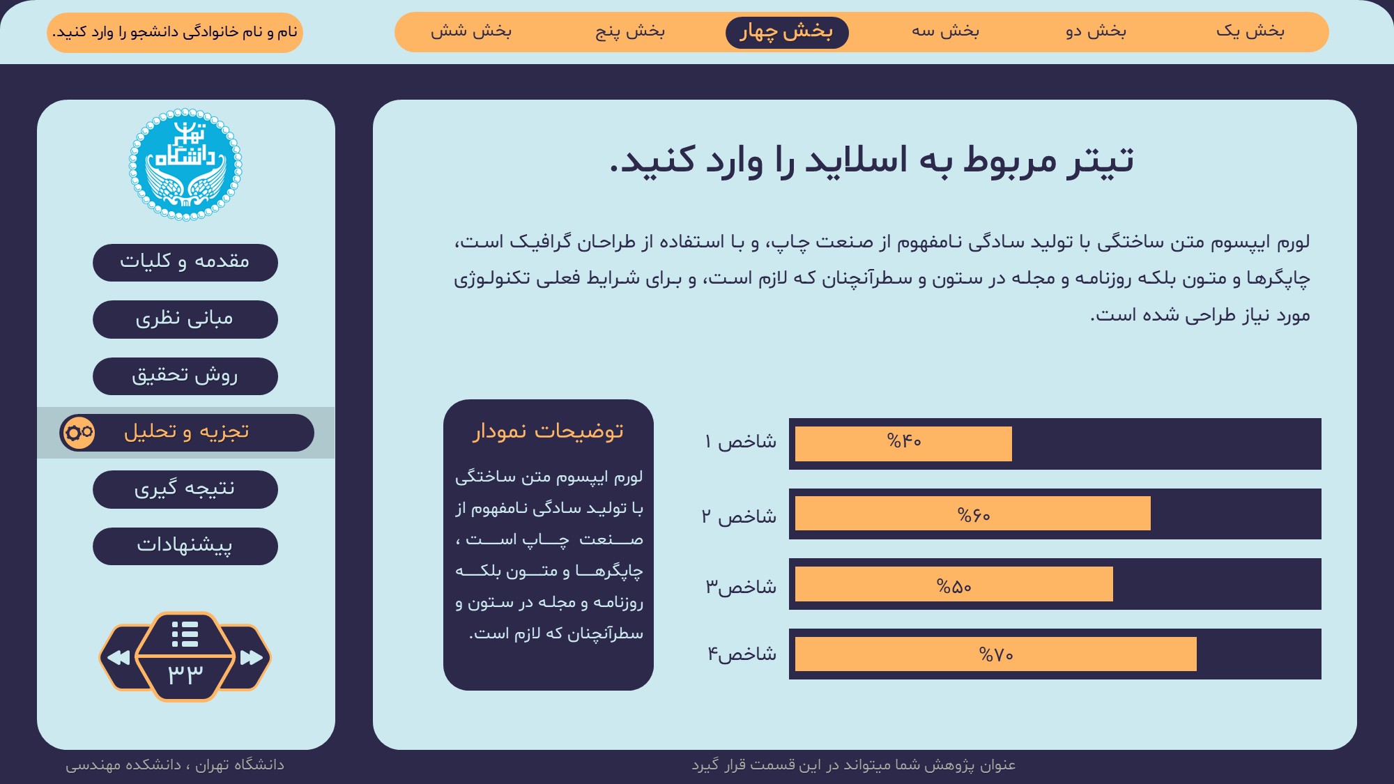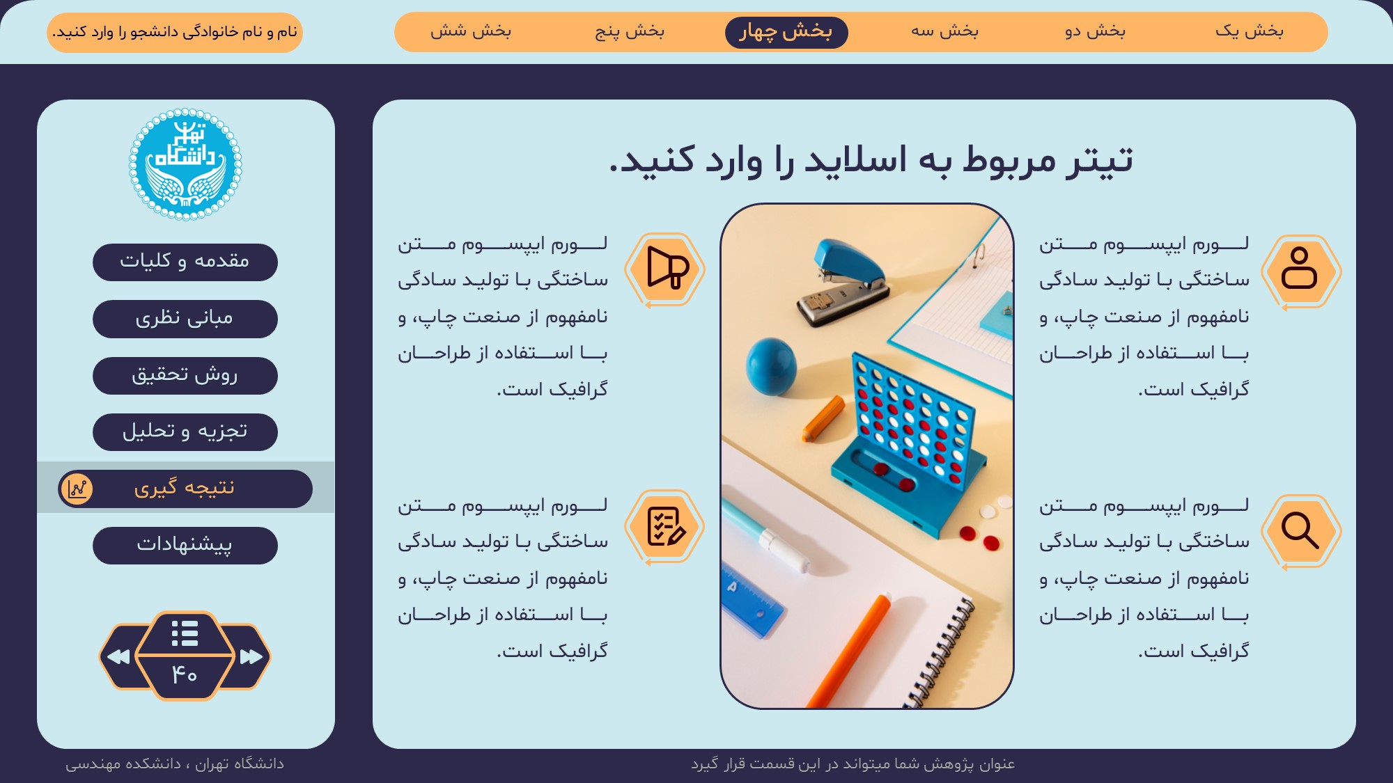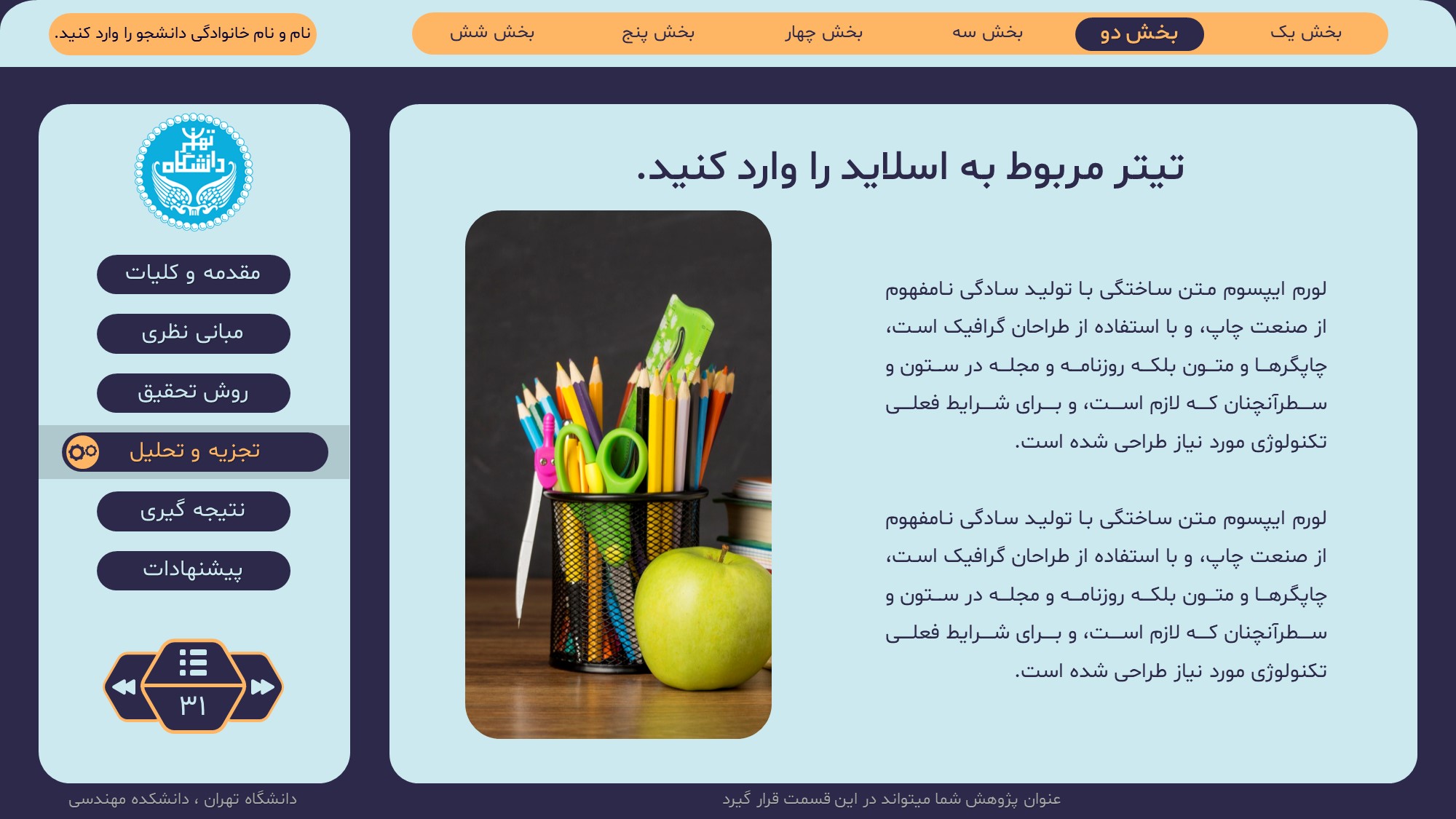 مناسب برای انواع ارائههای پایان نامه: با توجه به نوع طراحی این قالب، میتوانید از آن برای انواع ارائه های پایان نامه ارشد و دکتری و دانشگاهی و … استفاده کنید.