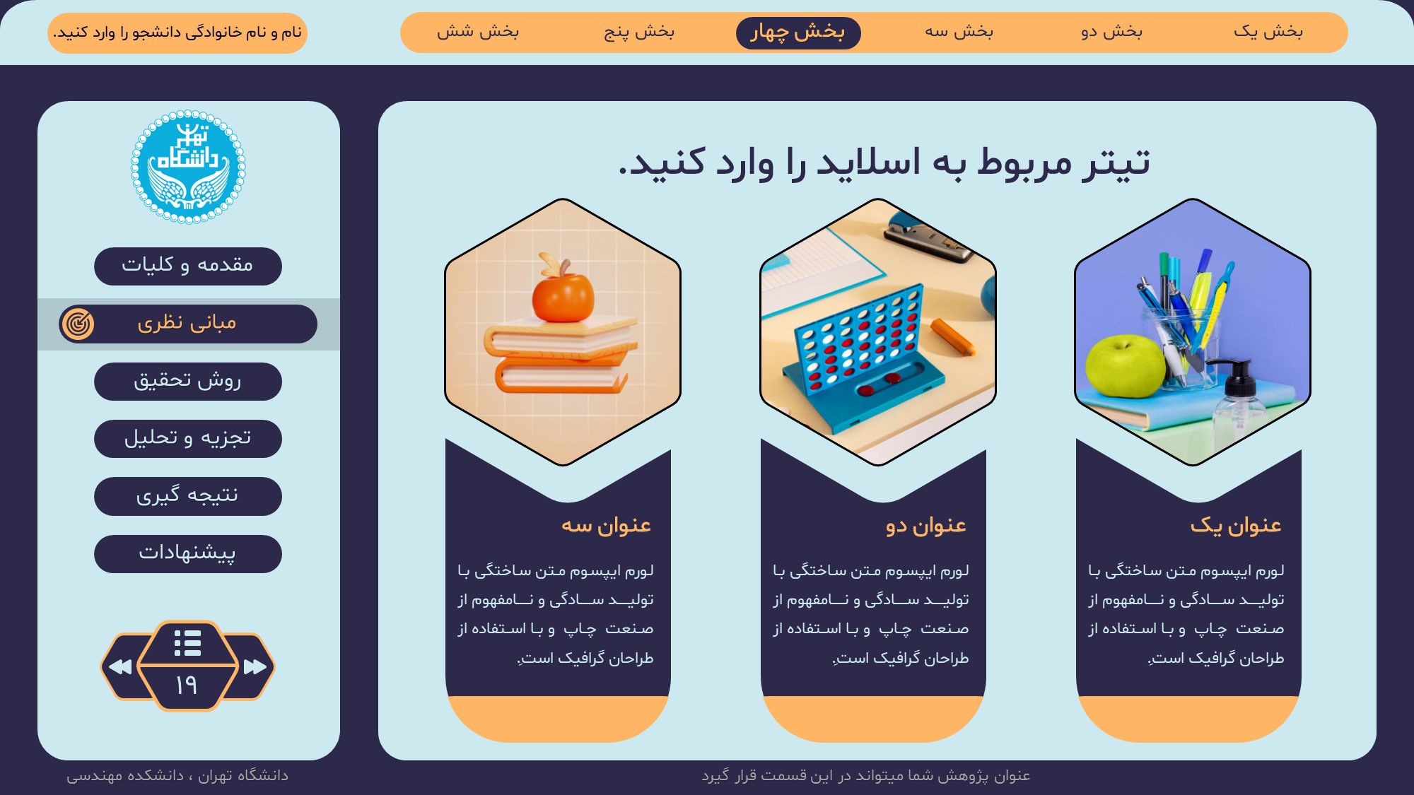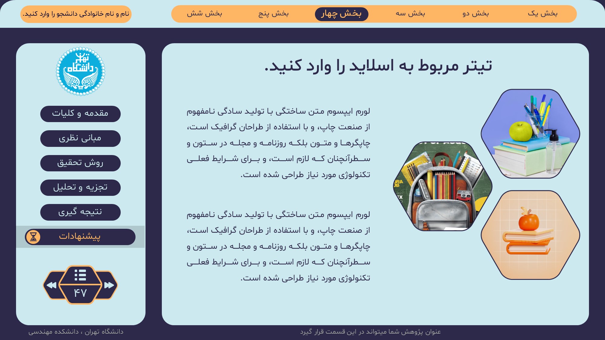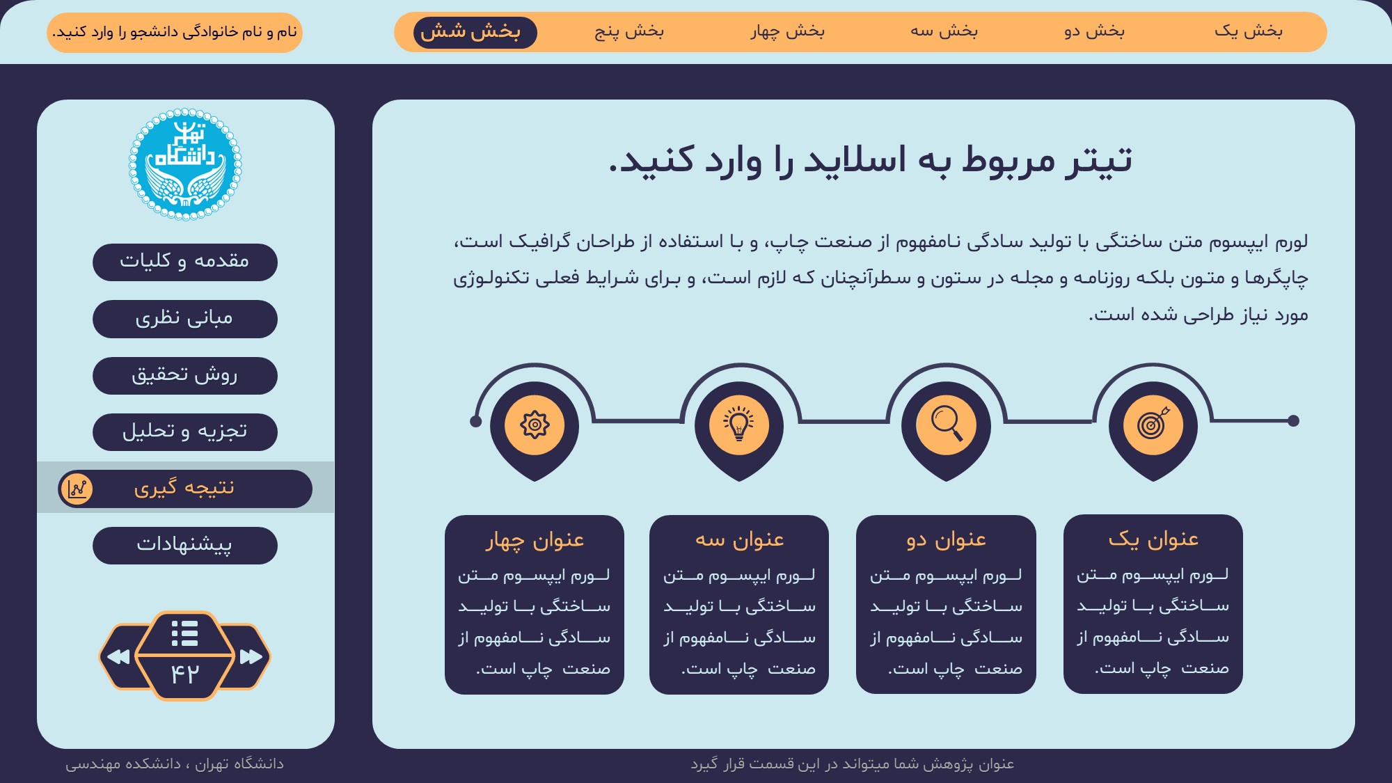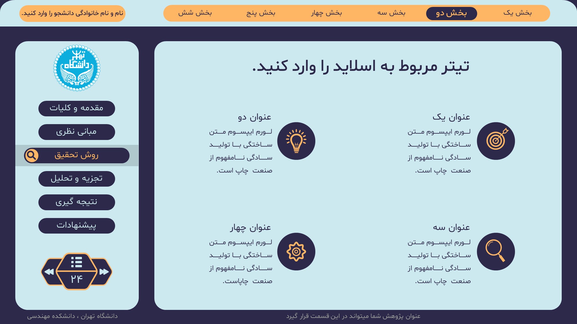مناسب برای انواع ارائههای پایان نامه: با توجه به نوع طراحی این قالب، میتوانید از آن برای انواع ارائه های پایان نامه ارشد و دکتری و دانشگاهی و … استفاده کنید.