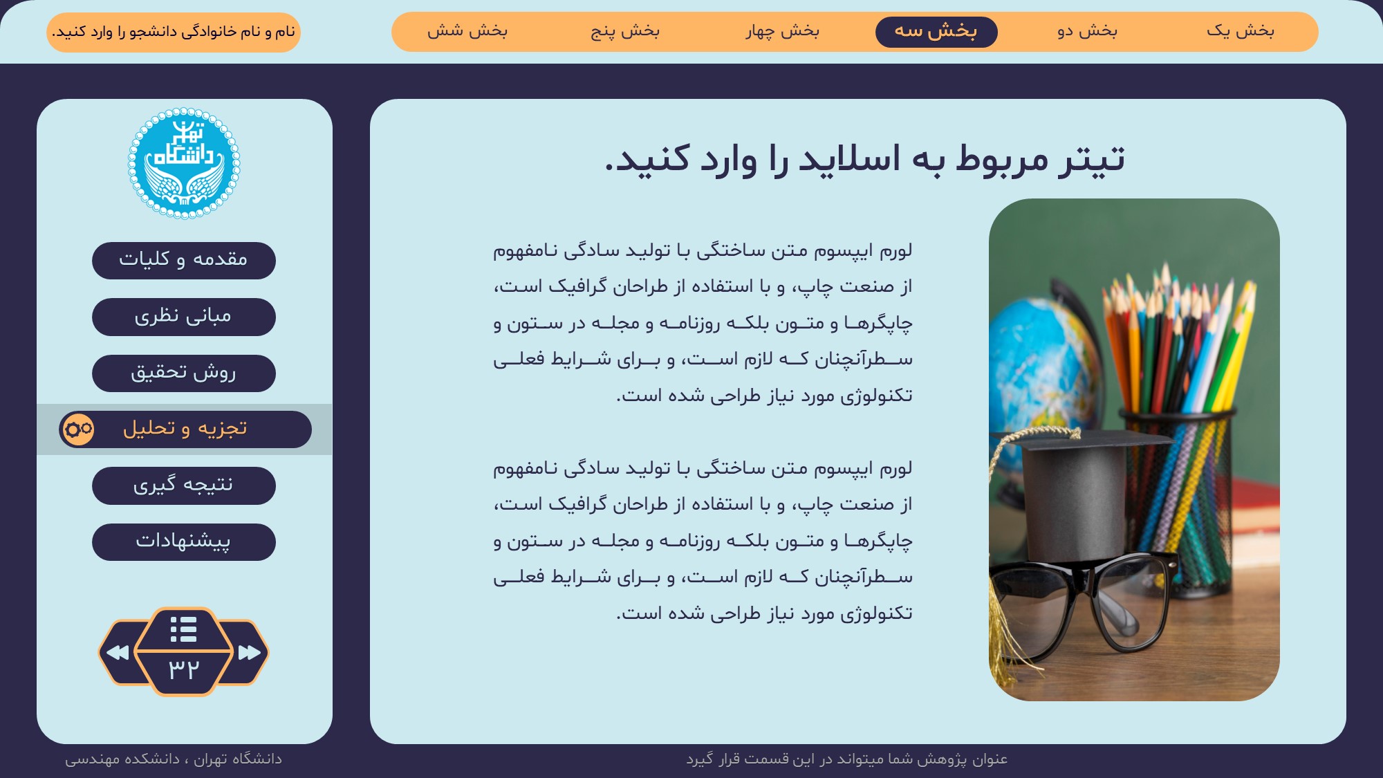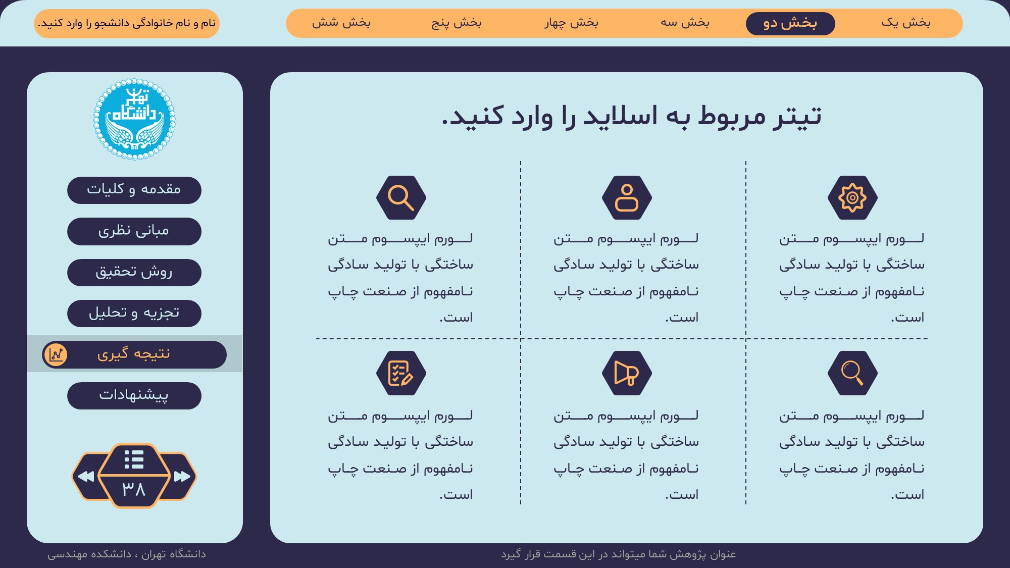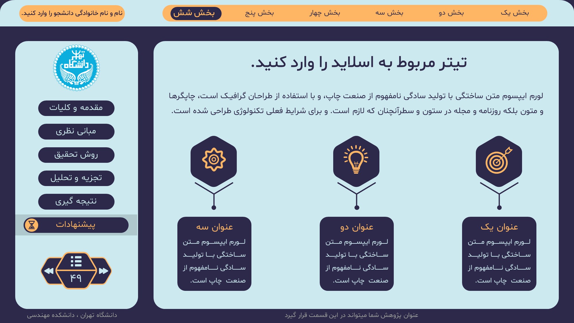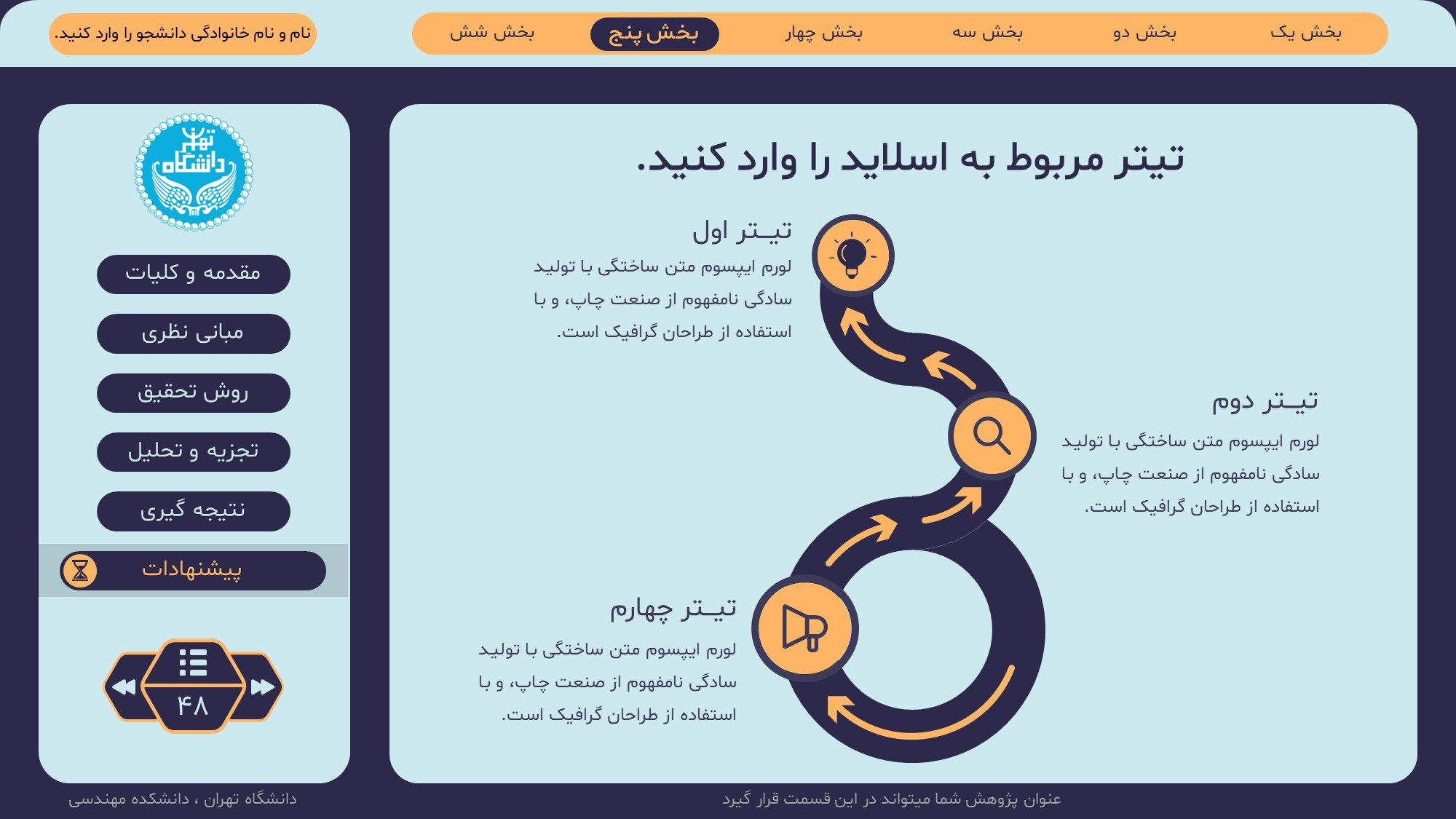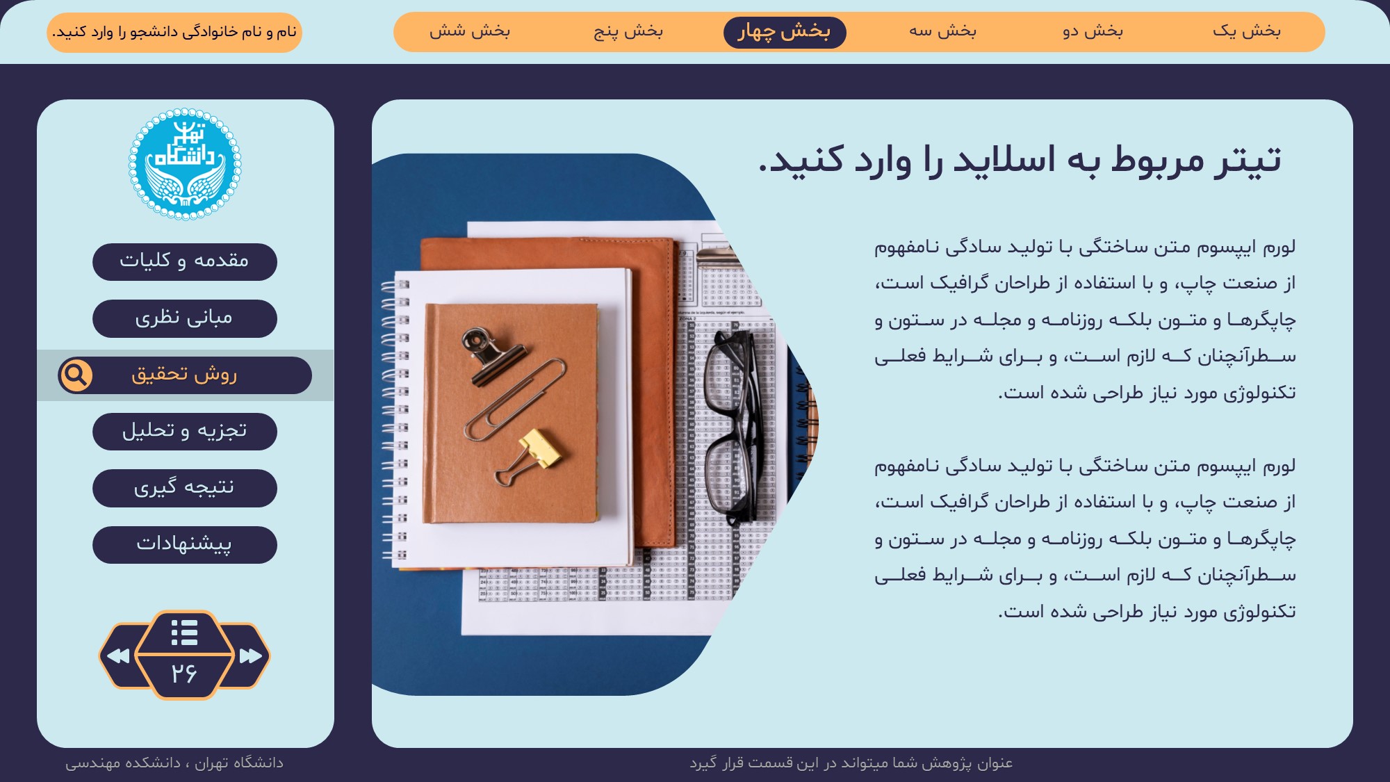 مناسب برای انواع ارائههای پایان نامه: با توجه به نوع طراحی این قالب، میتوانید از آن برای انواع ارائه های پایان نامه ارشد و دکتری و دانشگاهی و … استفاده کنید.