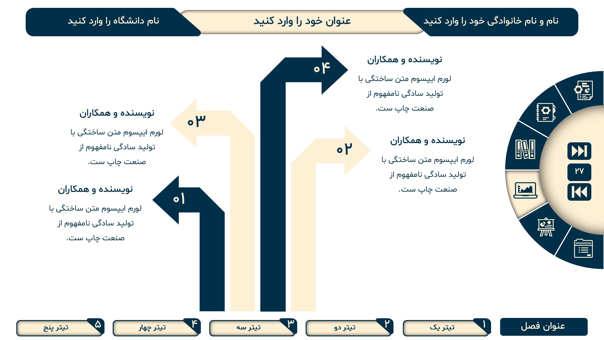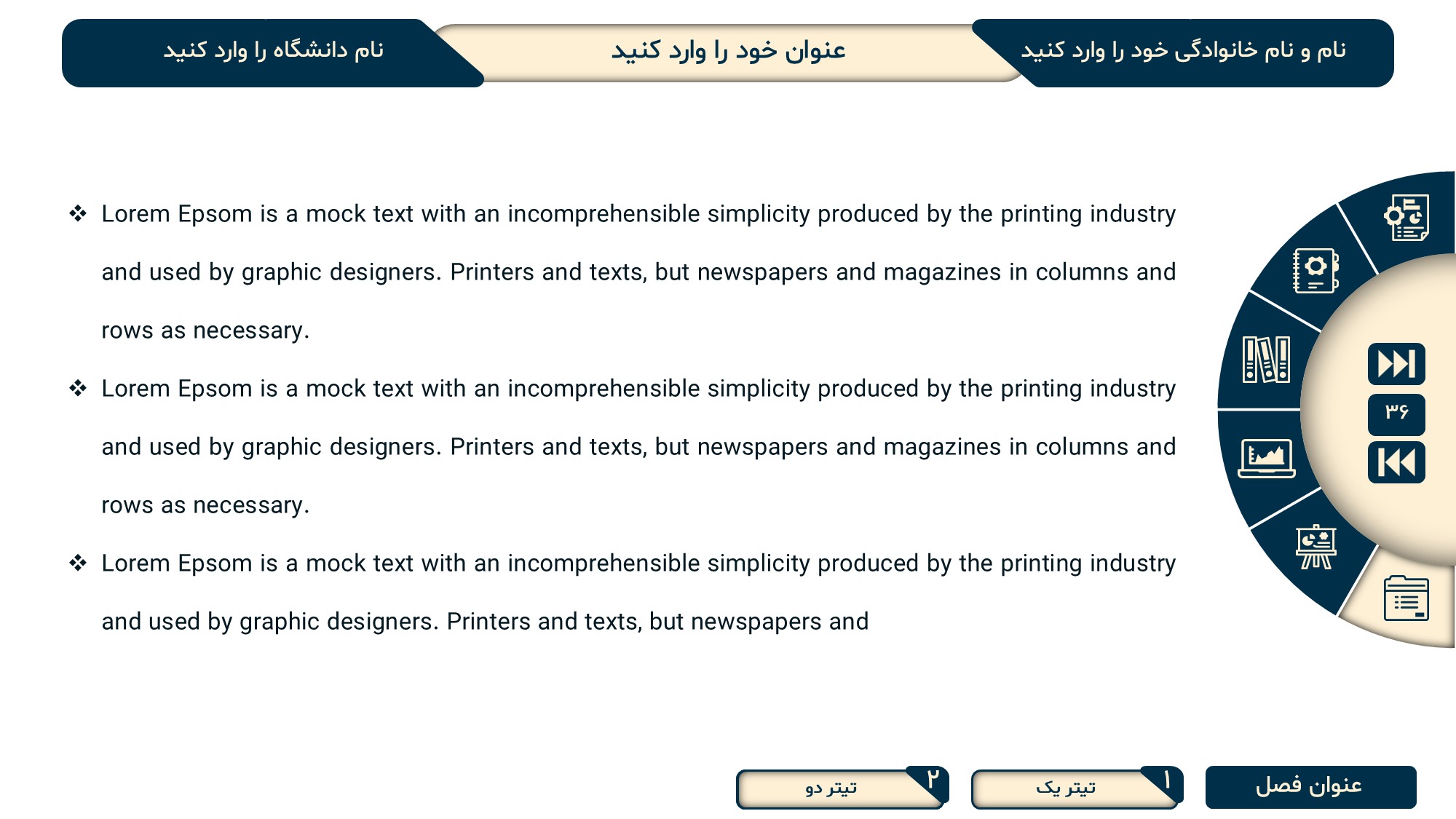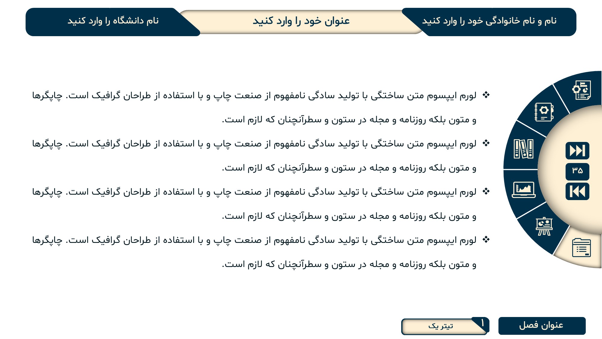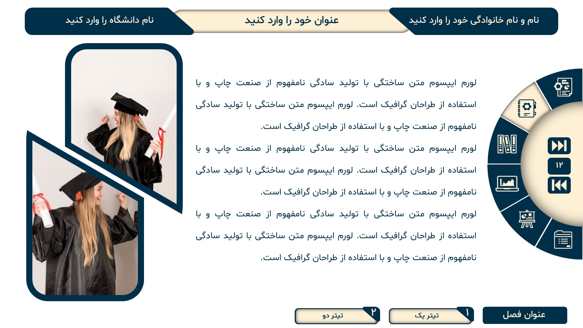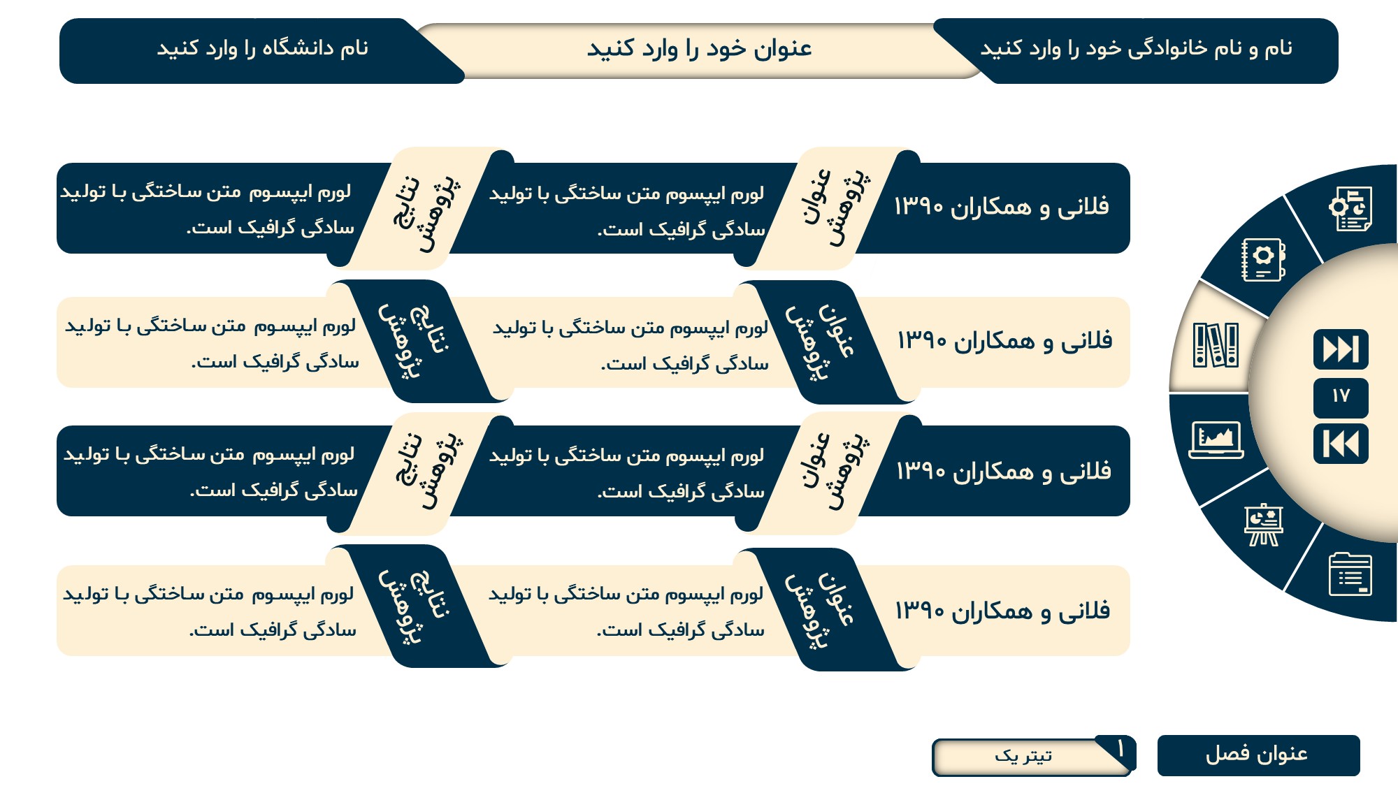 مناسب برای انواع ارائههای پایان نامه: با توجه به نوع طراحی این قالب، میتوانید از آن برای انواع ارائه های پایان نامه ارشد و دکتری و همچنین دانشگاهی استفاده کنید.