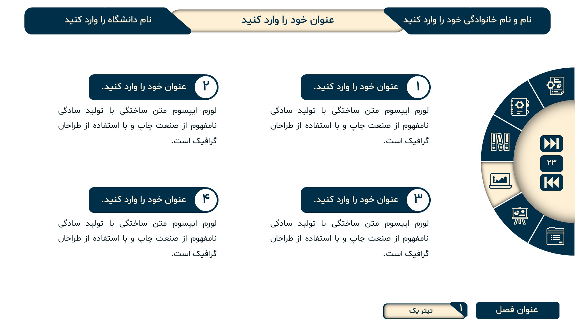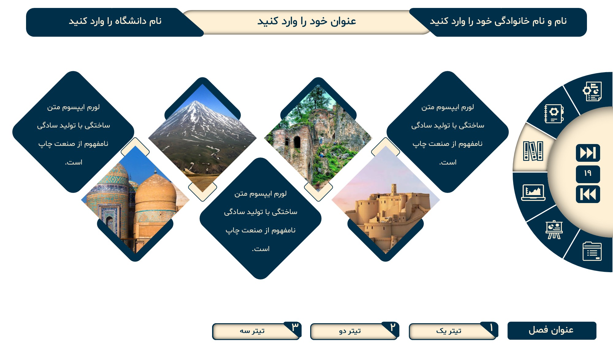 قابلیت تغییر آیکن: دارد. تمامی آیکن های منو و المان های استفاده شده در اسلایدها را میتوانید تغییر دهید.