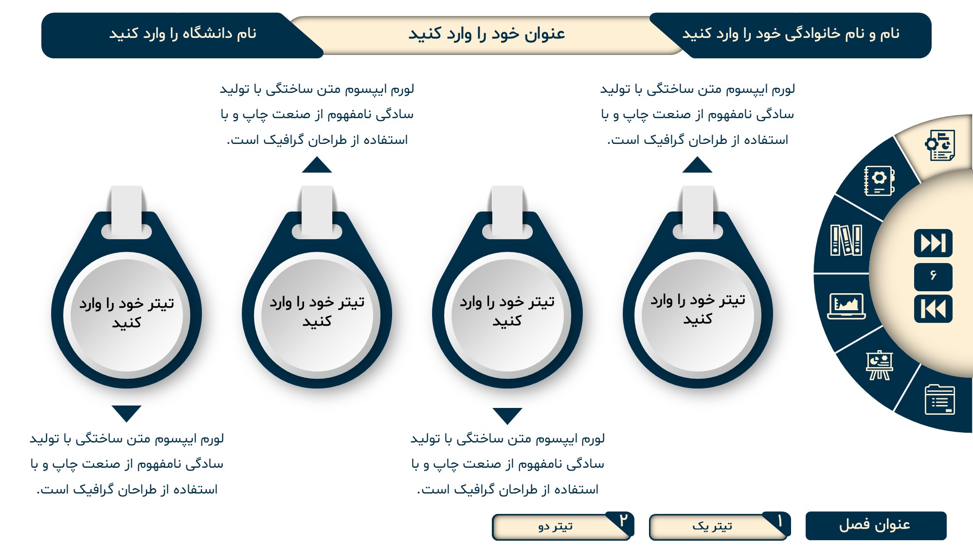 در آپدیت جدید سه فایل پاورپوینت با رنگ بندی رسمی و جذاب برای شما قرار داده شده است که 5 منو، 6 منو و 7 منو میباشند و همگی آنها به صورت کامل لینک شده هستند. با توجه به متنوع بودن تعداد منوها، این قالب کاملا مناسب ارائه های پایان نامه ارشد و دکتری، پروپوزال و… میباشد.