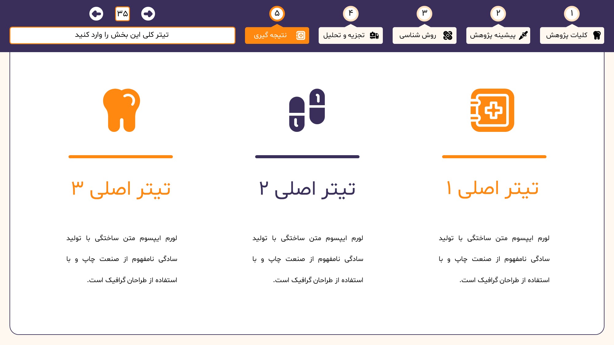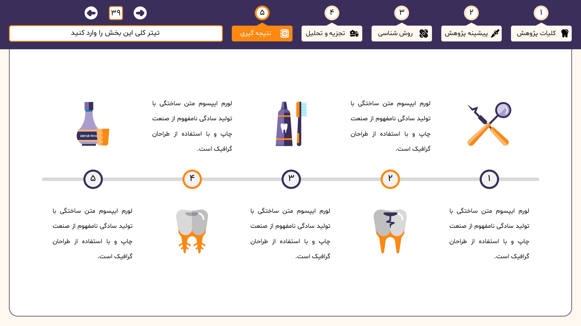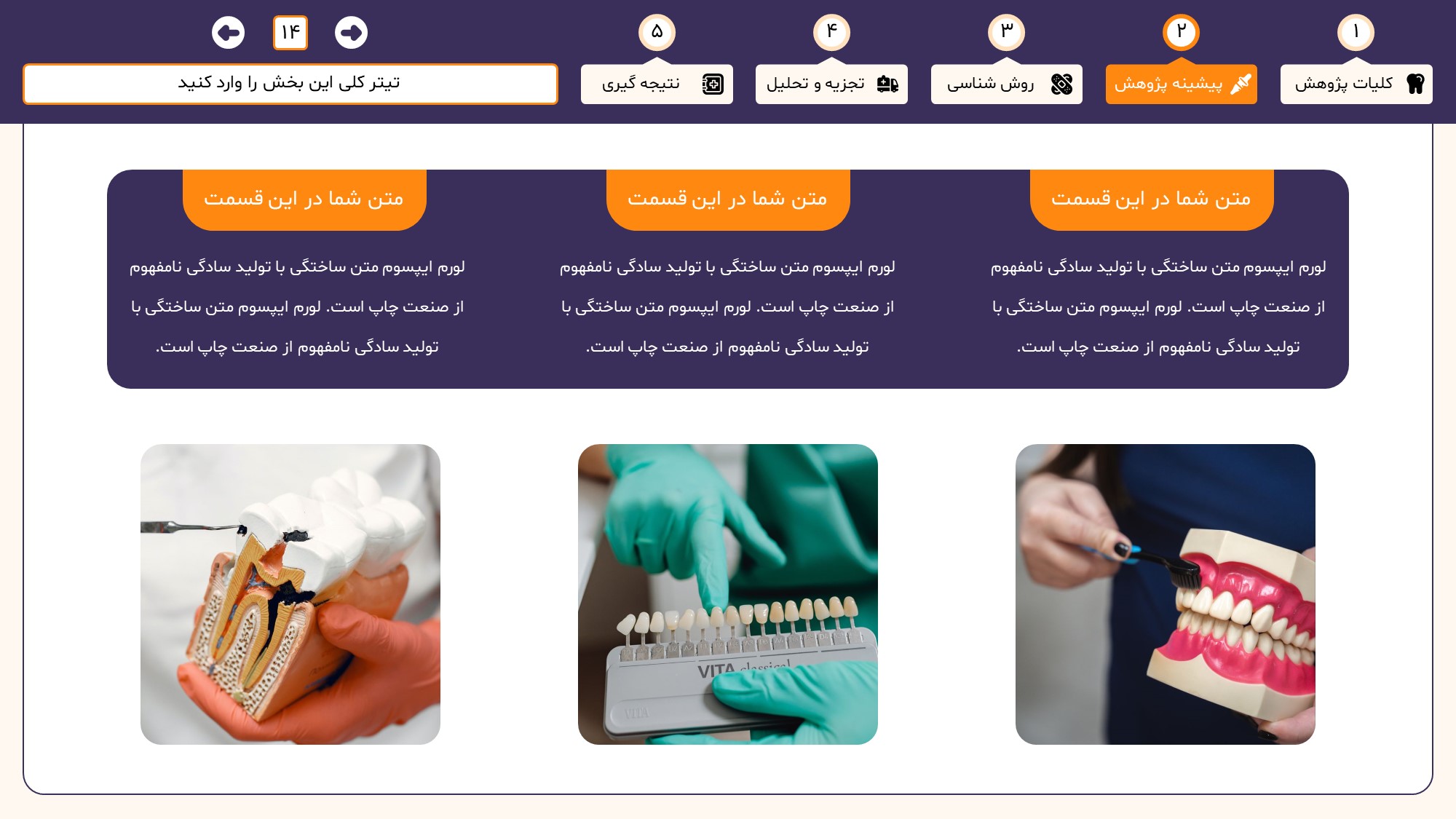 مناسب برای انواع ارائههای دندان پزشکی: با توجه به نوع طراحی این قالب، میتوانید از آن برای انواع ارائه های دندان پزشکی از جمله پایان نامه ارشد و دکتری و دانشگاهی استفاده کنید.
