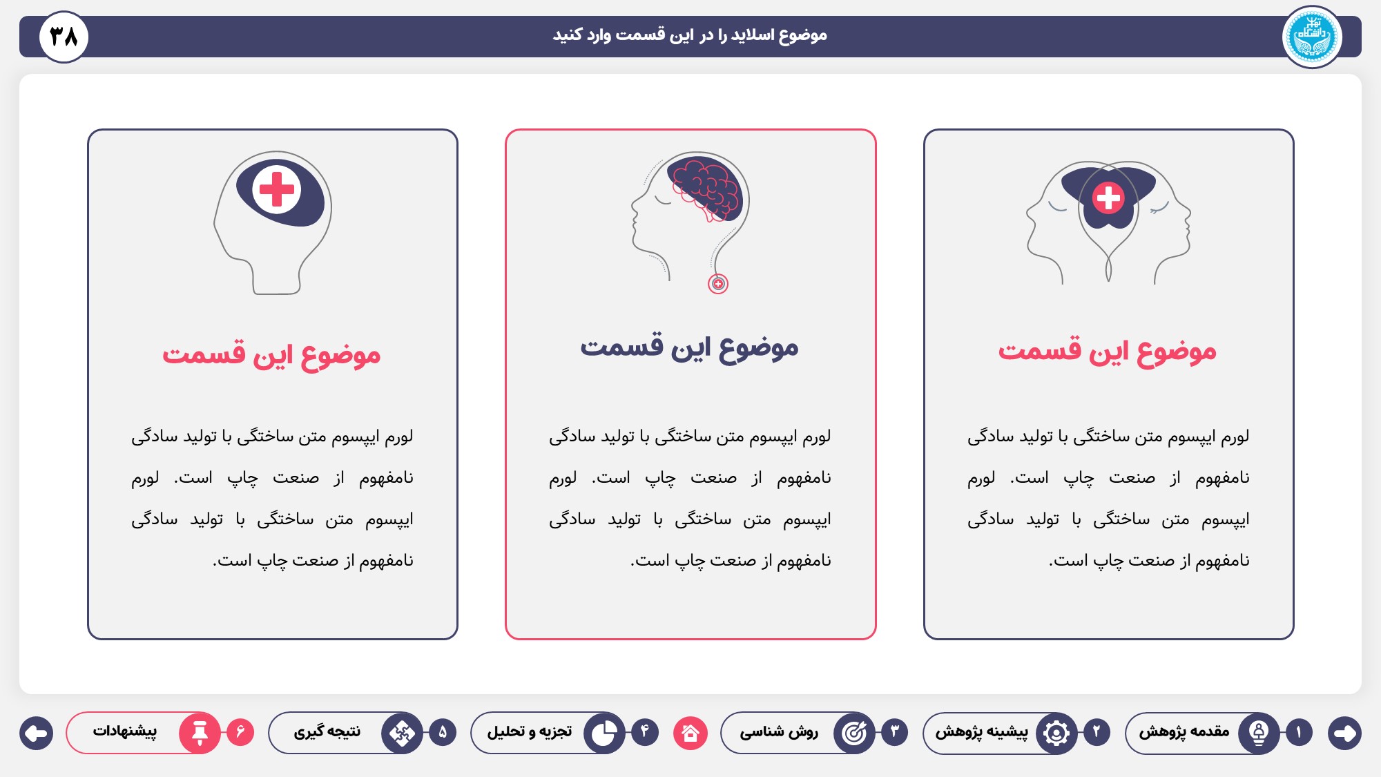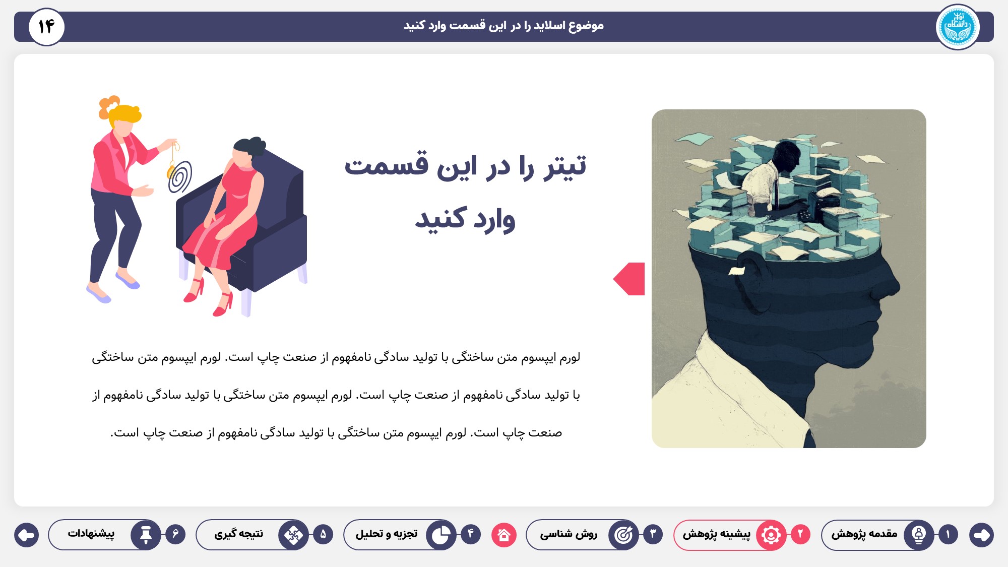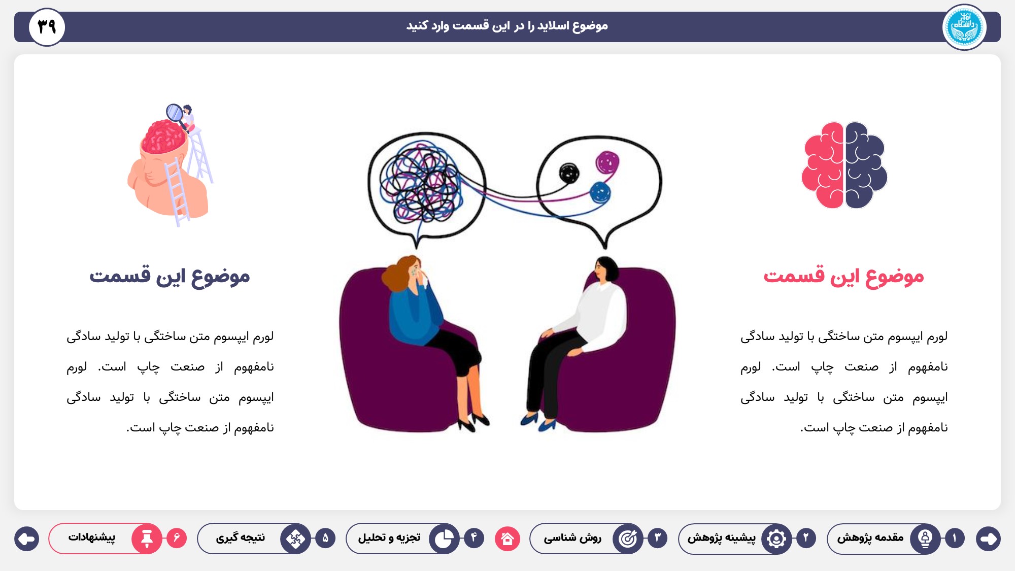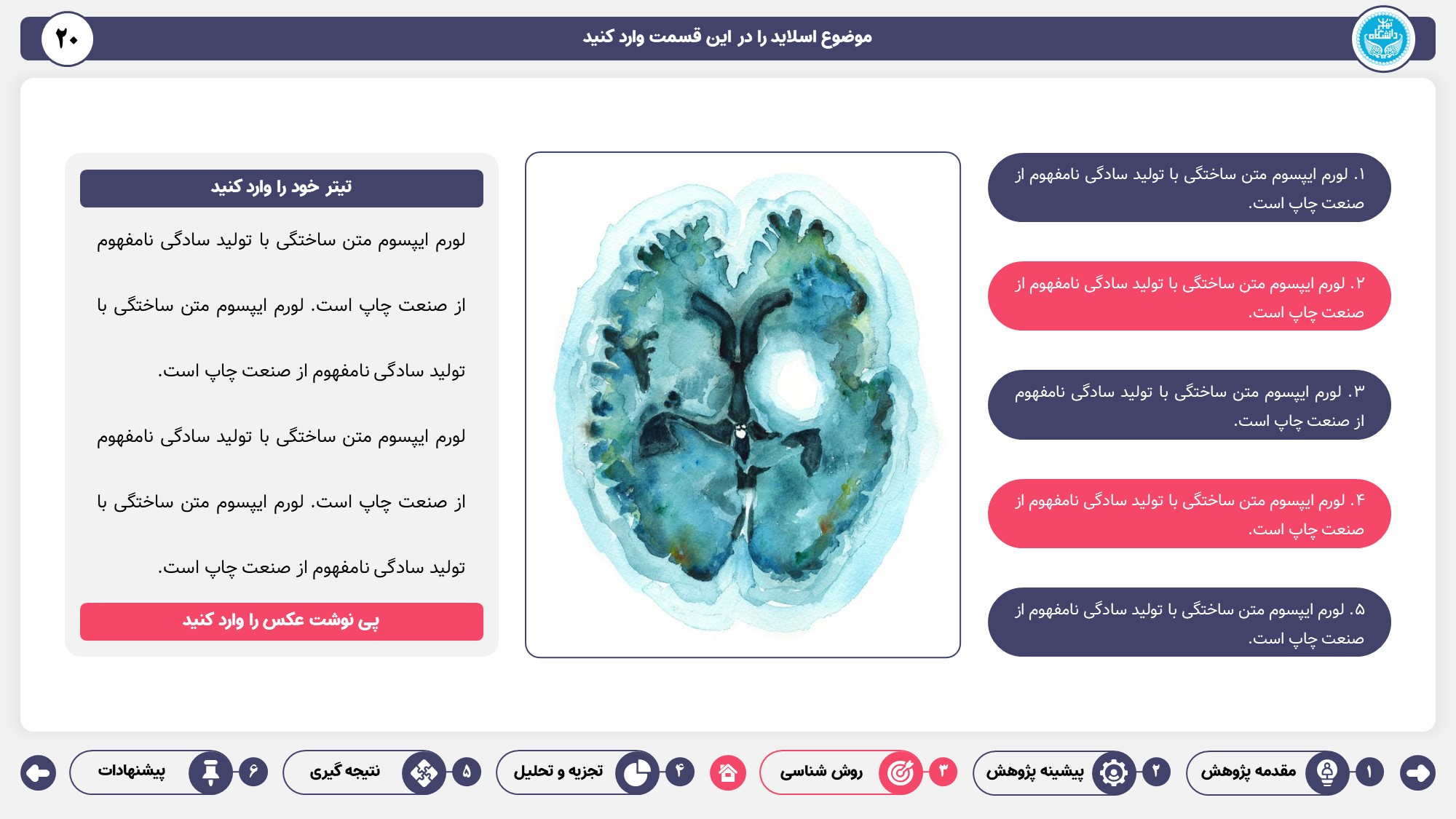 مناسب برای انواع ارائههای روانشناسی: با توجه به نوع طراحی این قالب، میتوانید از آن برای انواع ارائه های روانشناسی از جمله ارشد و دکتری و دانشگاهی استفاده کنید.