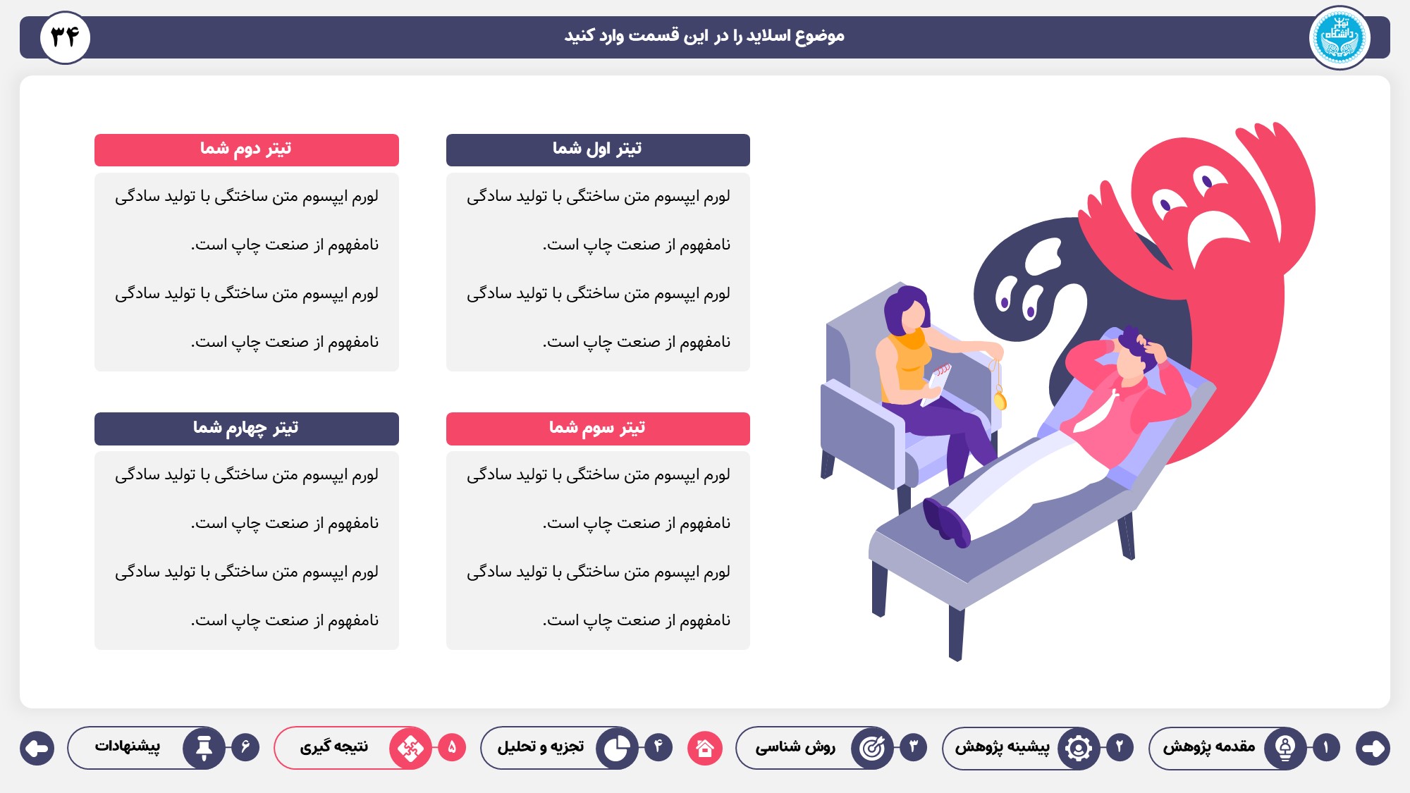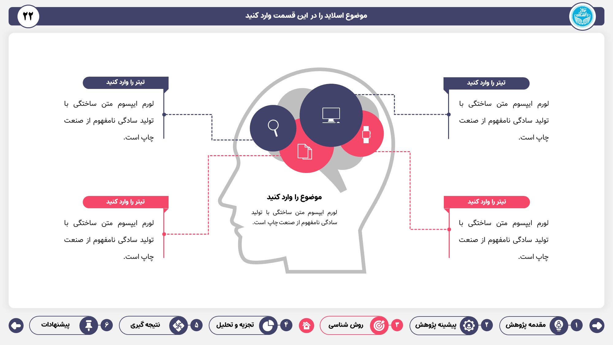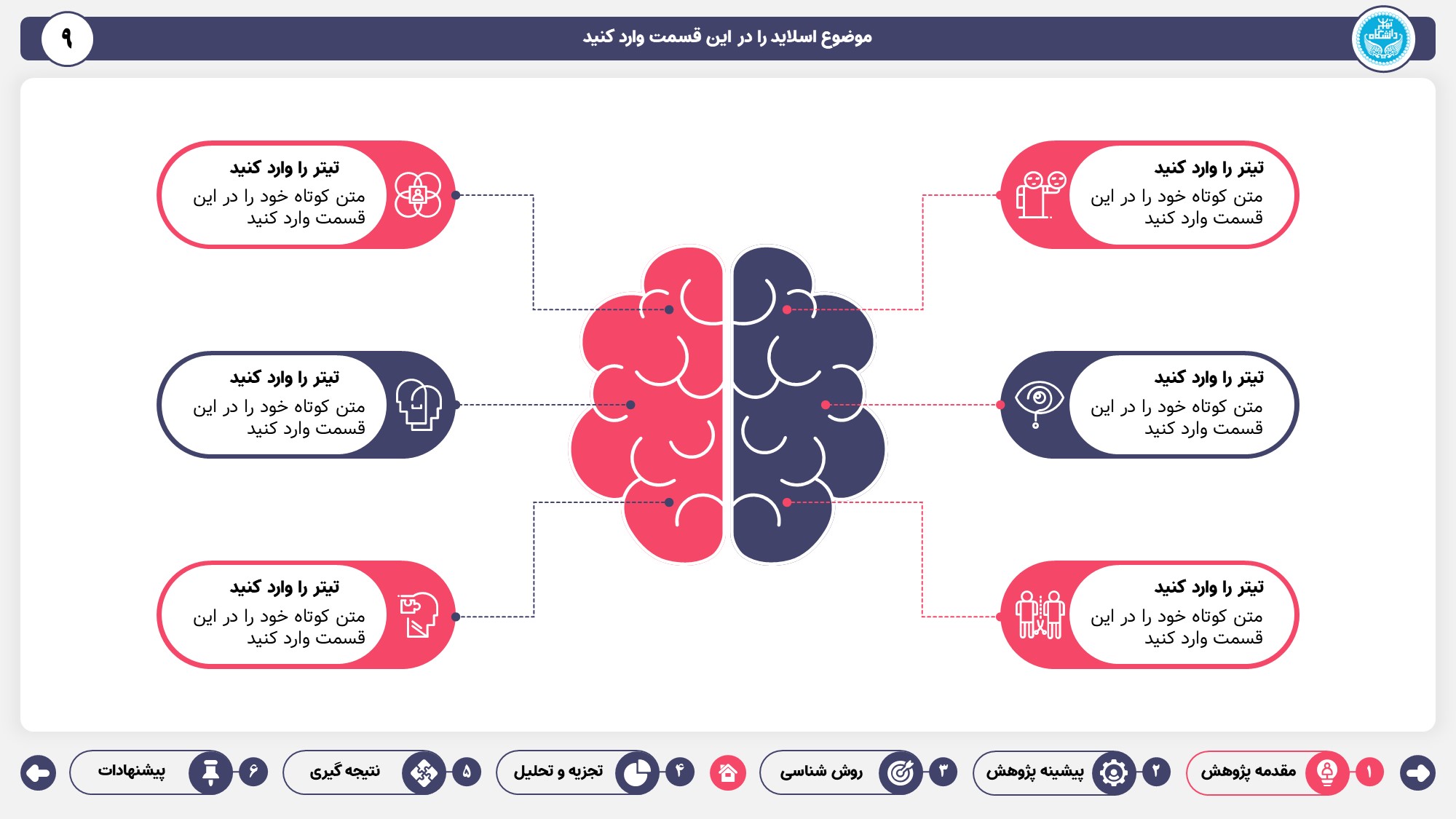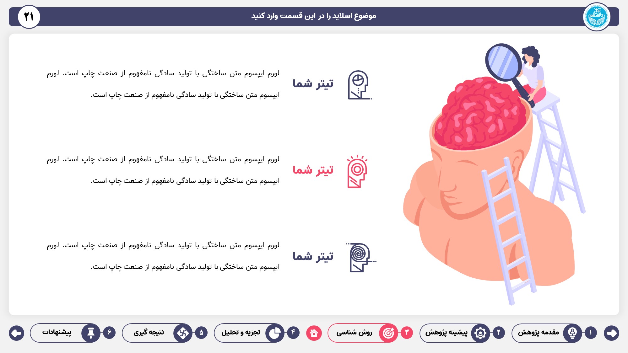 مناسب برای انواع ارائههای روانشناسی: با توجه به نوع طراحی این قالب، میتوانید از آن برای انواع ارائه های روانشناسی از جمله ارشد و دکتری و دانشگاهی استفاده کنید.
