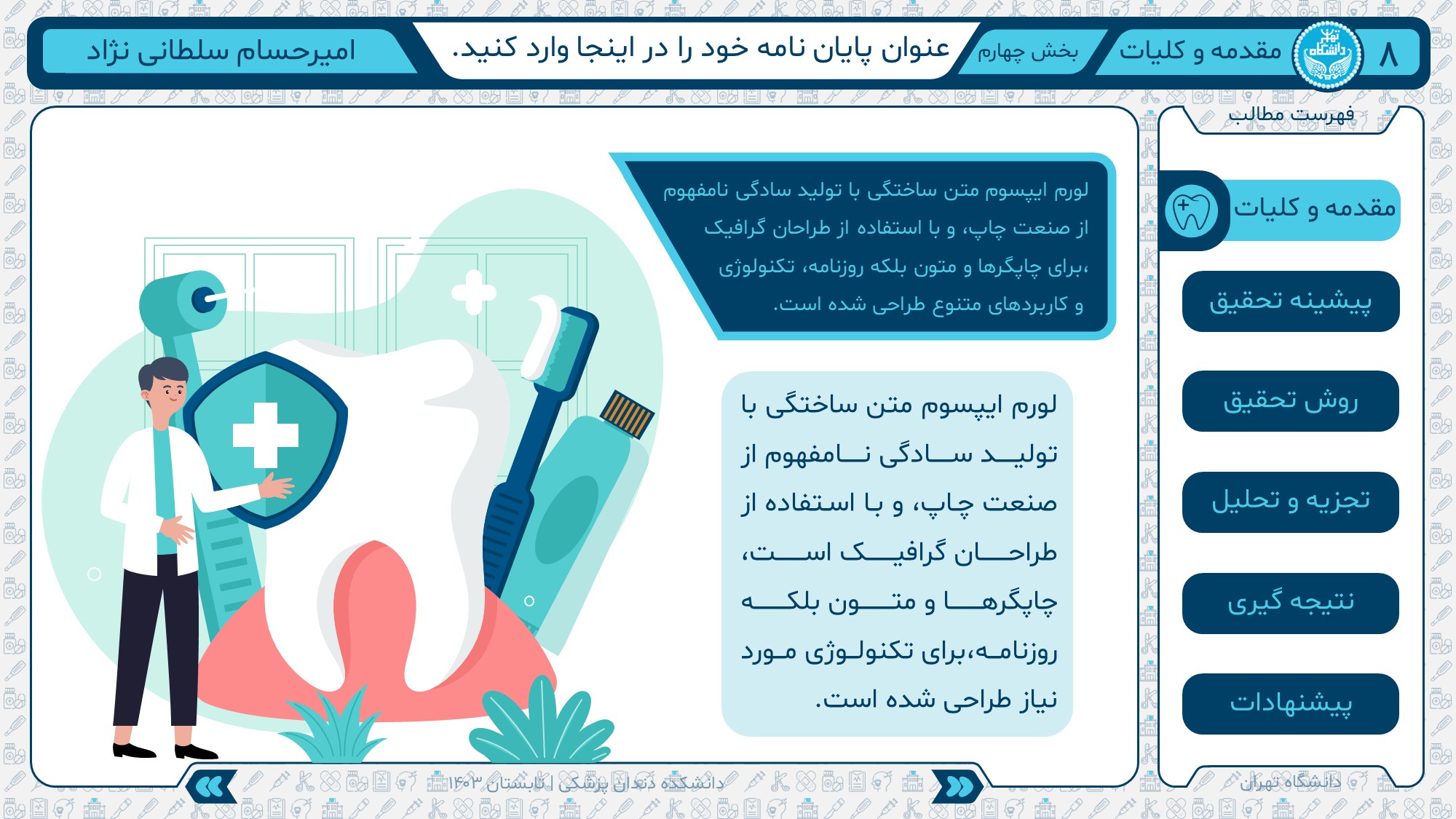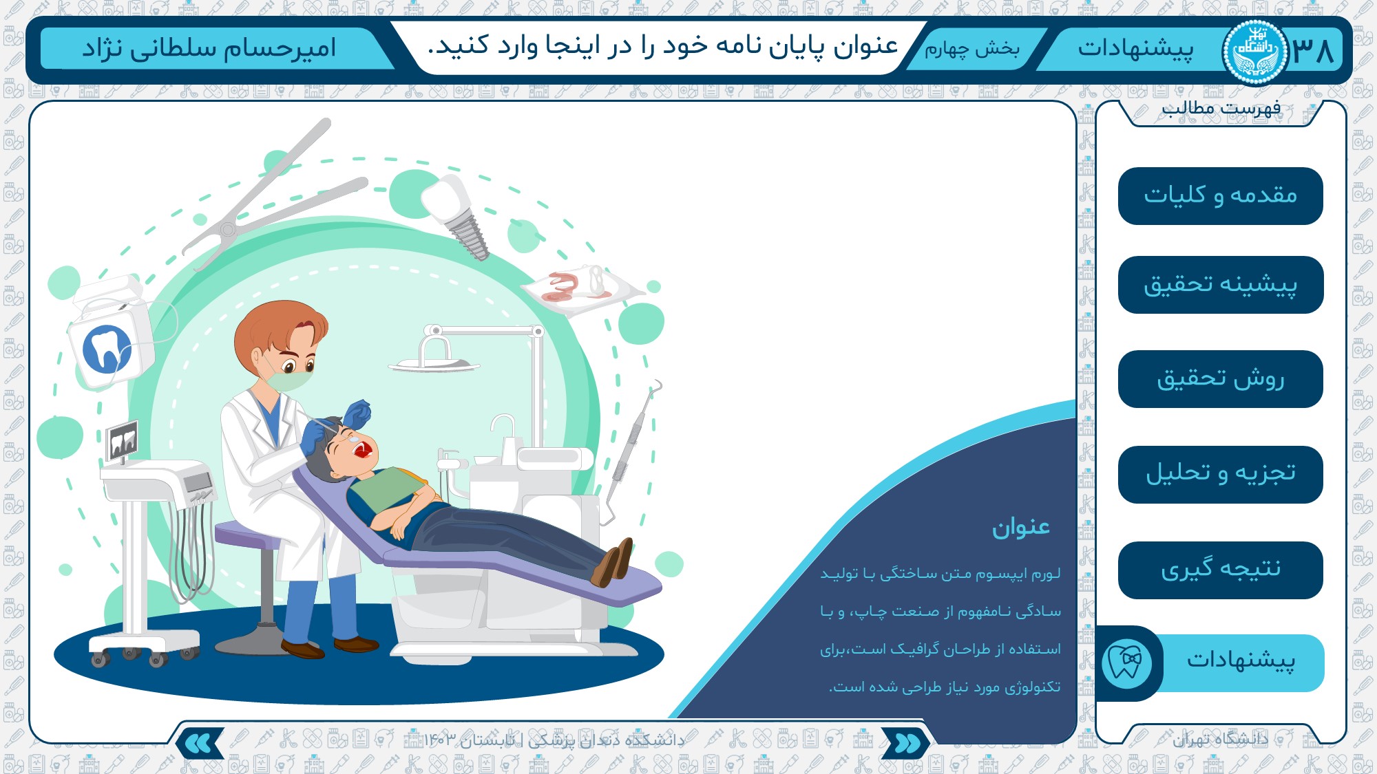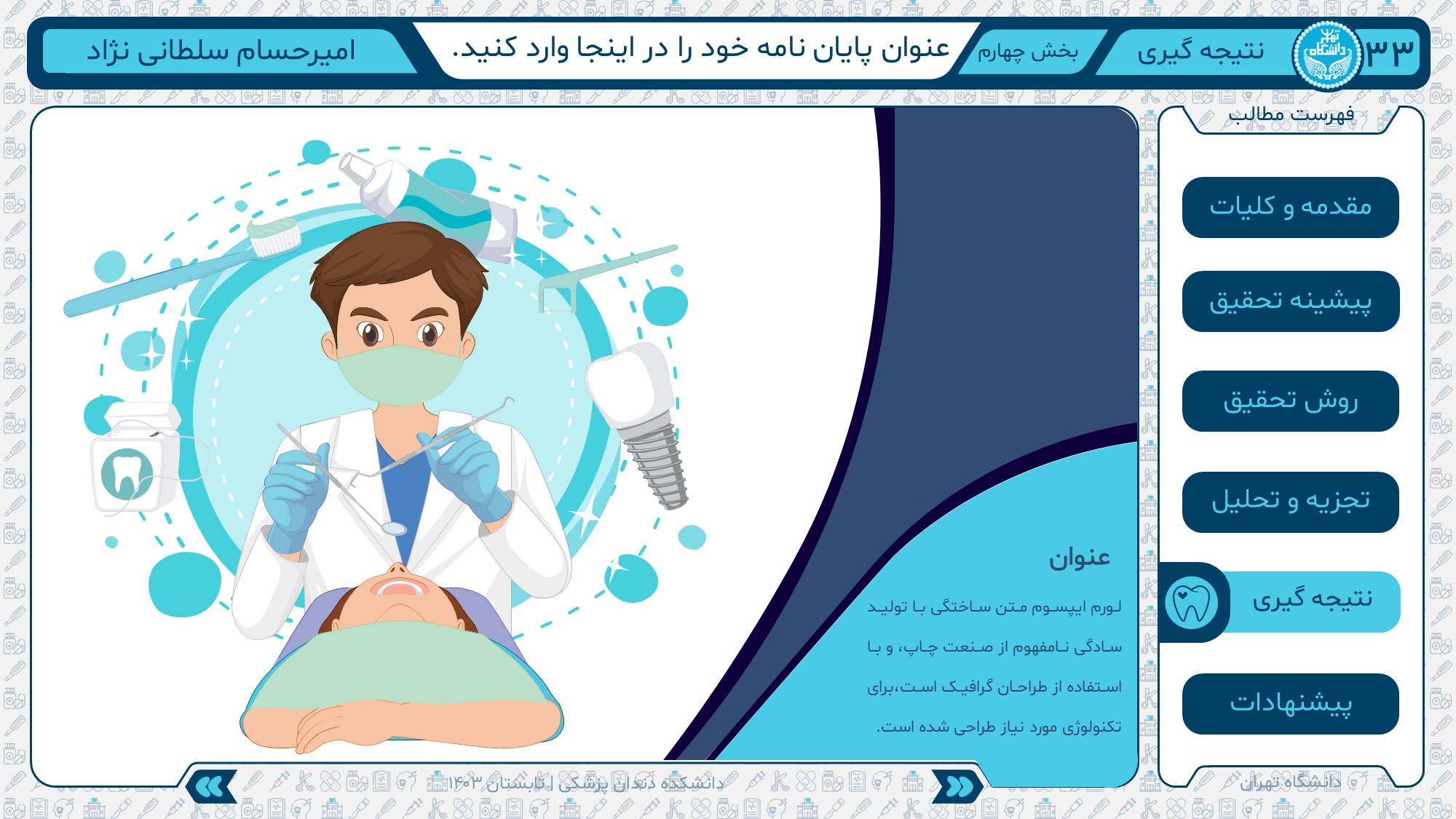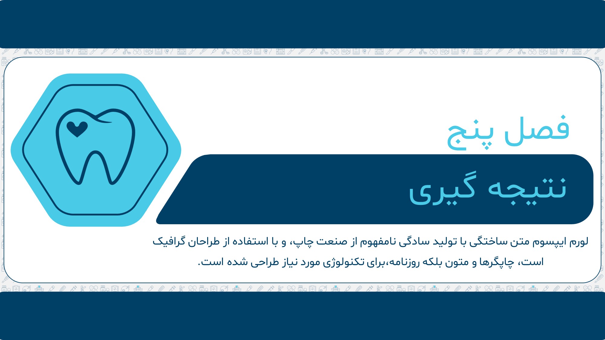 مناسب برای انواع ارائههای دندان پزشکی: با توجه به نوع طراحی این قالب، میتوانید از آن برای انواع ارائه های دندان پزشکی از جمله دانشگاهی و پایان نامه ارشد و دکتری و… استفاده کنید.