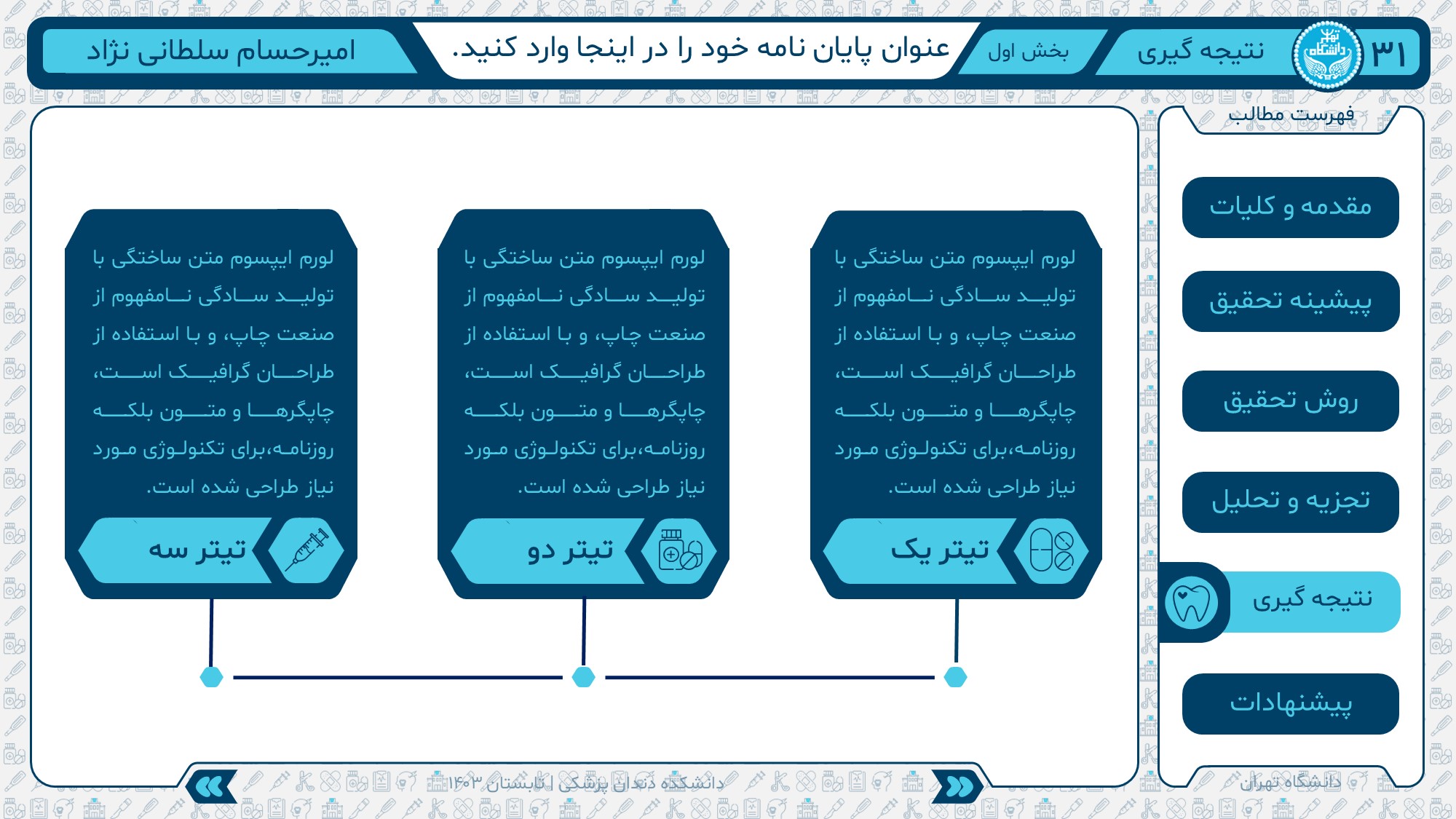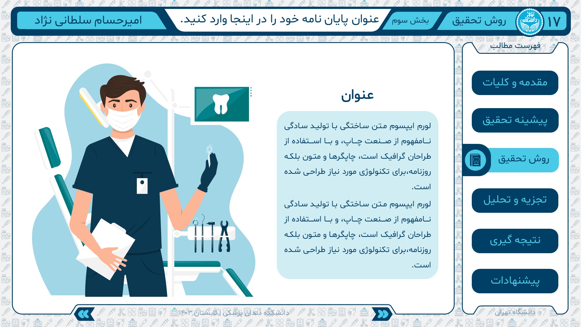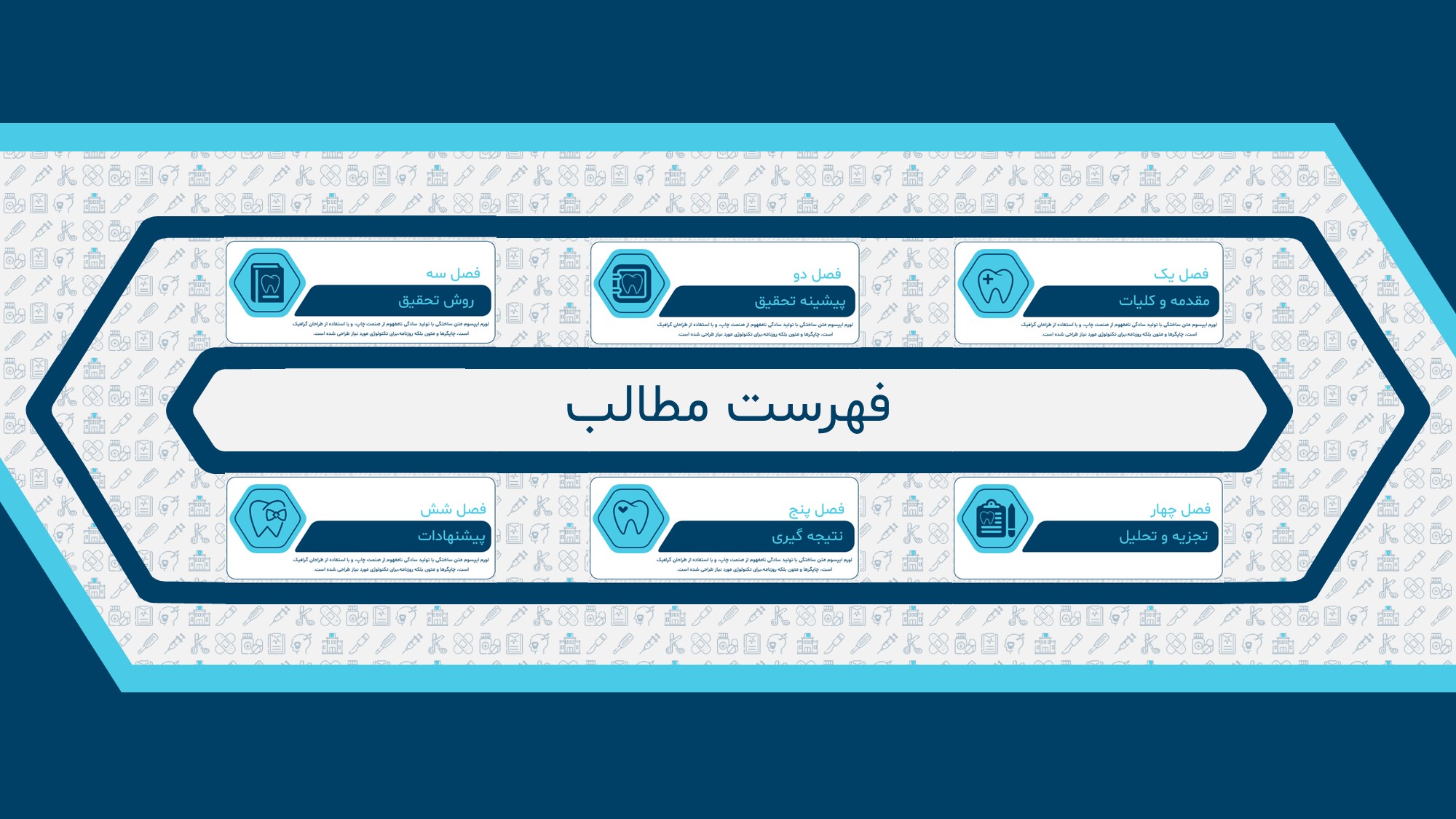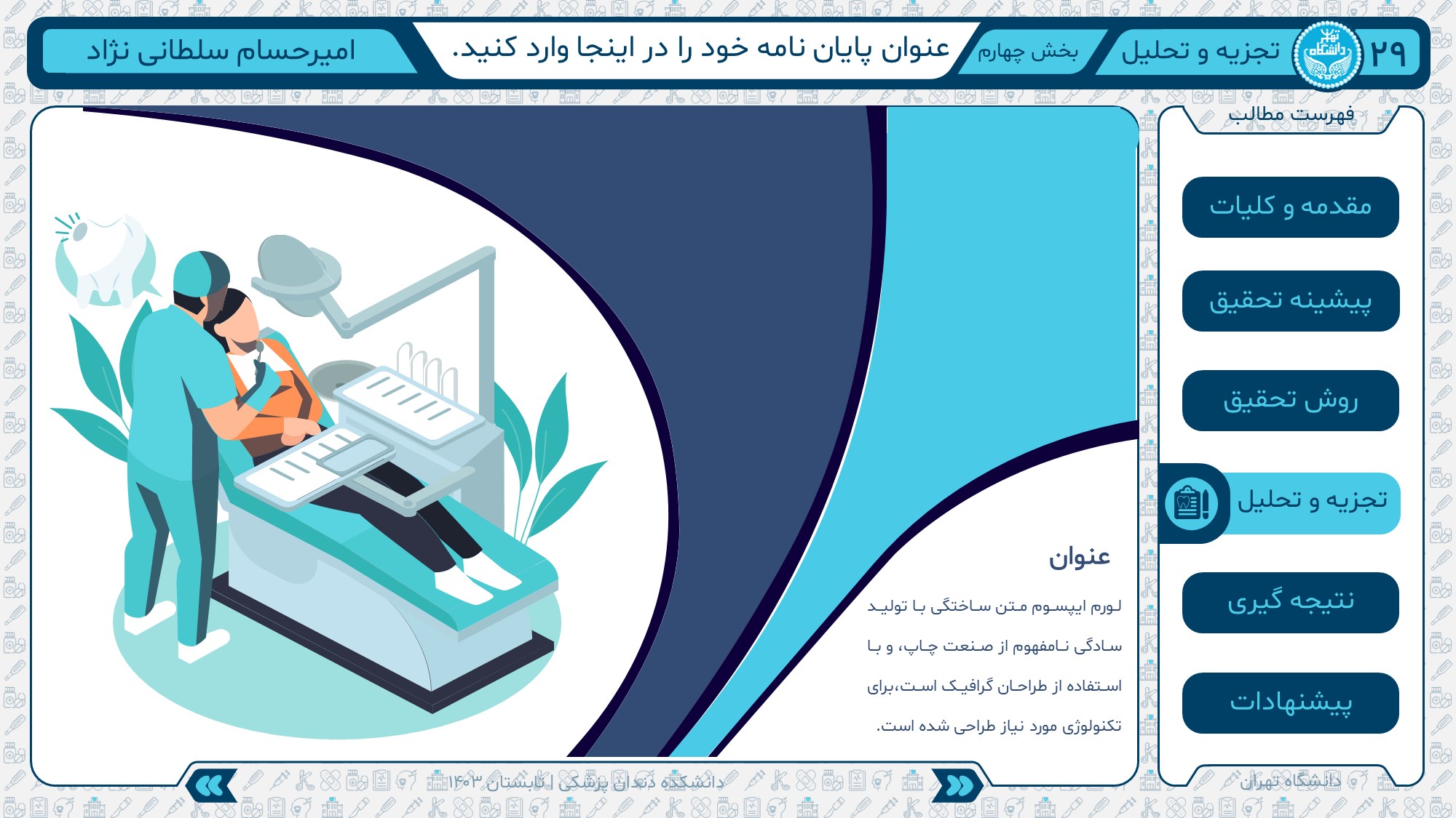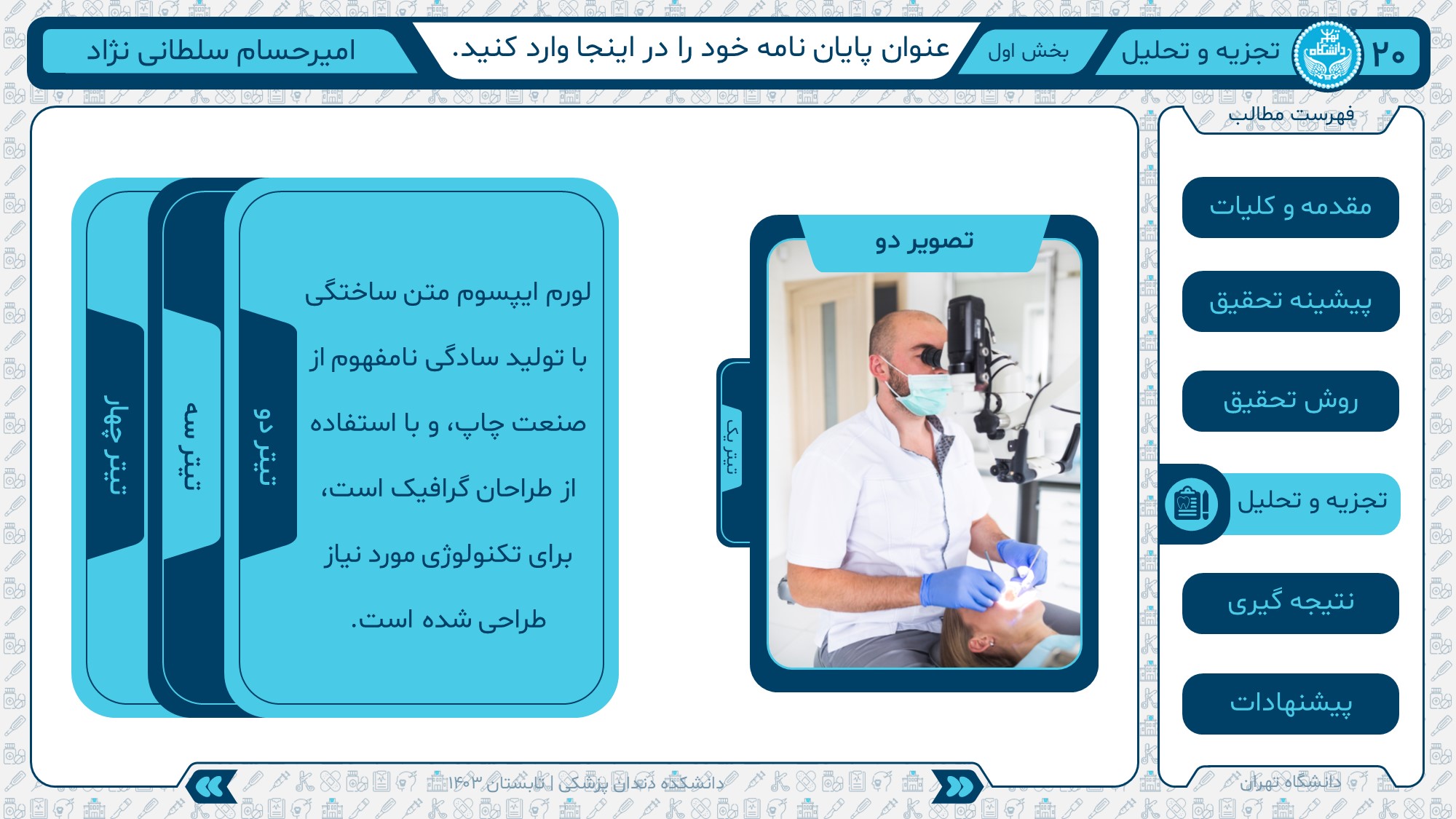 مناسب برای انواع ارائههای دندان پزشکی: با توجه به نوع طراحی این قالب، میتوانید از آن برای انواع ارائه های دندان پزشکی از جمله دانشگاهی و پایان نامه ارشد و دکتری و… استفاده کنید.