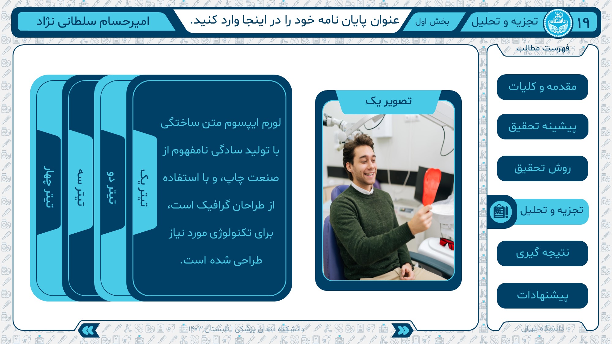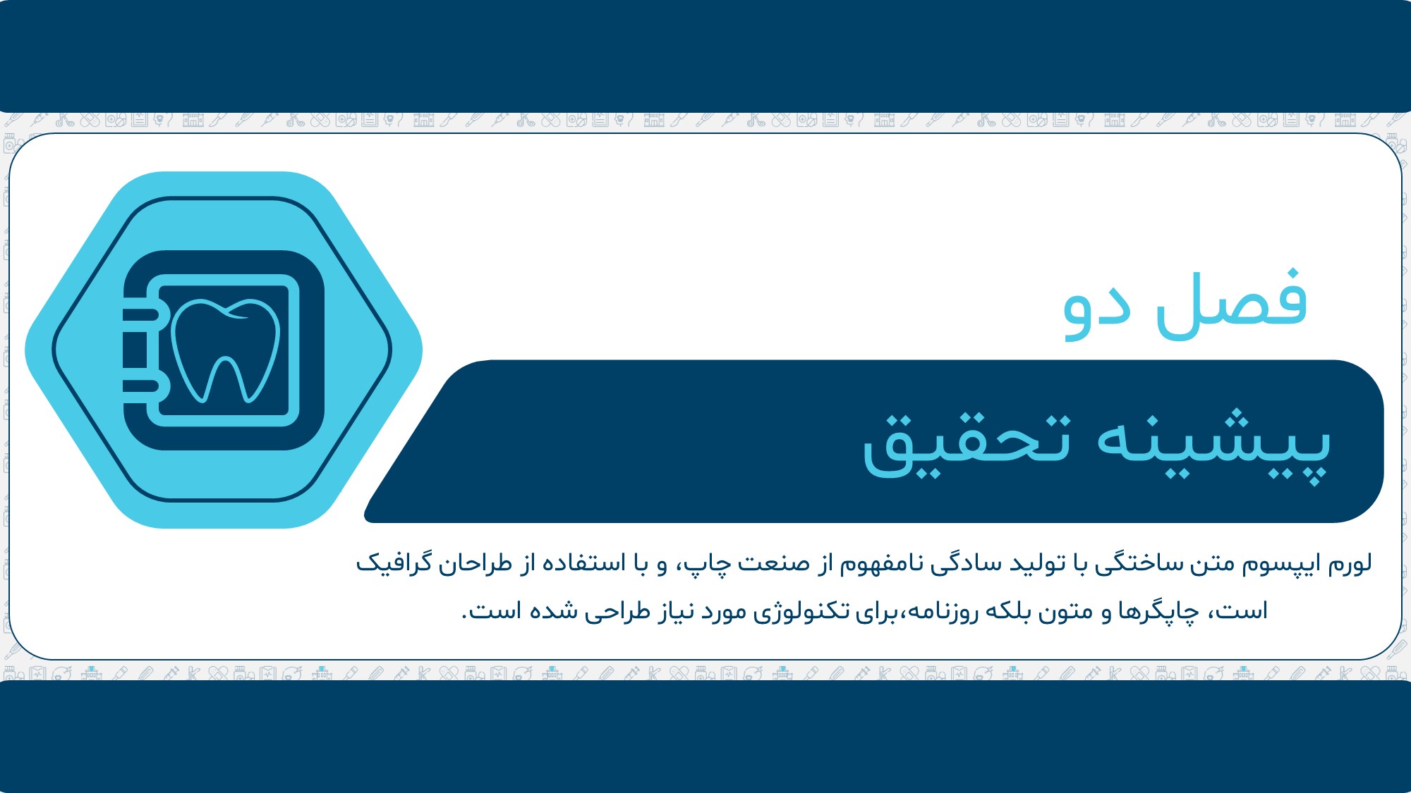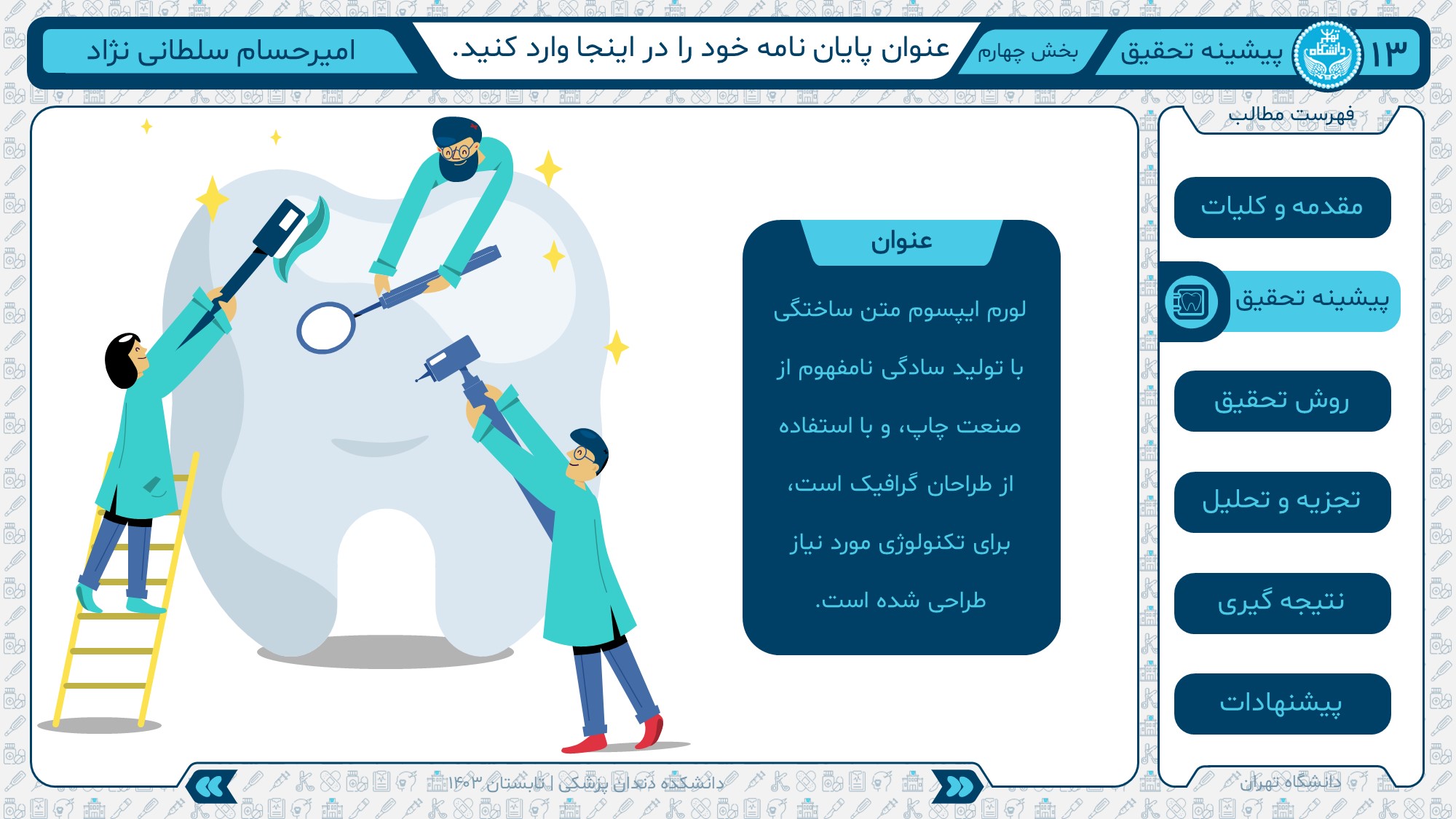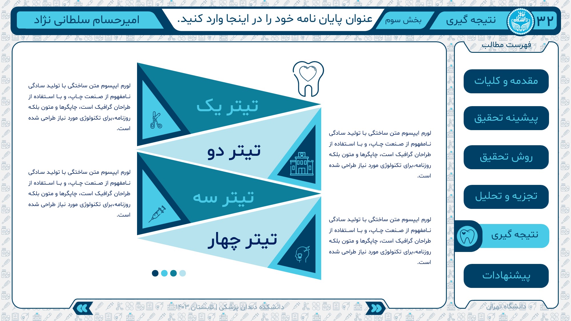 مناسب برای انواع ارائههای دندان پزشکی: با توجه به نوع طراحی این قالب، میتوانید از آن برای انواع ارائه های دندان پزشکی از جمله دانشگاهی و پایان نامه ارشد و دکتری و… استفاده کنید.