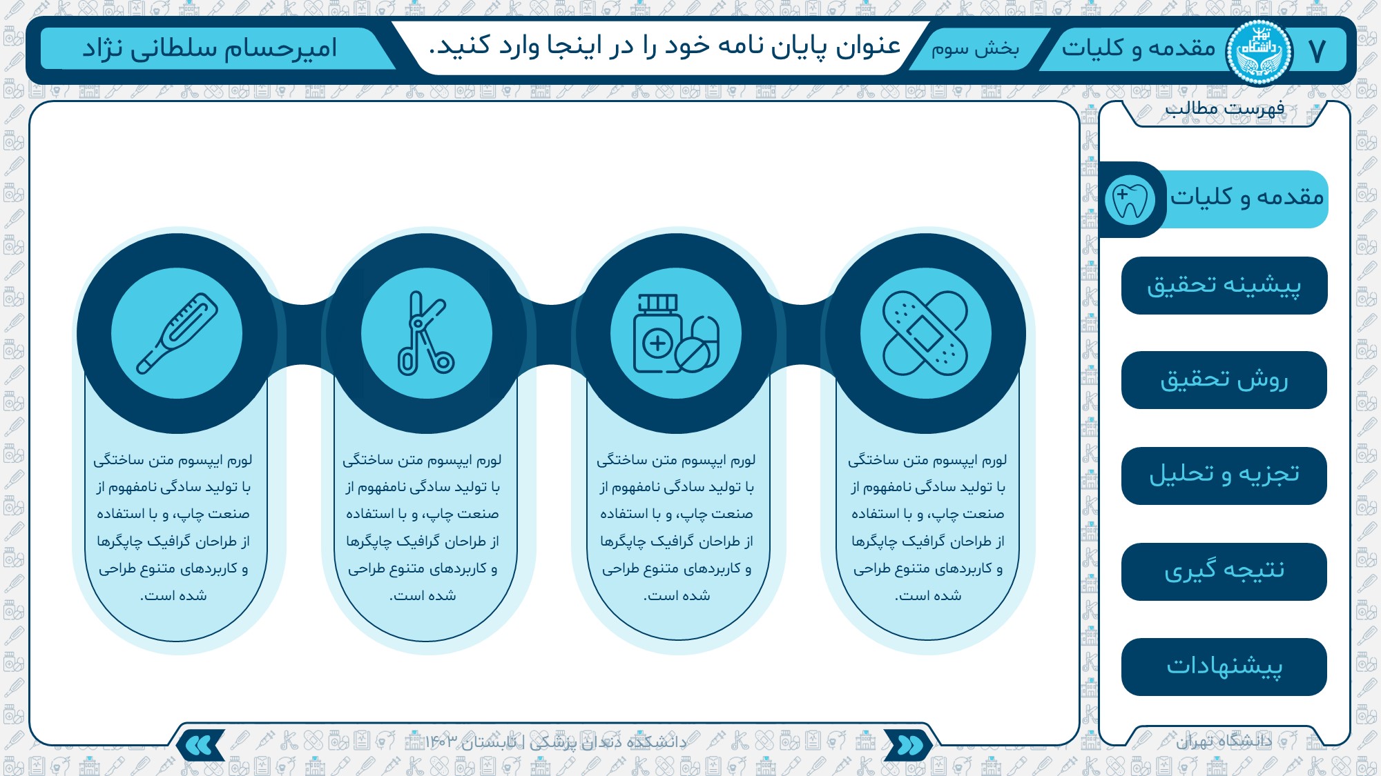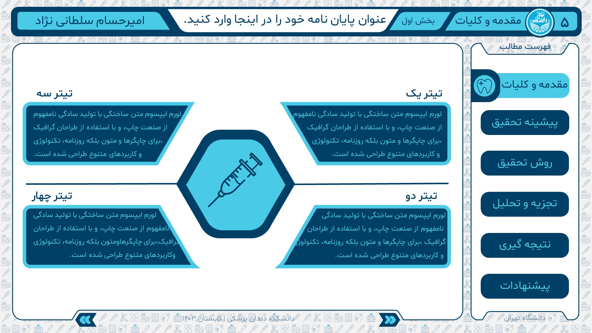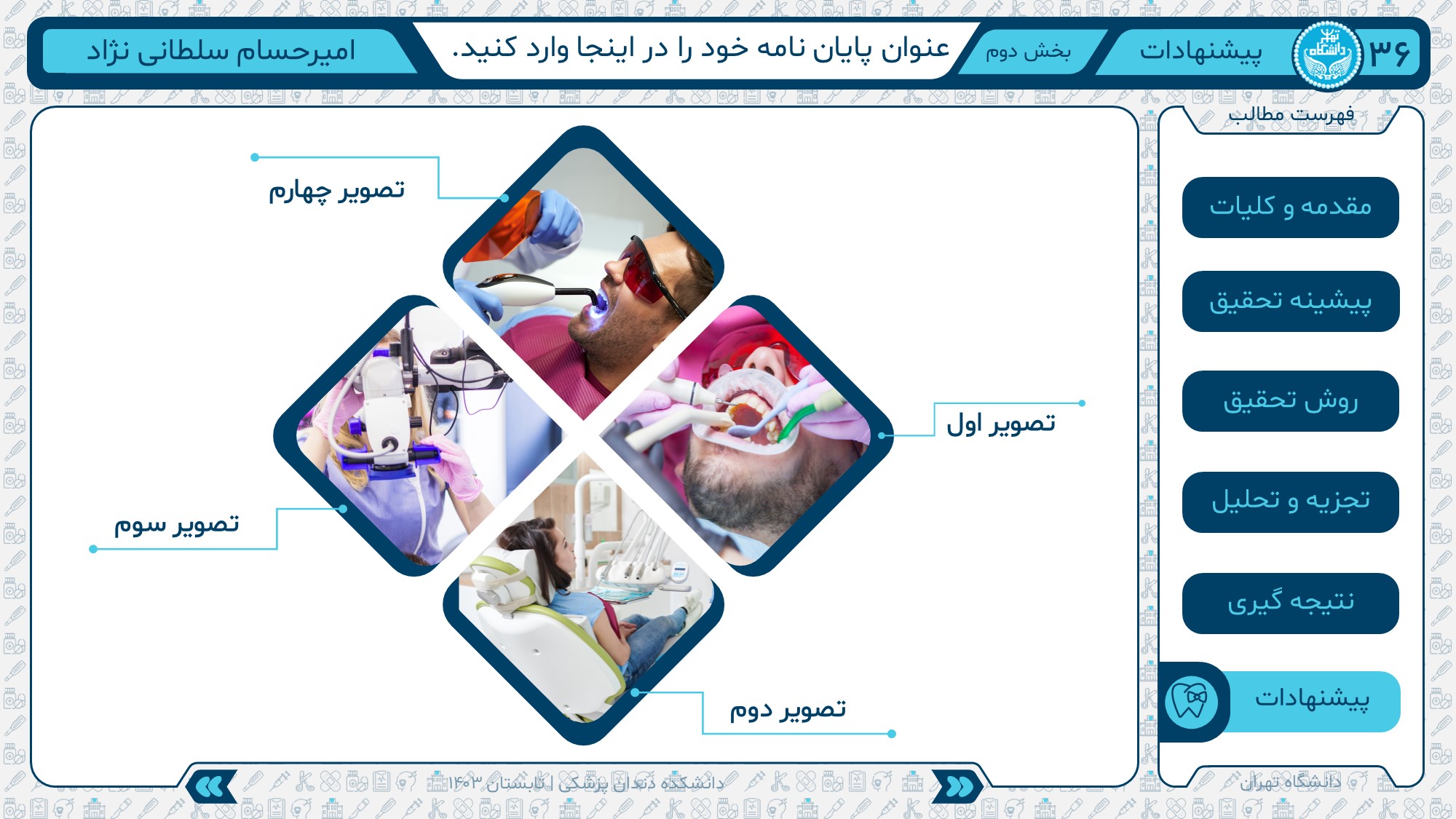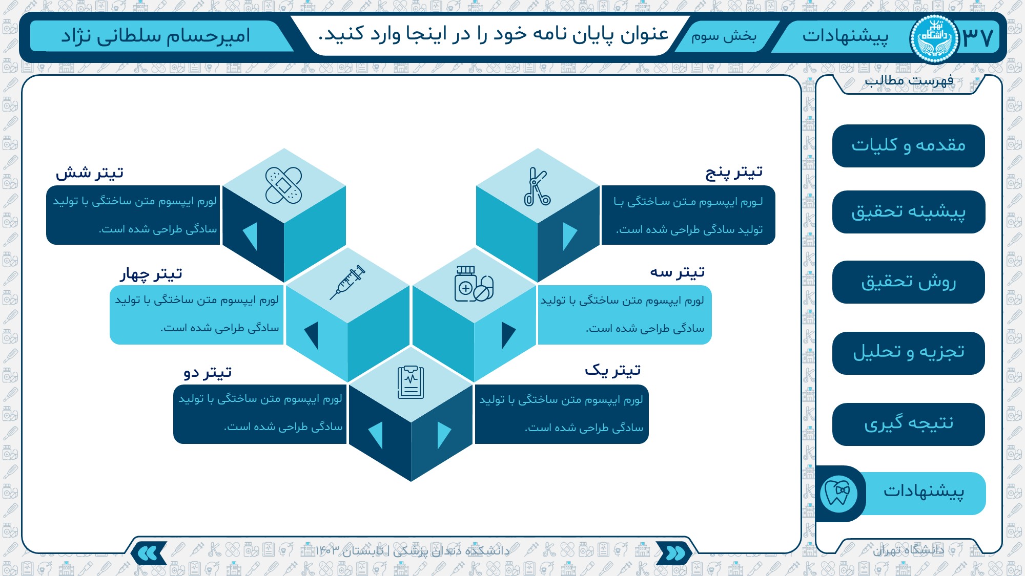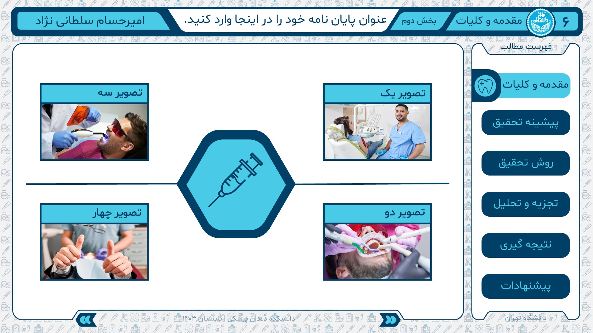 مناسب برای انواع ارائههای دندان پزشکی: با توجه به نوع طراحی این قالب، میتوانید از آن برای انواع ارائه های دندان پزشکی از جمله دانشگاهی و پایان نامه ارشد و دکتری و… استفاده کنید.