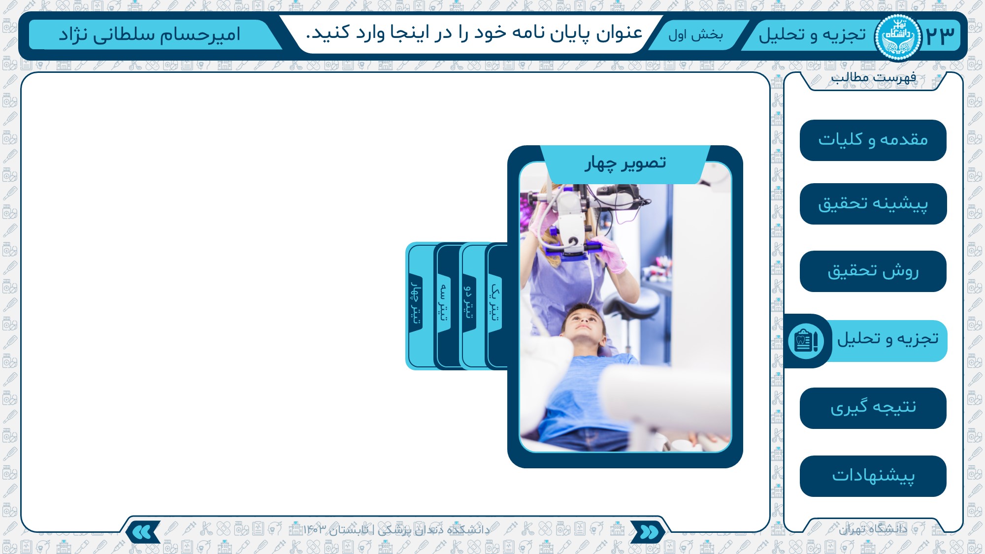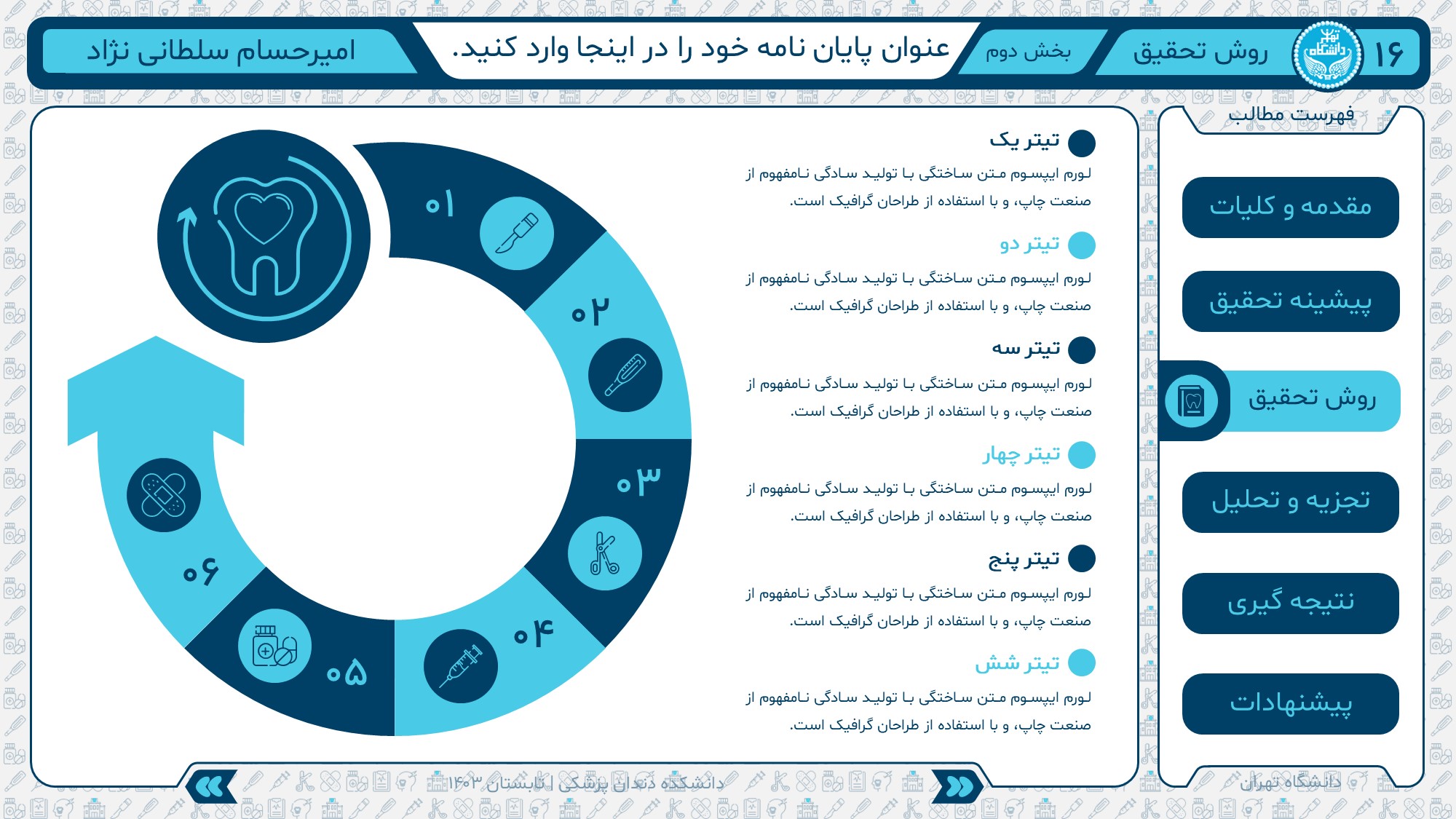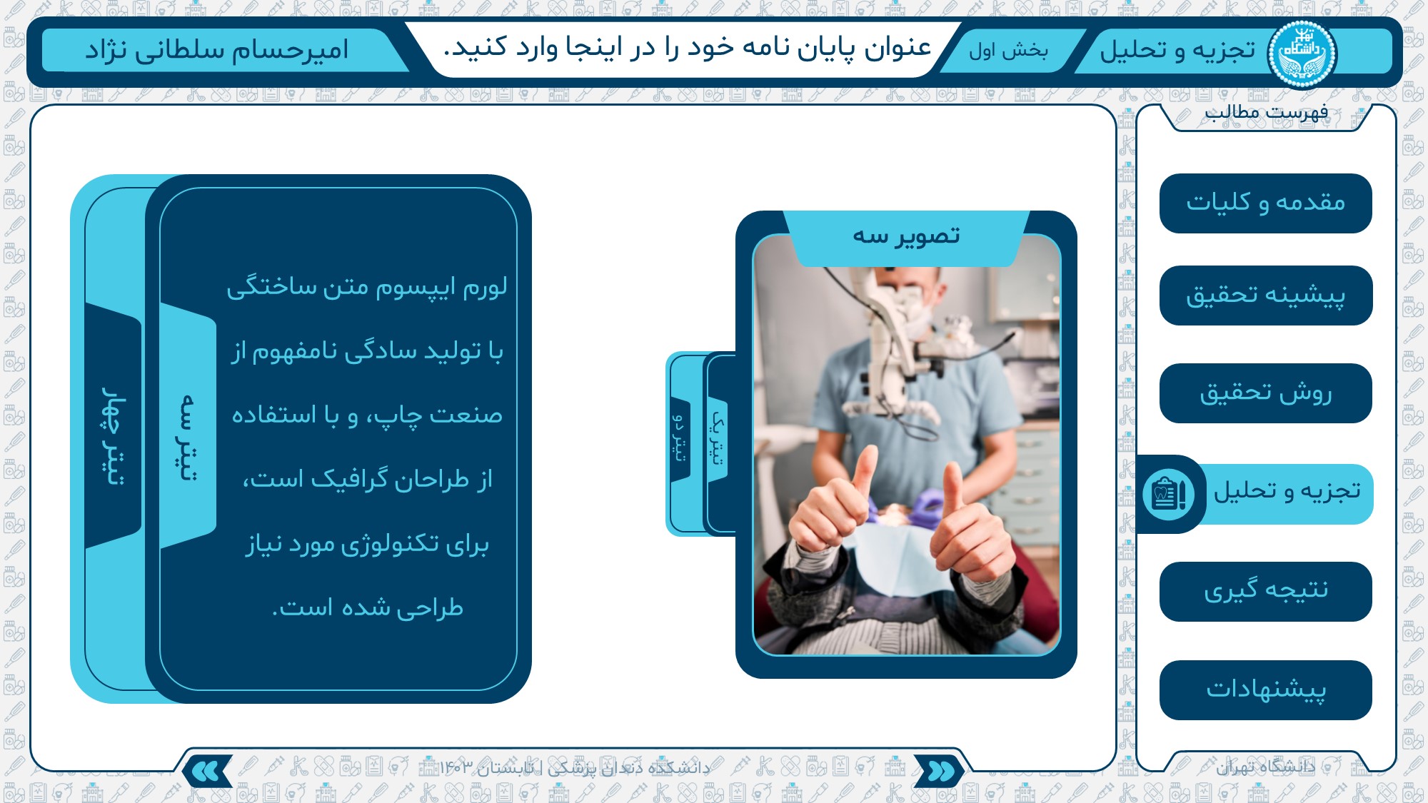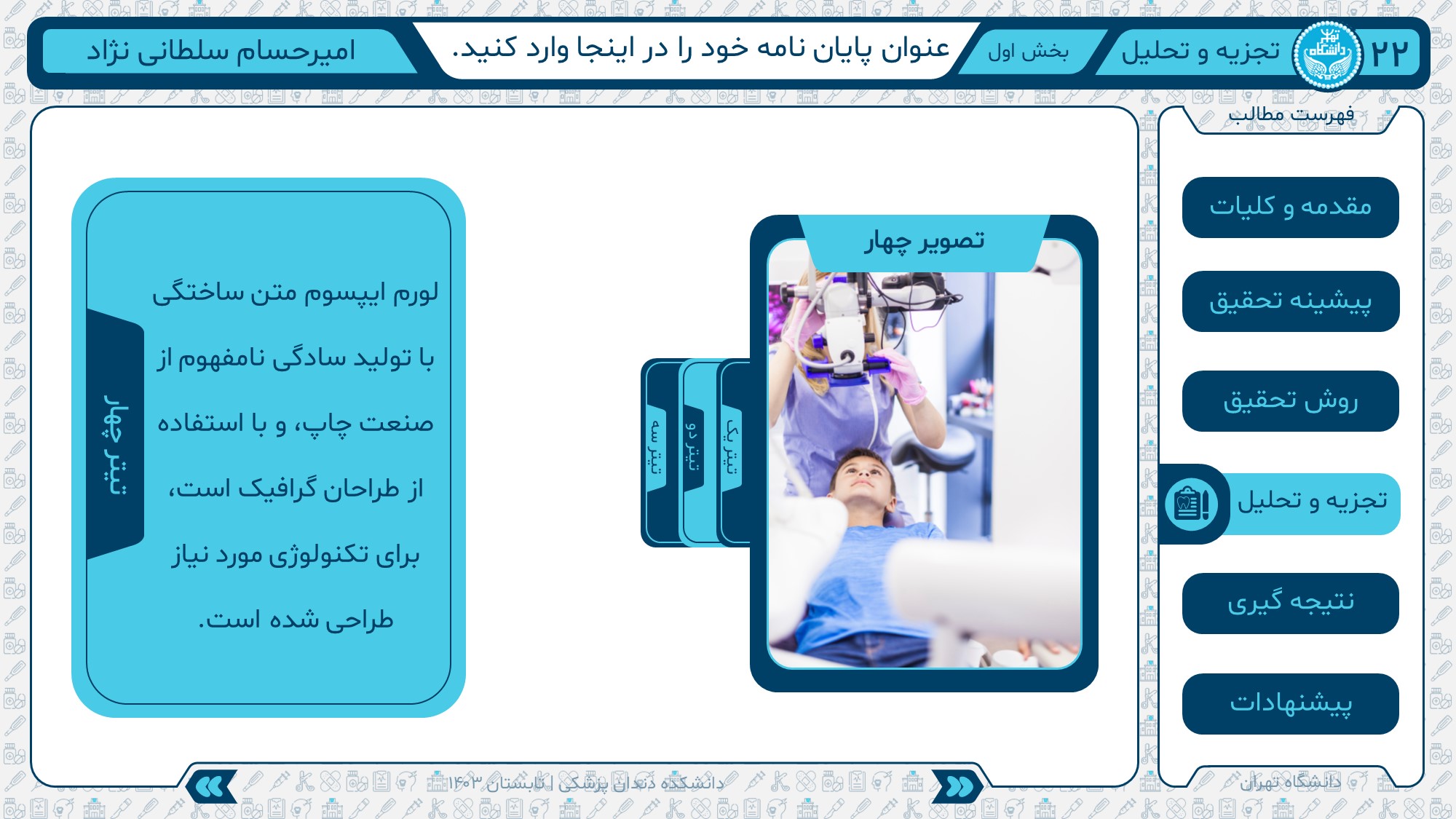 مناسب برای انواع ارائههای دندان پزشکی: با توجه به نوع طراحی این قالب، میتوانید از آن برای انواع ارائه های دندان پزشکی از جمله دانشگاهی و پایان نامه ارشد و دکتری و… استفاده کنید.