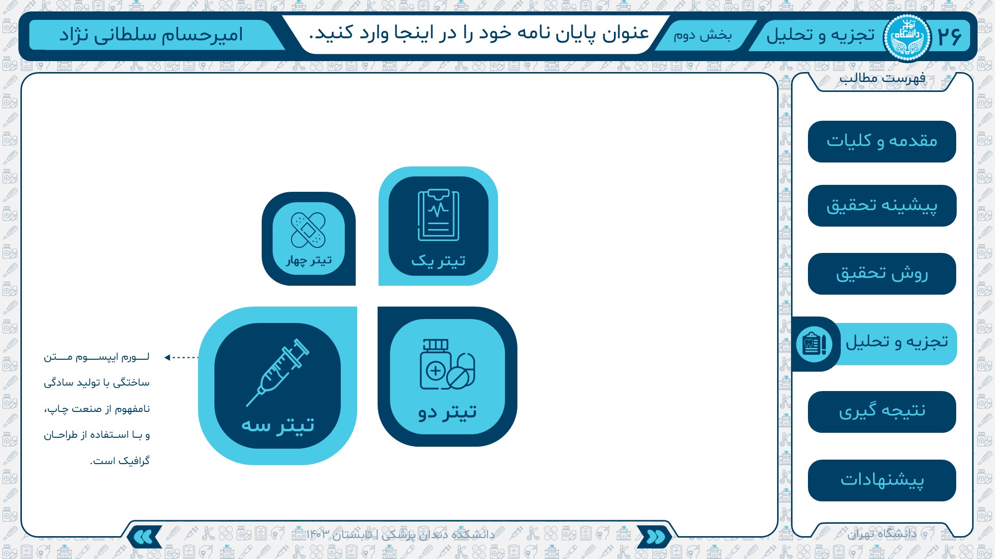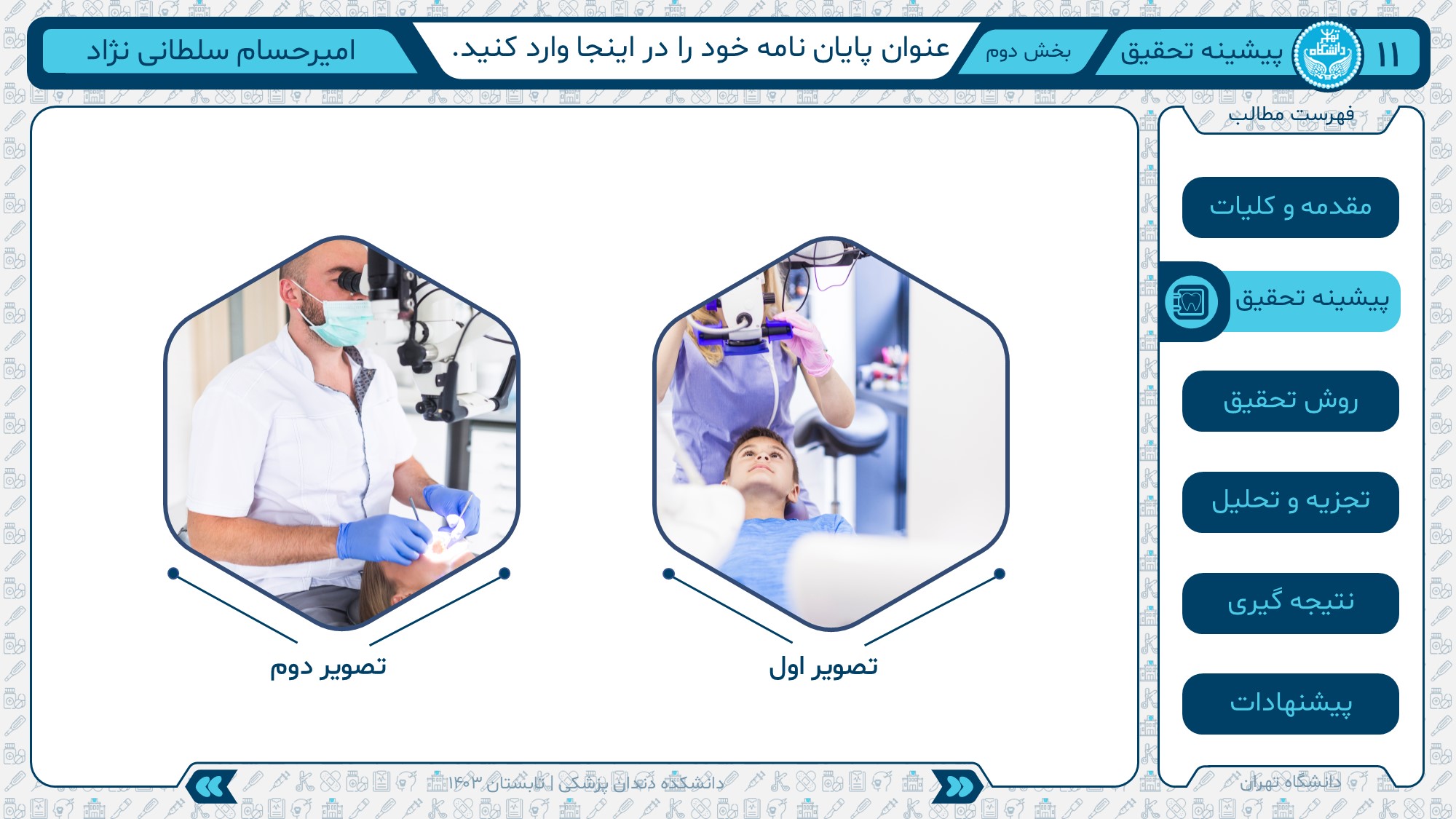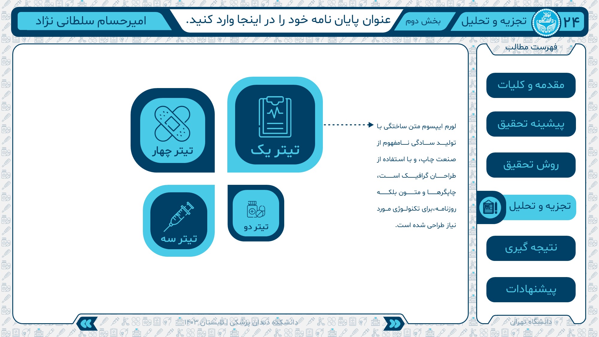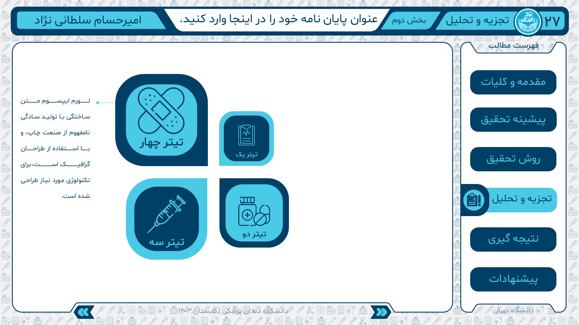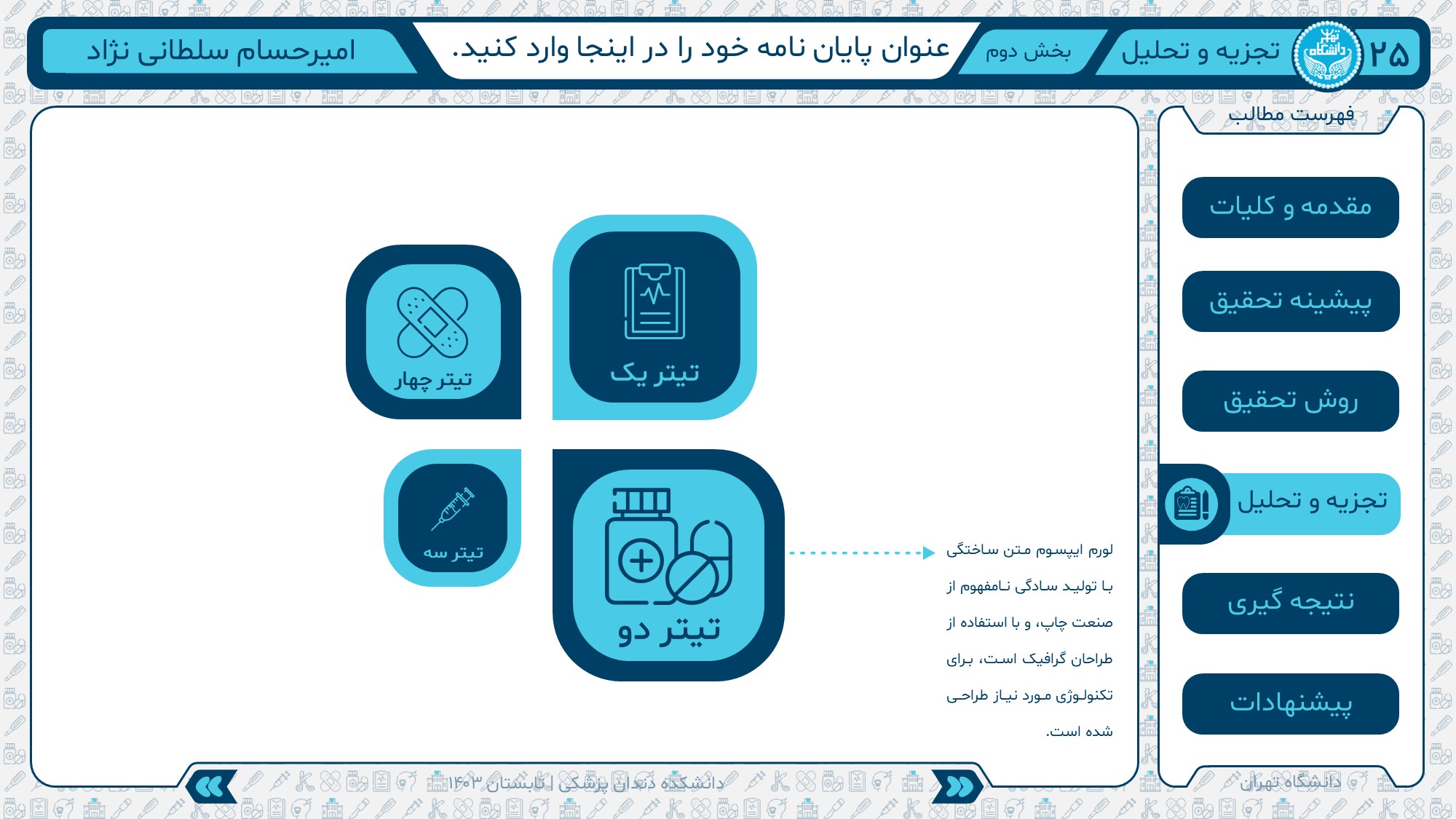 مناسب برای انواع ارائههای دندان پزشکی: با توجه به نوع طراحی این قالب، میتوانید از آن برای انواع ارائه های دندان پزشکی از جمله دانشگاهی و پایان نامه ارشد و دکتری و… استفاده کنید.