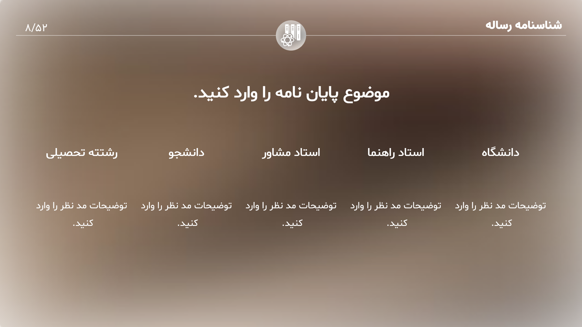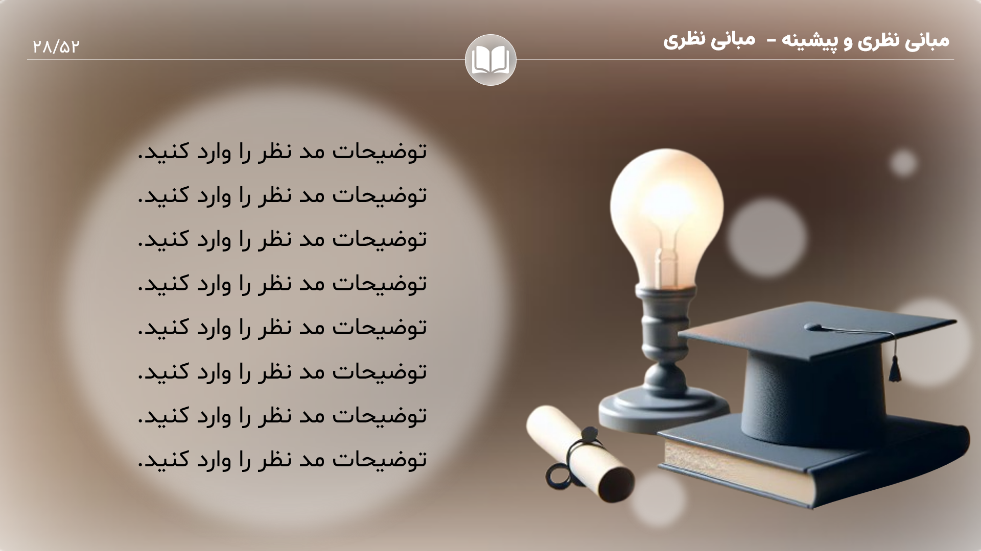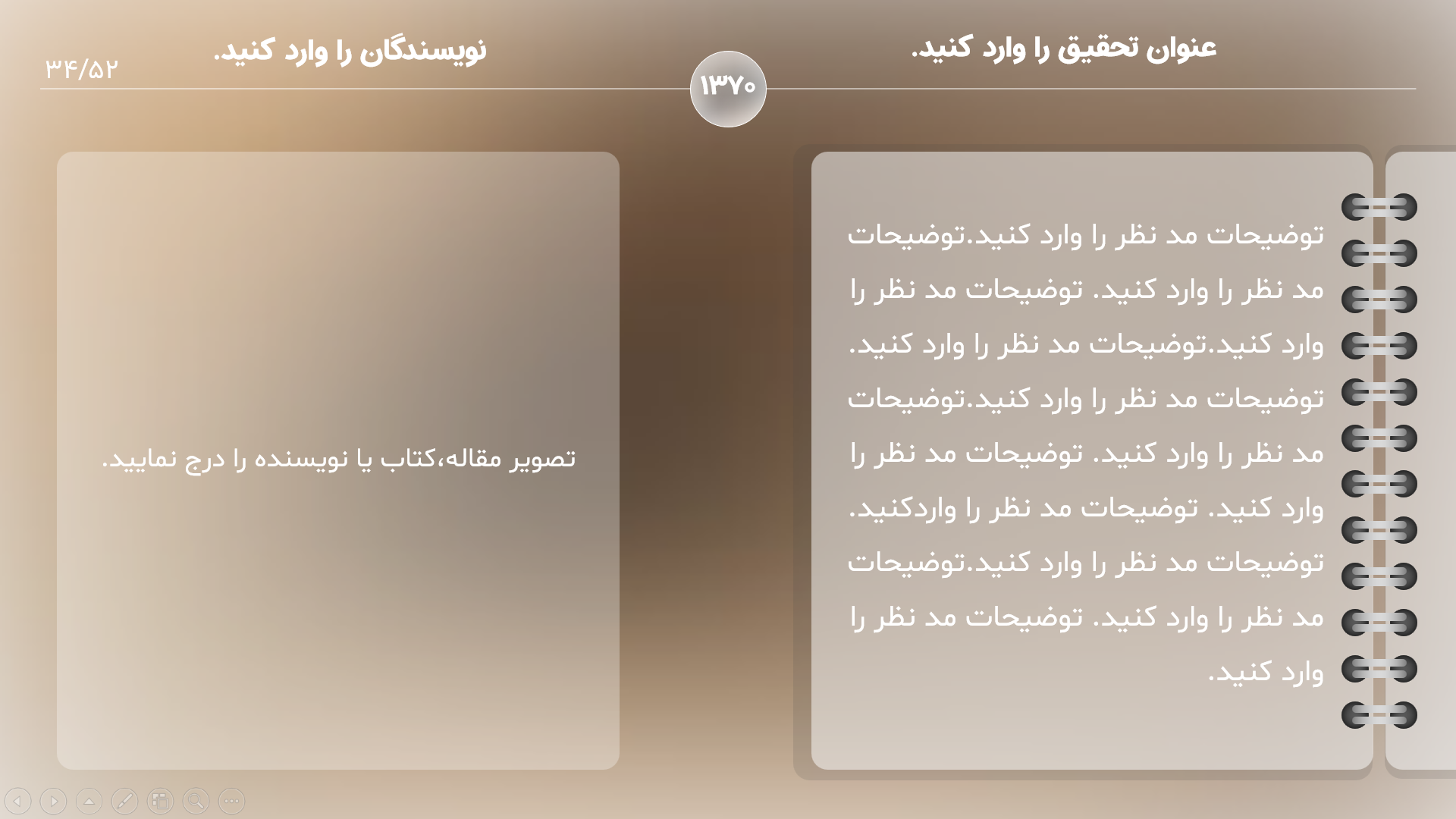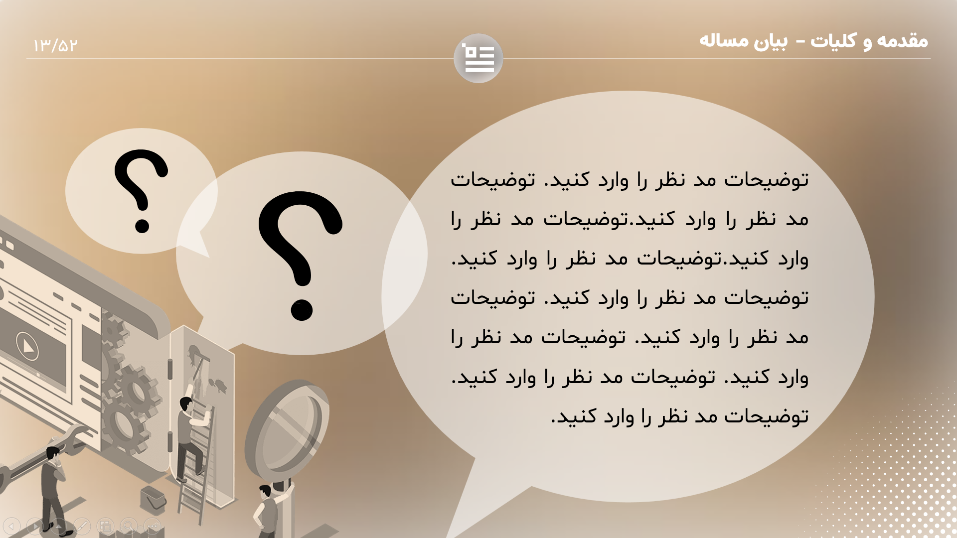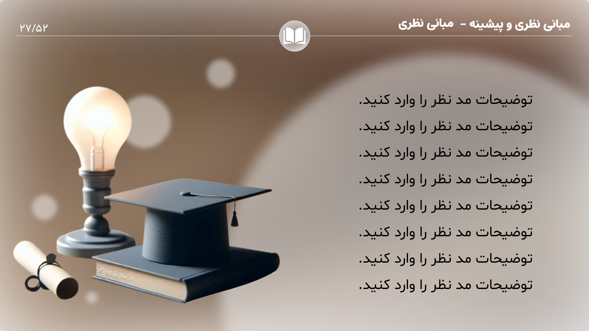 مناسب برای انواع ارائهها: با توجه به نوع طراحی این قالب، میتوانید از آن برای انواع ارائه ها از جمله پایان نامه و دانشگاهی و… در هر موضوعی استفاده کنید.