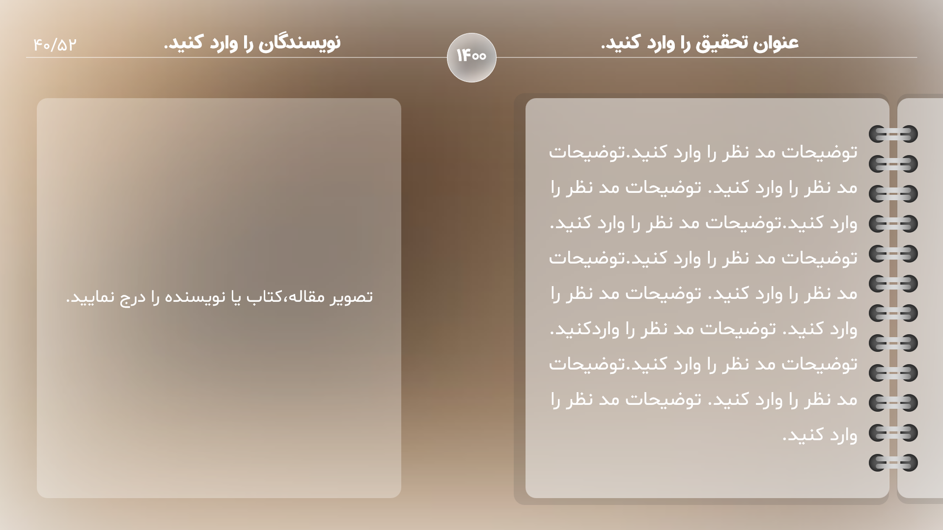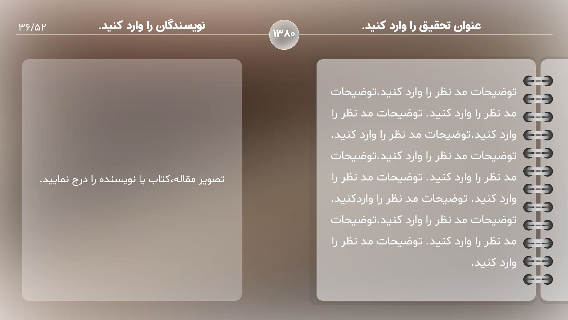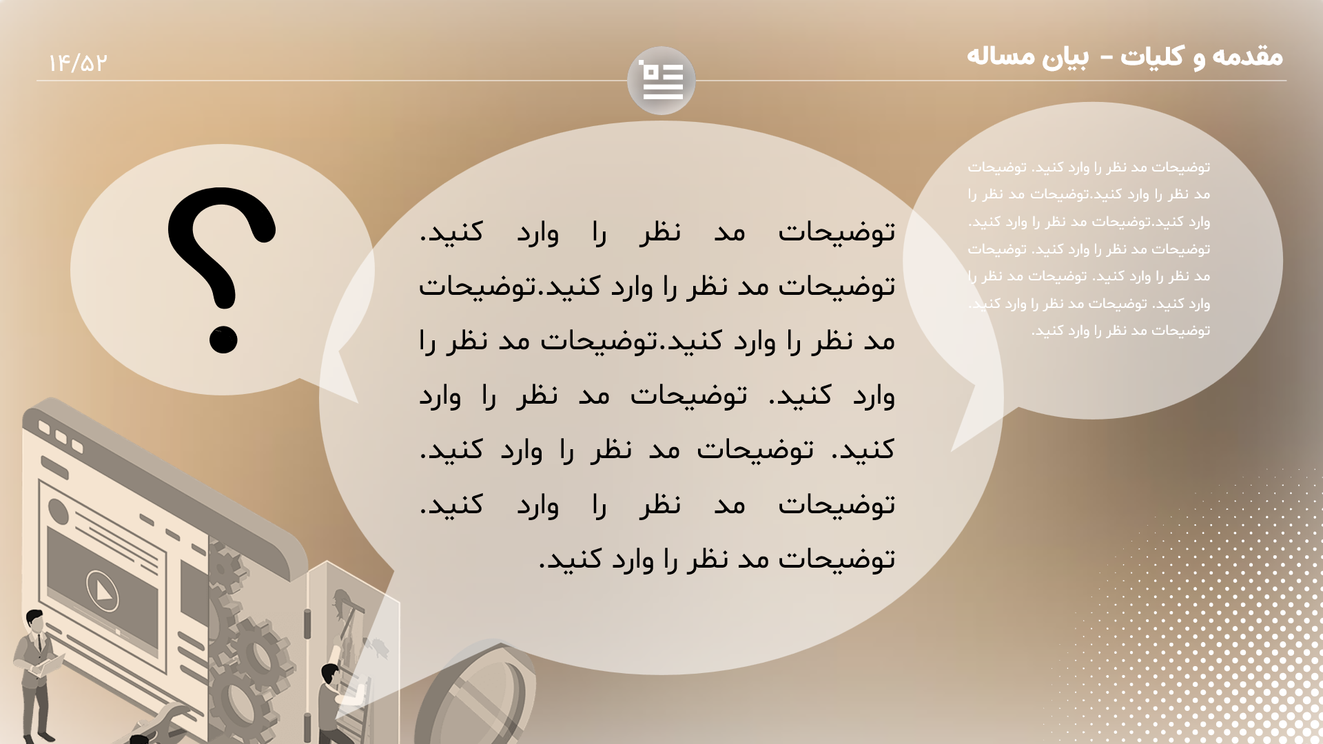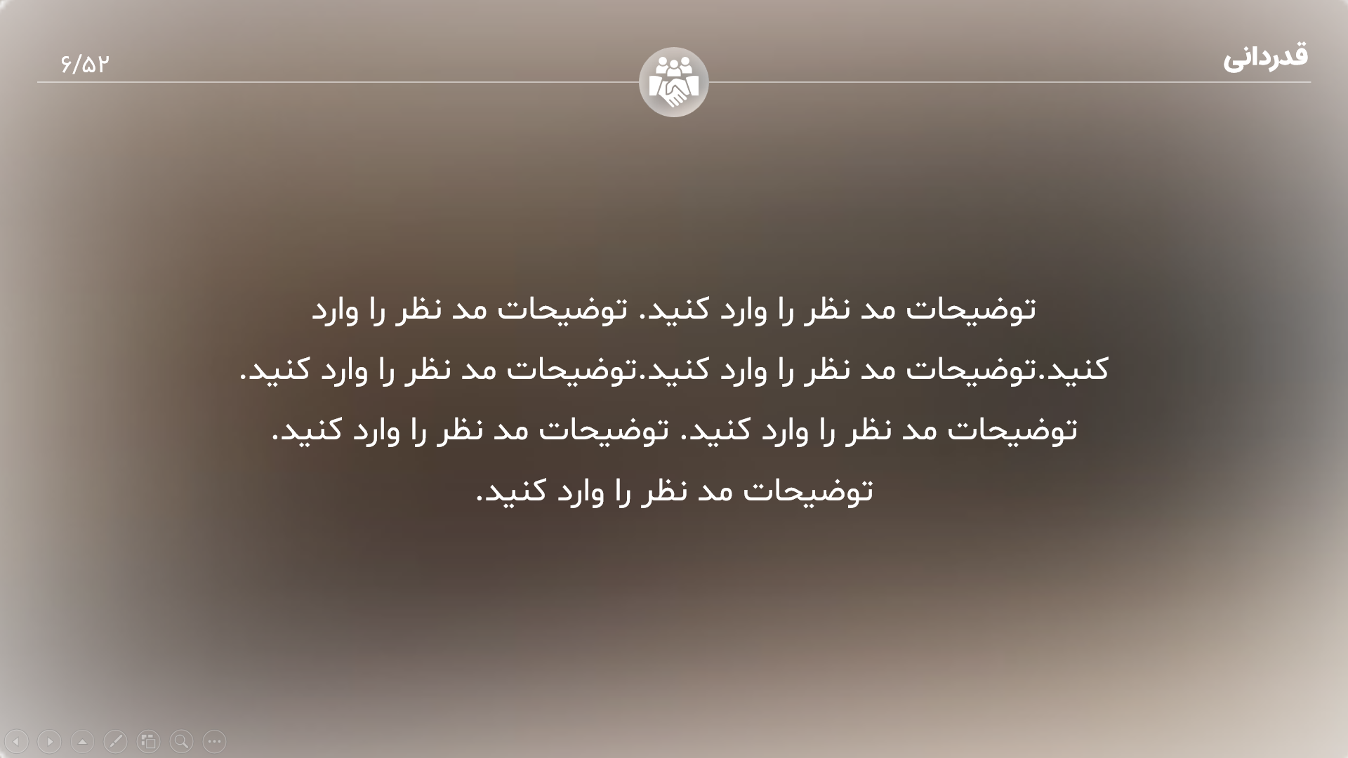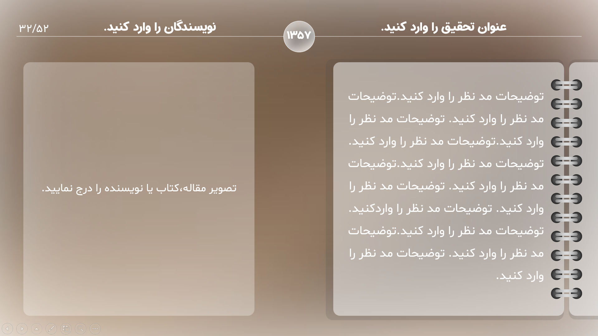 مناسب برای انواع ارائهها: با توجه به نوع طراحی این قالب، میتوانید از آن برای انواع ارائه ها از جمله پایان نامه و دانشگاهی و… در هر موضوعی استفاده کنید.