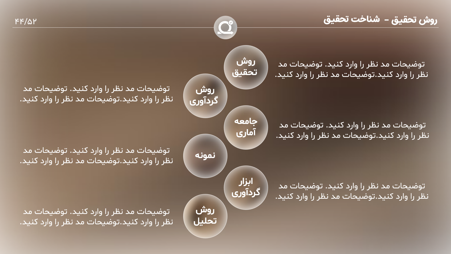 این تم در 52 اسلاید آماده شده است که از ترنزیشن جذاب مورف و ویژگی زوم در طراحی آن استفاده شده است که جزو سبک های بروز در ارائه های پاورپوینت میباشد.