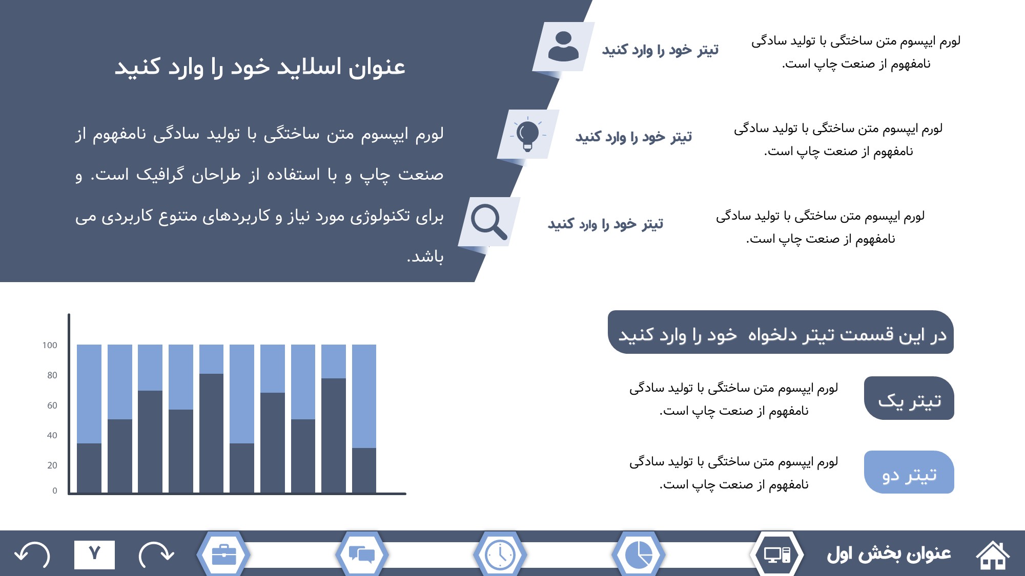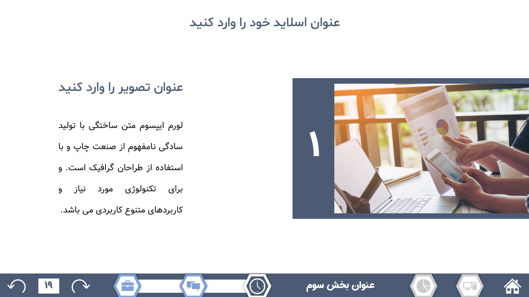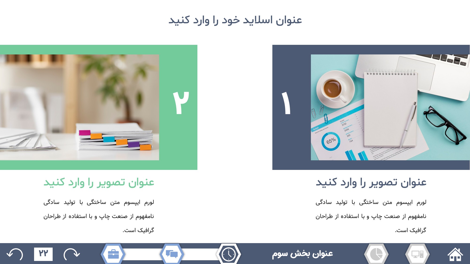 مناسب برای انواع ارائههای گزارشی: با توجه به نوع طراحی این قالب، میتوانید از آن برای انواع ارائه های گزارشی از جمله گزارش اداری و … استفاده کنید.