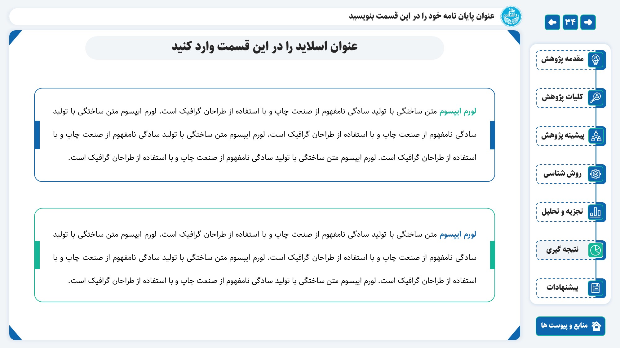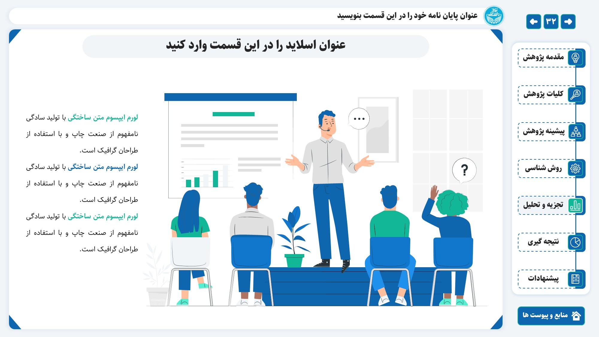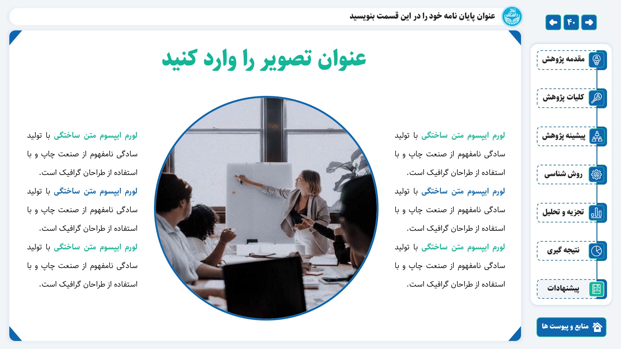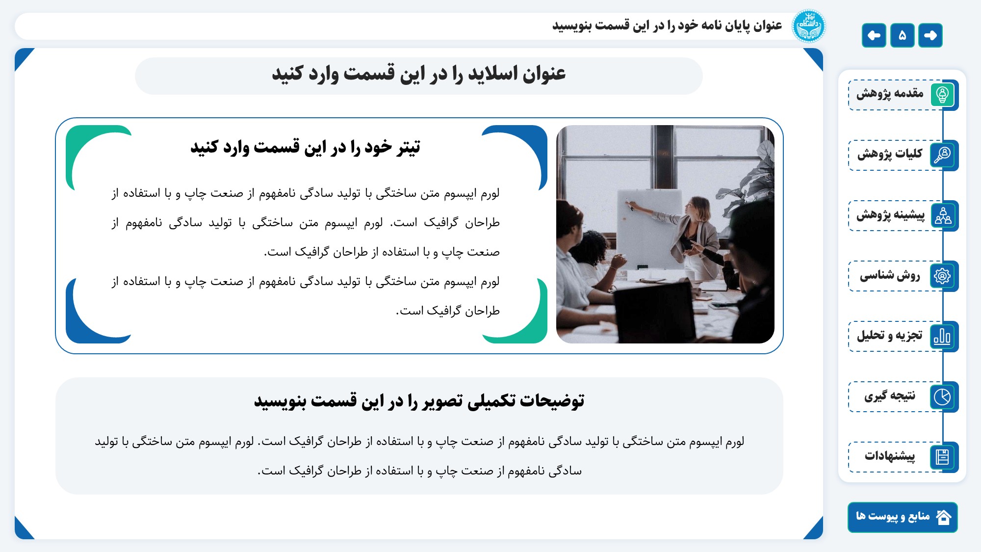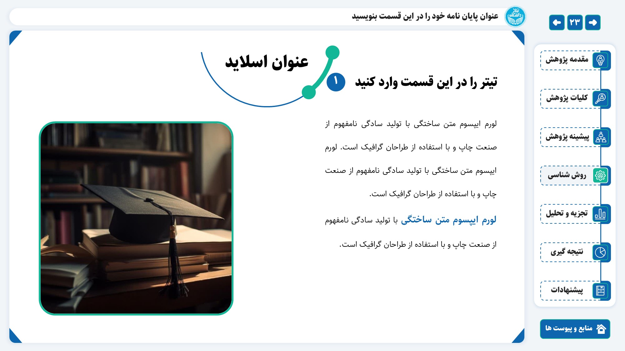 مناسب برای انواع ارائههای پایان نامه: با توجه به نوع طراحی این قالب، میتوانید از آن برای انواع ارائه های پایان نامه و پروپوزال ارشد و دکتری استفاده کنید.