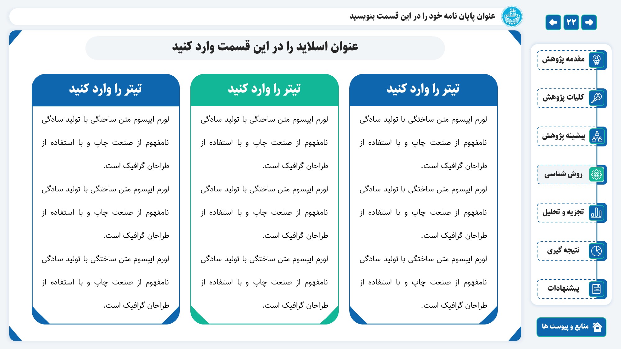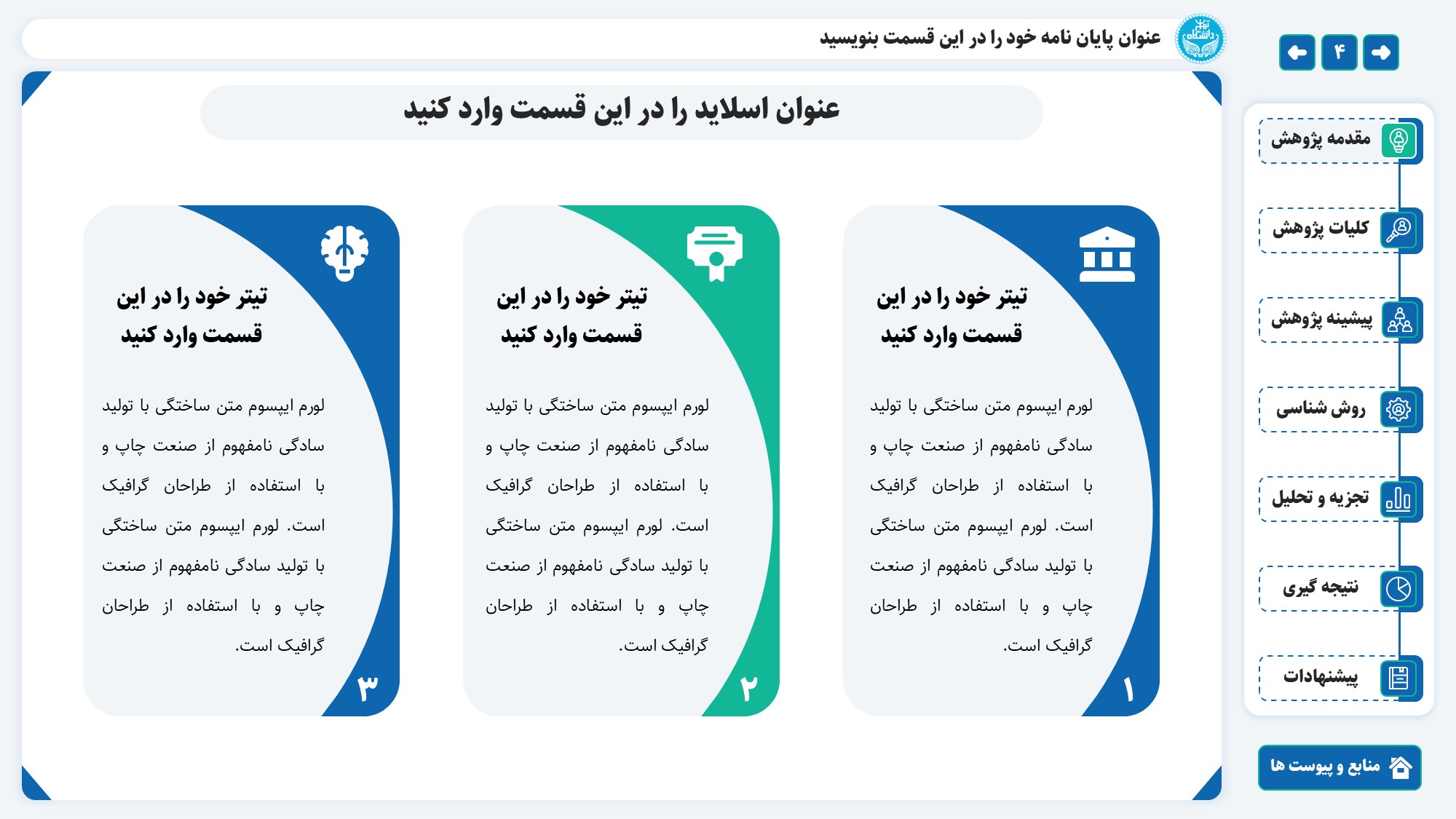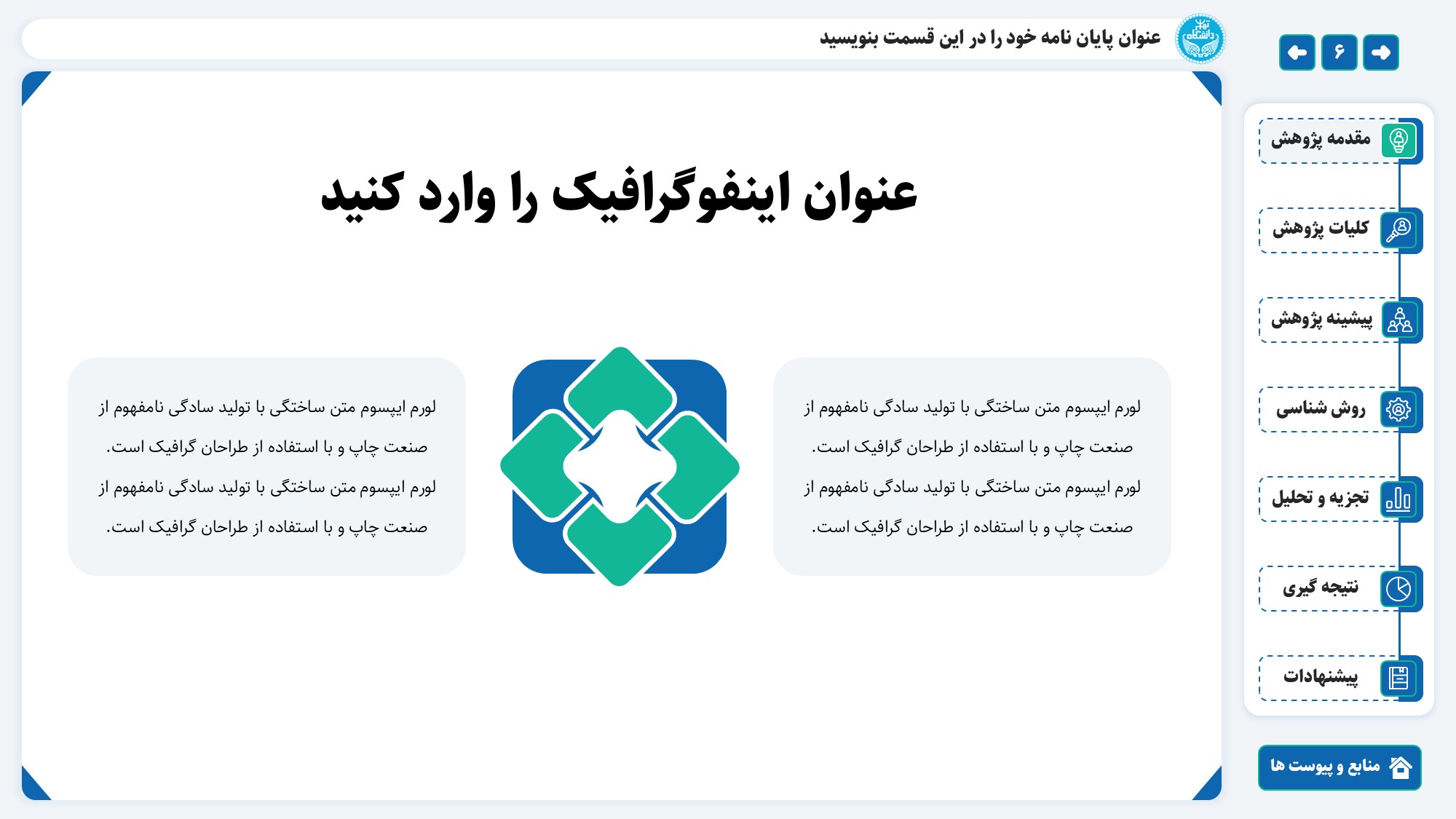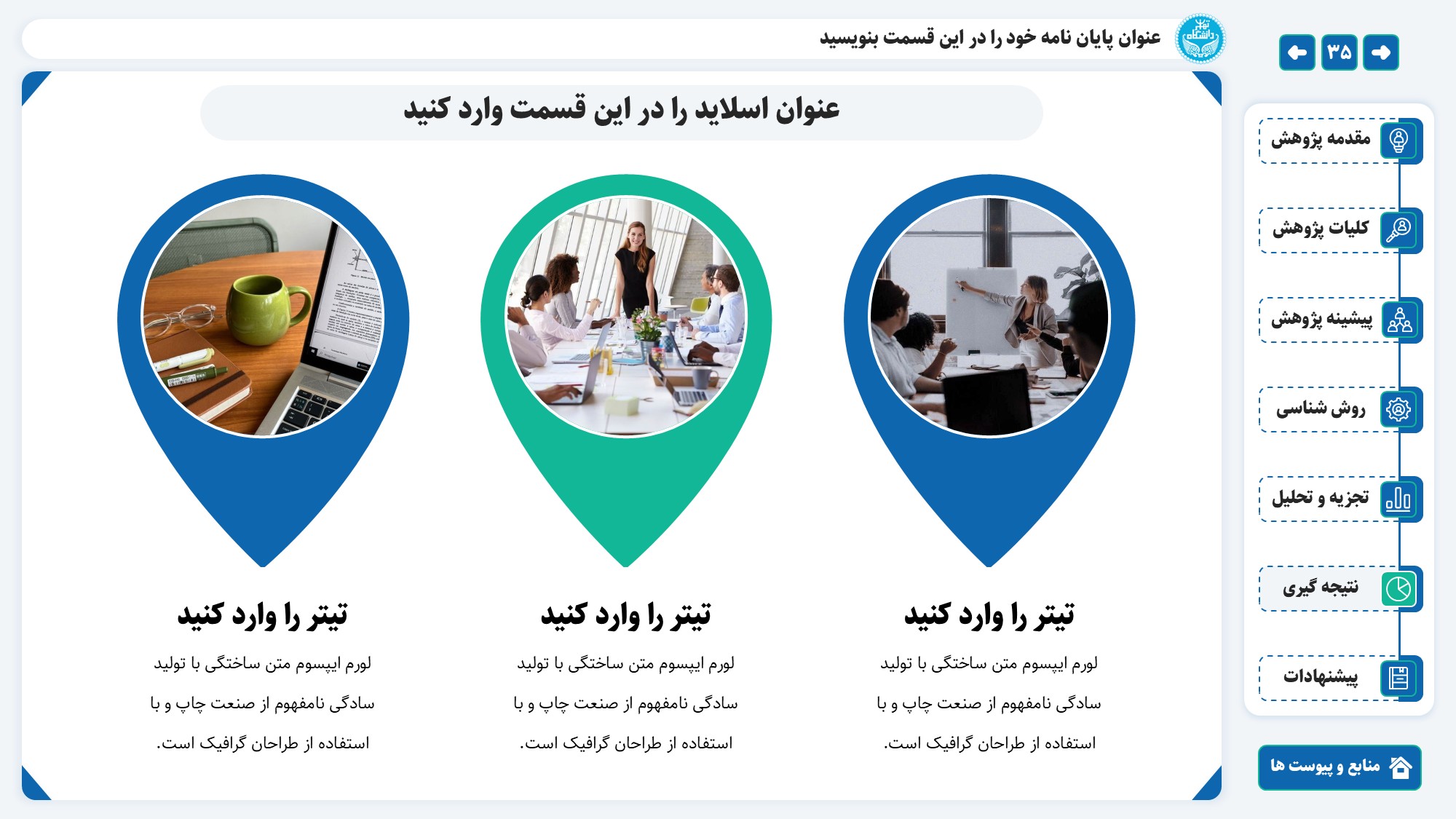 مناسب برای انواع ارائههای پایان نامه: با توجه به نوع طراحی این قالب، میتوانید از آن برای انواع ارائه های پایان نامه و پروپوزال ارشد و دکتری استفاده کنید.