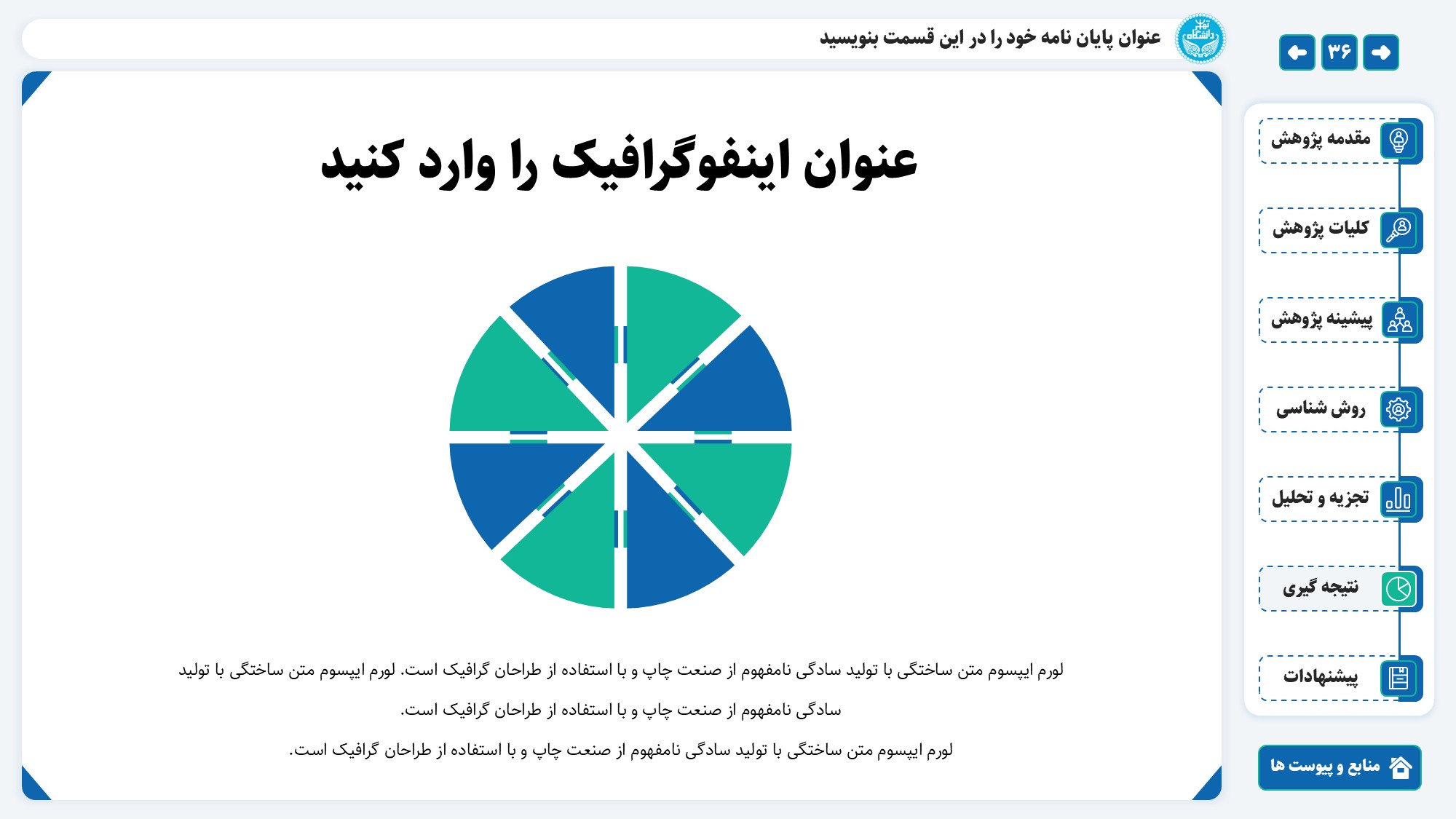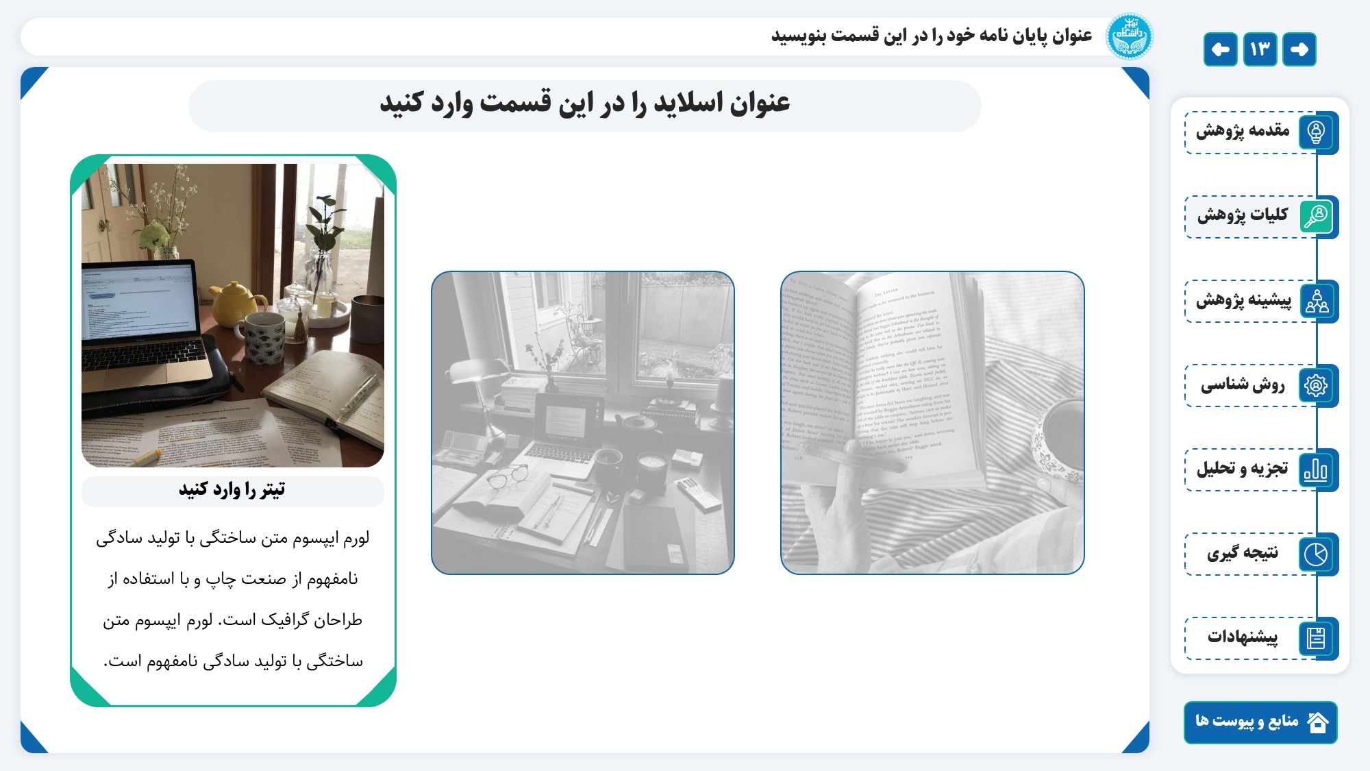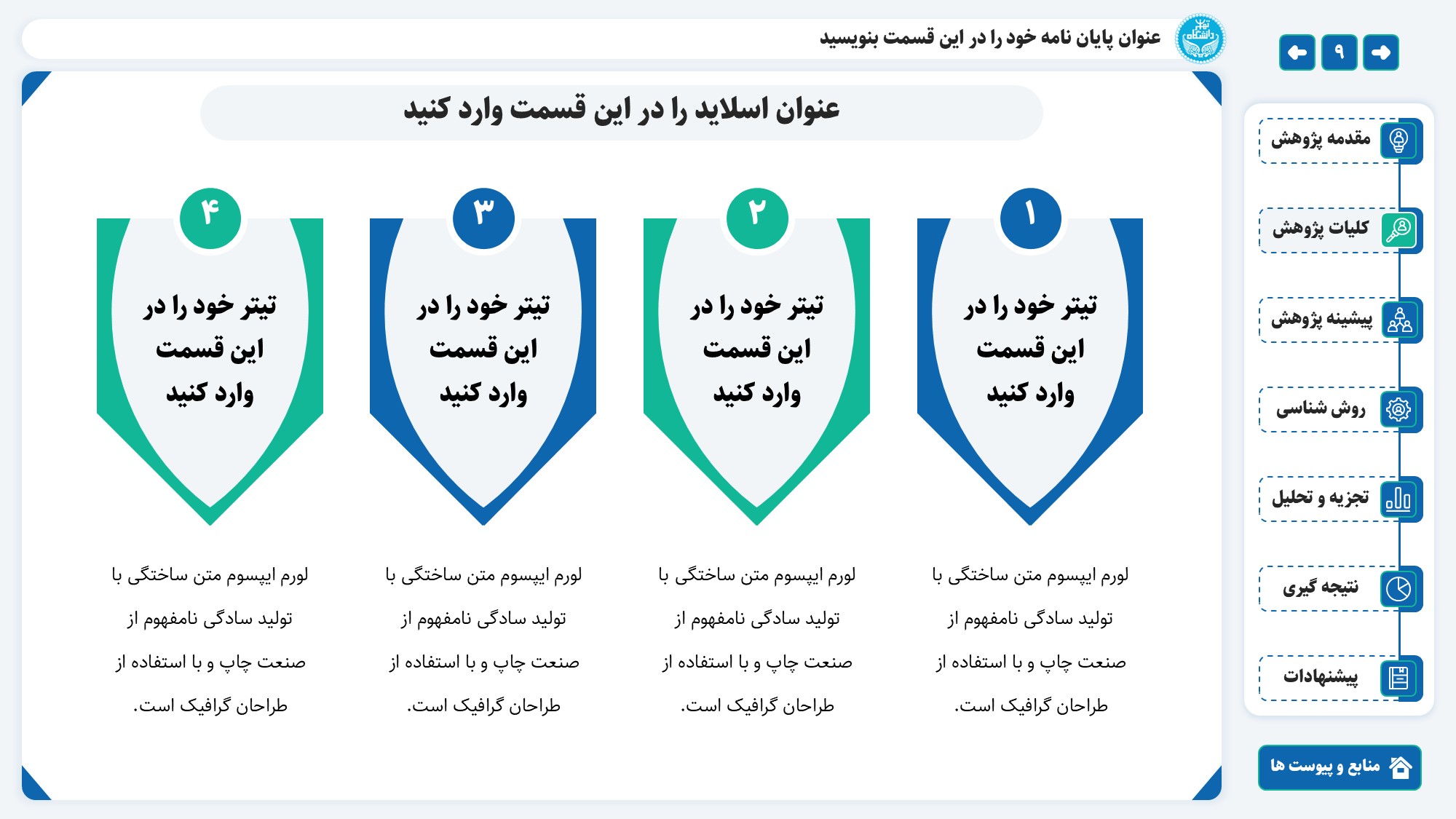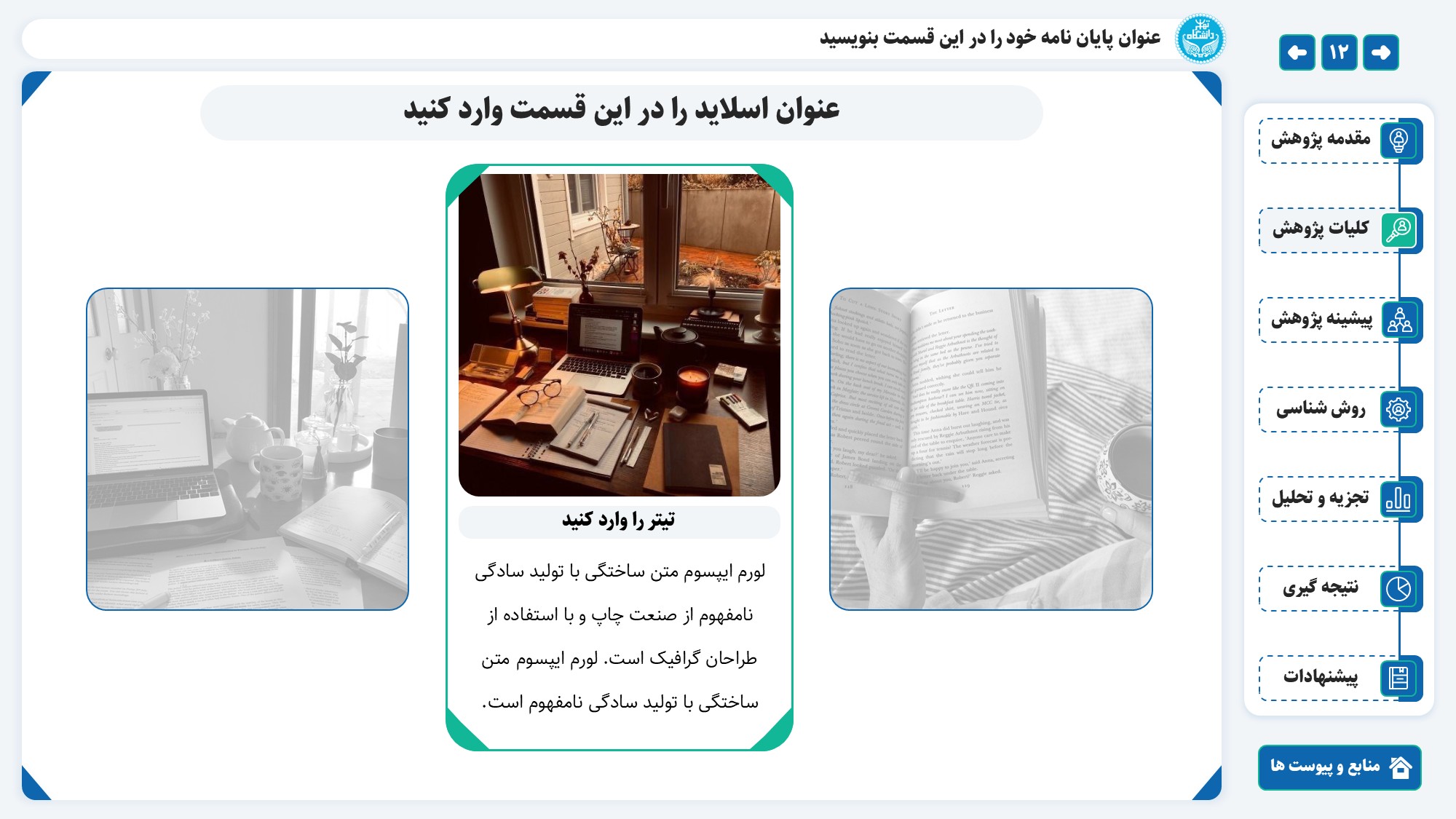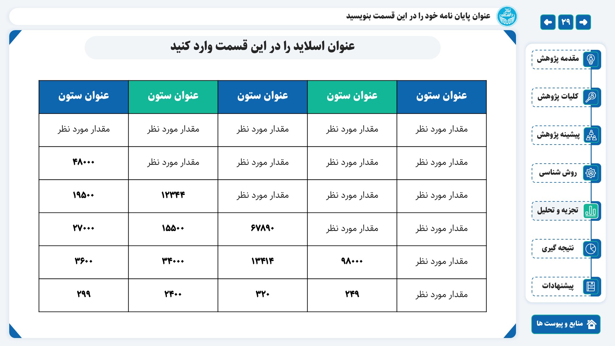 مناسب برای انواع ارائههای پایان نامه: با توجه به نوع طراحی این قالب، میتوانید از آن برای انواع ارائه های پایان نامه و پروپوزال ارشد و دکتری استفاده کنید.