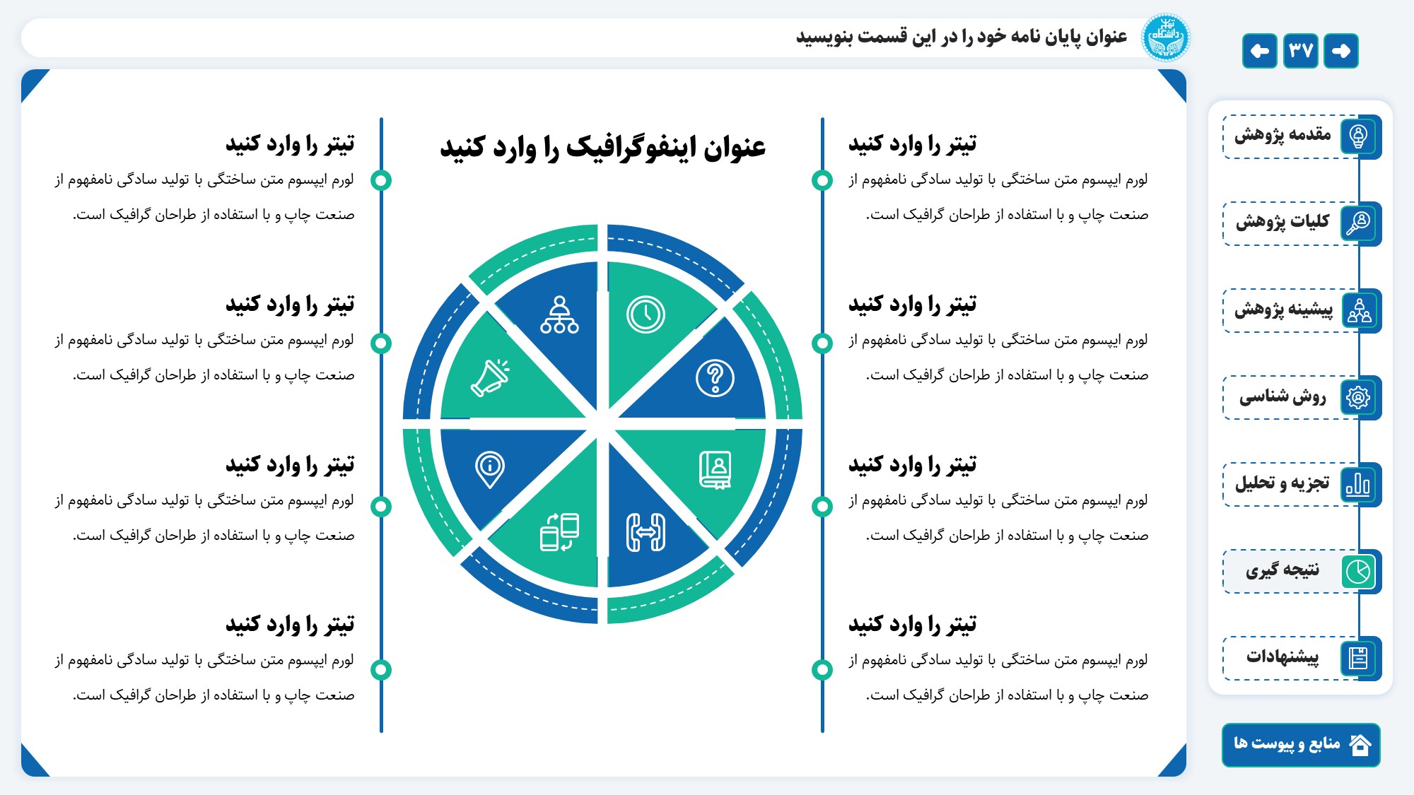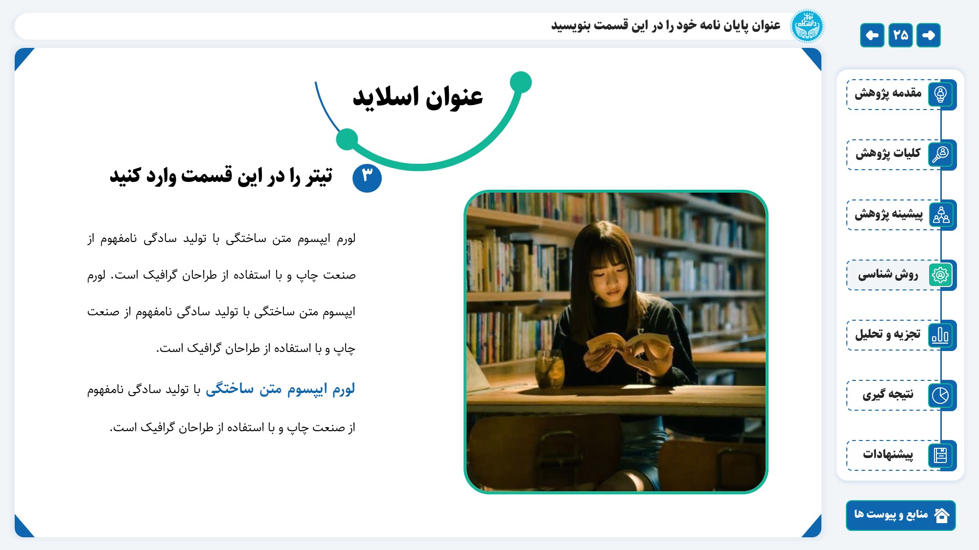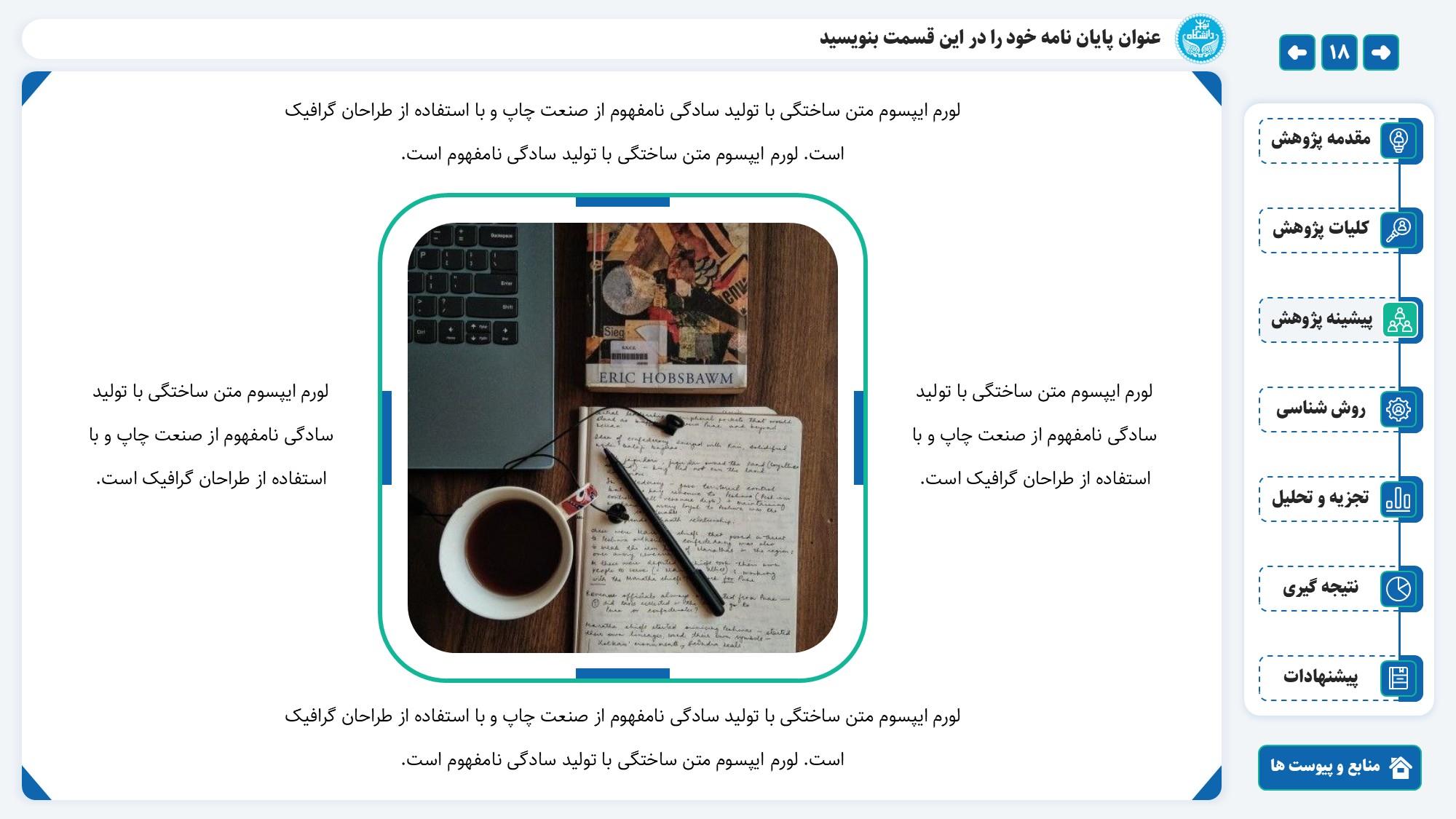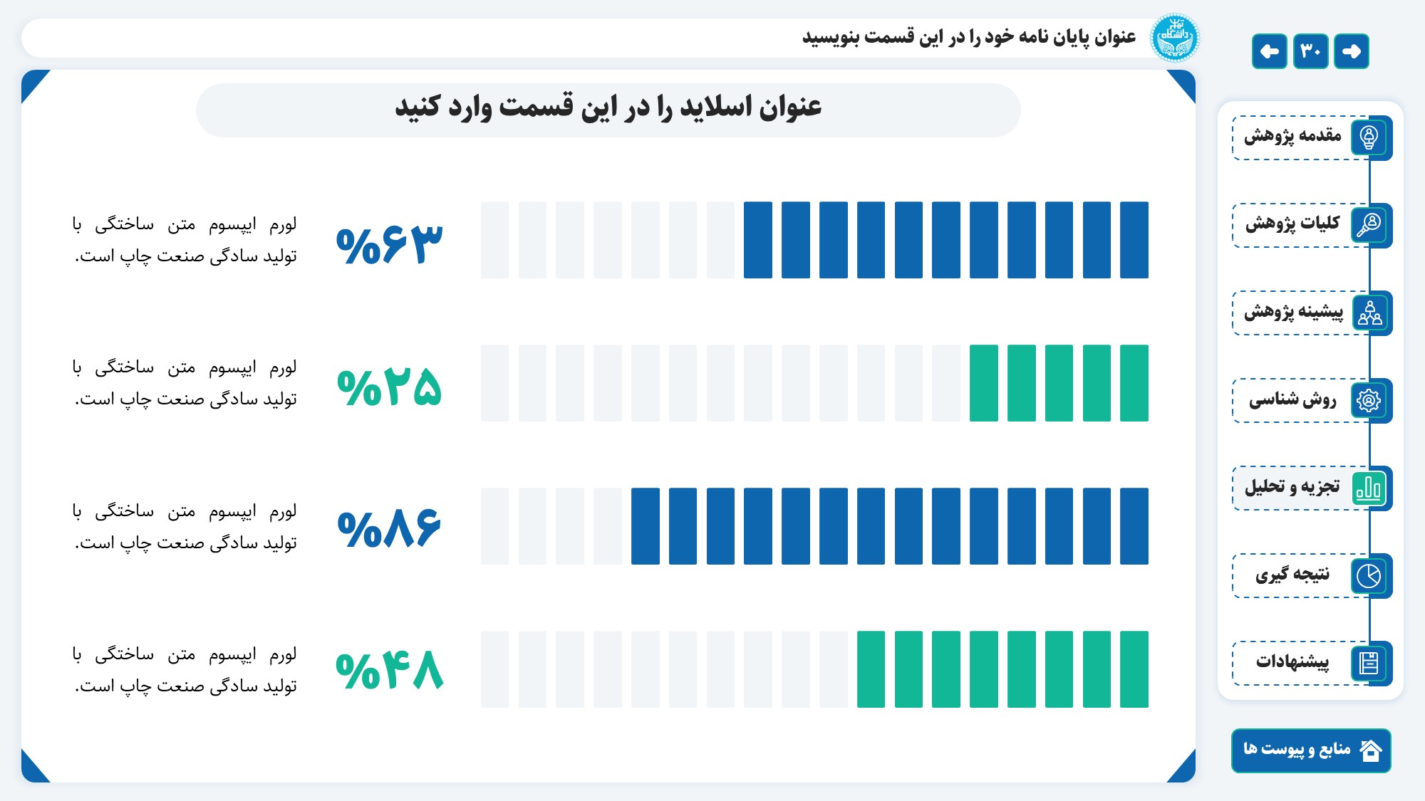 مناسب برای انواع ارائههای پایان نامه: با توجه به نوع طراحی این قالب، میتوانید از آن برای انواع ارائه های پایان نامه و پروپوزال ارشد و دکتری استفاده کنید.