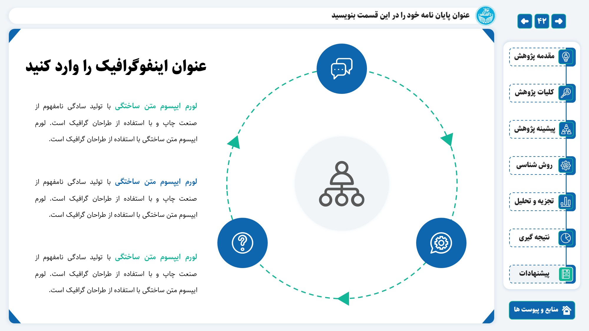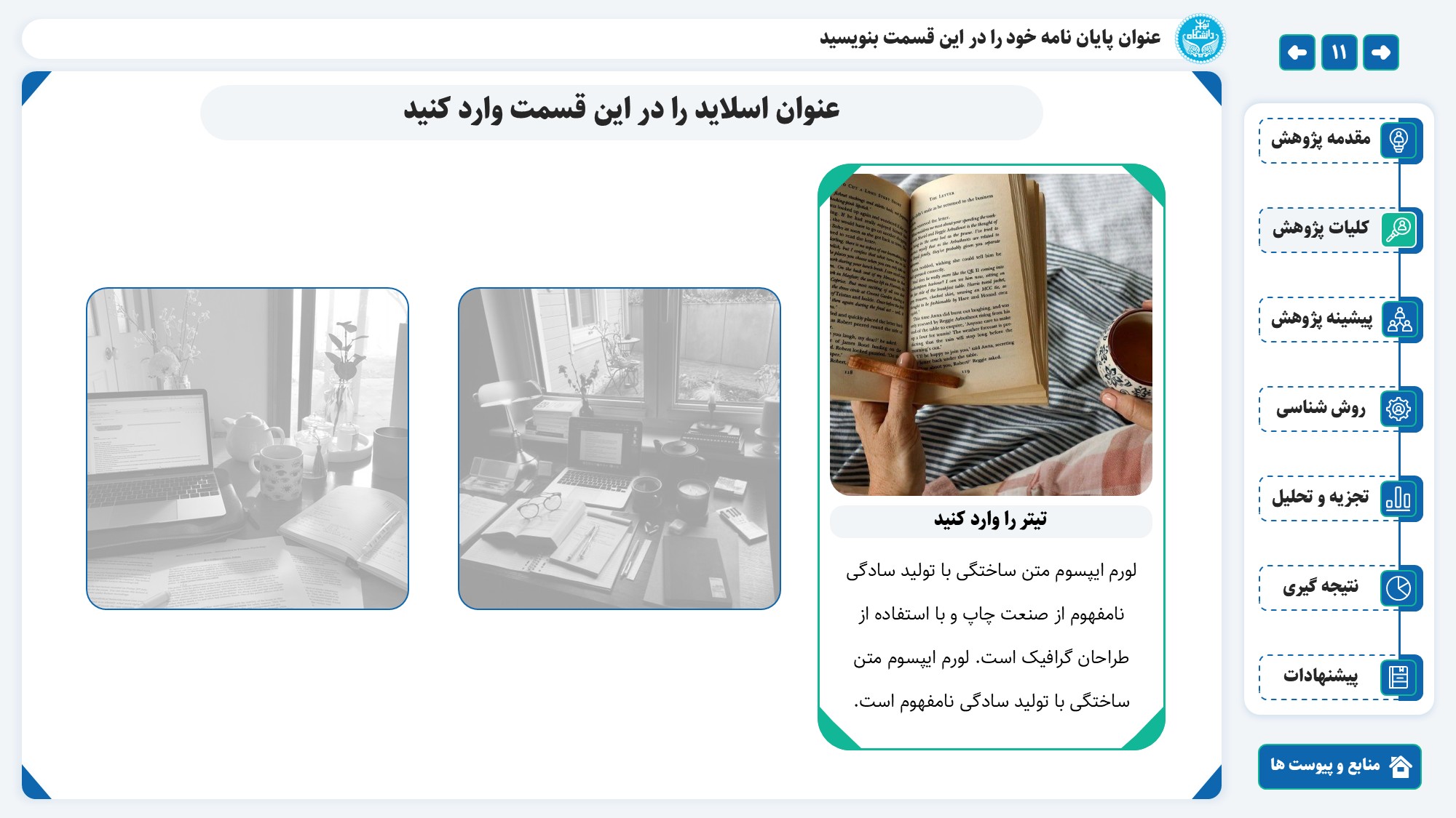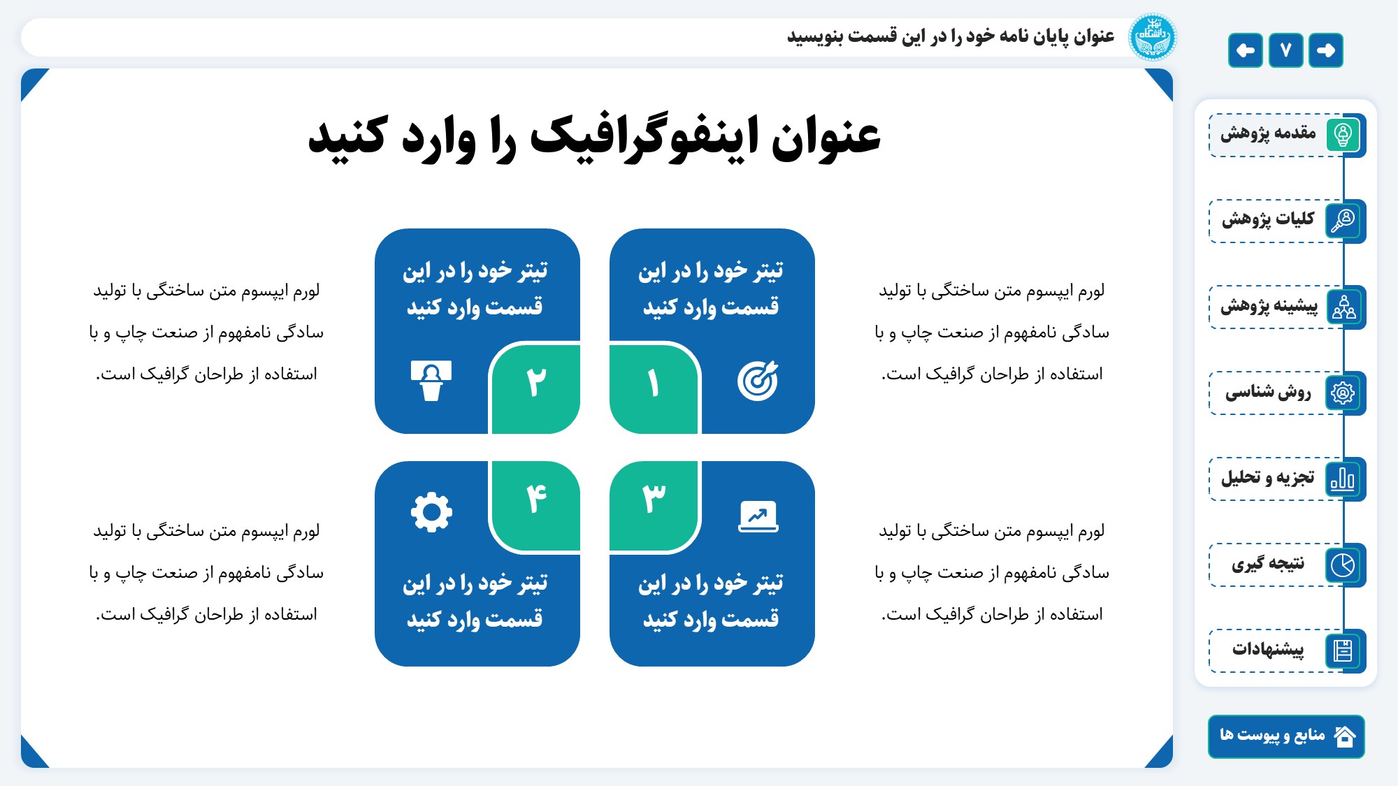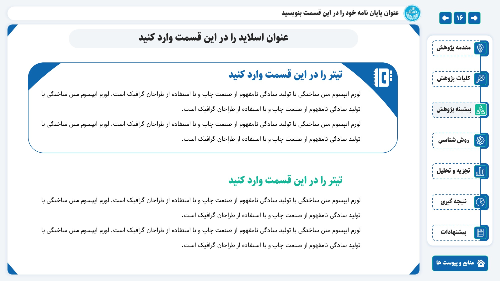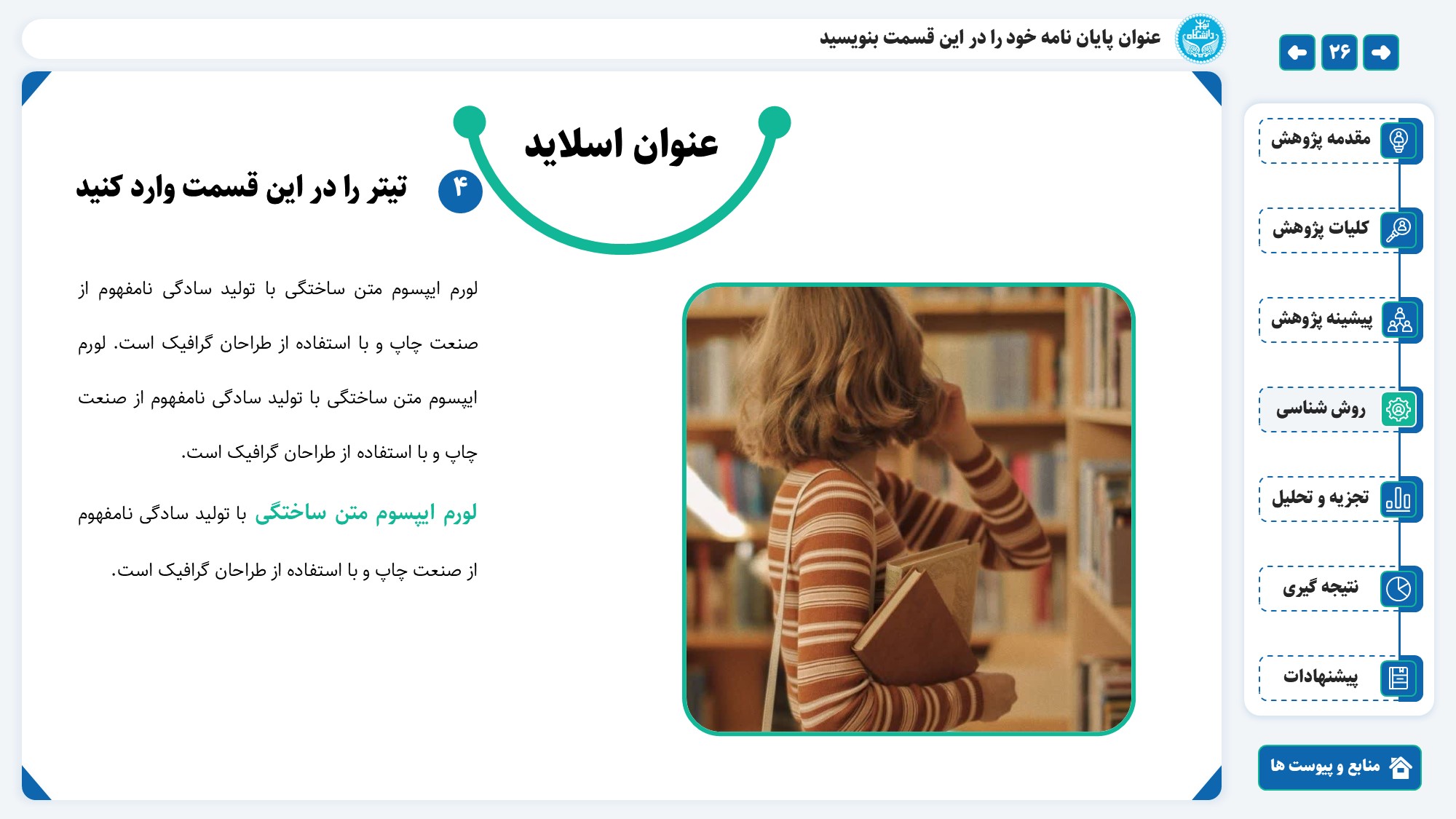 مناسب برای انواع ارائههای پایان نامه: با توجه به نوع طراحی این قالب، میتوانید از آن برای انواع ارائه های پایان نامه و پروپوزال ارشد و دکتری استفاده کنید.
