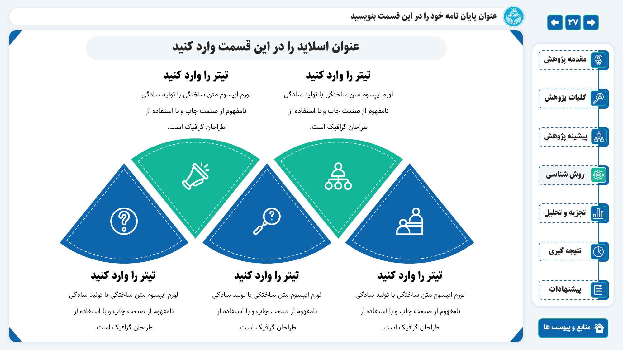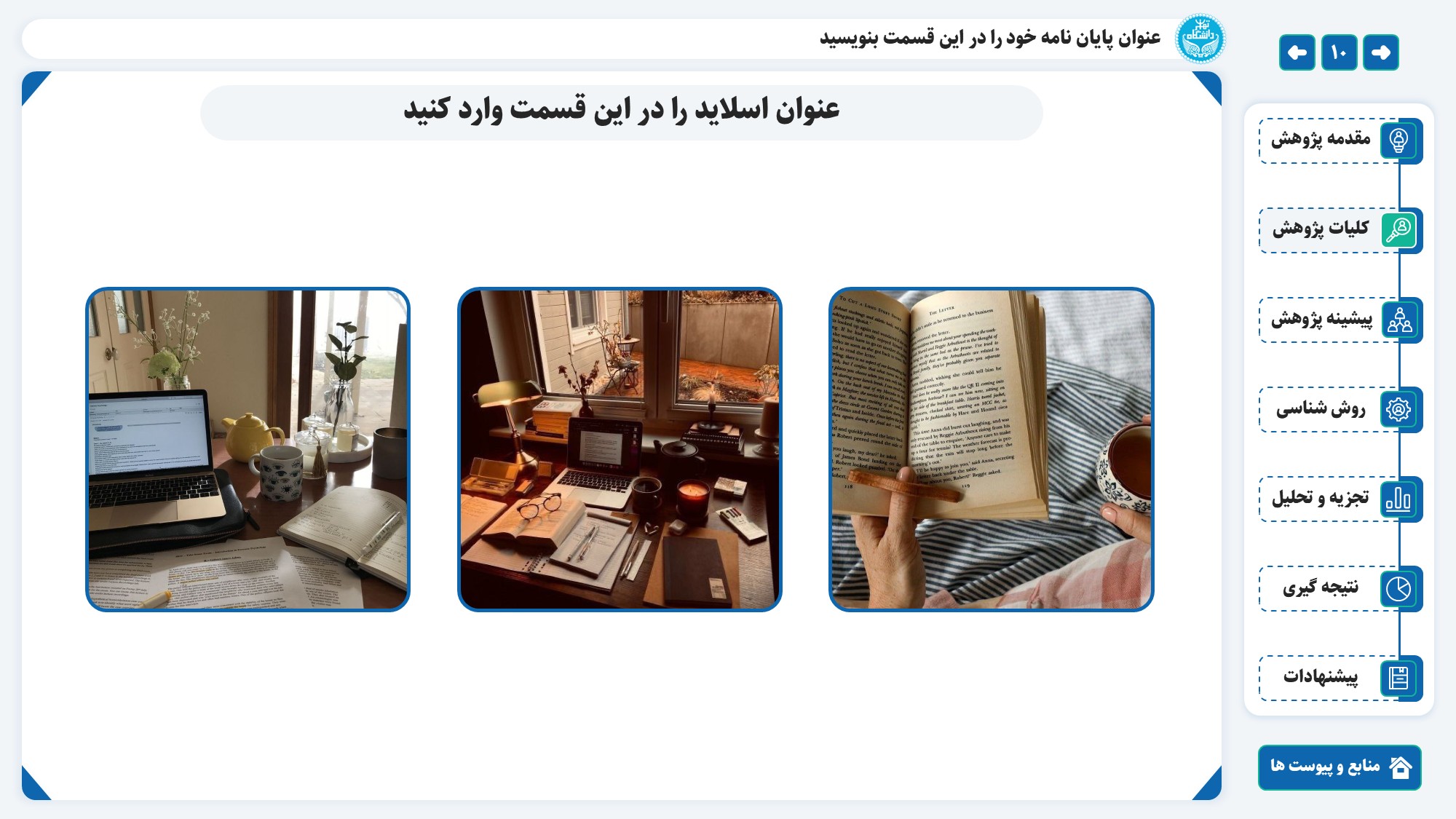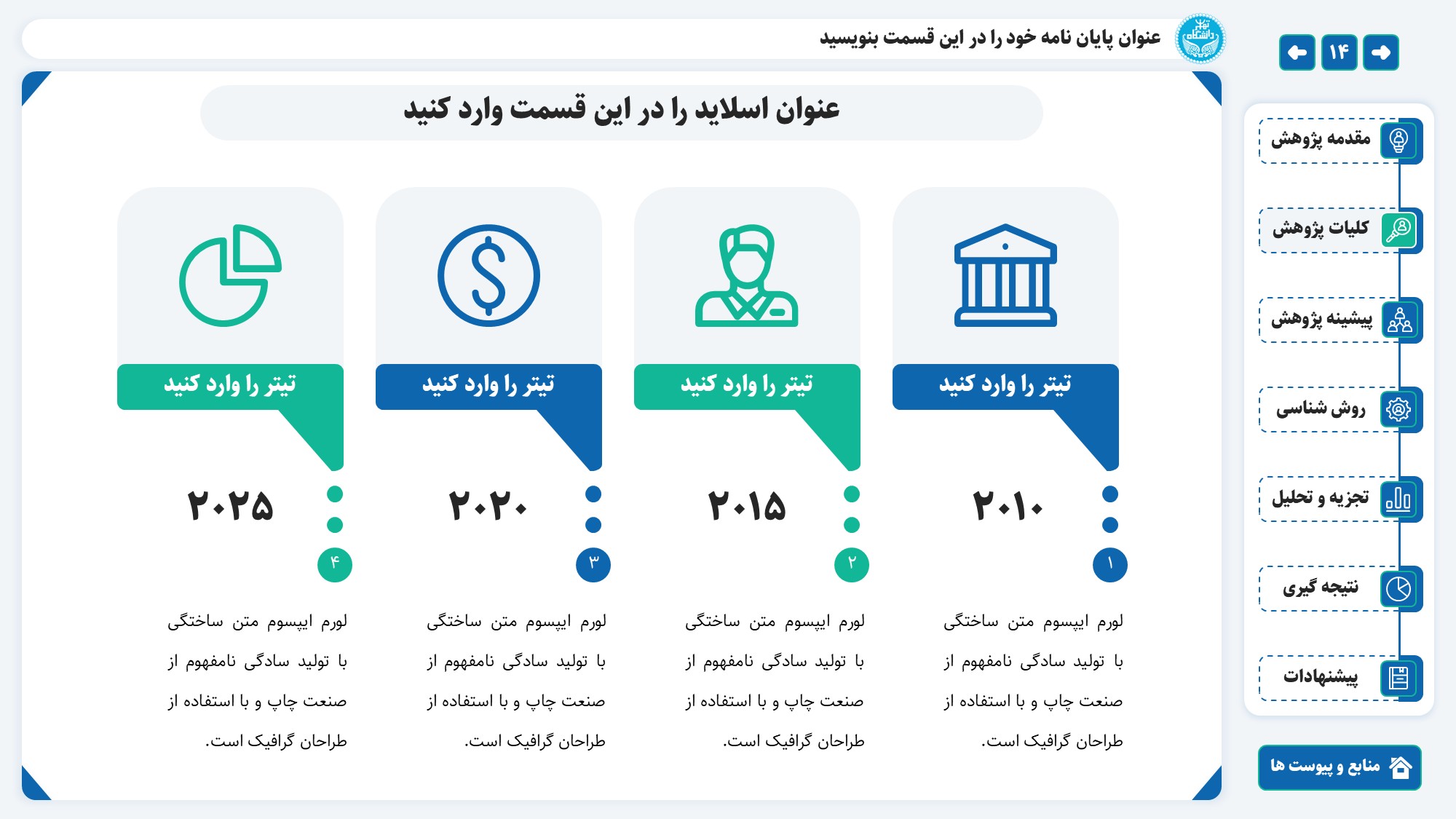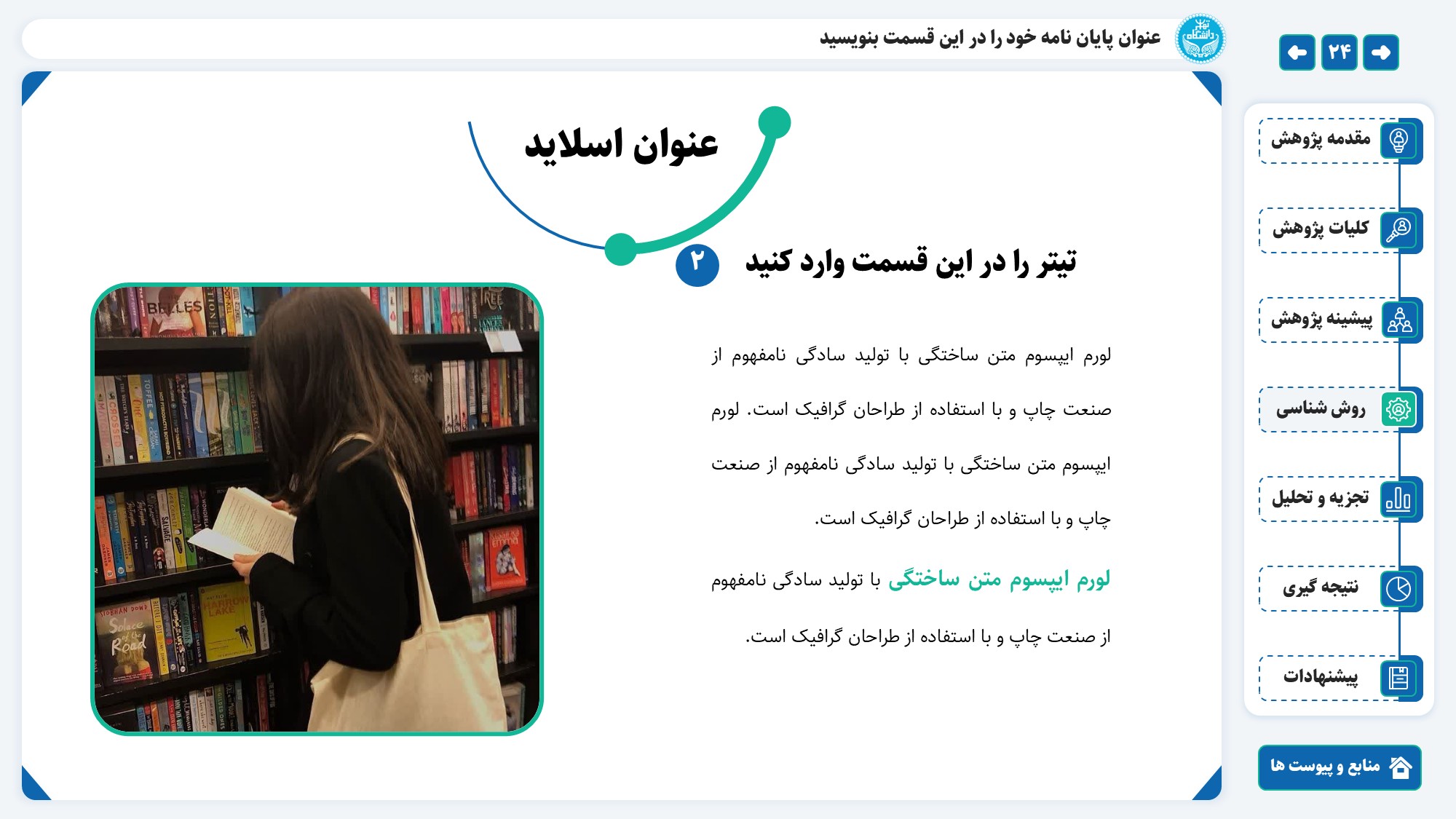 مناسب برای انواع ارائههای پایان نامه: با توجه به نوع طراحی این قالب، میتوانید از آن برای انواع ارائه های پایان نامه و پروپوزال ارشد و دکتری استفاده کنید.