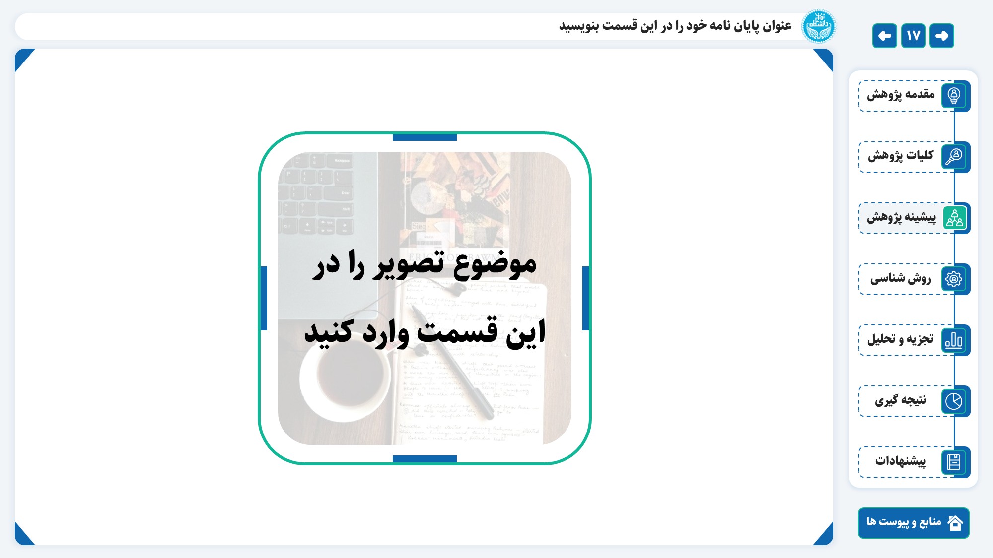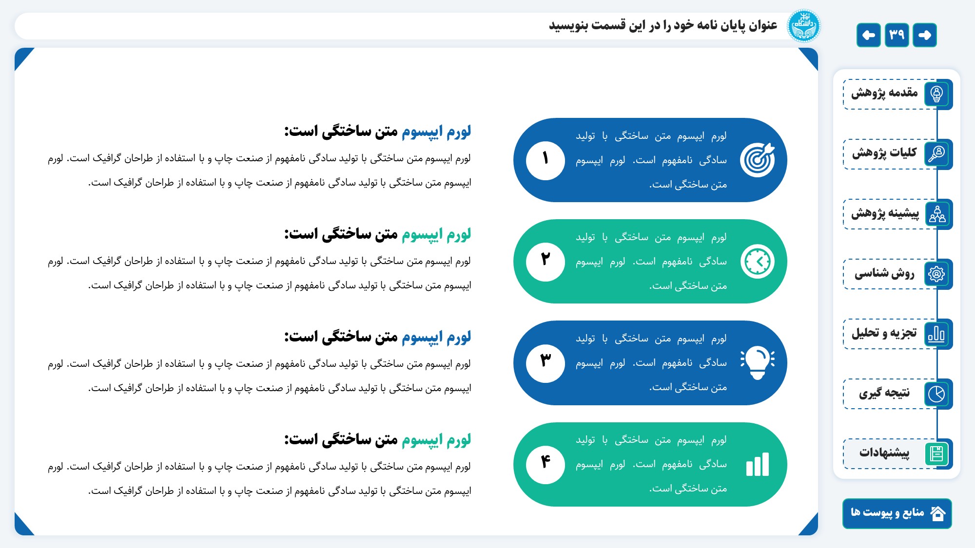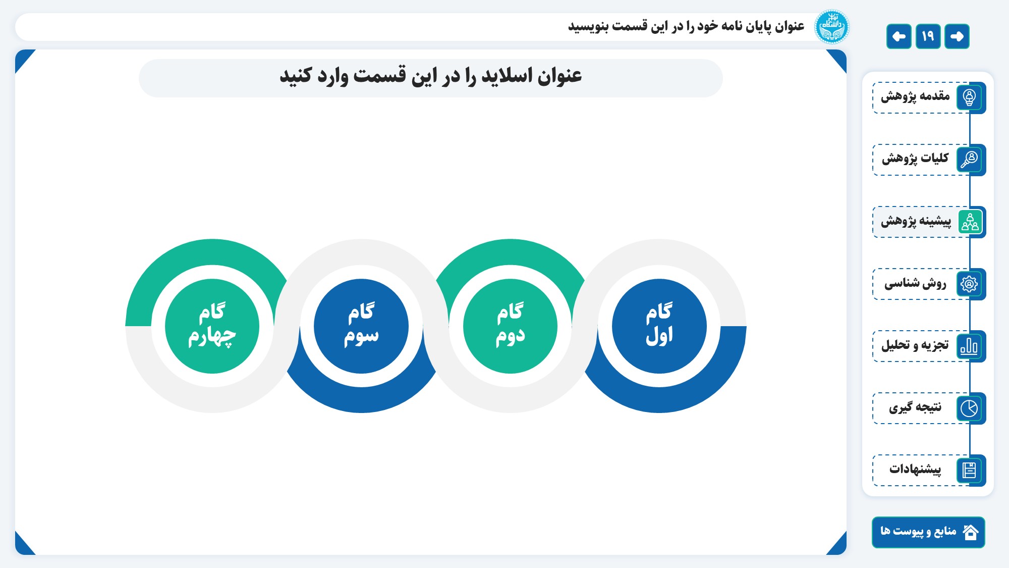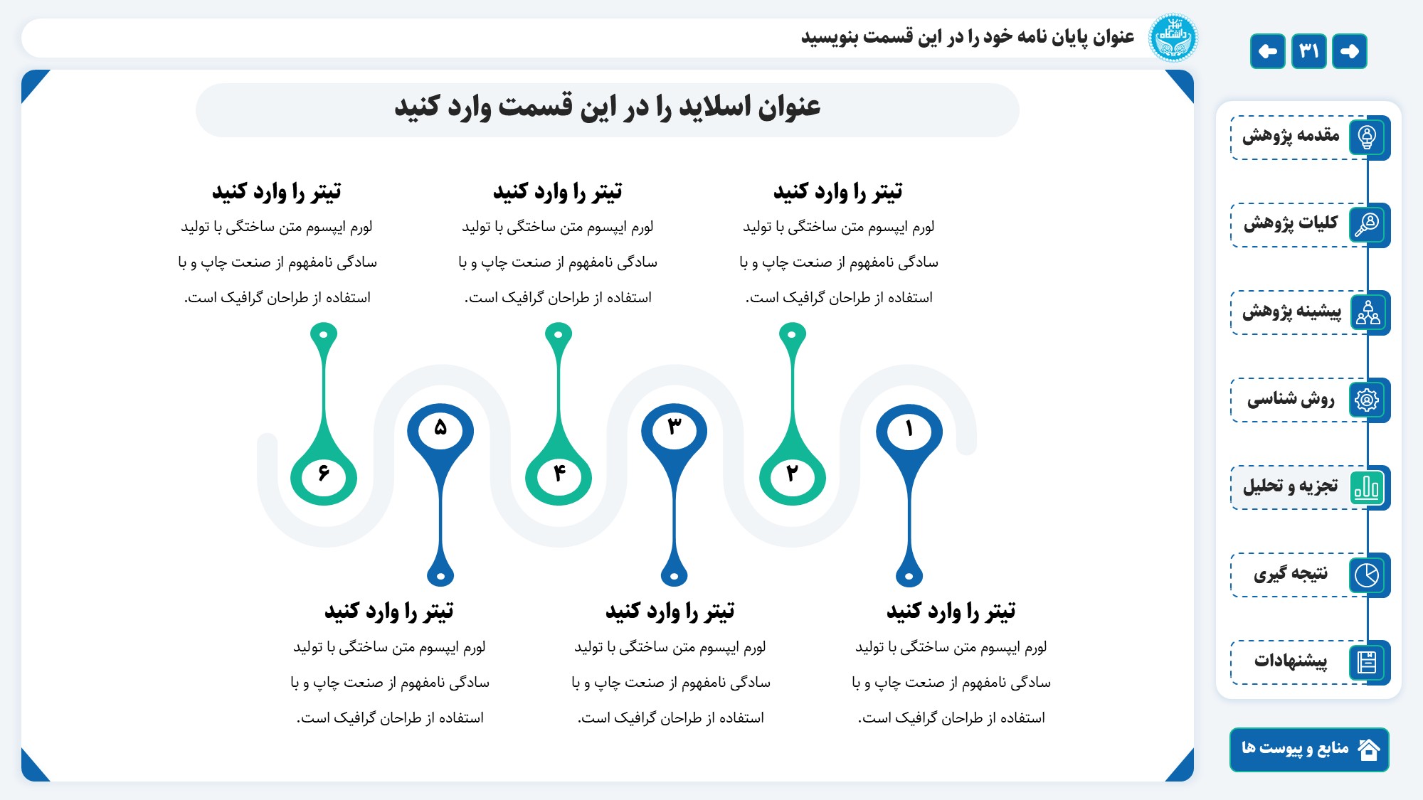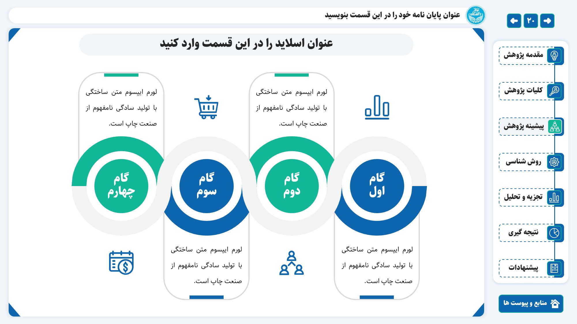 مناسب برای انواع ارائههای پایان نامه: با توجه به نوع طراحی این قالب، میتوانید از آن برای انواع ارائه های پایان نامه و پروپوزال ارشد و دکتری استفاده کنید.