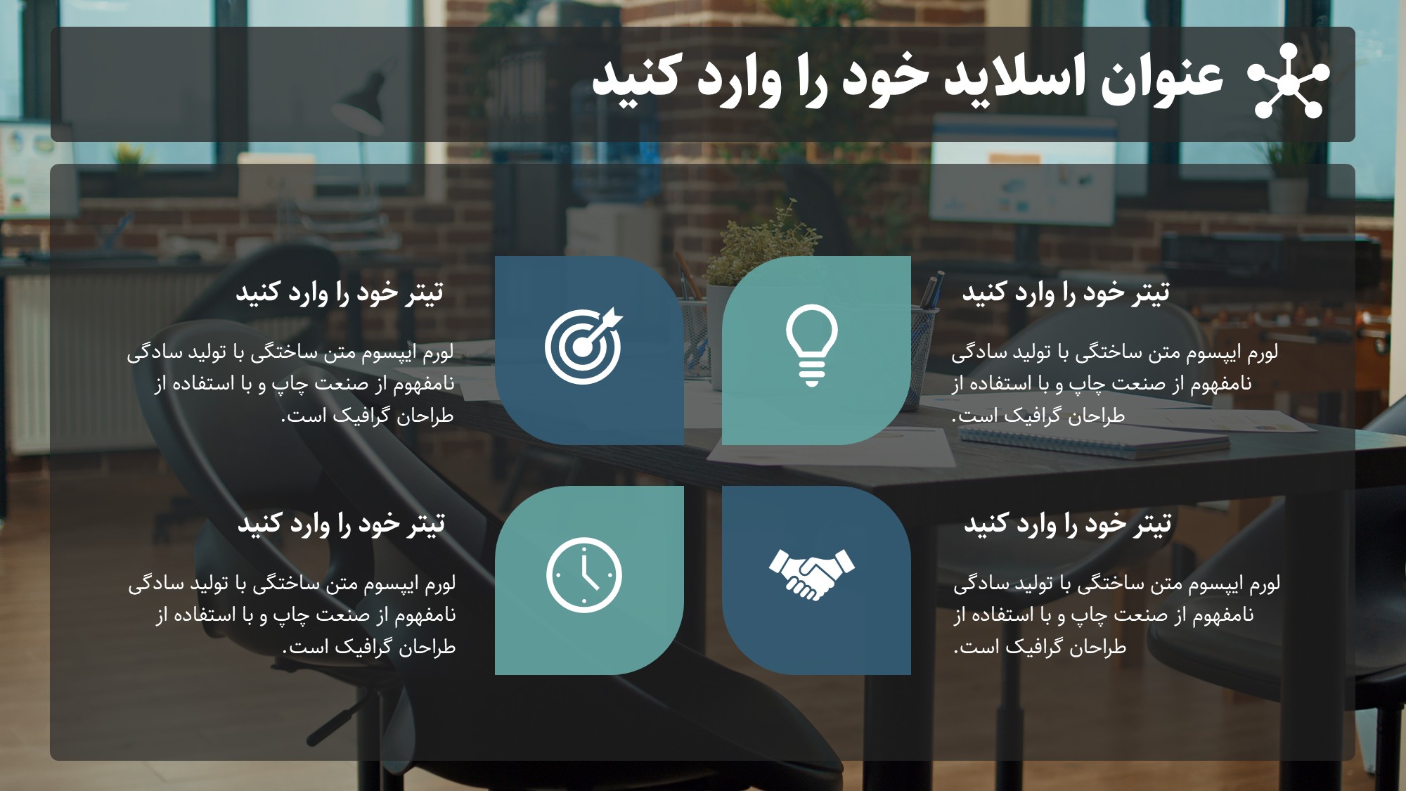 این تم دارای 27 اسلاید متفاوت و جذاب است که با رنگ بندی رسمی طراحی شده و شما میتوانید در انواع ارائه ها از جمله پایان نامه، مدیریتی، اداری، دانشگاهی، گزارش و … از آن استفاده کنید. با مشاهده آموزش ویرایش و شخصی سازی این قالب قادر خواهید بود تغییرات دلخواه خود را براحتی روی آن اعمال کنید.