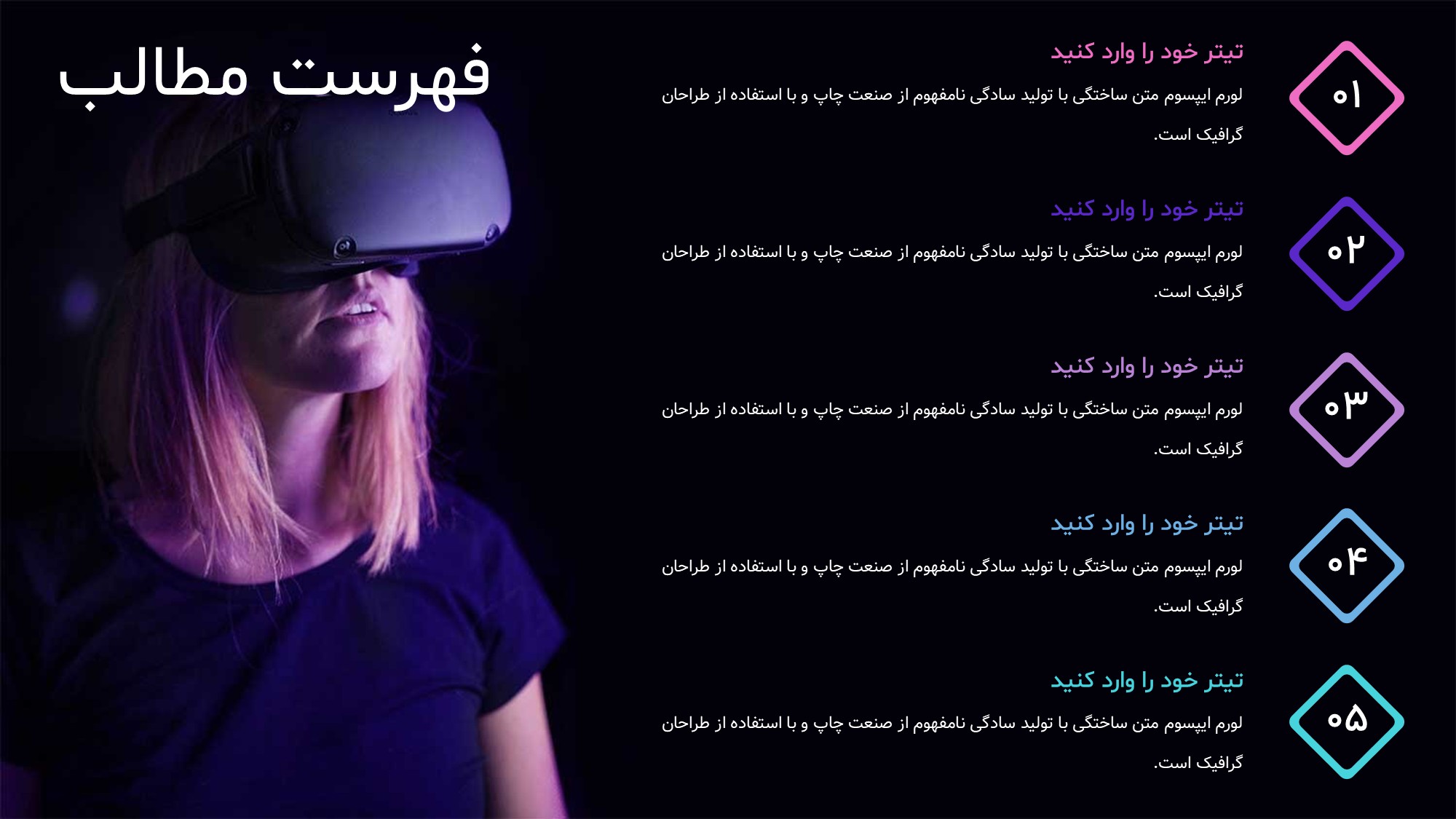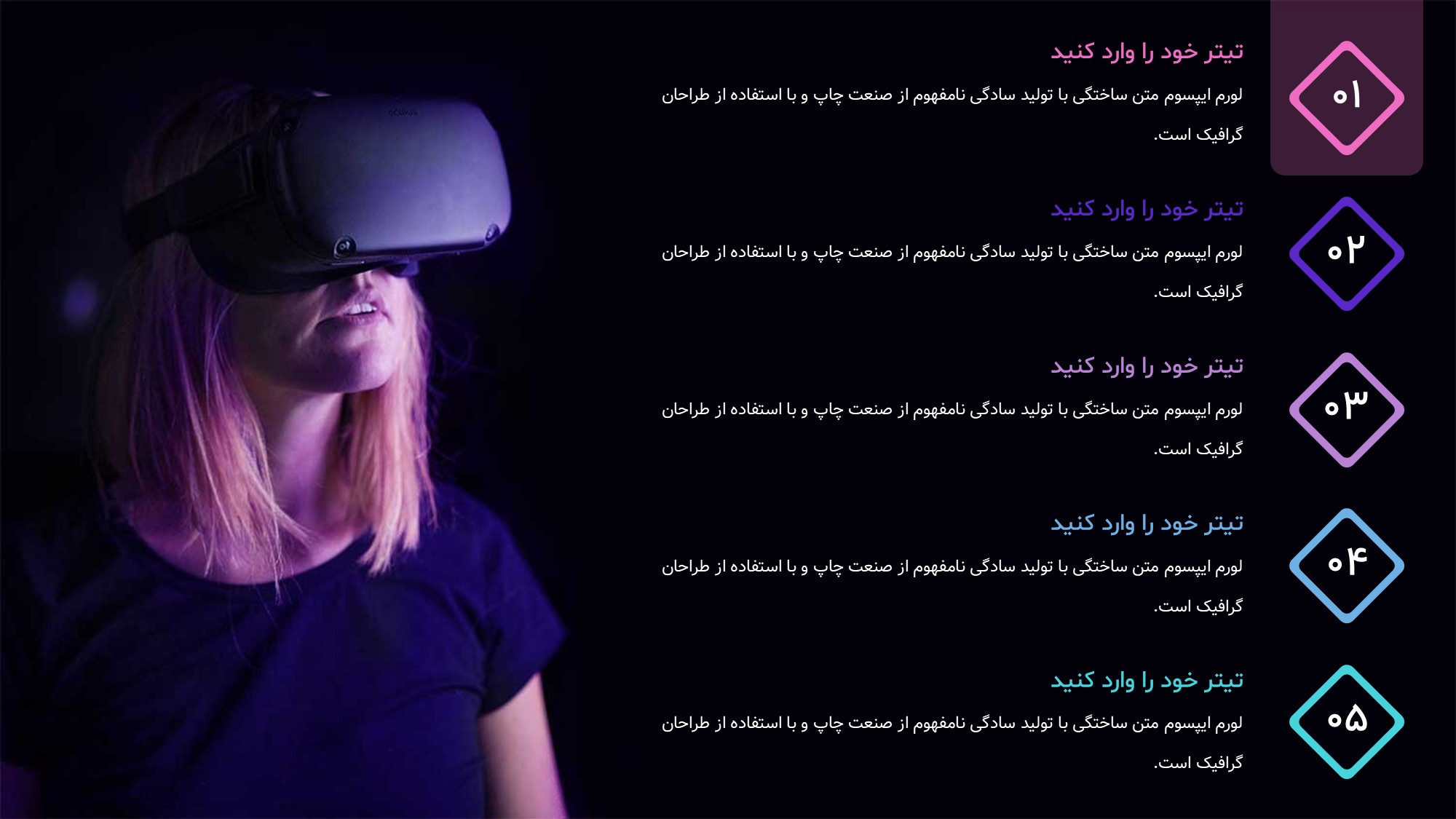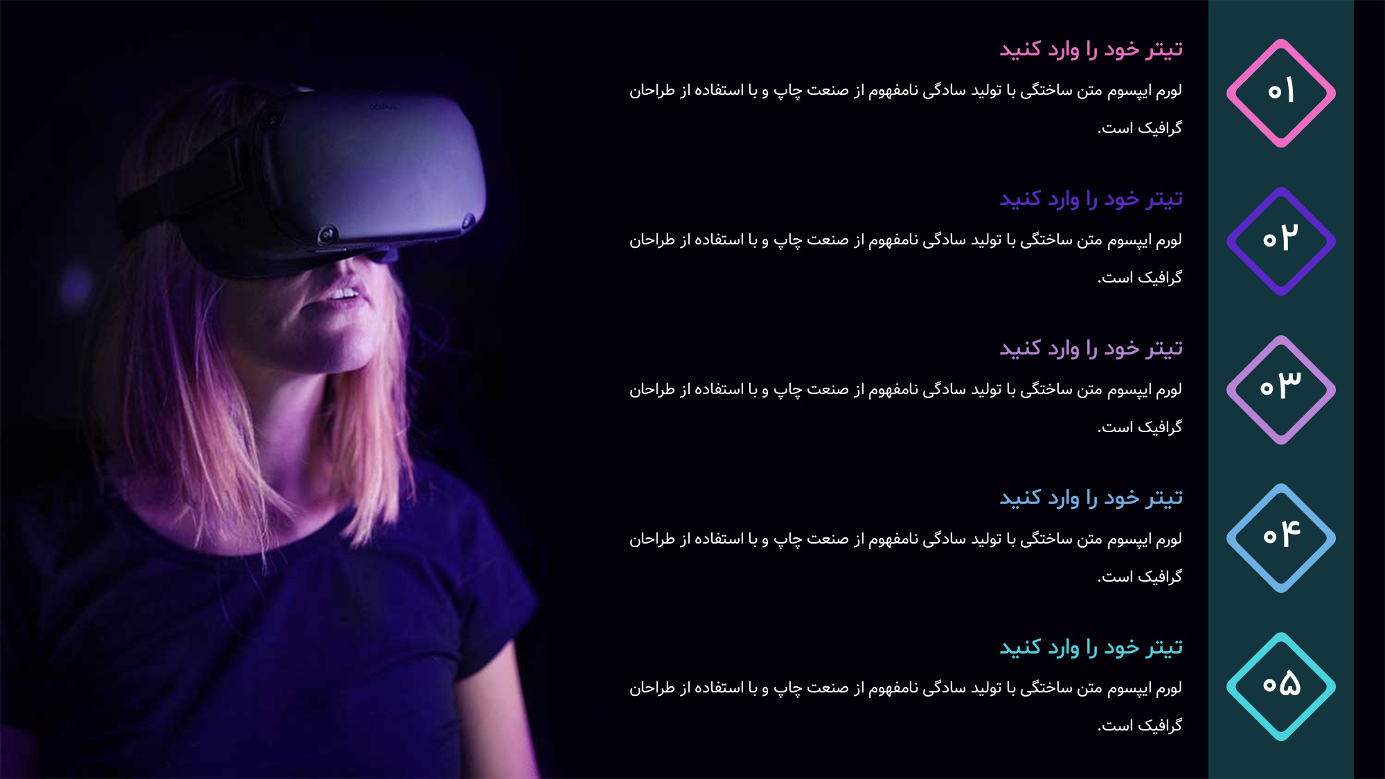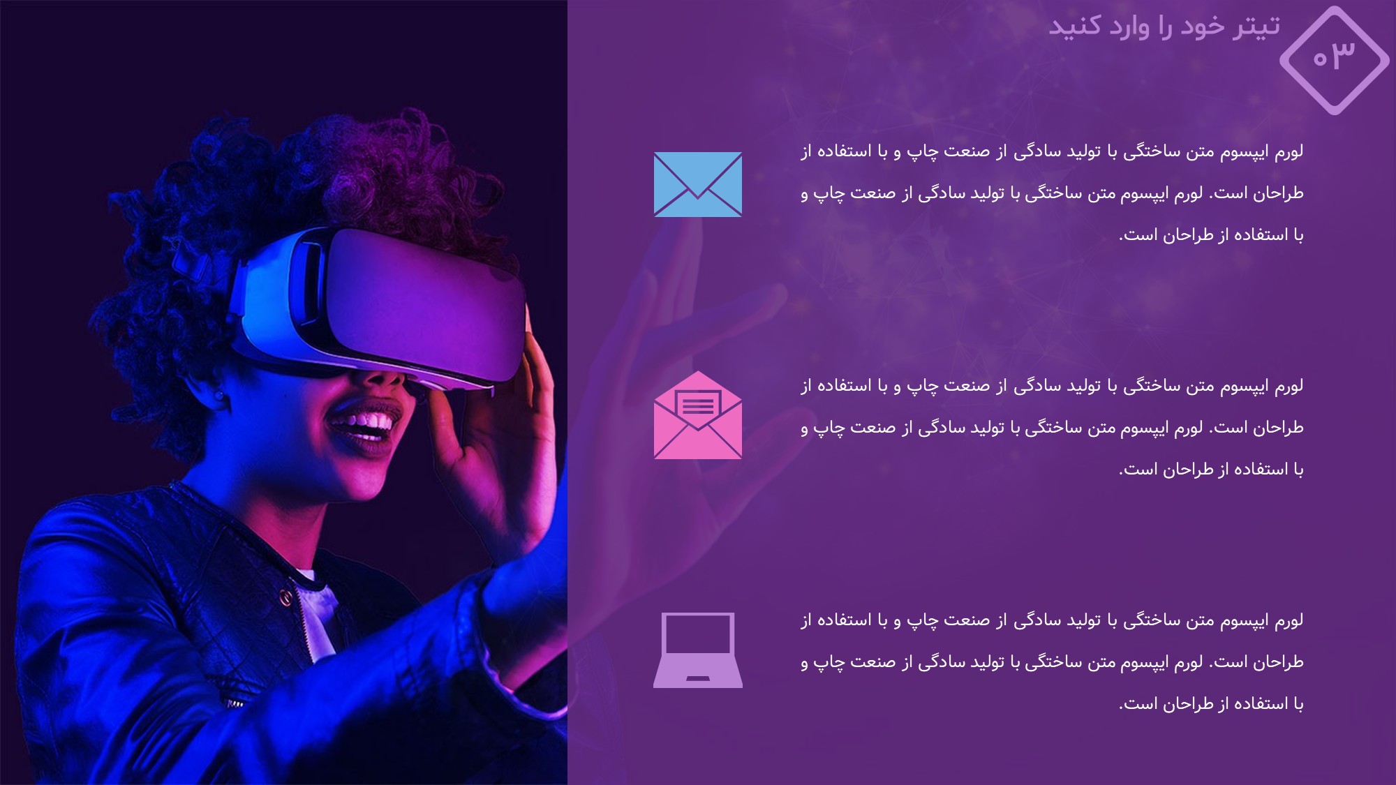 مناسب برای انواع ارائههای تکنولوژی: با توجه به نوع طراحی این قالب، میتوانید از آن برای انواع ارائه های پایان نامه و پروپوزال ارشد و دکتری در موضوع های فناوری و تکنولوژی استفاده کنید.