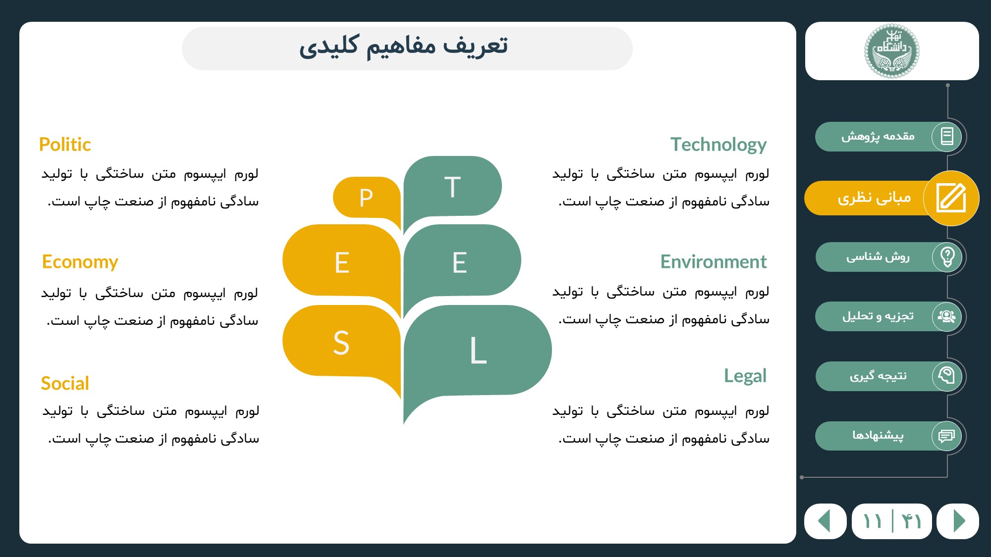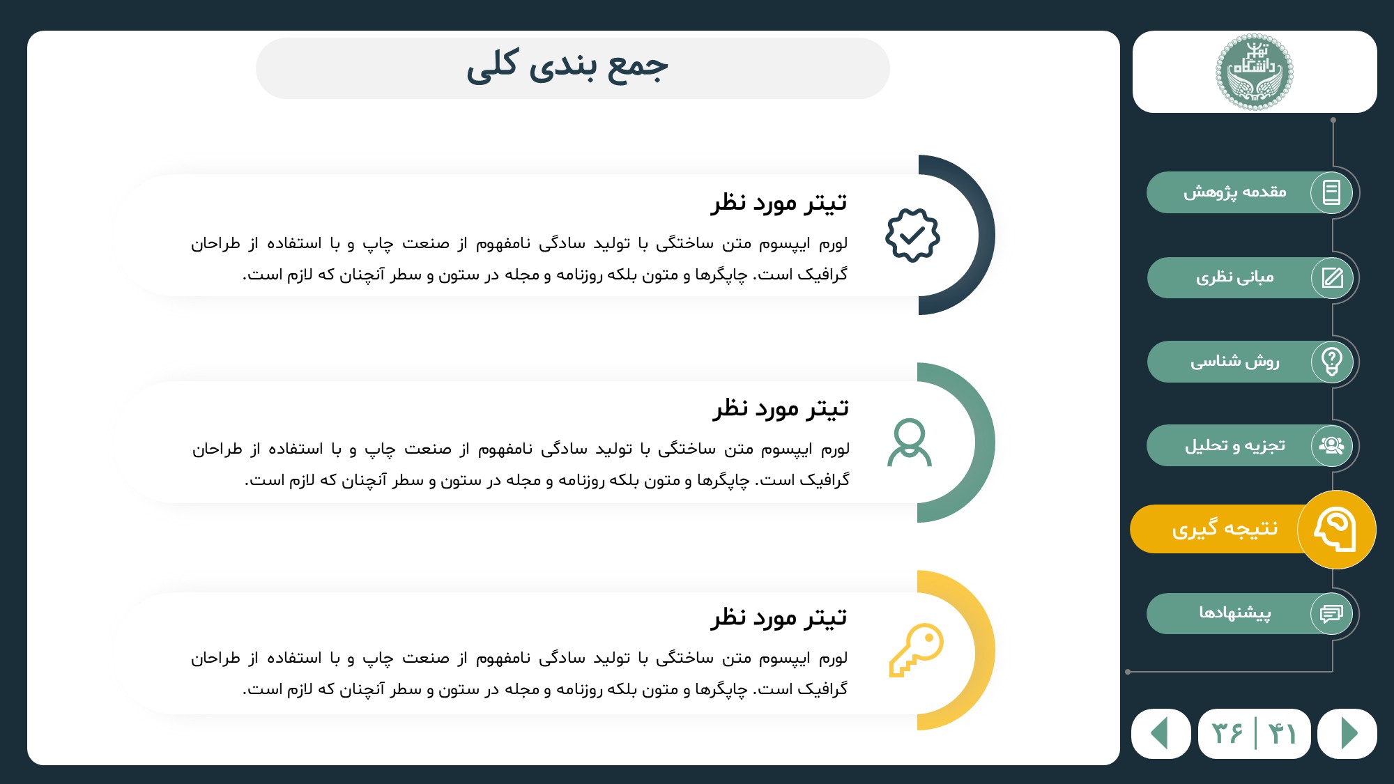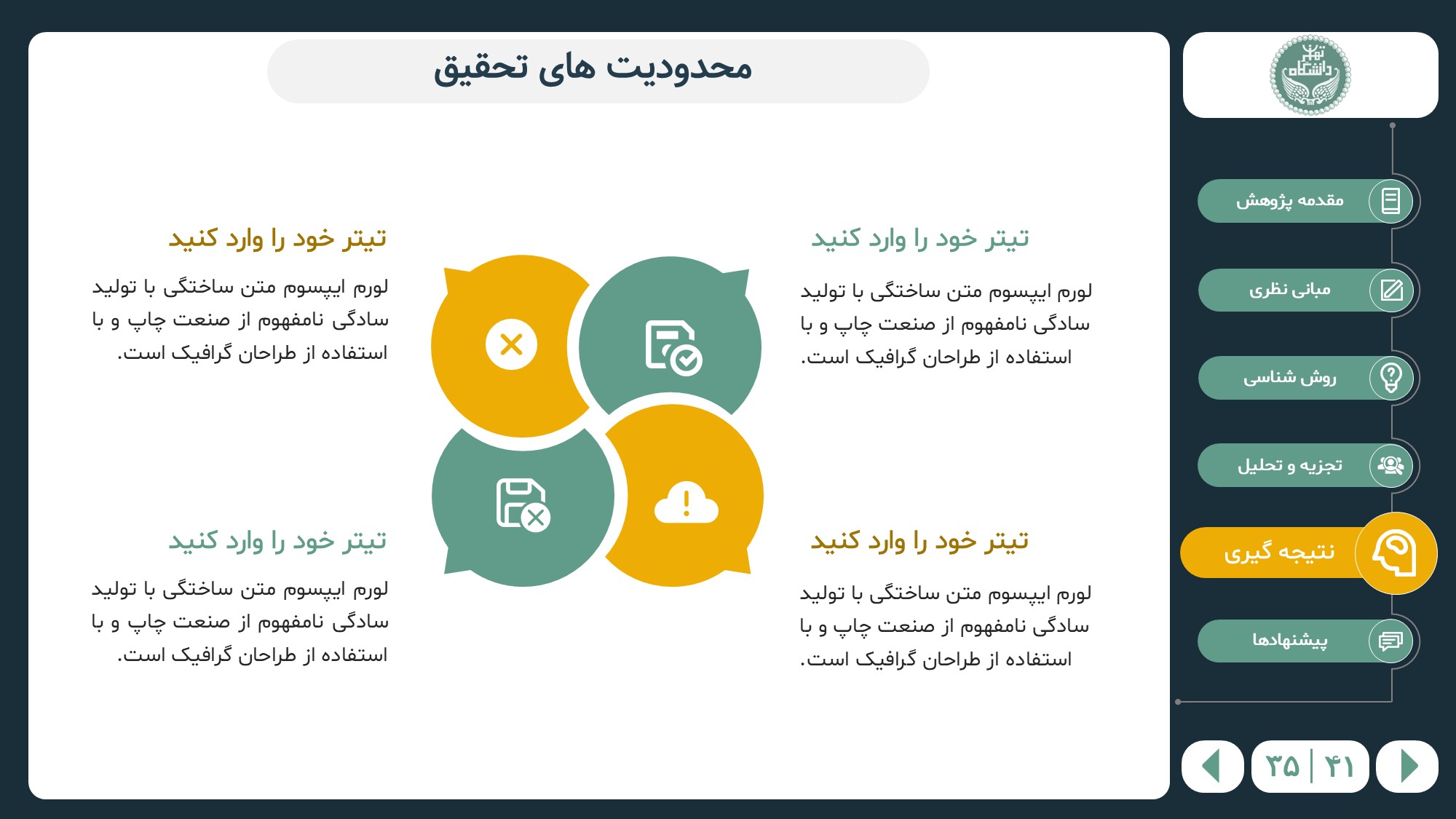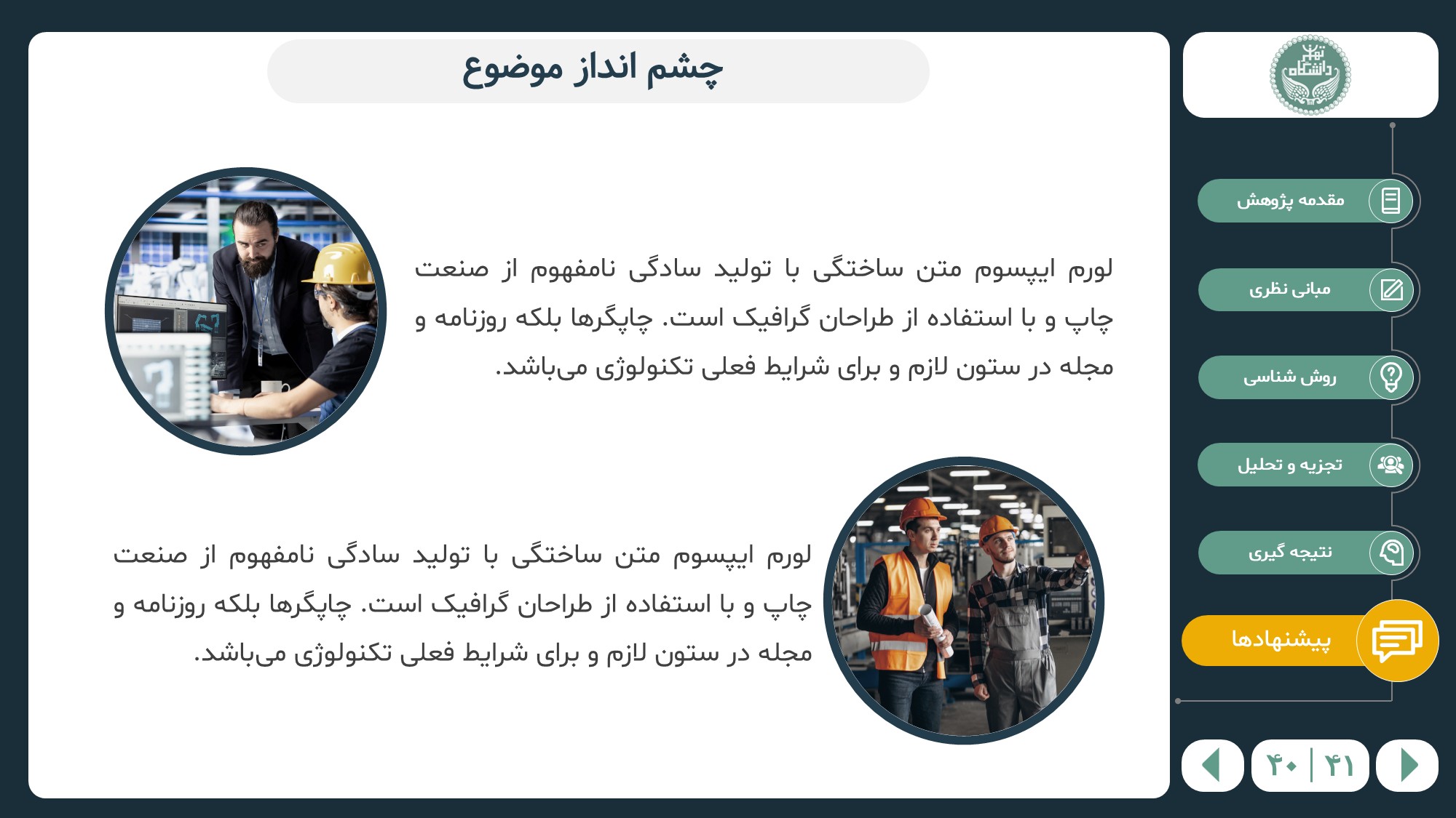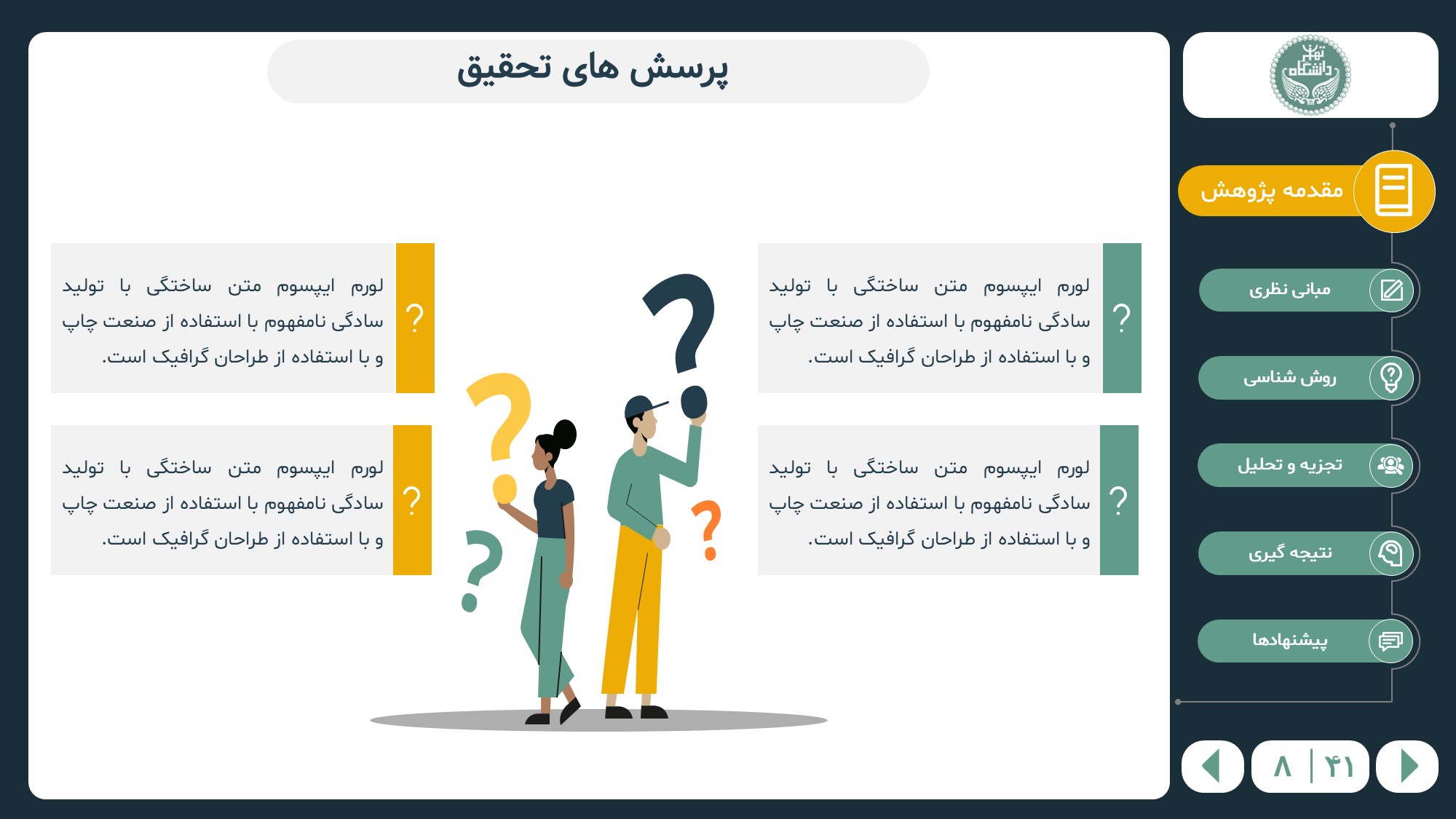 مناسب برای انواع ارائههای پایان نامه: با توجه به نوع طراحی این قالب، میتوانید از آن برای انواع ارائه های پایان نامه و پروپوزال ارشد و دکتری در موضوع های متفاوت استفاده کنید.
