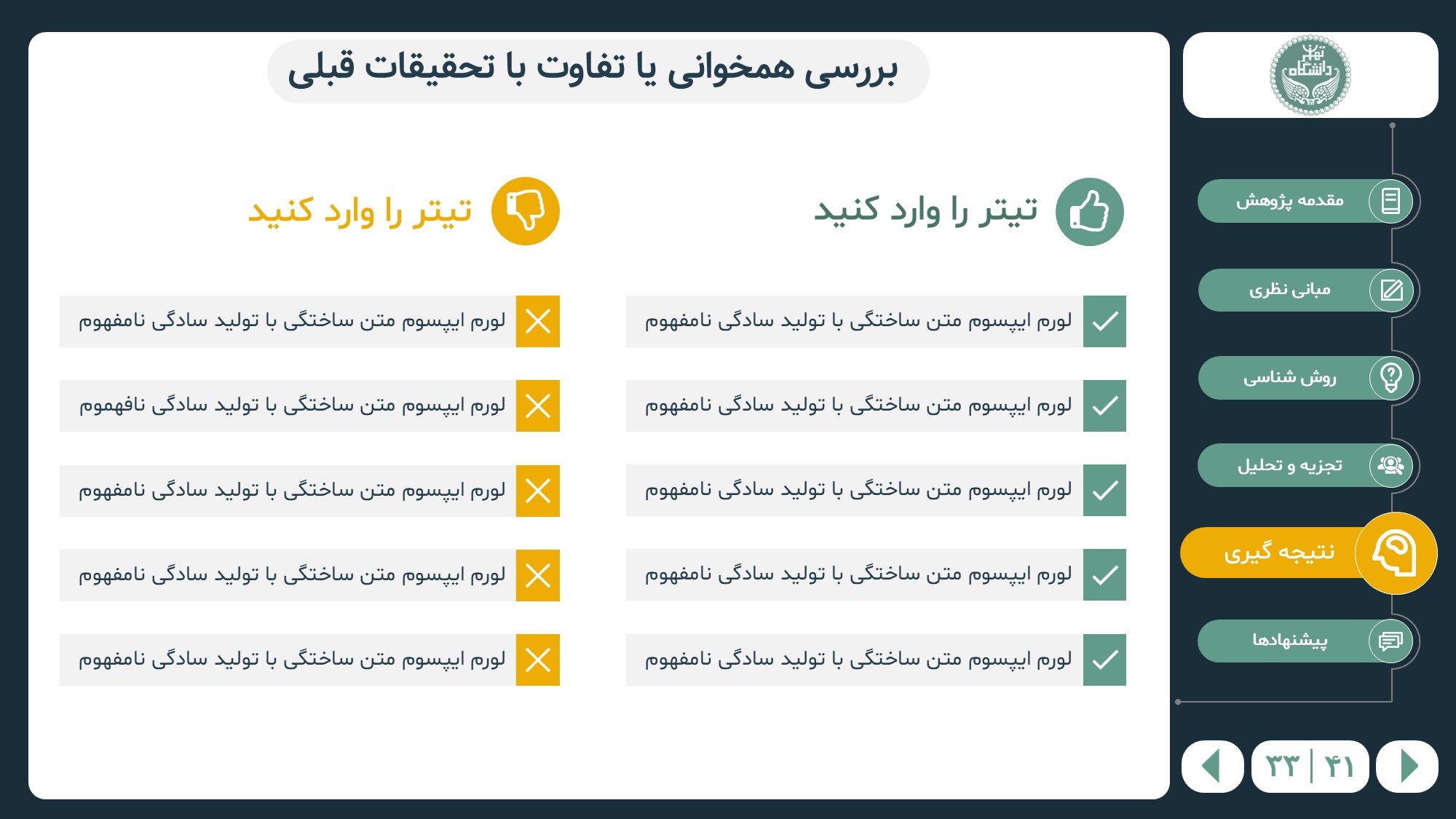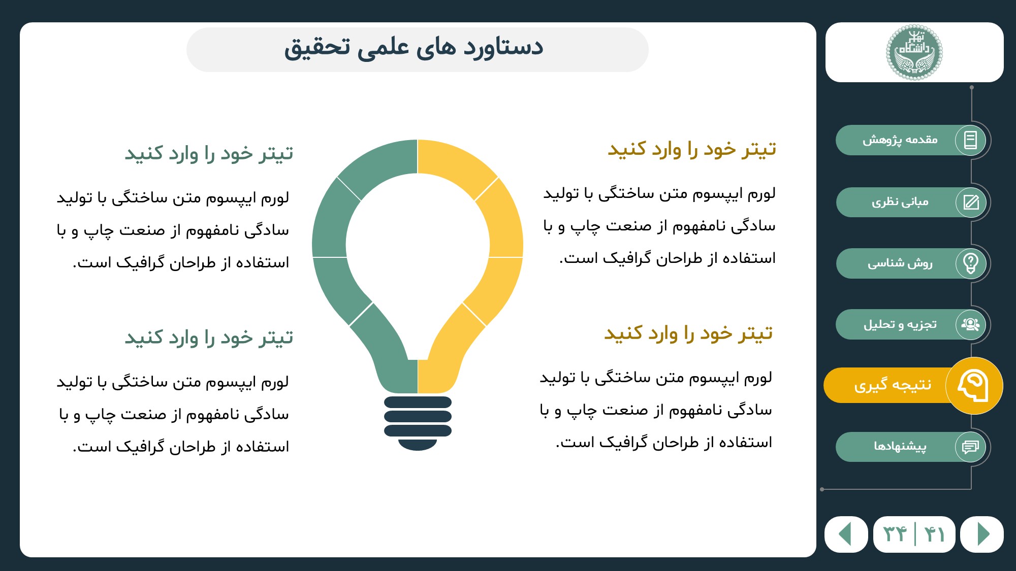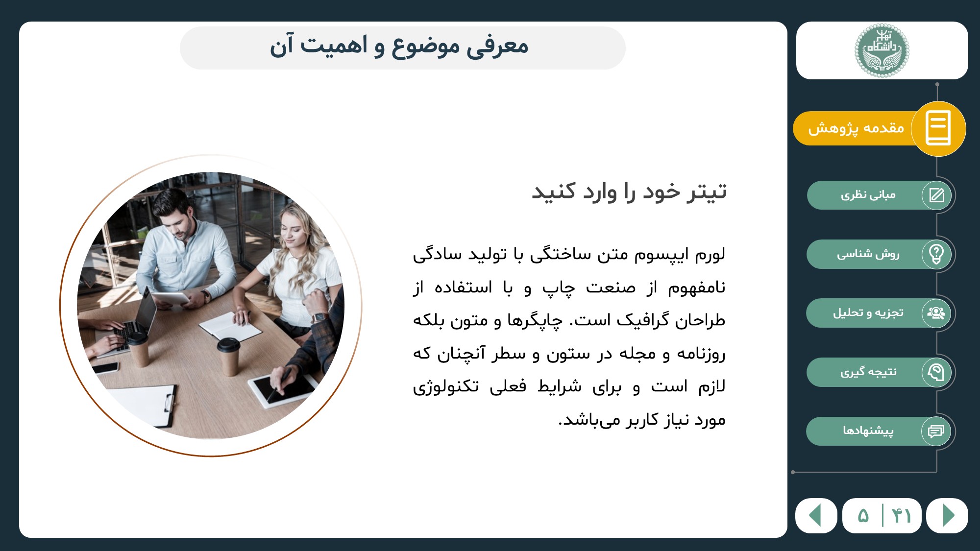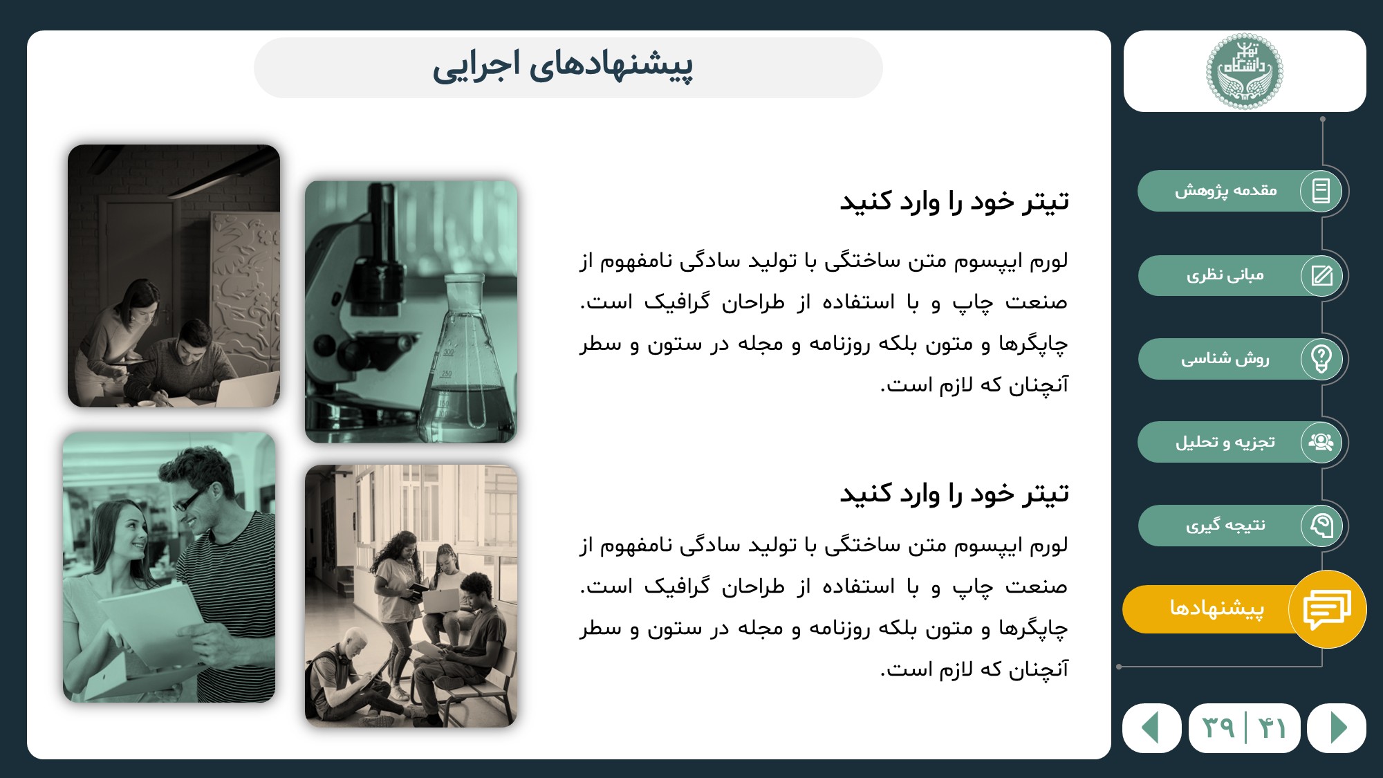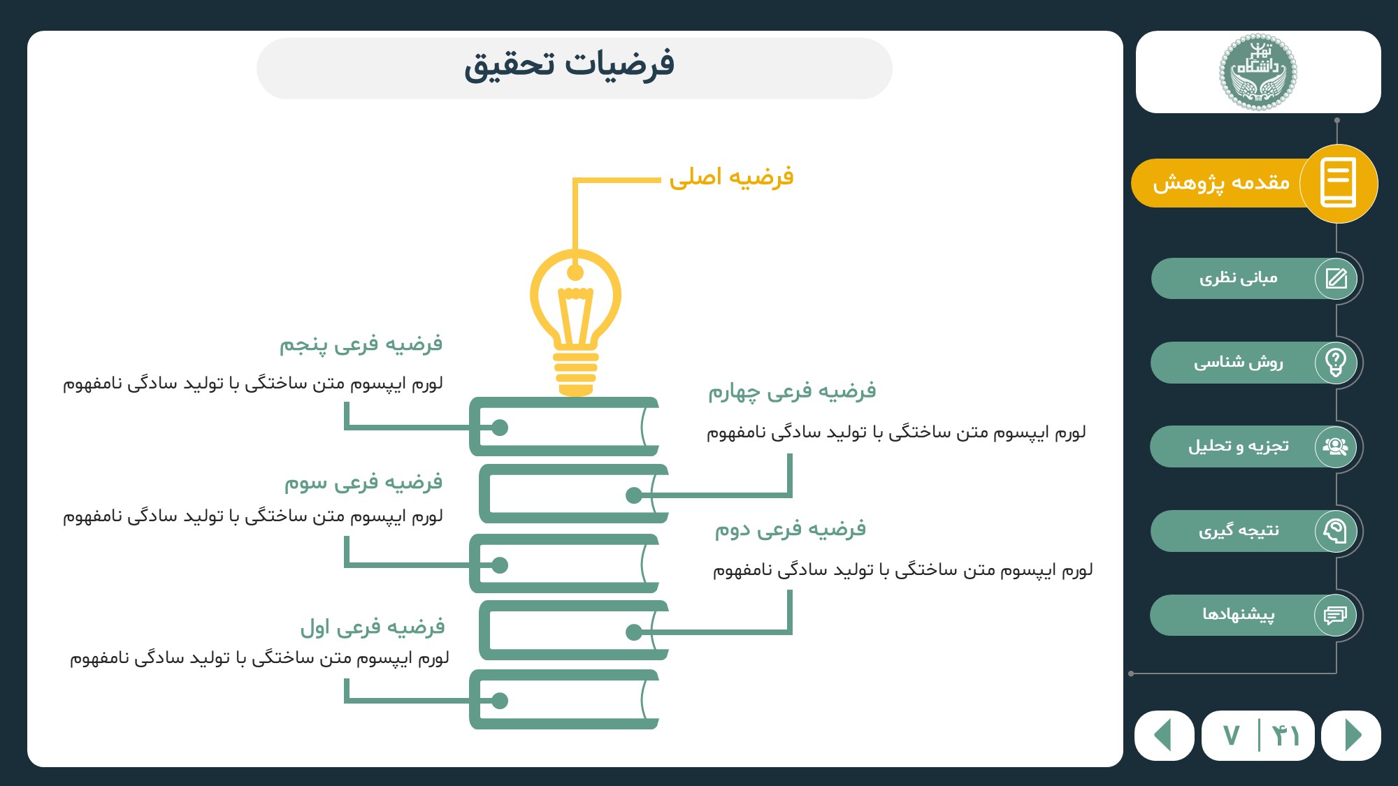 مناسب برای انواع ارائههای پایان نامه: با توجه به نوع طراحی این قالب، میتوانید از آن برای انواع ارائه های پایان نامه و پروپوزال ارشد و دکتری در موضوع های متفاوت استفاده کنید.