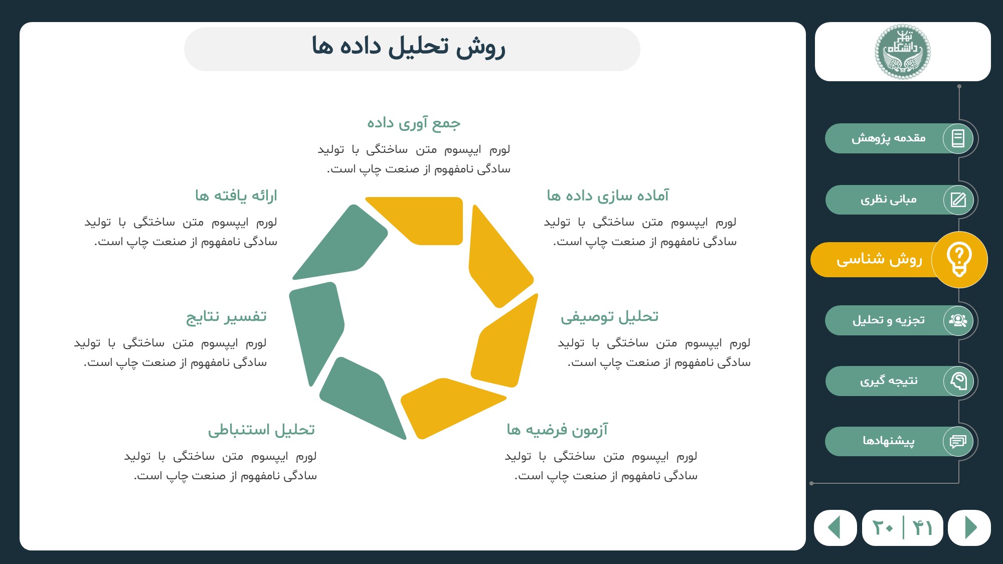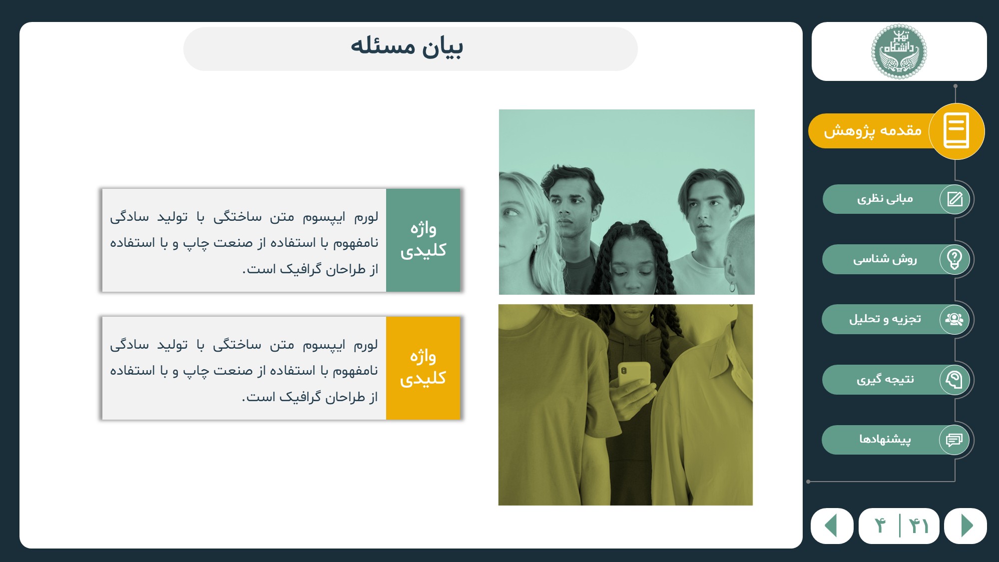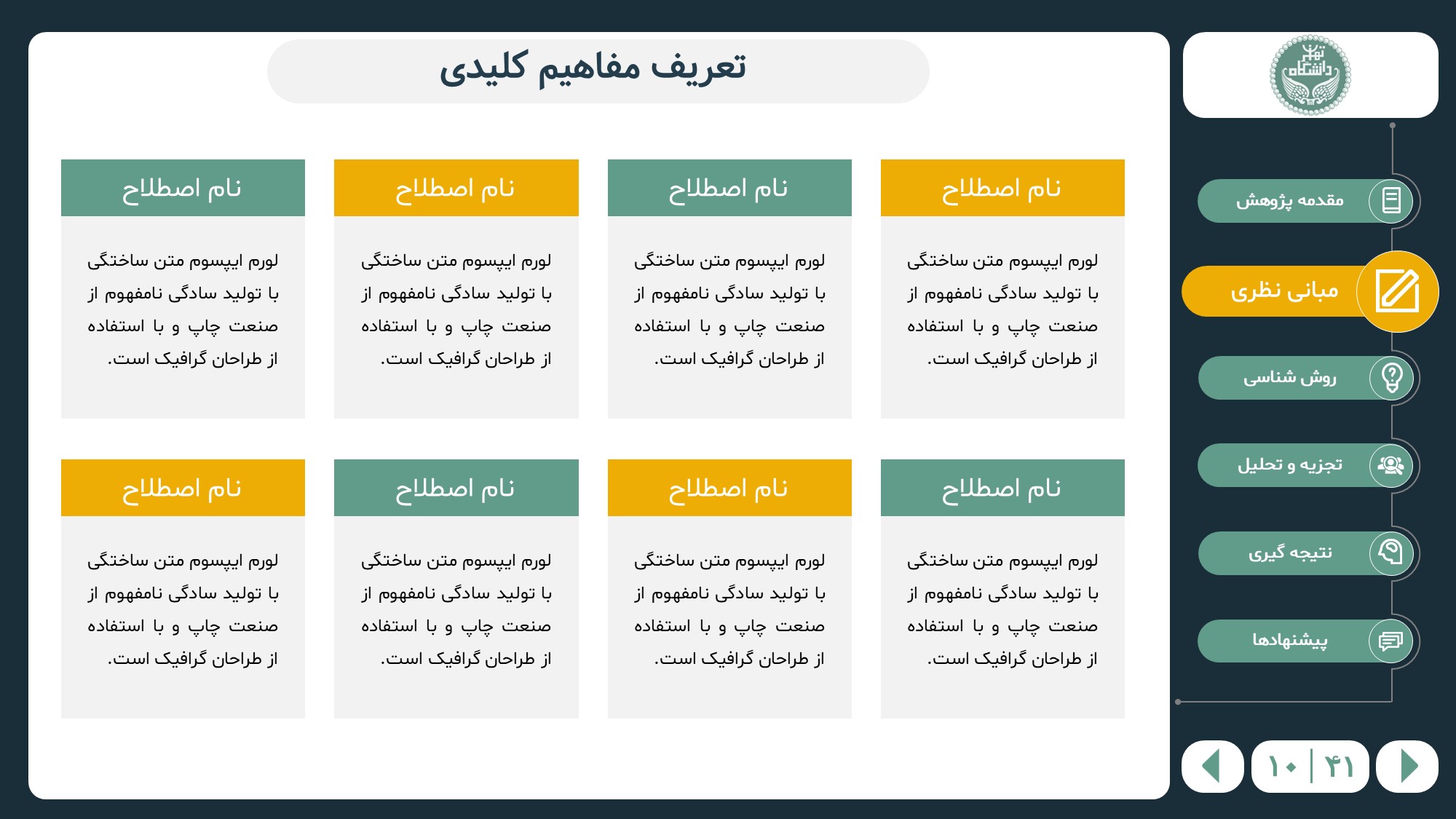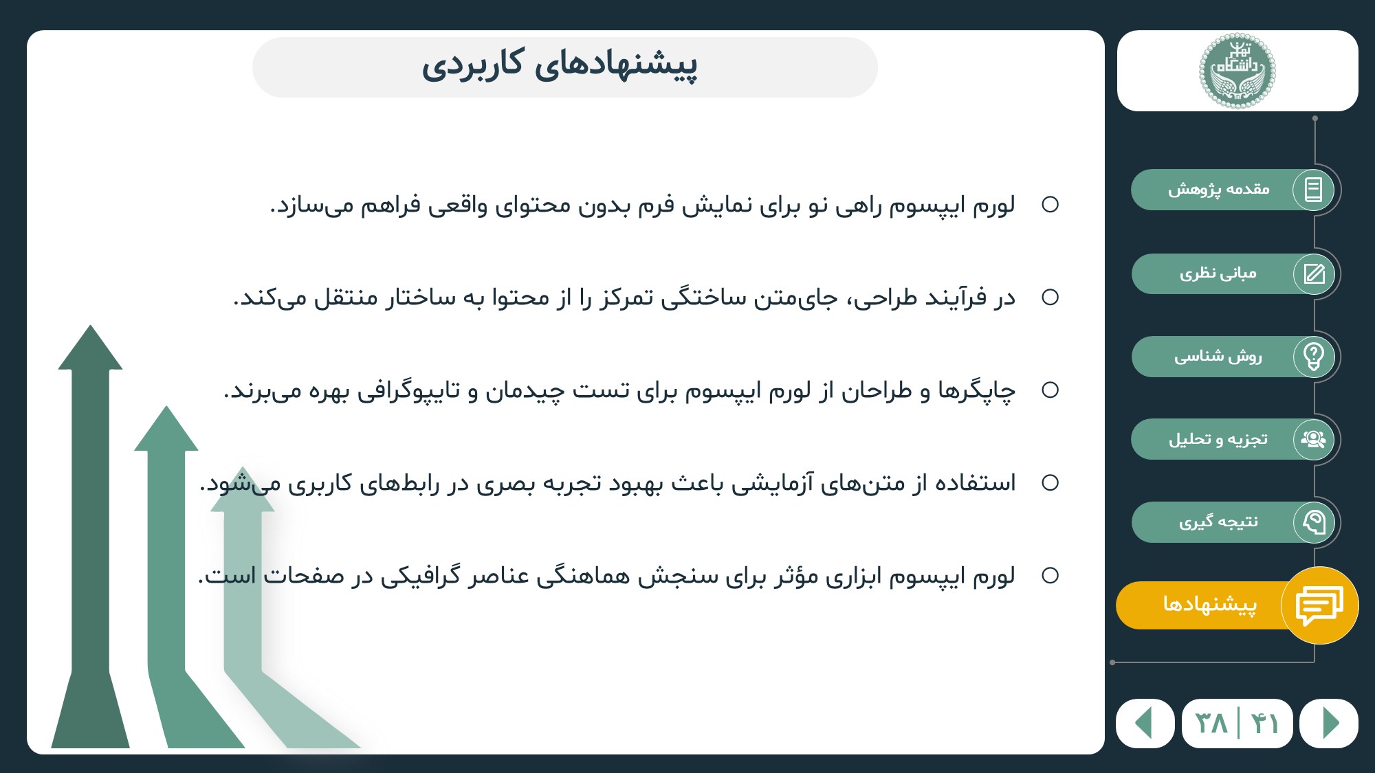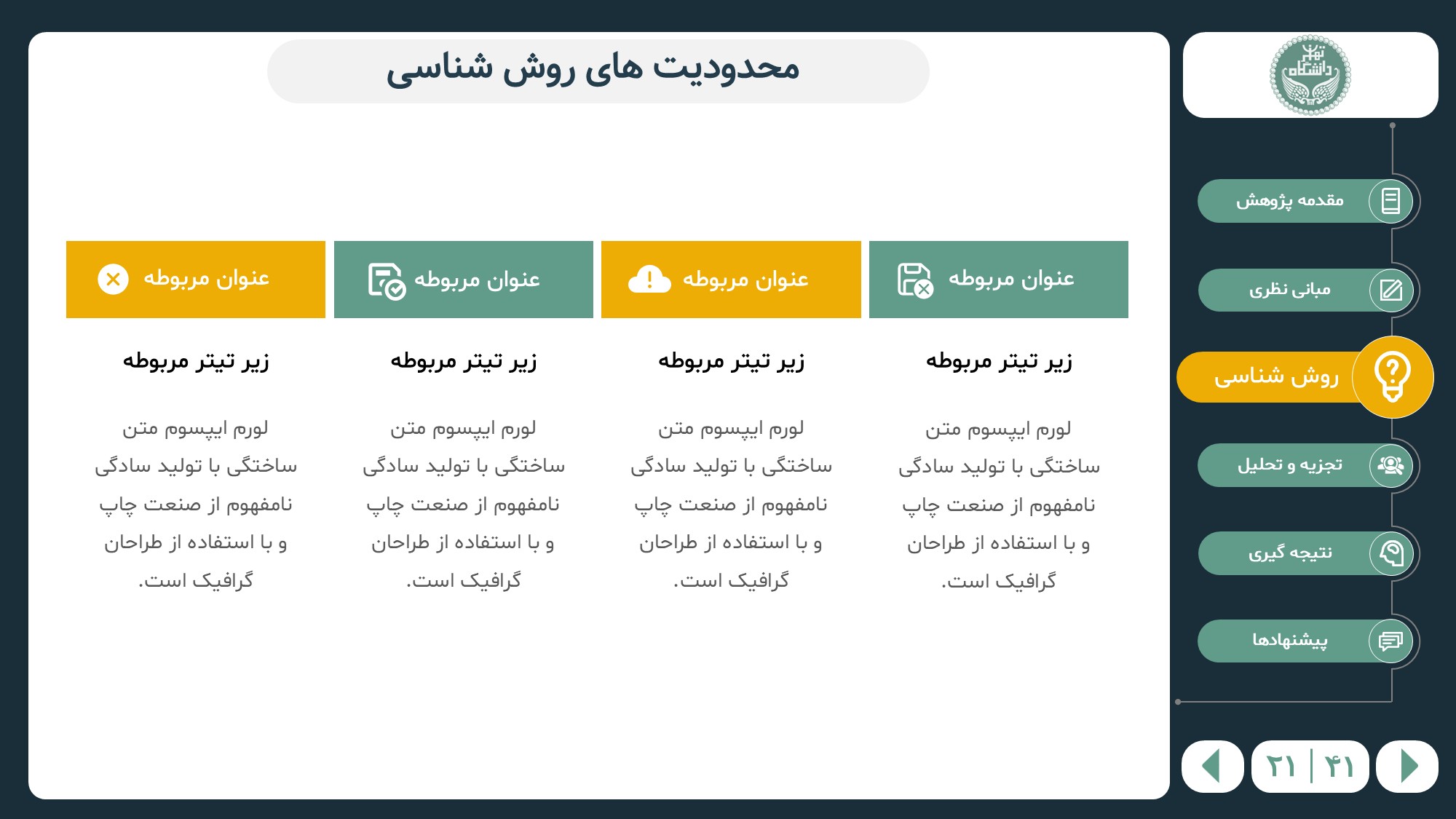 مناسب برای انواع ارائههای پایان نامه: با توجه به نوع طراحی این قالب، میتوانید از آن برای انواع ارائه های پایان نامه و پروپوزال ارشد و دکتری در موضوع های متفاوت استفاده کنید.