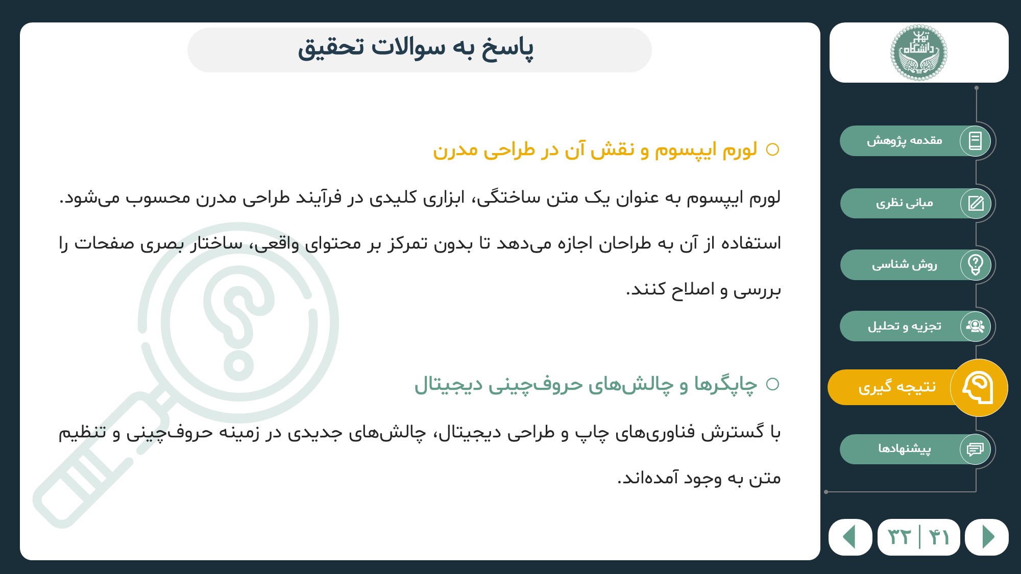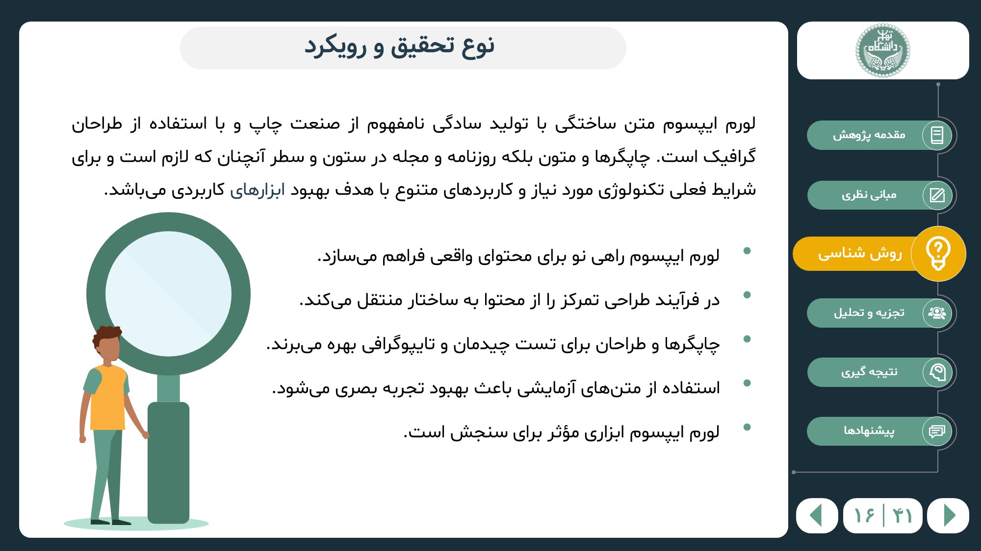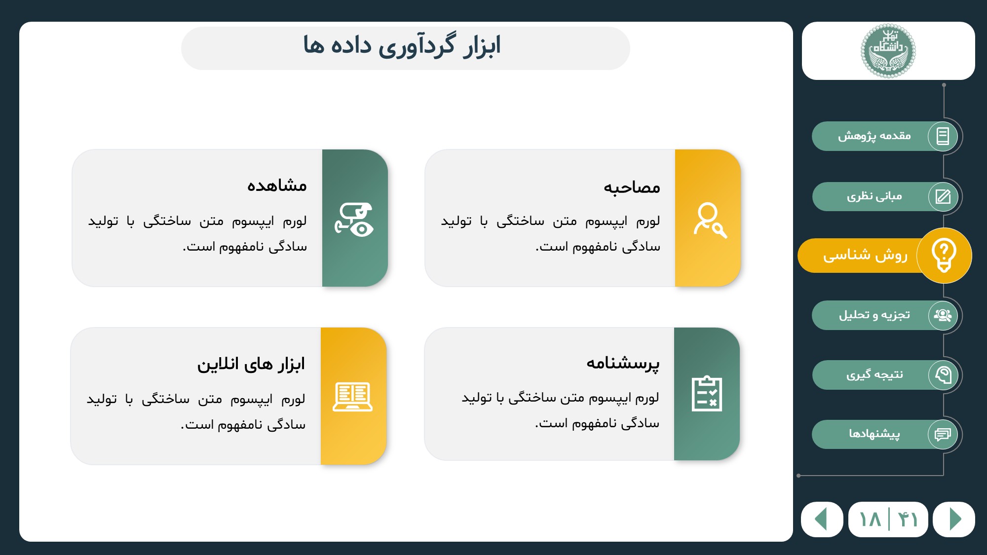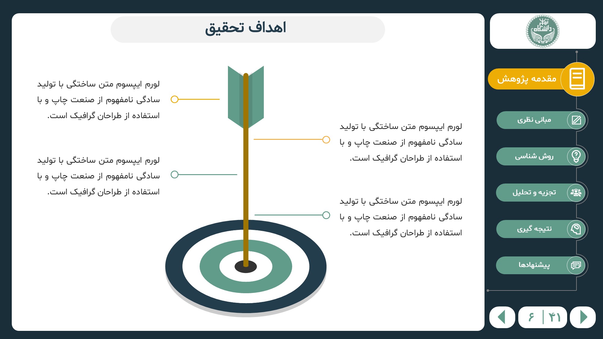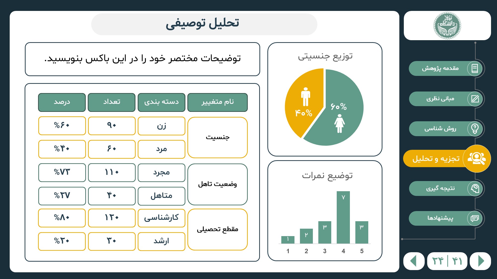 مناسب برای انواع ارائههای پایان نامه: با توجه به نوع طراحی این قالب، میتوانید از آن برای انواع ارائه های پایان نامه و پروپوزال ارشد و دکتری در موضوع های متفاوت استفاده کنید.