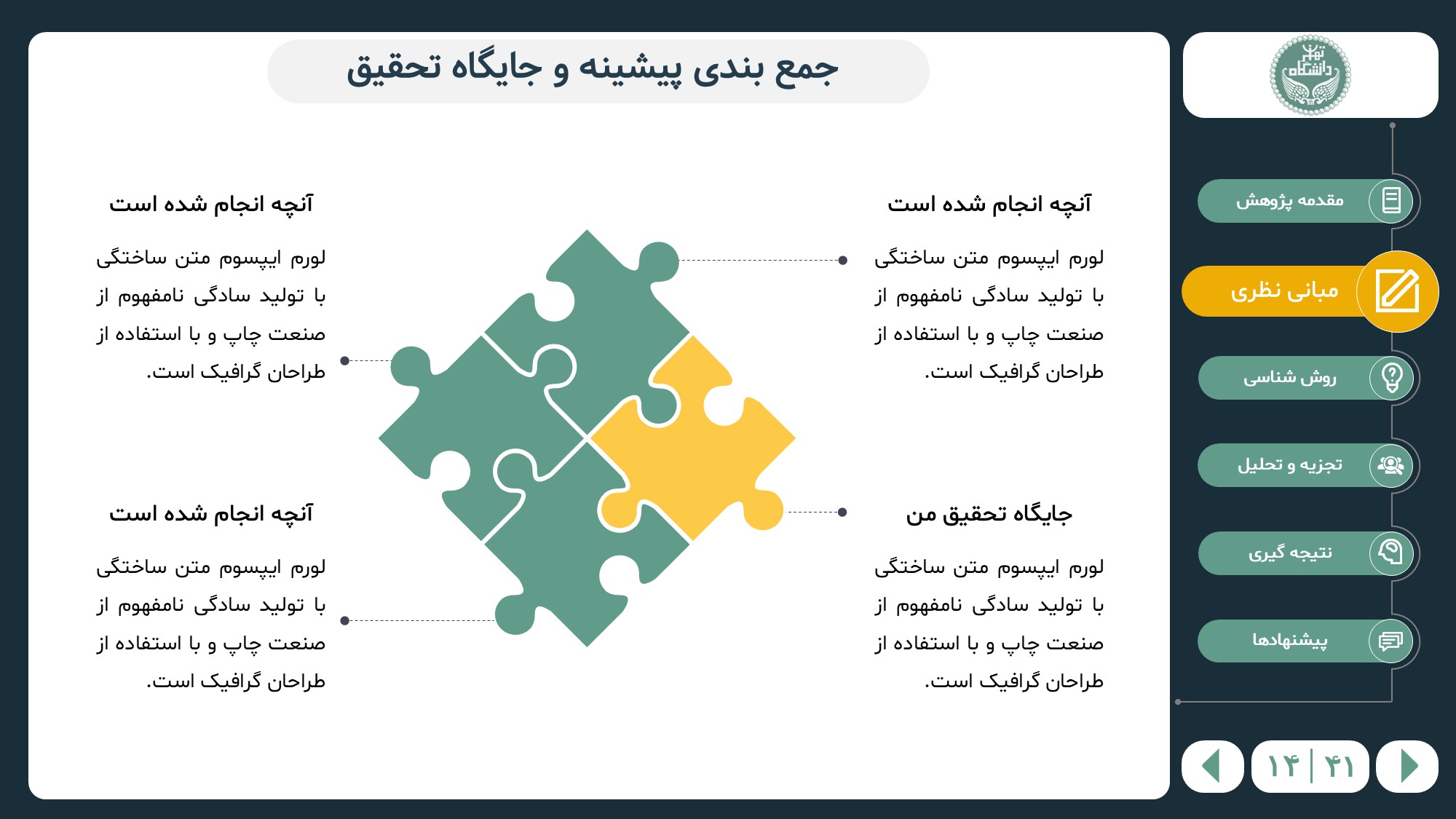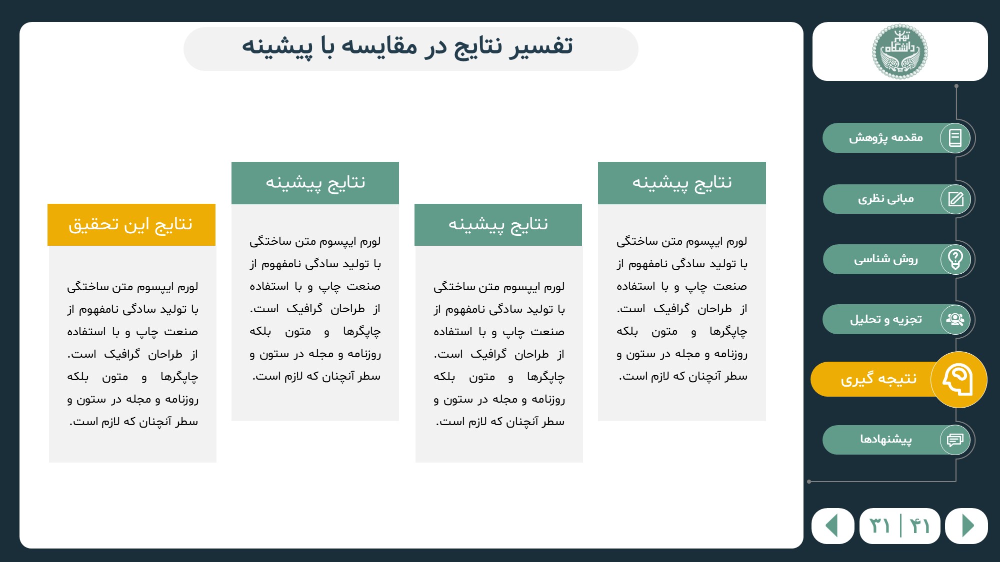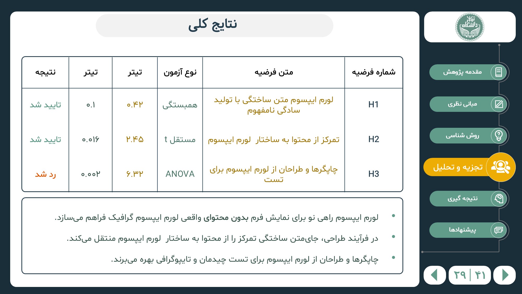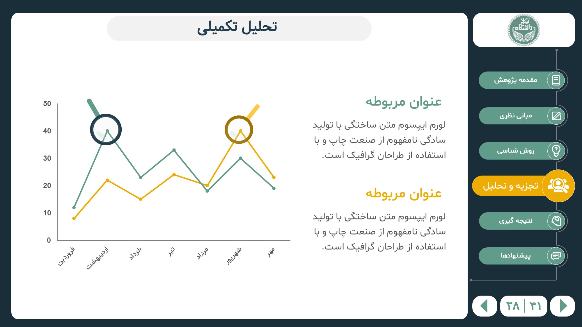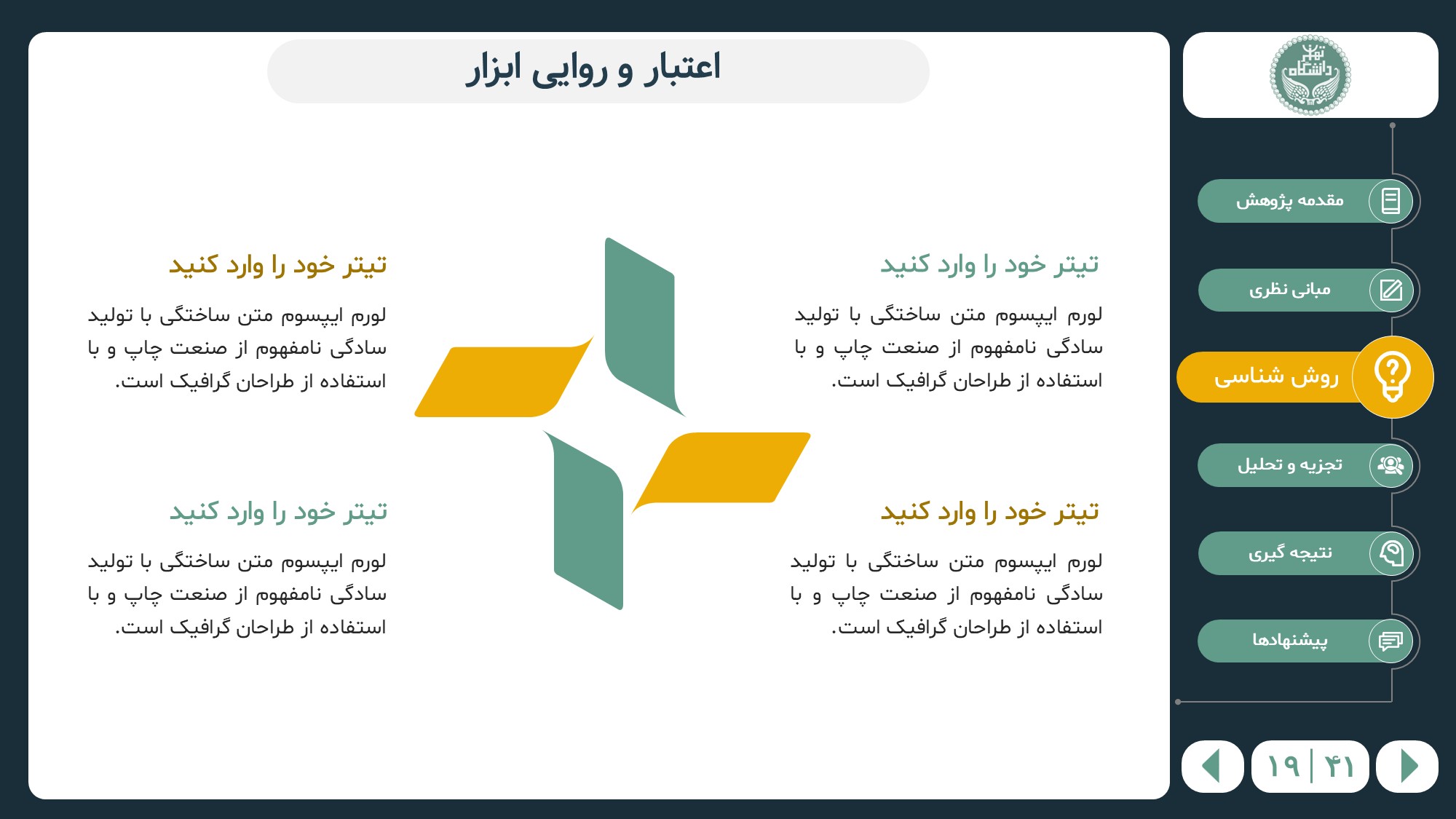 مناسب برای انواع ارائههای پایان نامه: با توجه به نوع طراحی این قالب، میتوانید از آن برای انواع ارائه های پایان نامه و پروپوزال ارشد و دکتری در موضوع های متفاوت استفاده کنید.