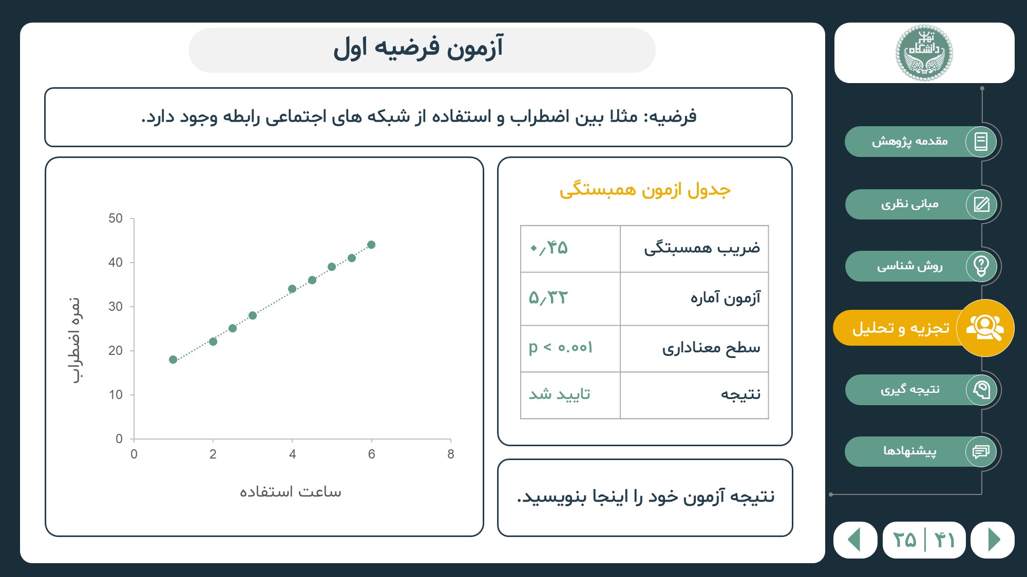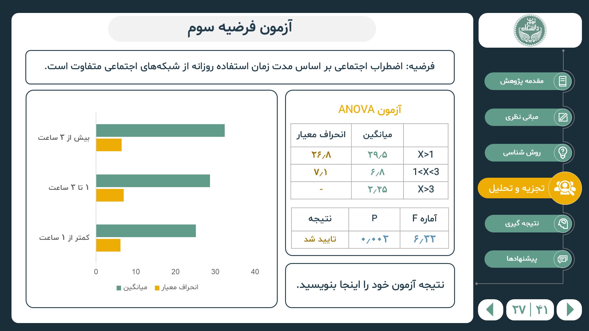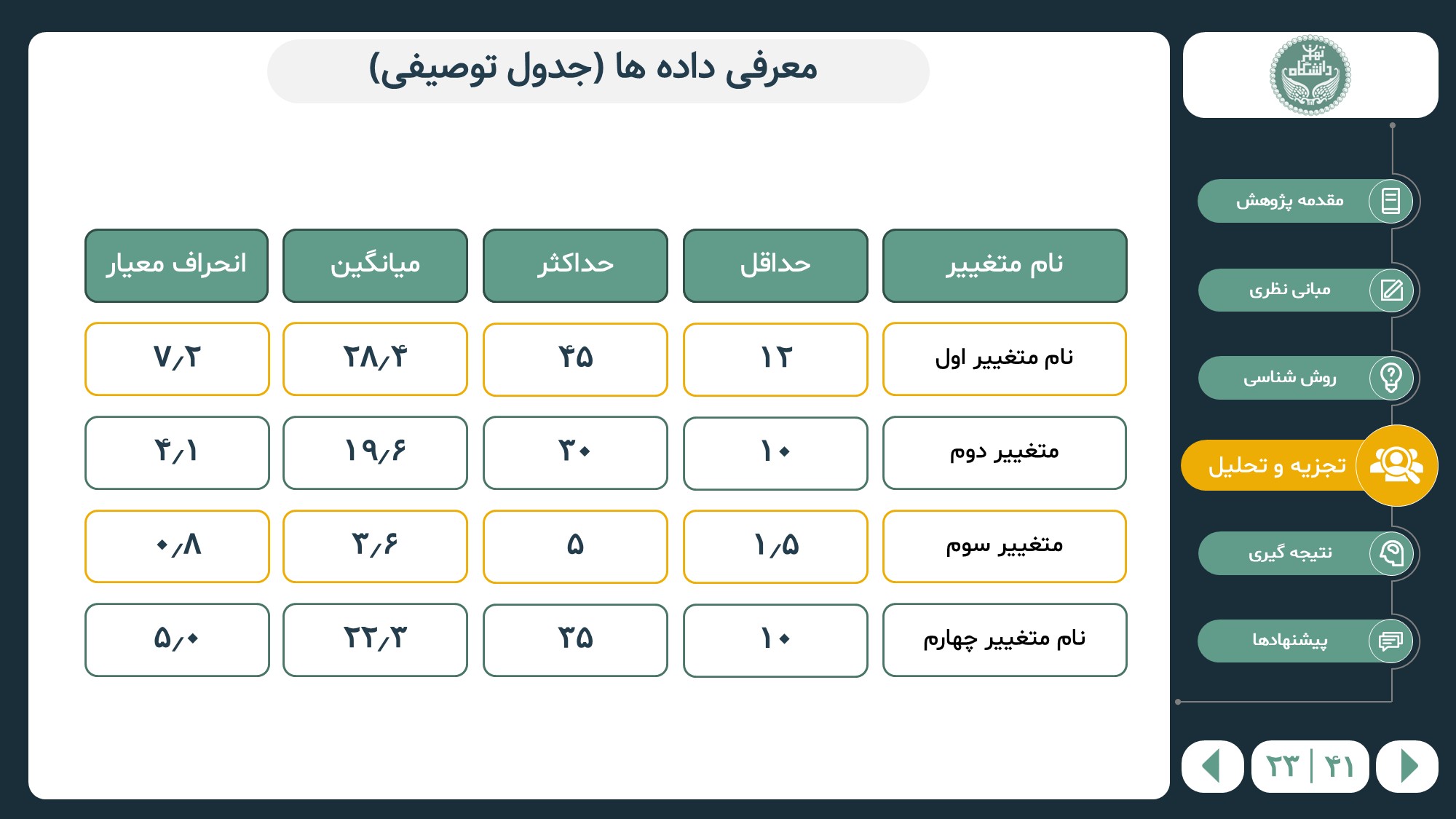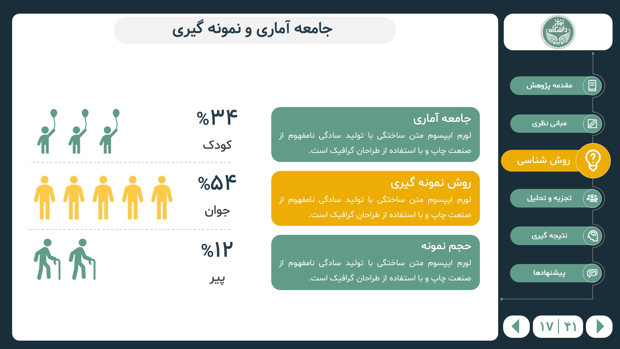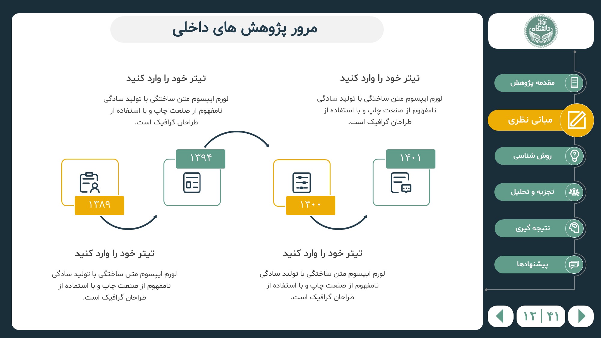 مناسب برای انواع ارائههای پایان نامه: با توجه به نوع طراحی این قالب، میتوانید از آن برای انواع ارائه های پایان نامه و پروپوزال ارشد و دکتری در موضوع های متفاوت استفاده کنید.