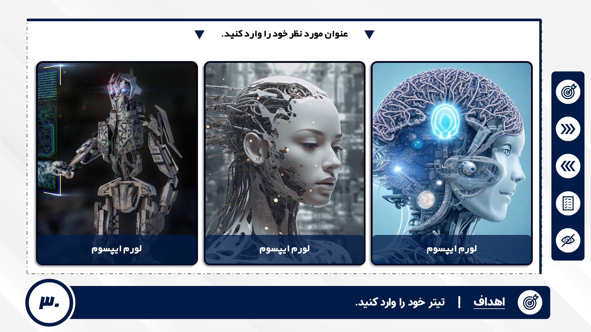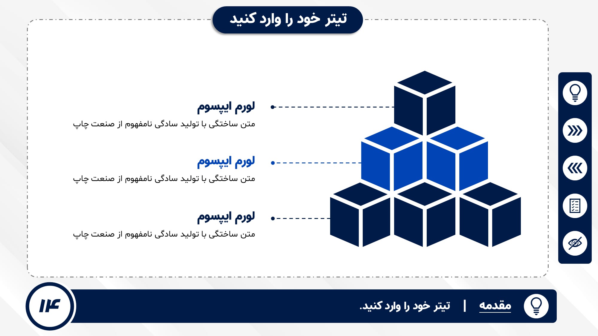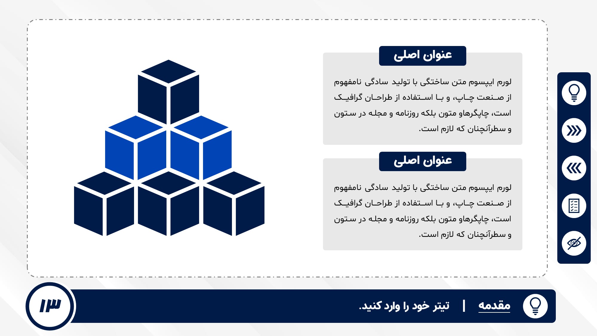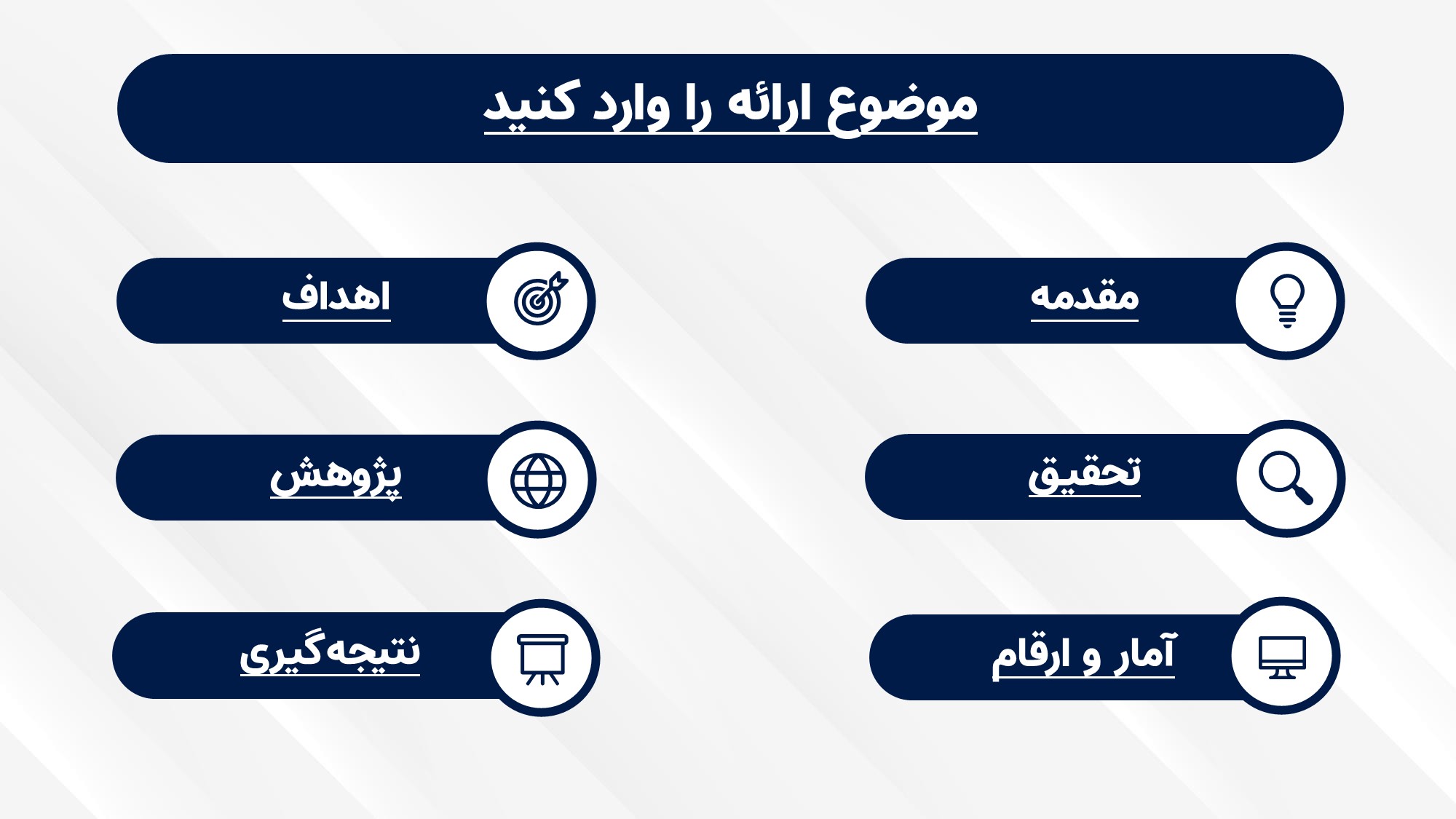 قابلیت تغییر آیکن: دارد. تمامی آیکن های منو و المان های استفاده شده در اسلایدها را میتوانید تغییر دهید.