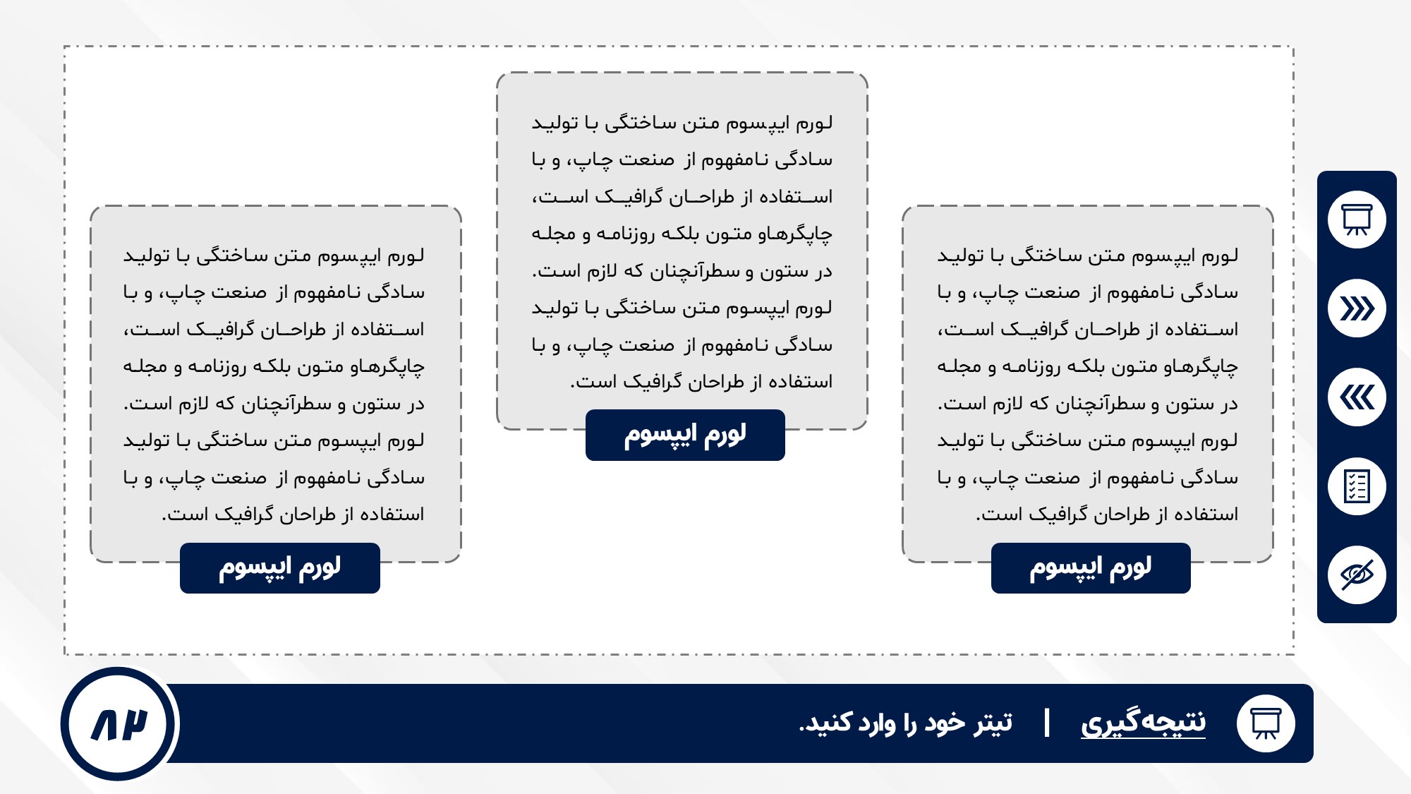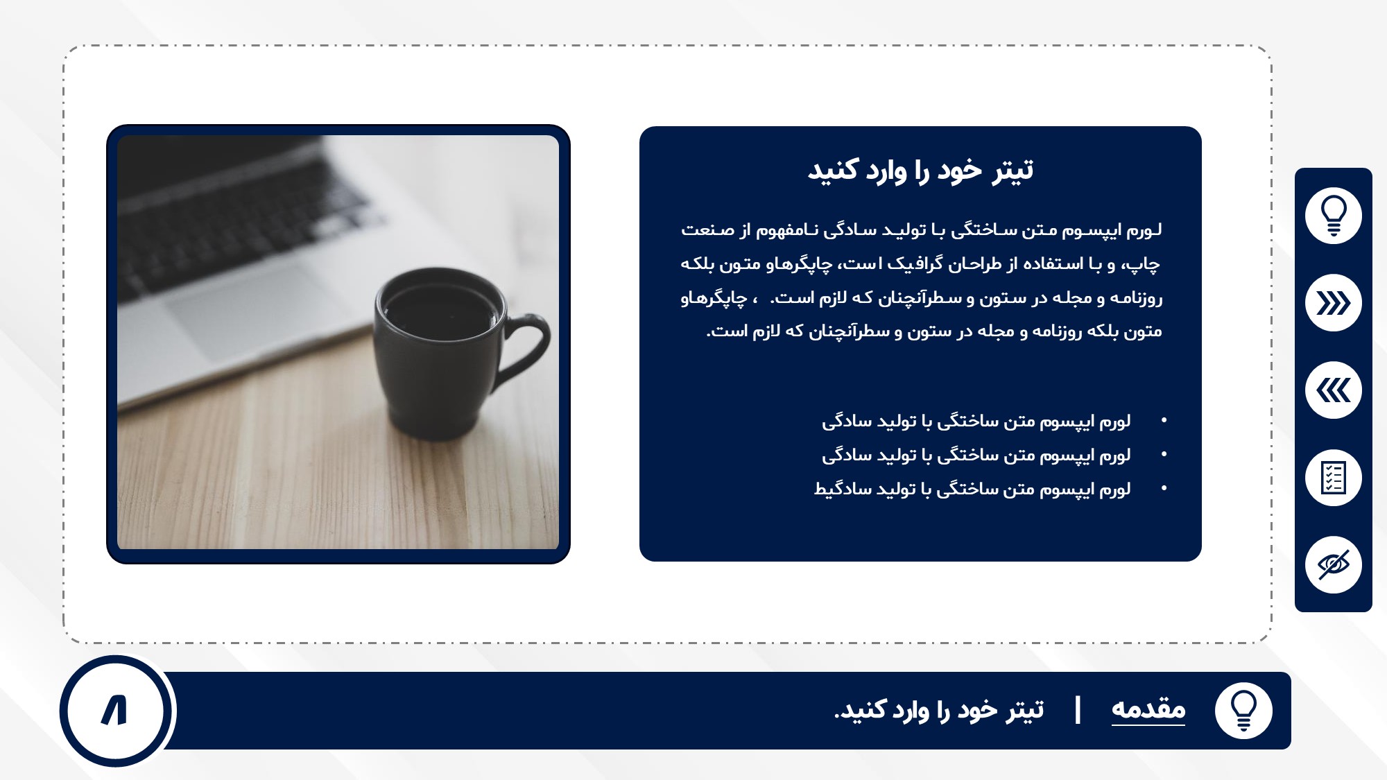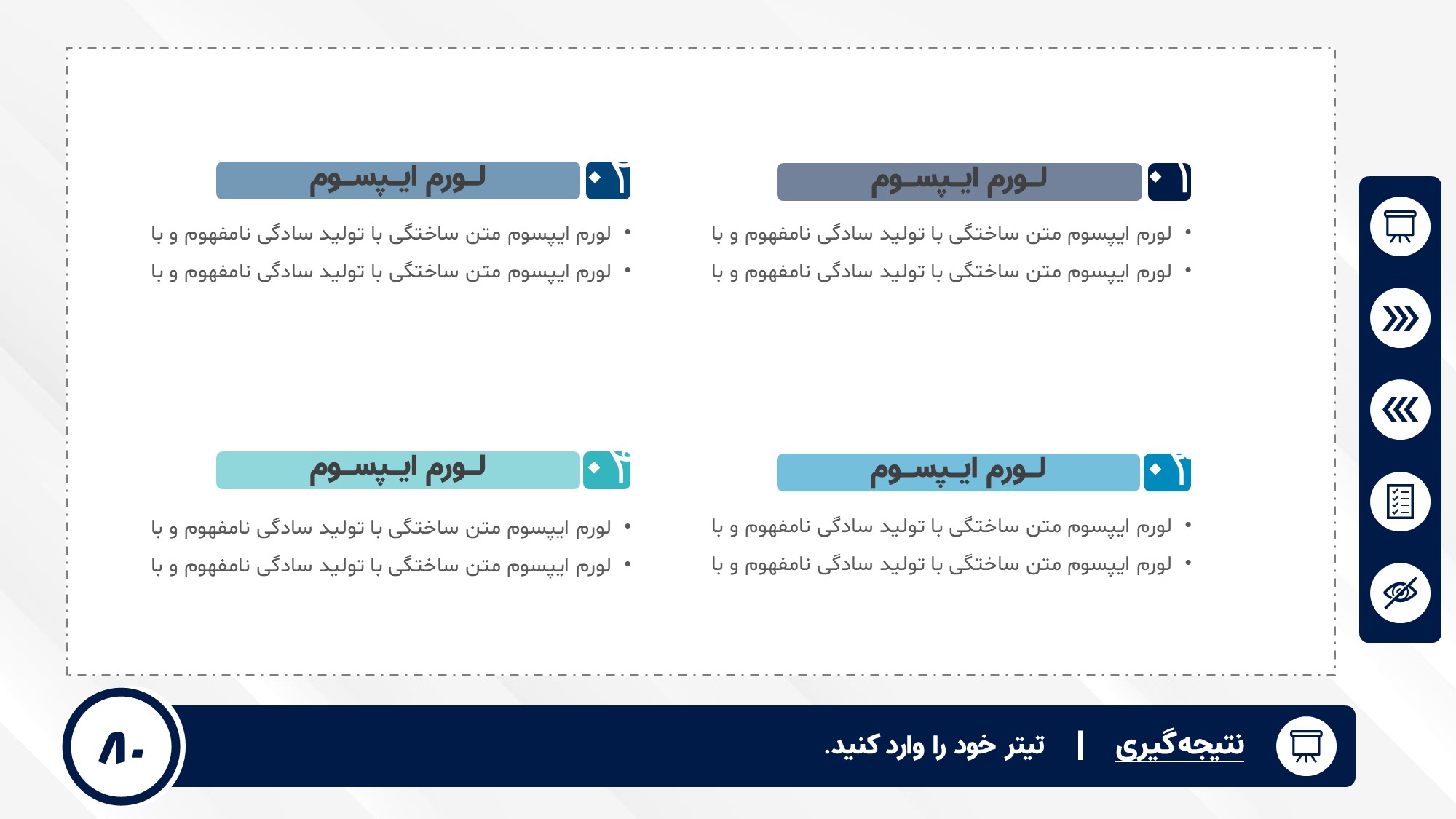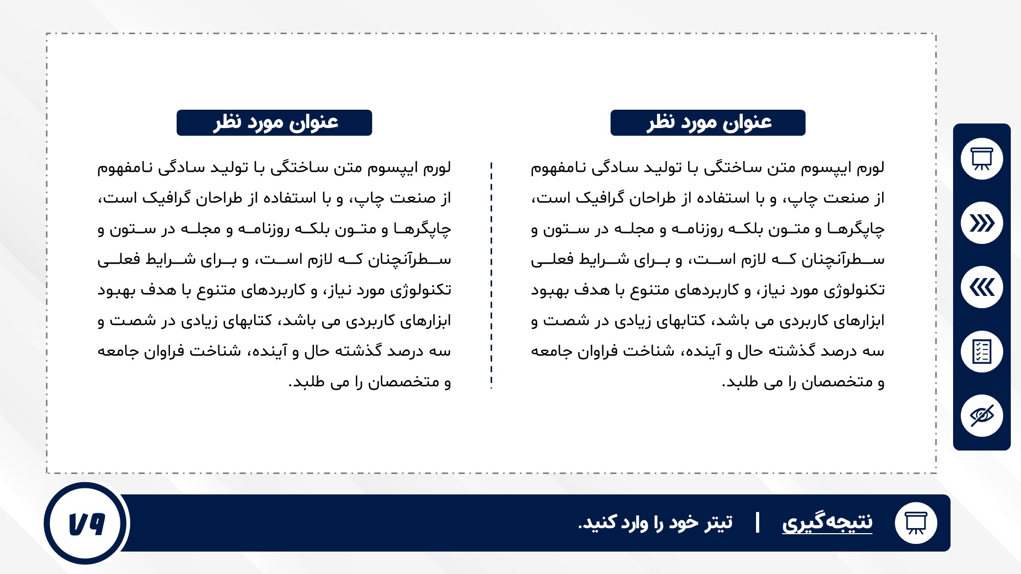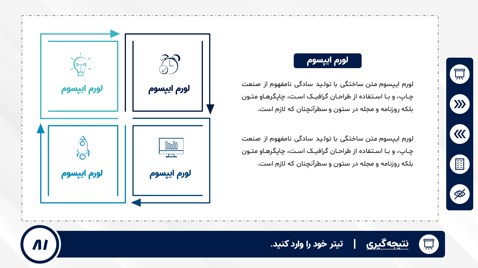 قابلیت تغییر آیکن: دارد. تمامی آیکن های منو و المان های استفاده شده در اسلایدها را میتوانید تغییر دهید.
