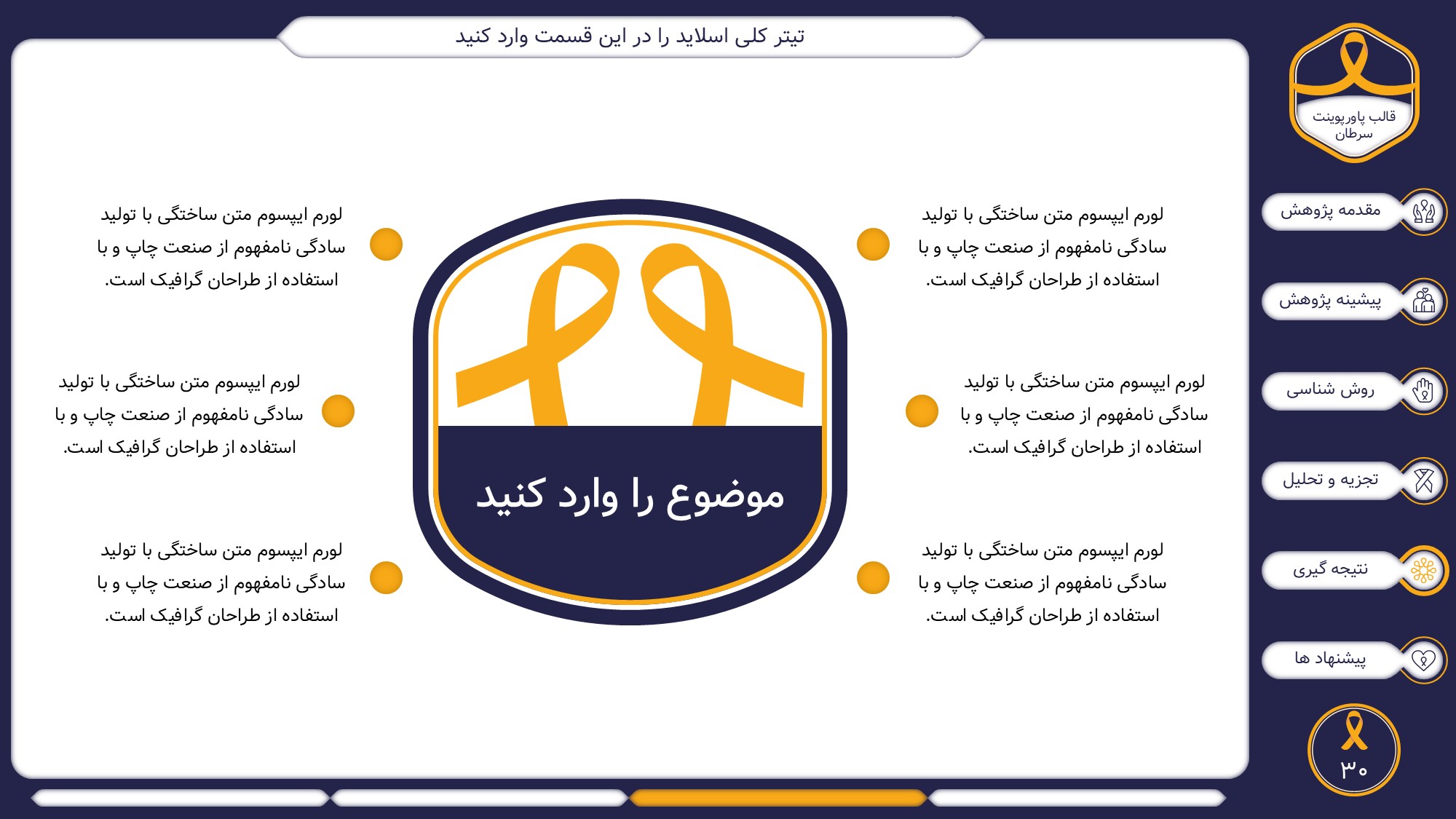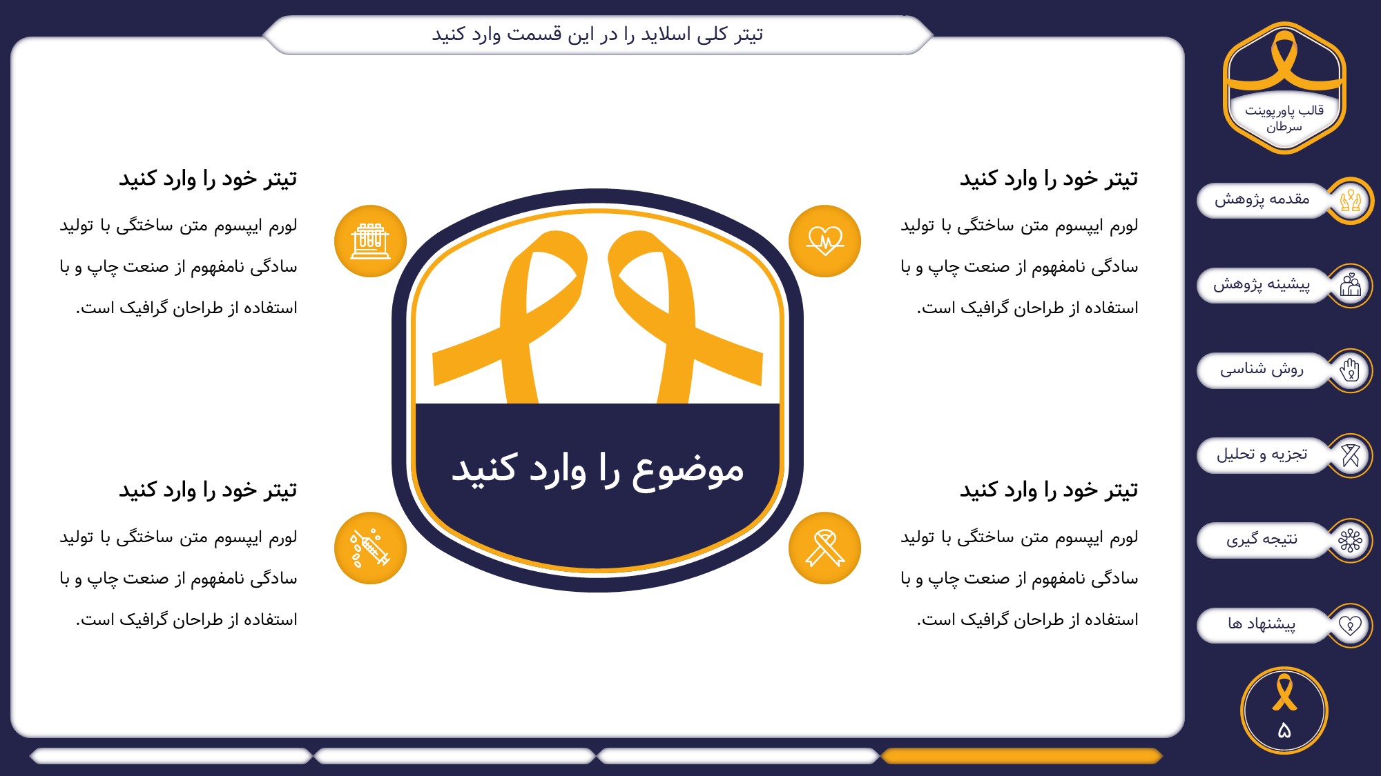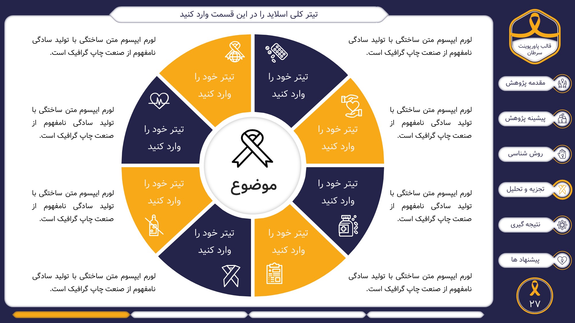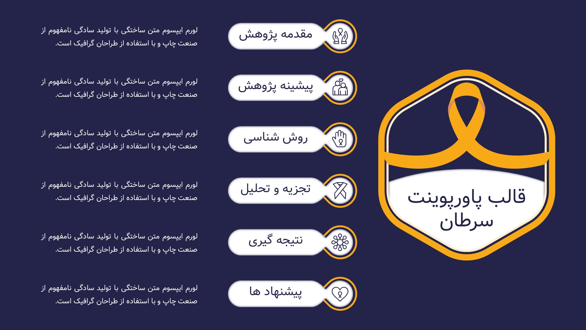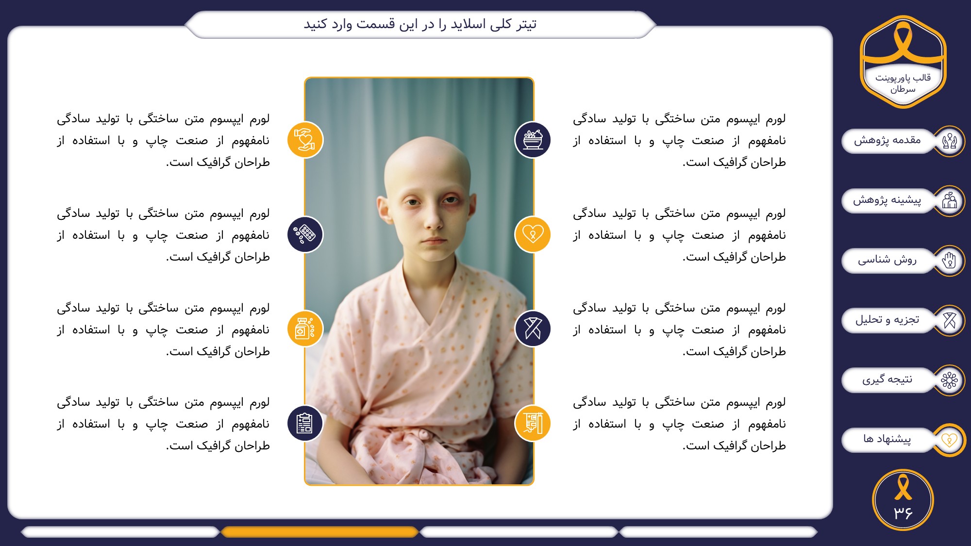این قالب پاورپوینت دارای 38 اسلاید حرفه ای با رنگ بندی رسمی سرمه ای و زرد است. این تمپلیت در 6 منو طراحی شده است که هر بخش آن دارای اسلایدهای متنی، اسلایدهای تصویری مرتبط با سرطان، اسلایدهای اینفوگرافیک مختص سرطان شناسی است. شما میتوانید تغییرات خود را روی این تم پاورپوینت براحتی پیاده کنید.