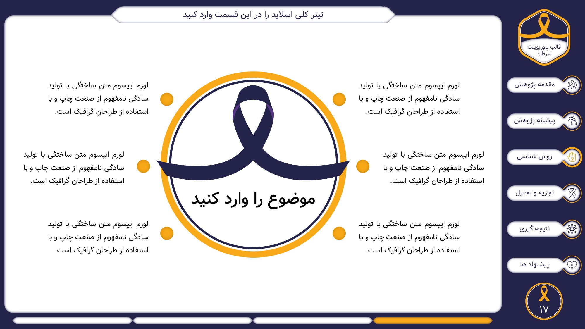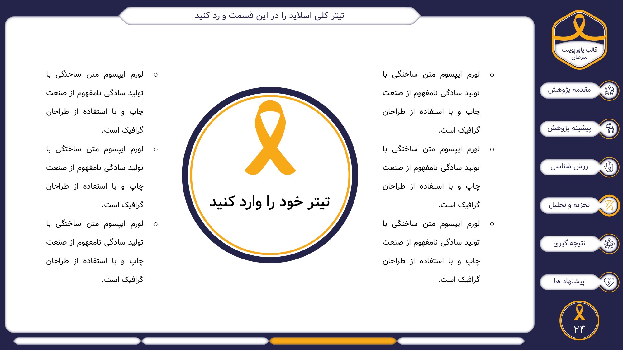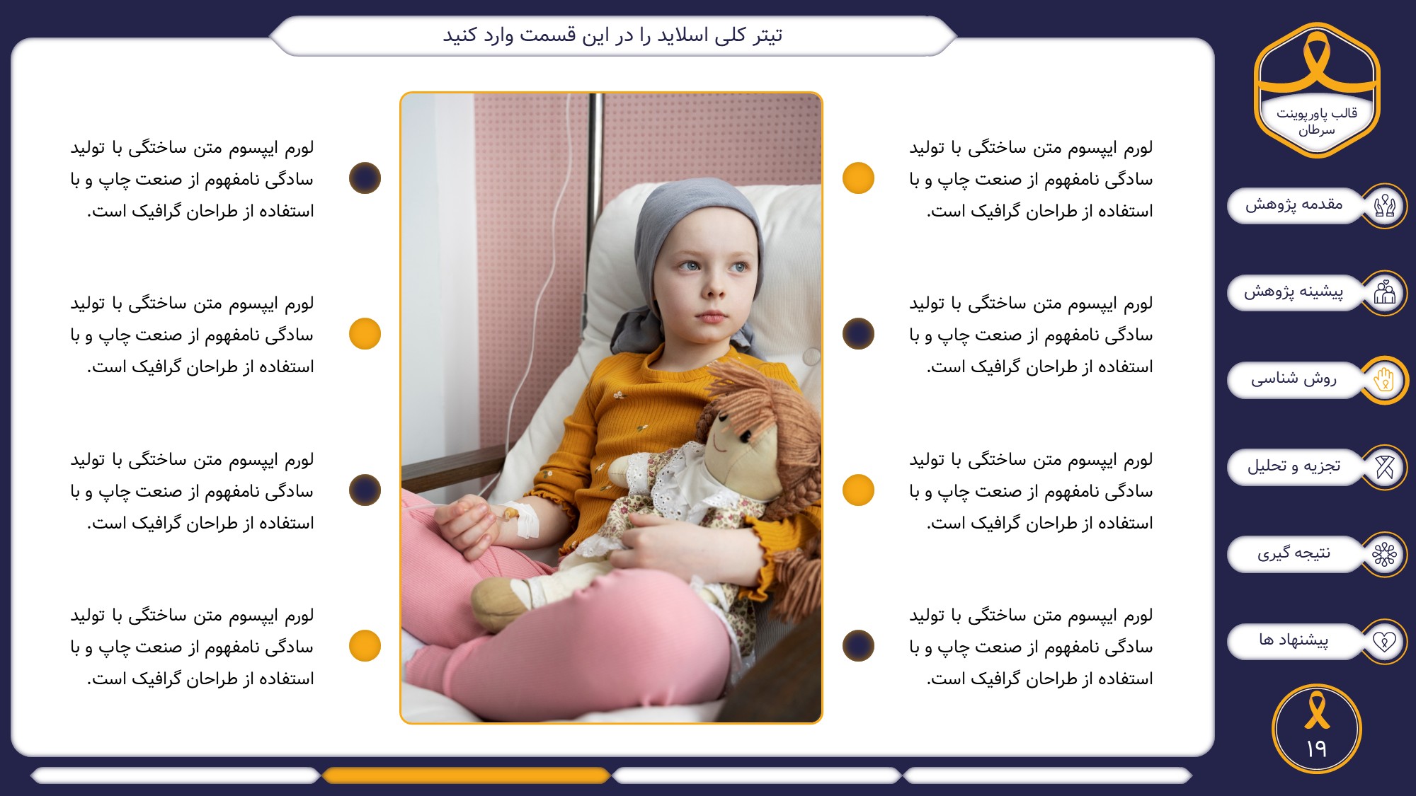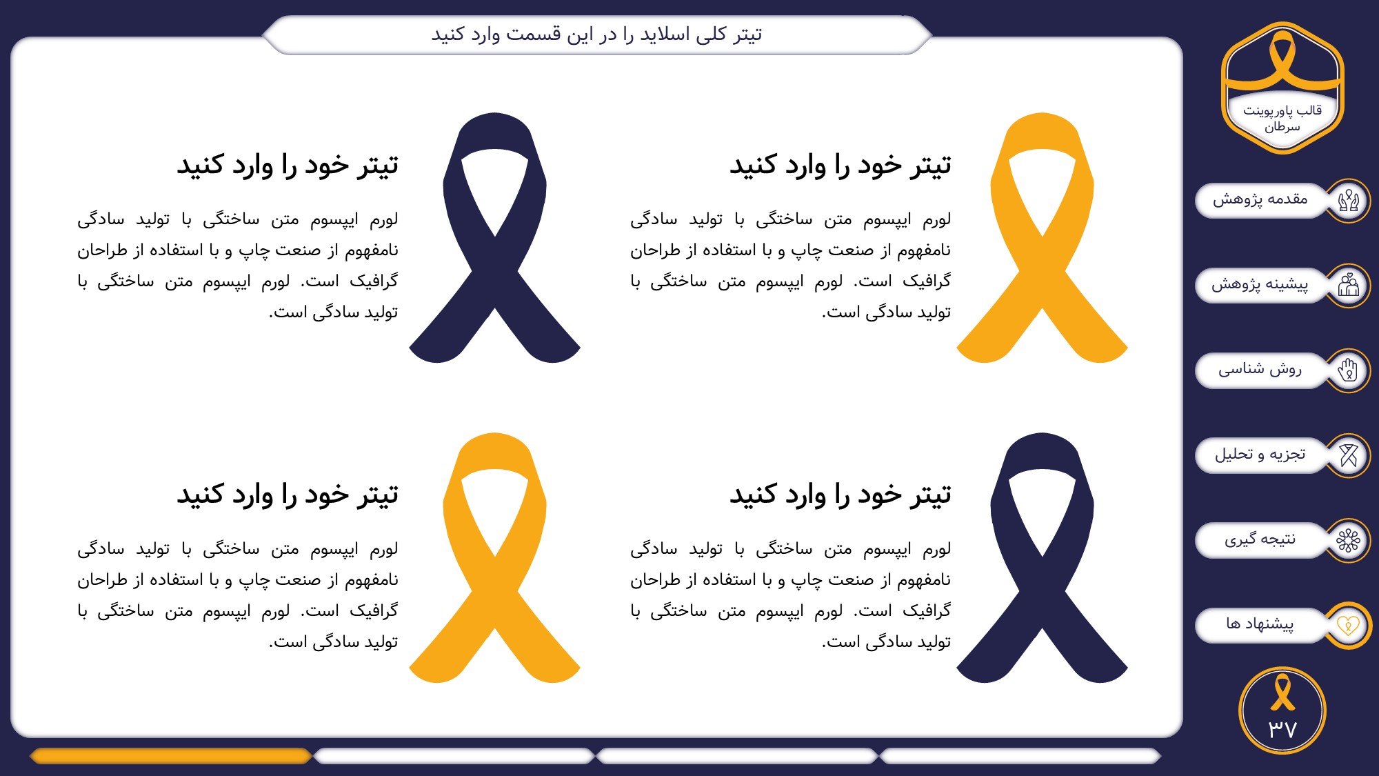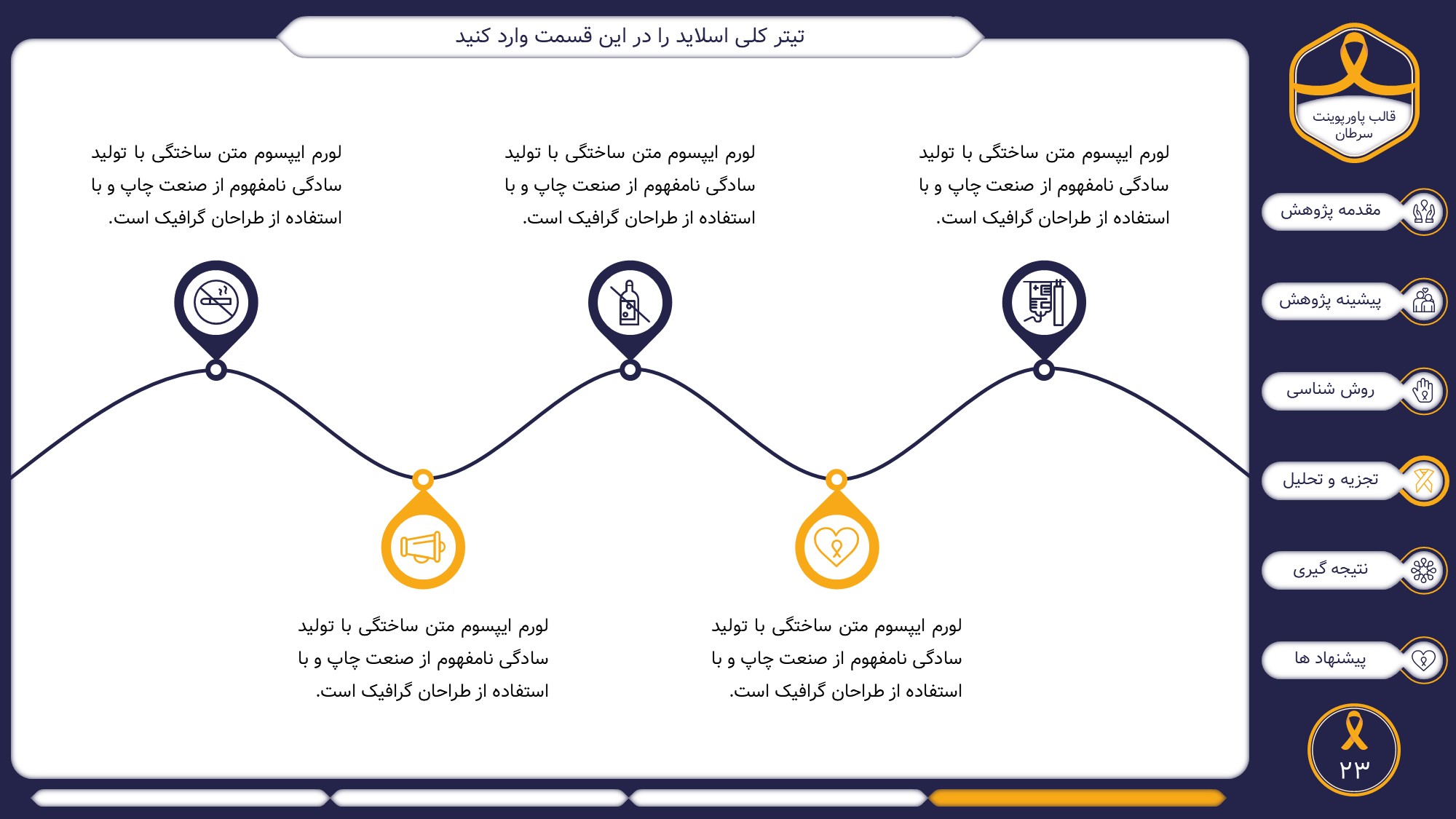 این قالب پاورپوینت دارای 38 اسلاید حرفه ای با رنگ بندی رسمی سرمه ای و زرد است. این تمپلیت در 6 منو طراحی شده است که هر بخش آن دارای اسلایدهای متنی، اسلایدهای تصویری مرتبط با سرطان، اسلایدهای اینفوگرافیک مختص سرطان شناسی است. شما میتوانید تغییرات خود را روی این تم پاورپوینت براحتی پیاده کنید.