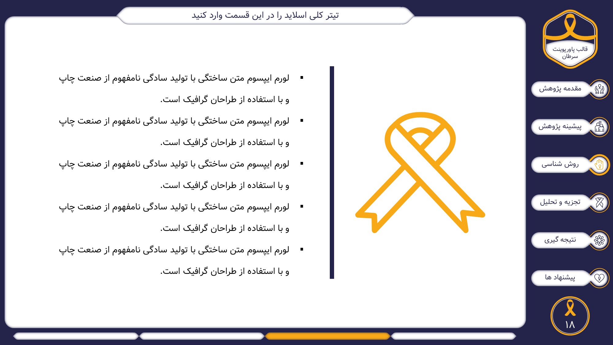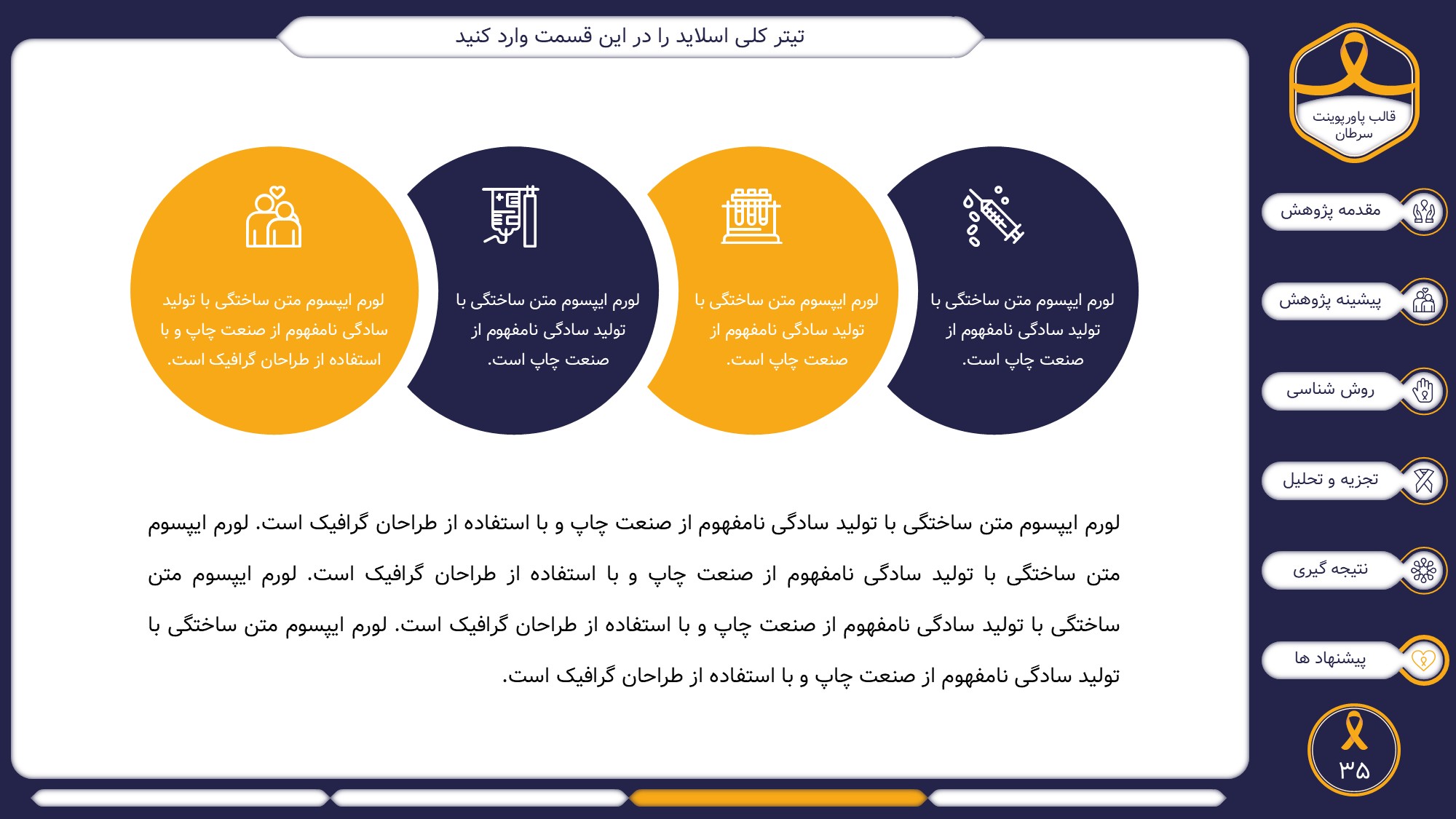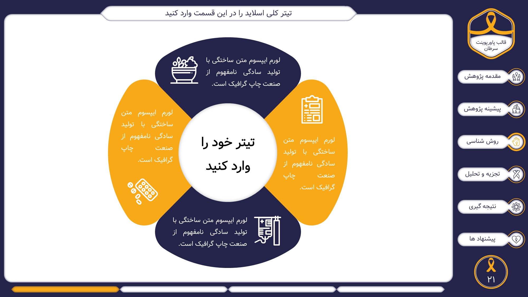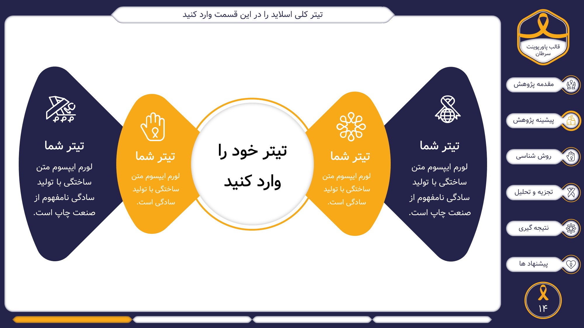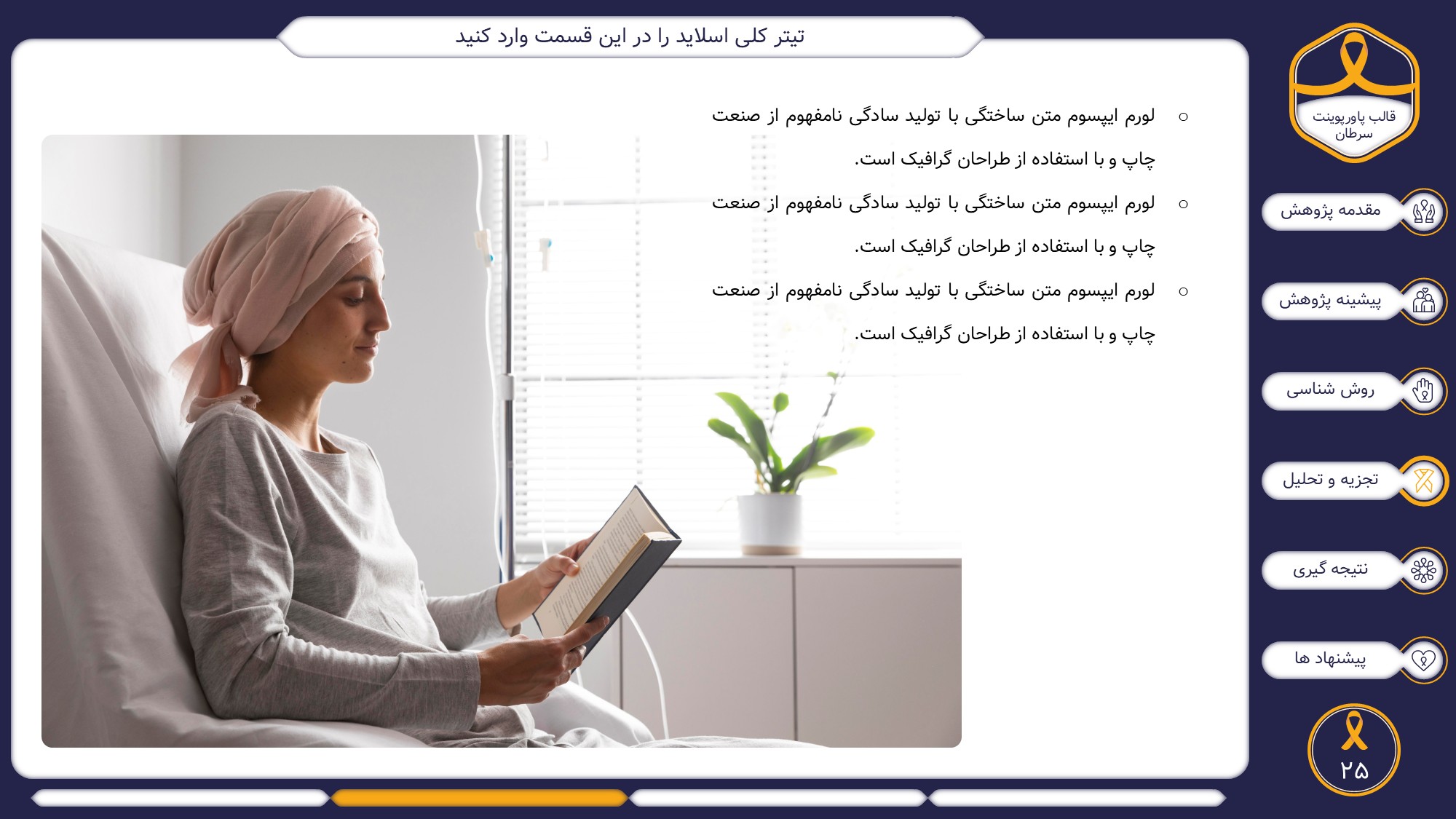این قالب پاورپوینت دارای 38 اسلاید حرفه ای با رنگ بندی رسمی سرمه ای و زرد است. این تمپلیت در 6 منو طراحی شده است که هر بخش آن دارای اسلایدهای متنی، اسلایدهای تصویری مرتبط با سرطان، اسلایدهای اینفوگرافیک مختص سرطان شناسی است. شما میتوانید تغییرات خود را روی این تم پاورپوینت براحتی پیاده کنید.