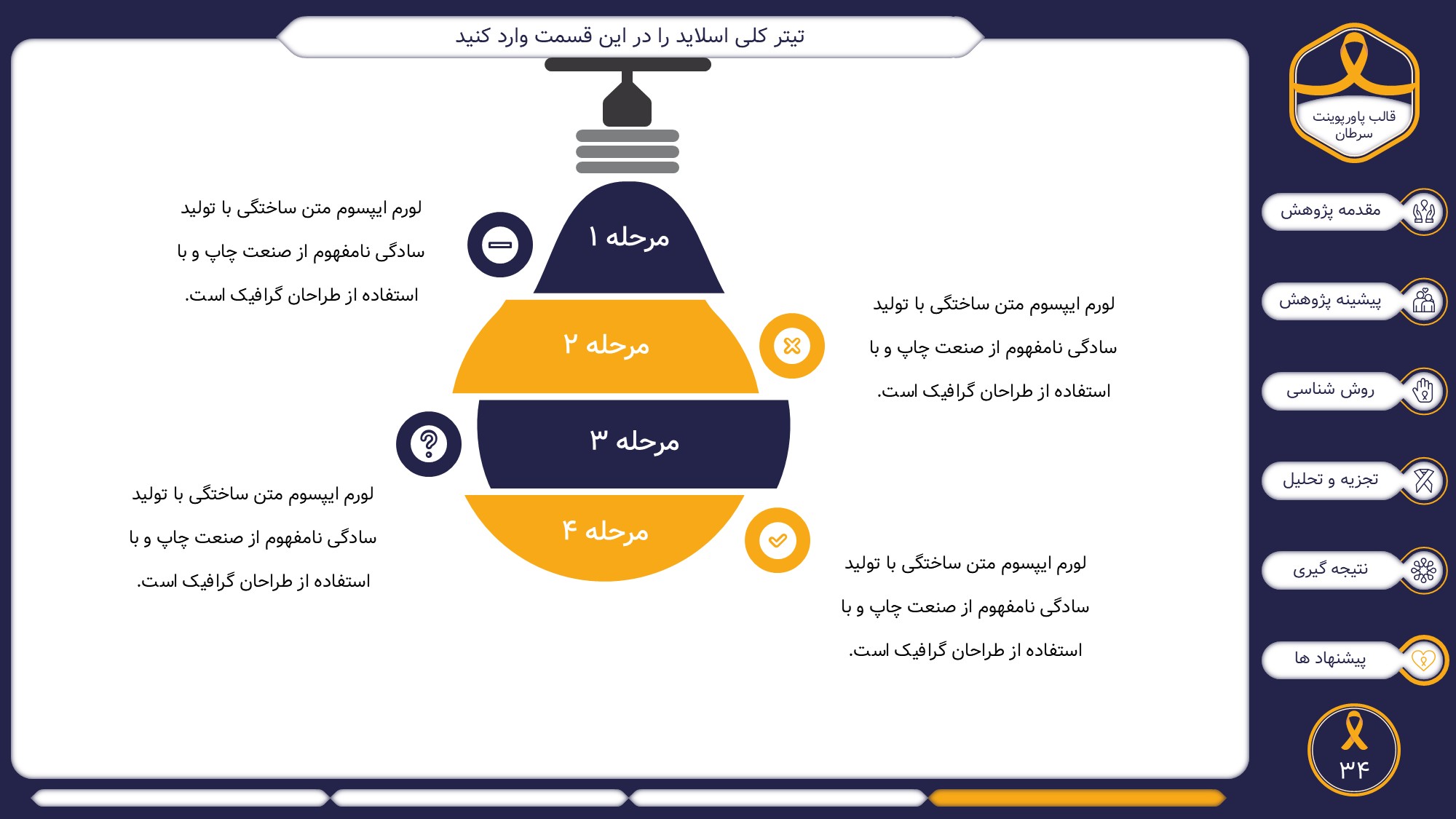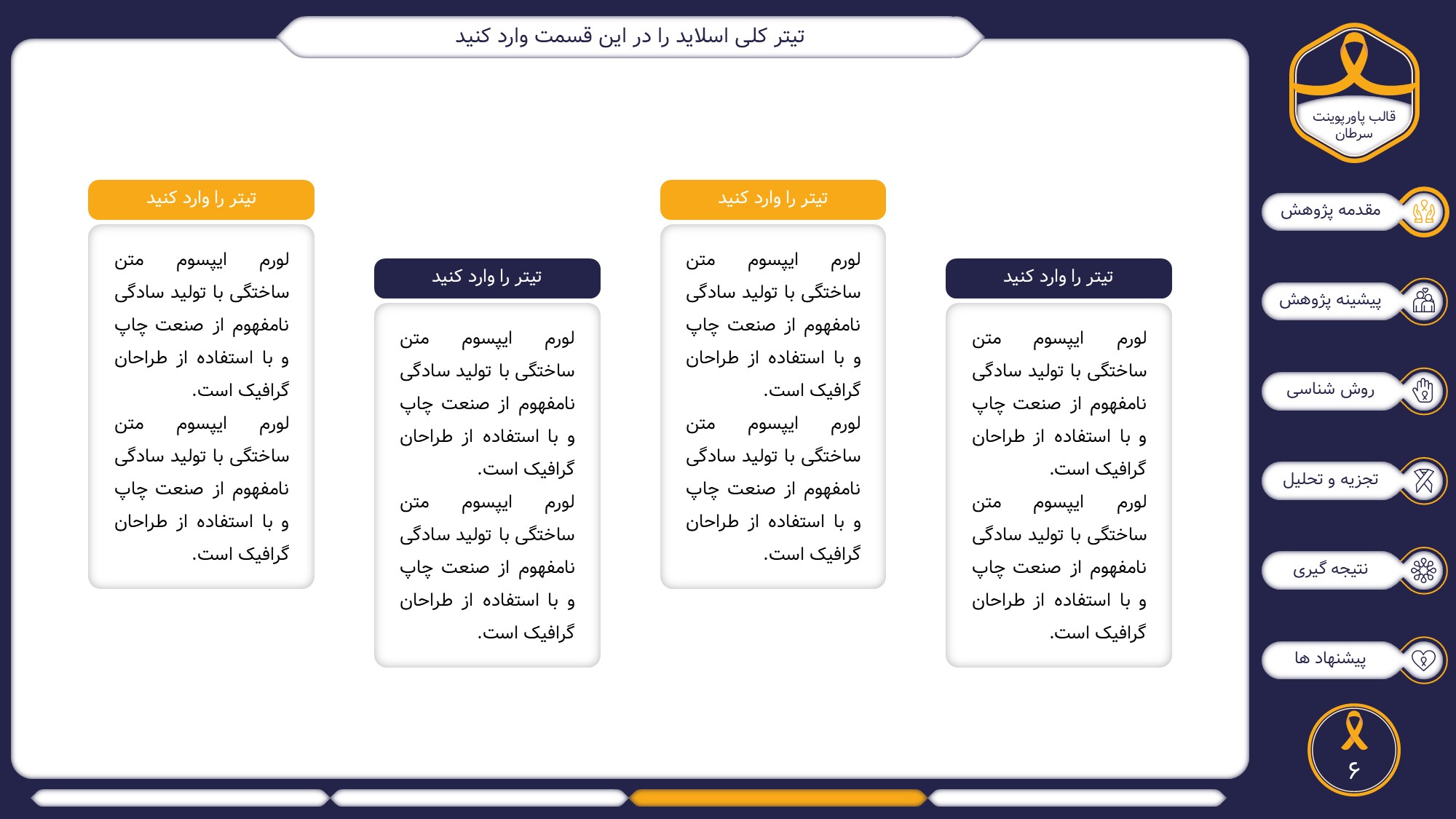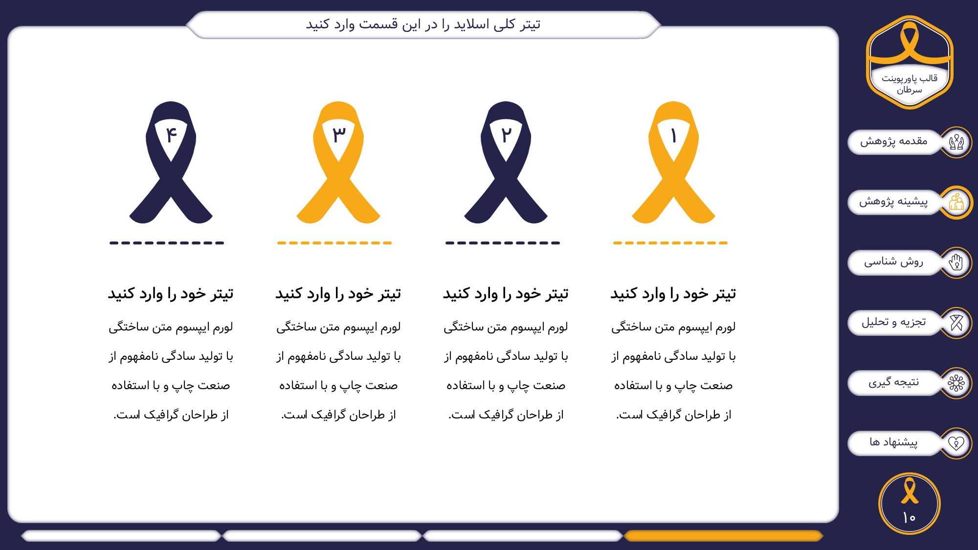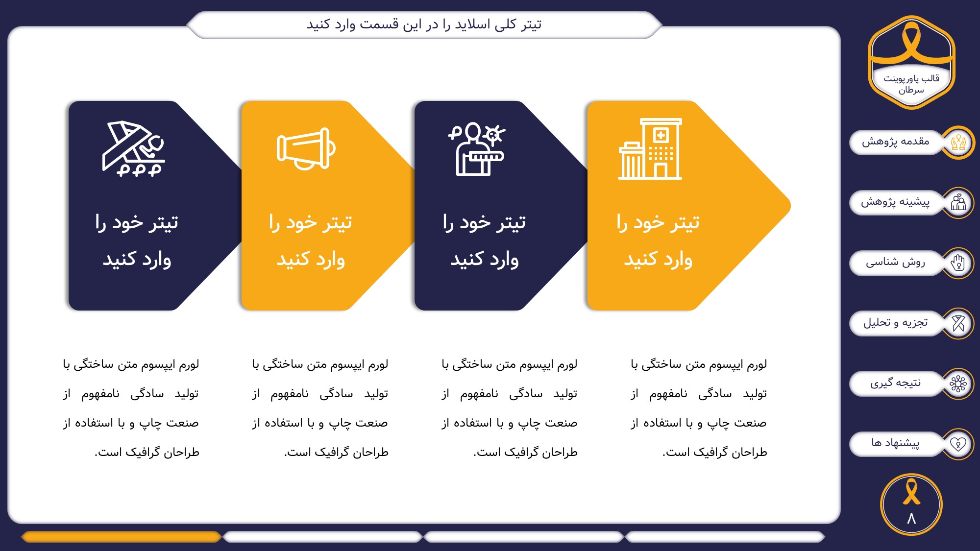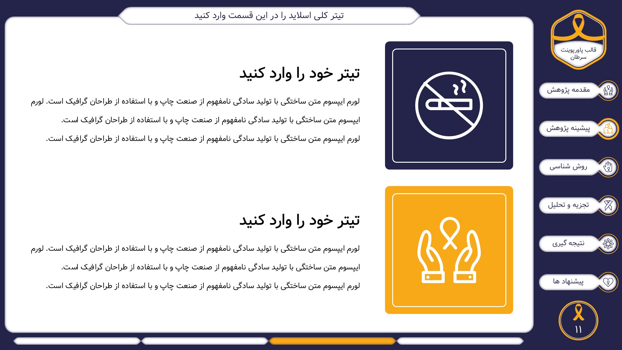 این قالب پاورپوینت دارای 38 اسلاید حرفه ای با رنگ بندی رسمی سرمه ای و زرد است. این تمپلیت در 6 منو طراحی شده است که هر بخش آن دارای اسلایدهای متنی، اسلایدهای تصویری مرتبط با سرطان، اسلایدهای اینفوگرافیک مختص سرطان شناسی است. شما میتوانید تغییرات خود را روی این تم پاورپوینت براحتی پیاده کنید.