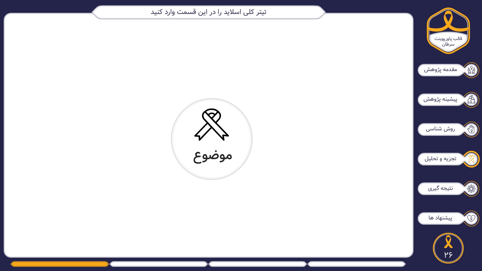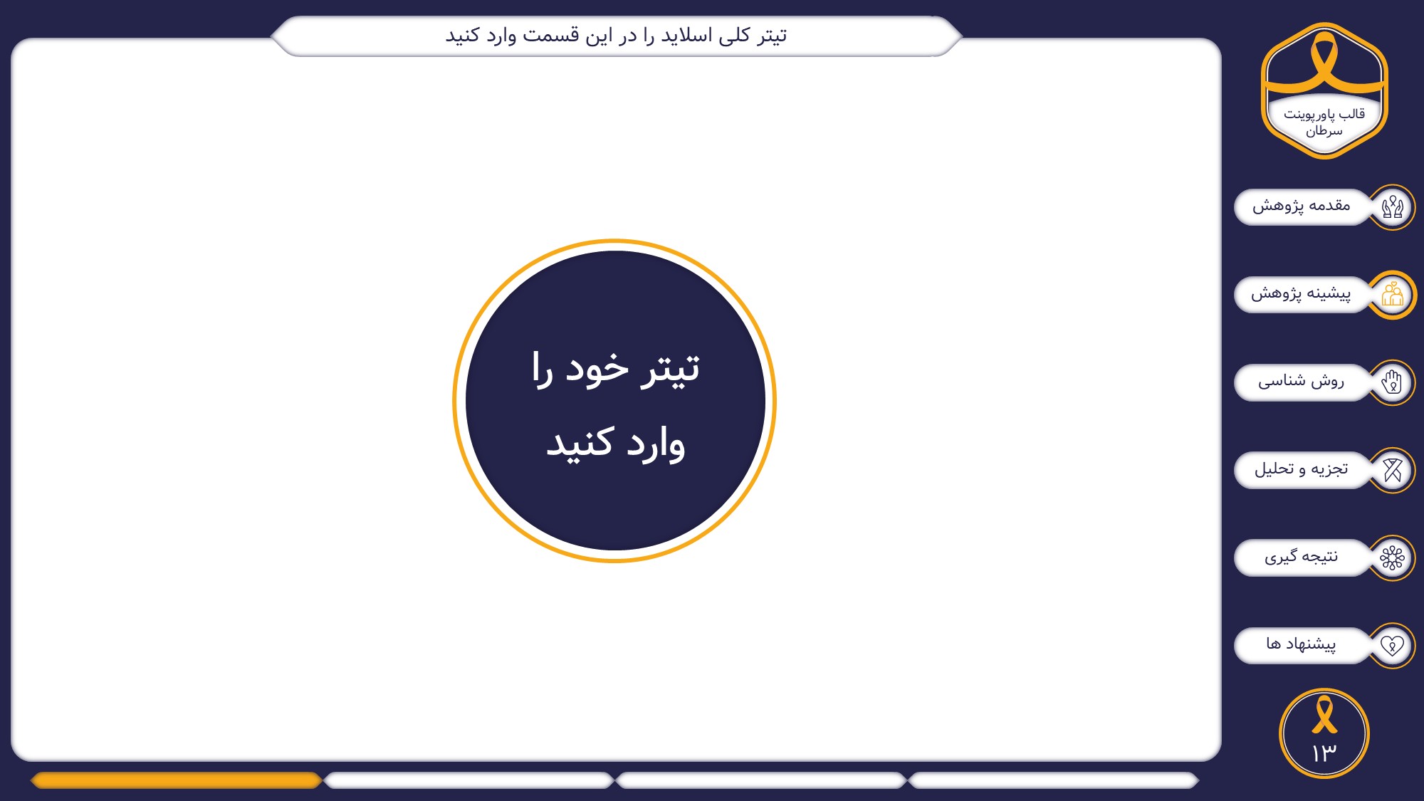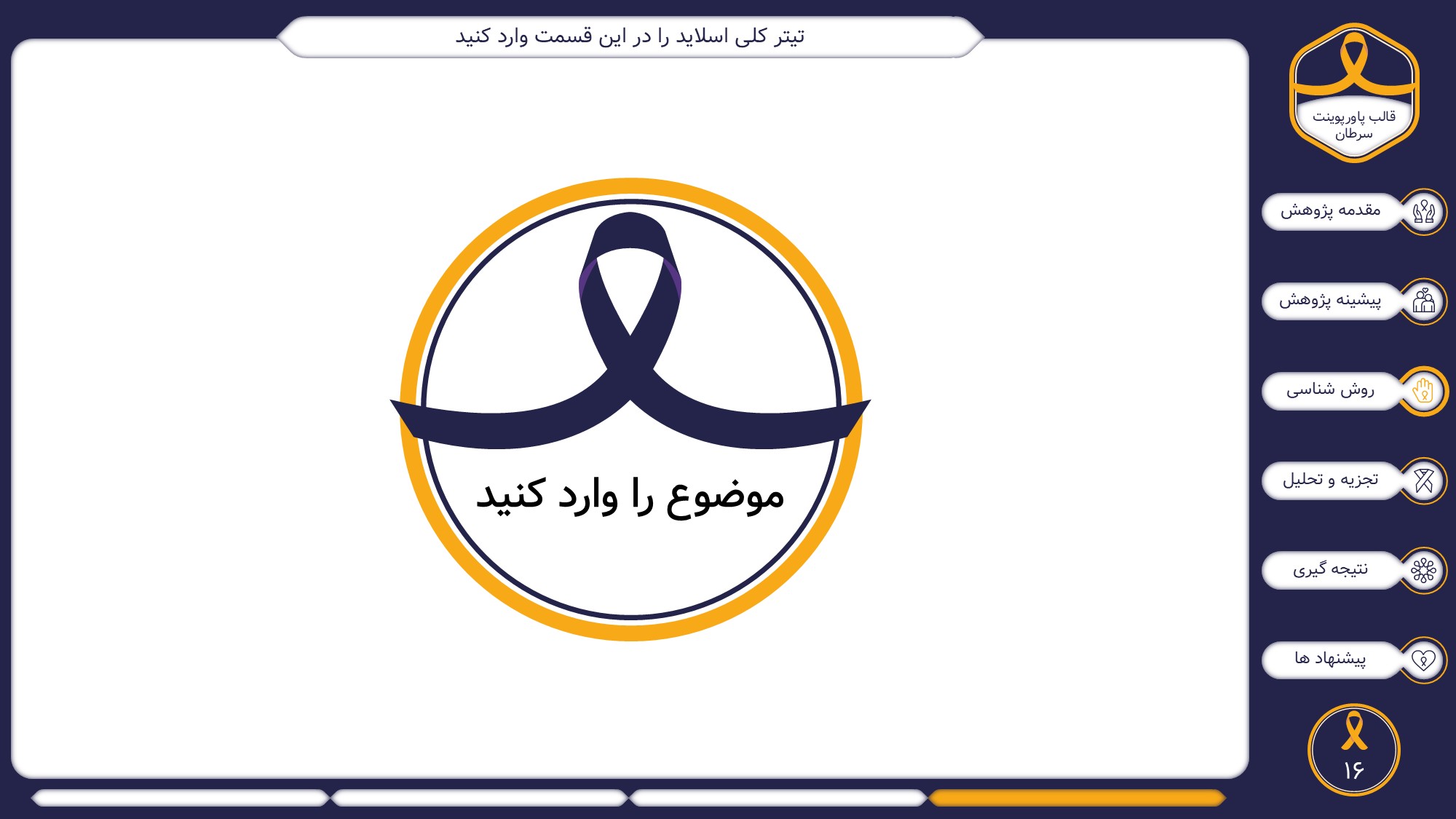 مناسب برای انواع ارائههای سرطان: با توجه به نوع طراحی این قالب، میتوانید از آن برای انواع ارائه پایان نامه ارشد و دکتری در موضوع های پزشکی خصوصا سرطان استفاده کنید.