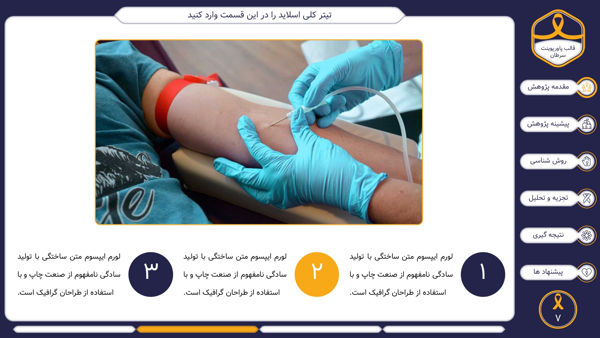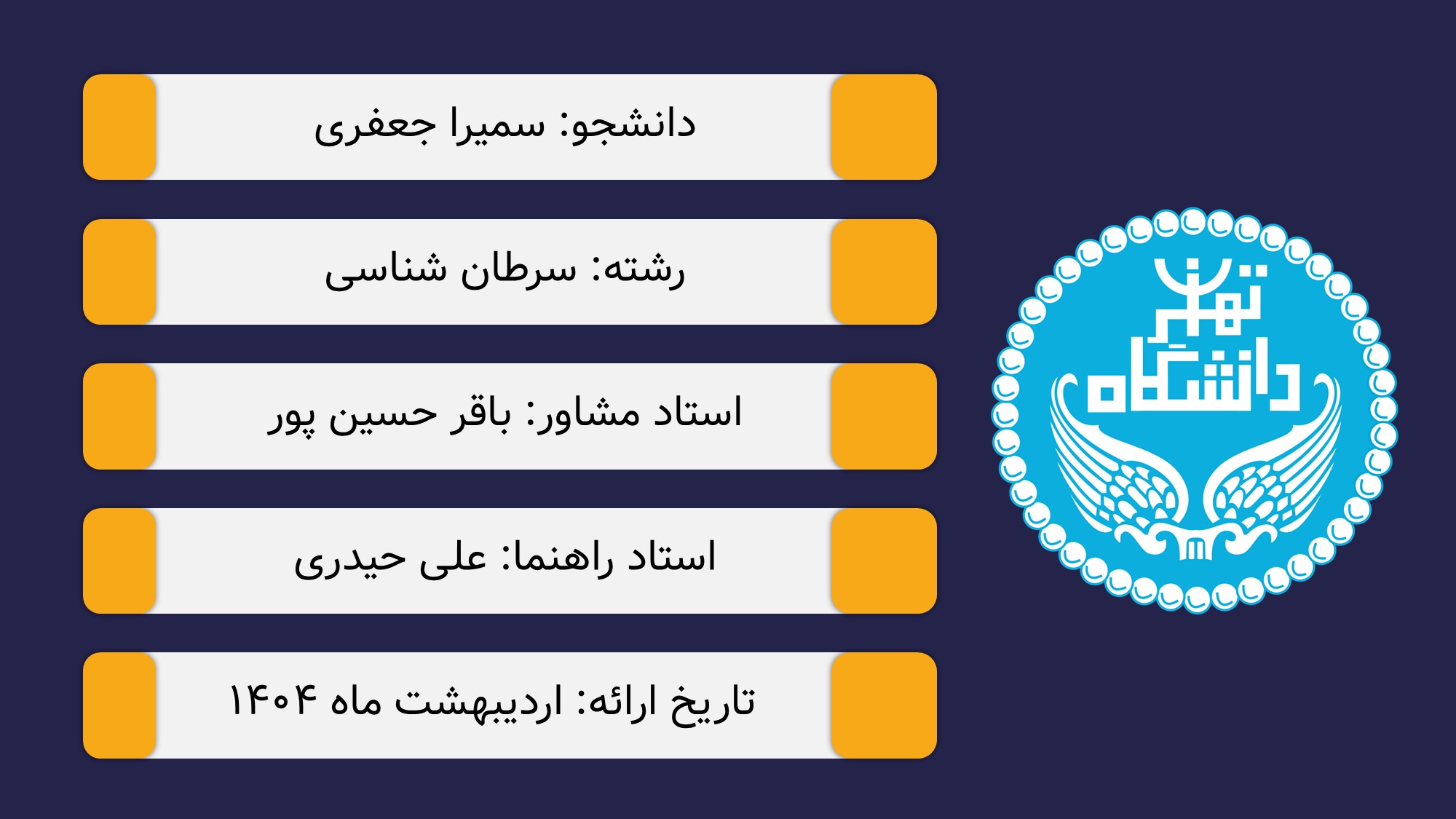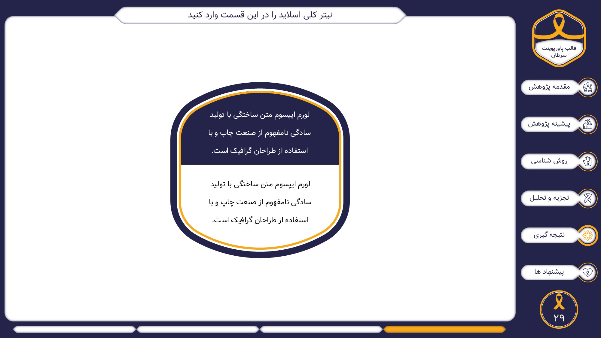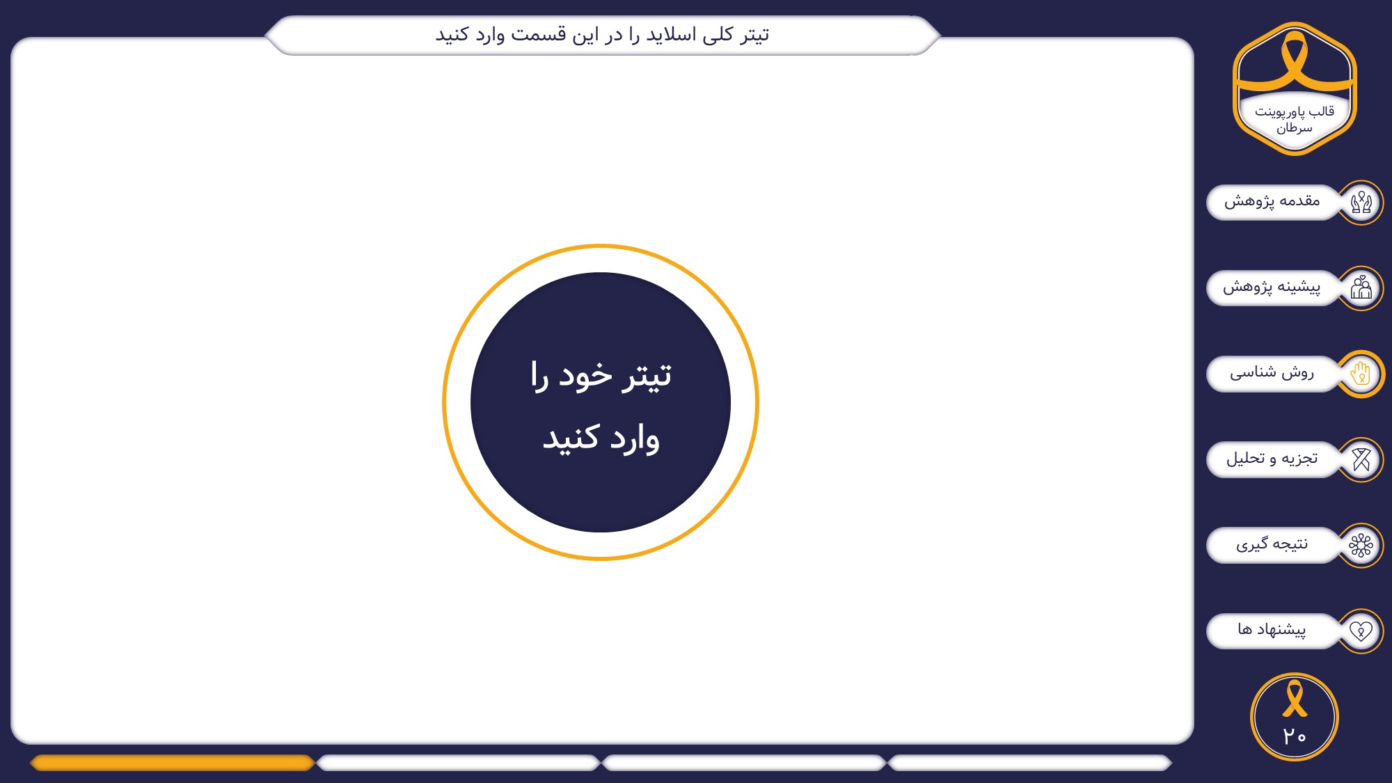 مناسب برای انواع ارائههای سرطان: با توجه به نوع طراحی این قالب، میتوانید از آن برای انواع ارائه پایان نامه ارشد و دکتری در موضوع های پزشکی خصوصا سرطان استفاده کنید.
