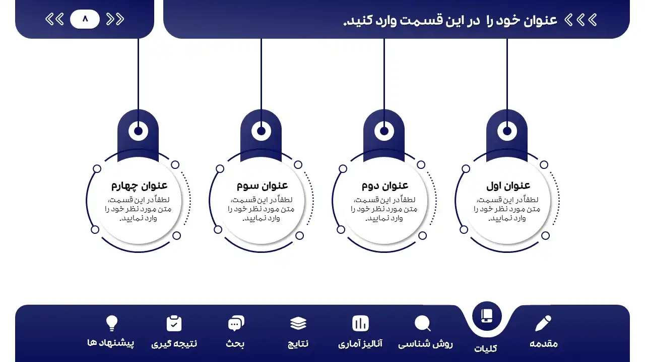 ✅ طراحی به صورت منودار در 8 فصل: همانطور که در تصاویر و ویدئوی پیش‌نمایش مشاهده کردید، منوی این پاورپوینت در 8 بخش طراحی شده است که اسامی بخش‌ها به راحتی ویرایش می‌شود.