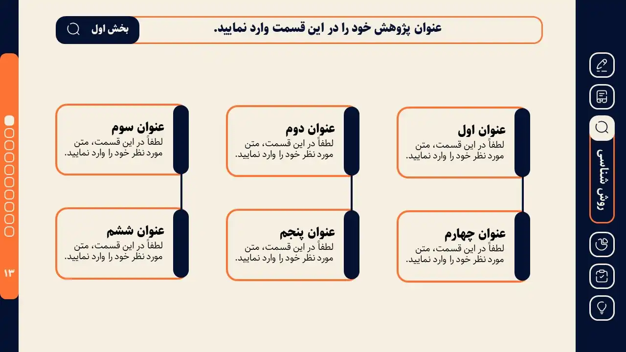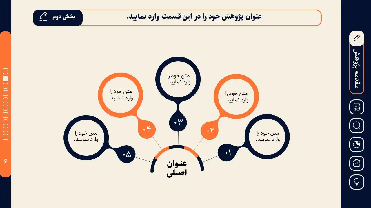 ✅ طراحی به صورت منودار در 6 فصل: همانطور که در تصاویر و ویدئوی پیشنمایش مشاهده کردید، منوی این پاورپوینت در 6 بخش طراحی شده است که اسامی بخشها به راحتی ویرایش میشود.