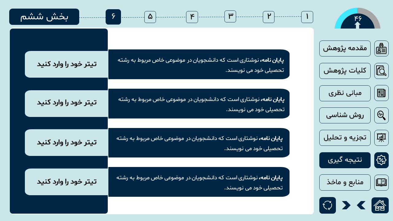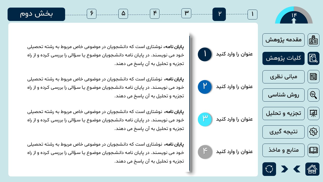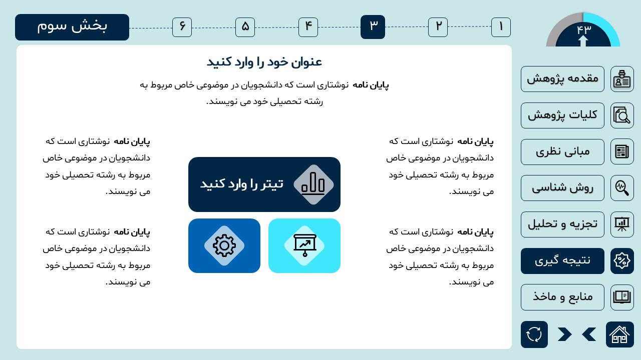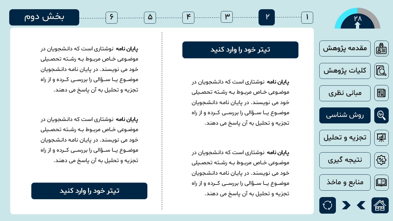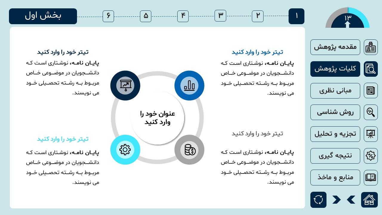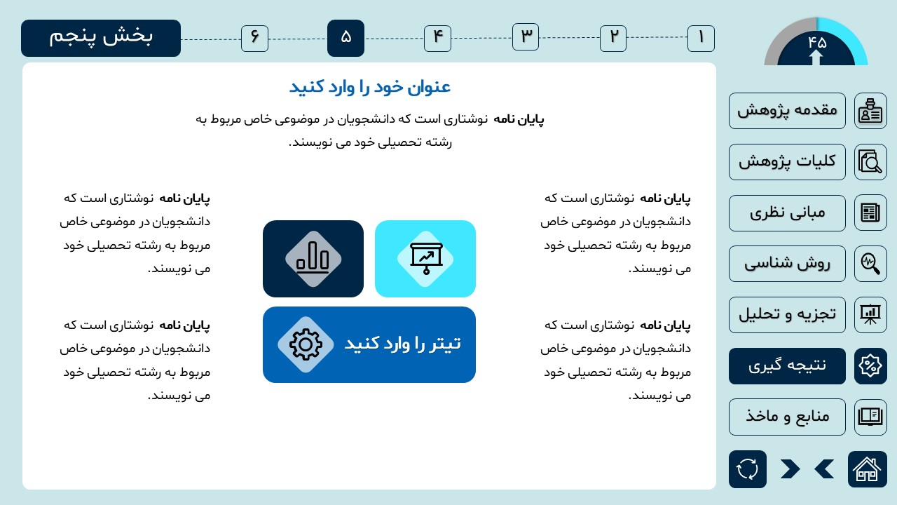 مناسب برای انواع ارائههای دانشگاهی و پایان نامه: با توجه به سبک طراحی این پاورپوینت، از این کار میتوانید برای ارائههای دانشگاهی مثل پایان نامه و پروپوزال استفاده کنید.