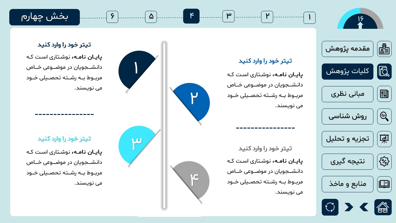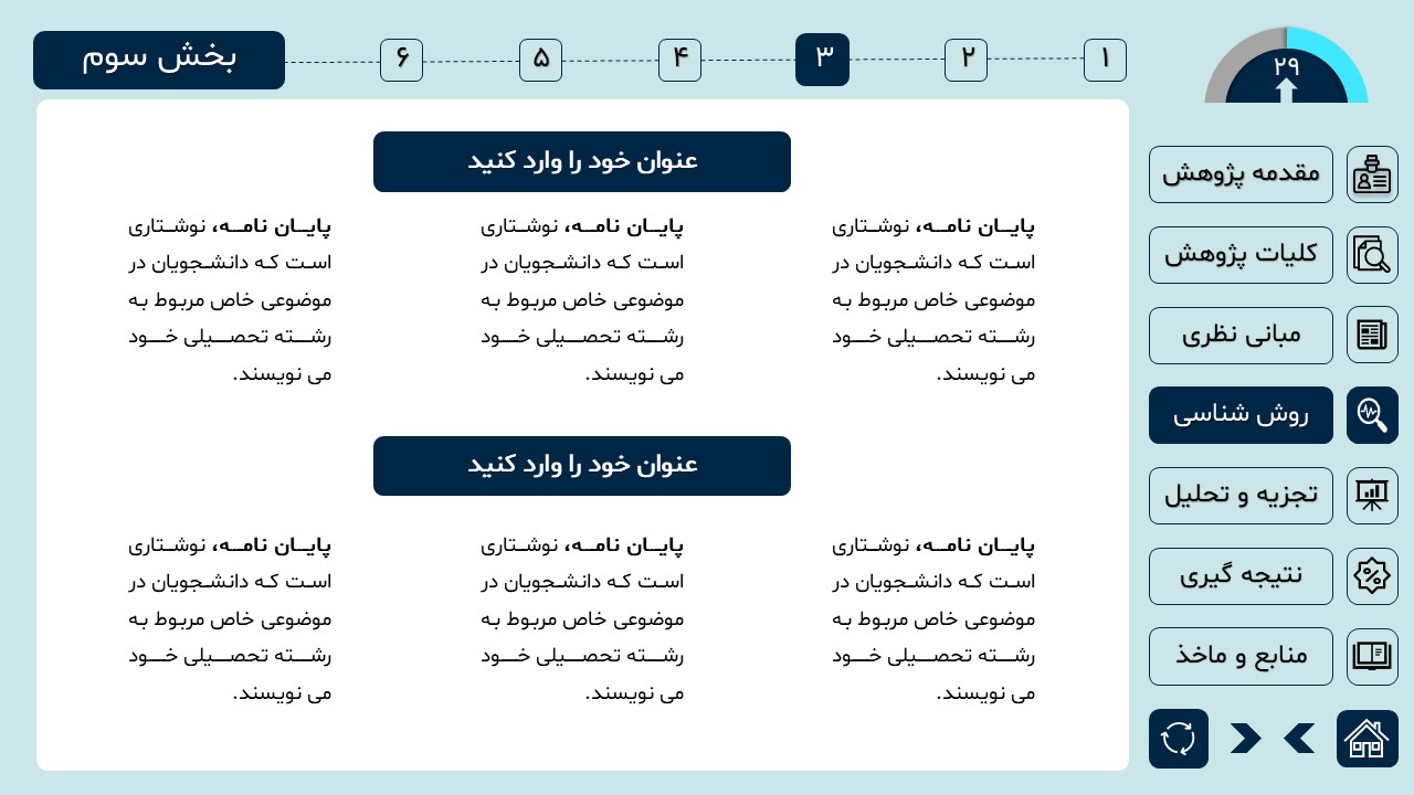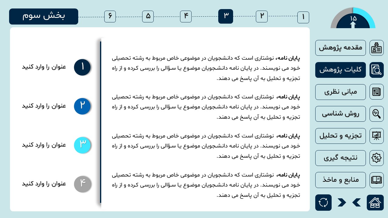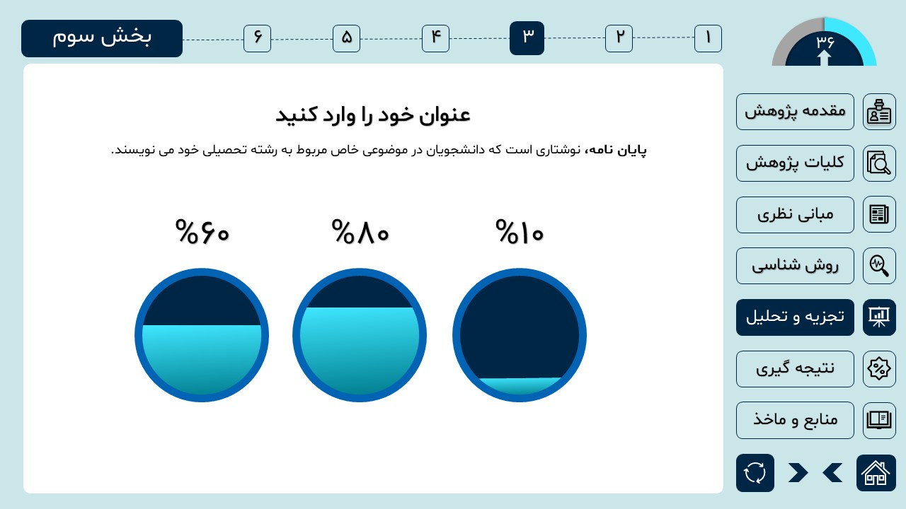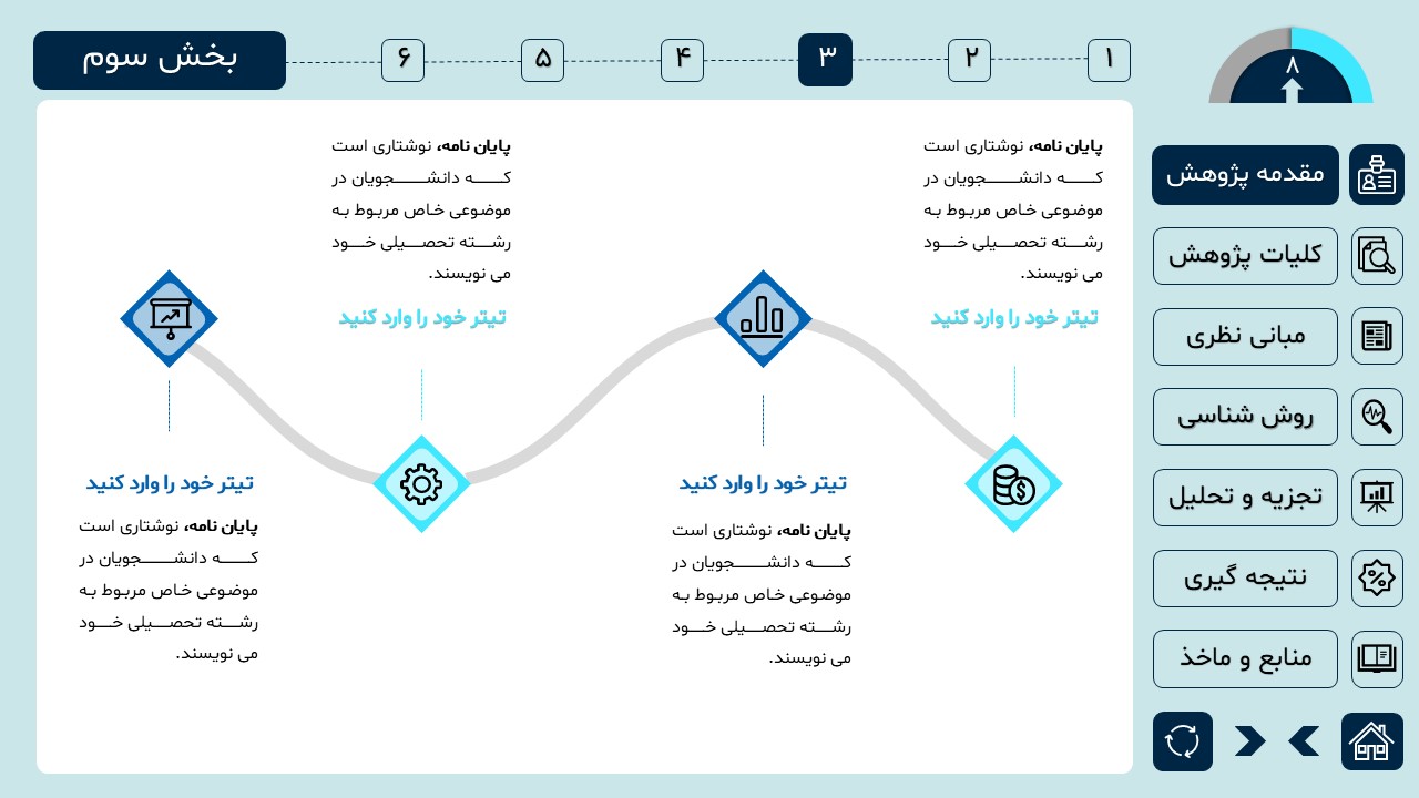 مناسب برای انواع ارائههای دانشگاهی و پایان نامه: با توجه به سبک طراحی این پاورپوینت، از این کار میتوانید برای ارائههای دانشگاهی مثل پایان نامه و پروپوزال استفاده کنید.