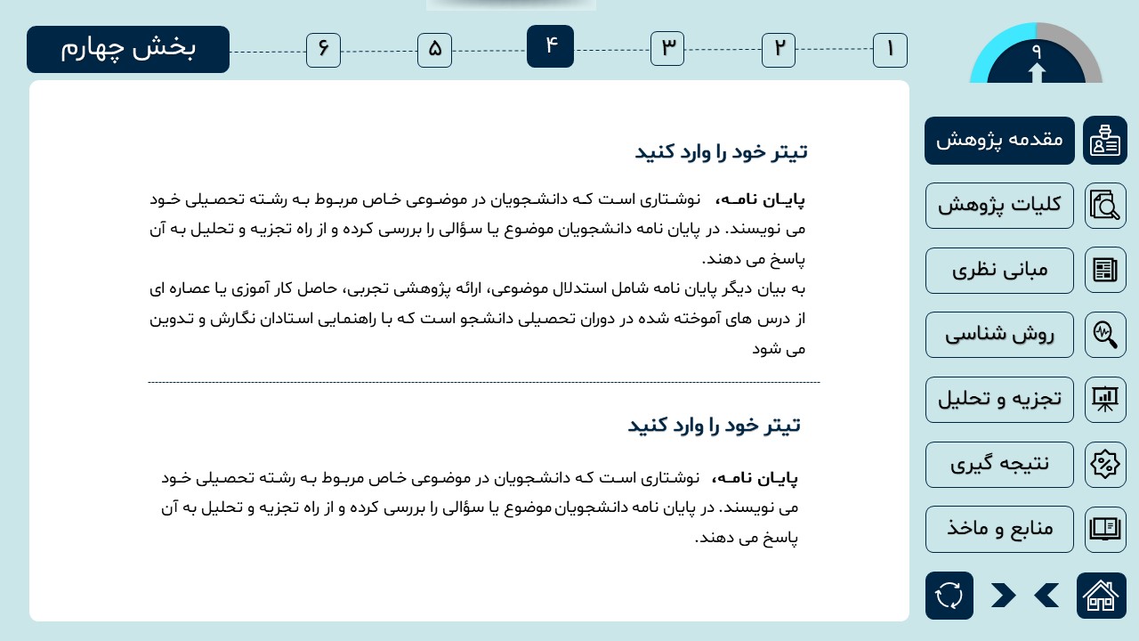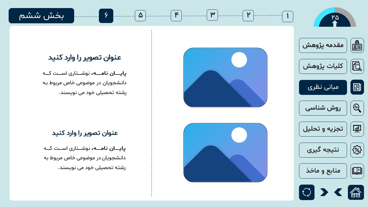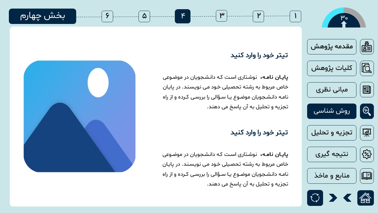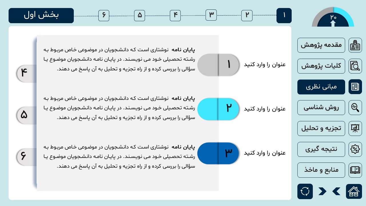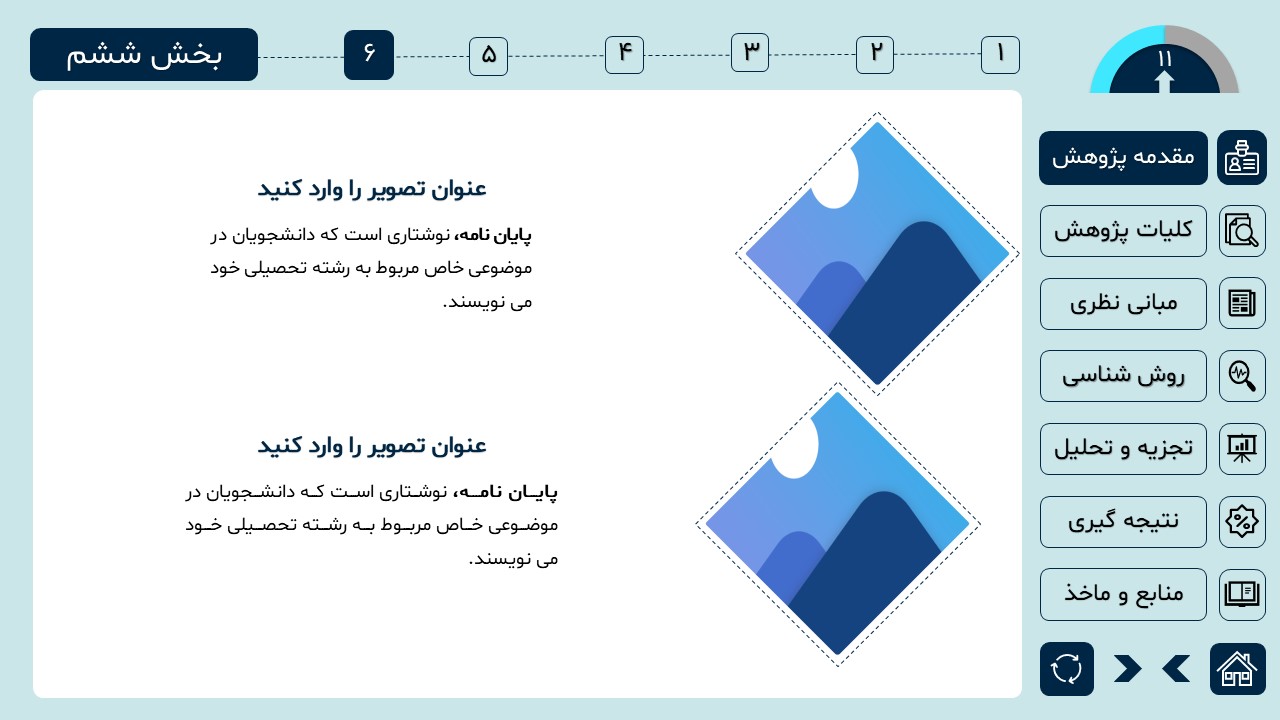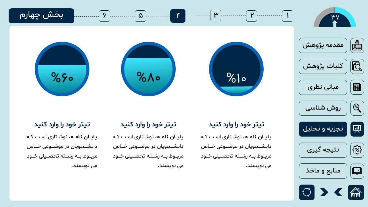 مناسب برای انواع ارائههای دانشگاهی و پایان نامه: با توجه به سبک طراحی این پاورپوینت، از این کار میتوانید برای ارائههای دانشگاهی مثل پایان نامه و پروپوزال استفاده کنید.