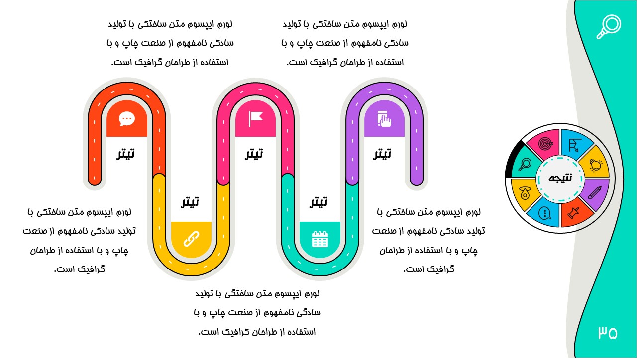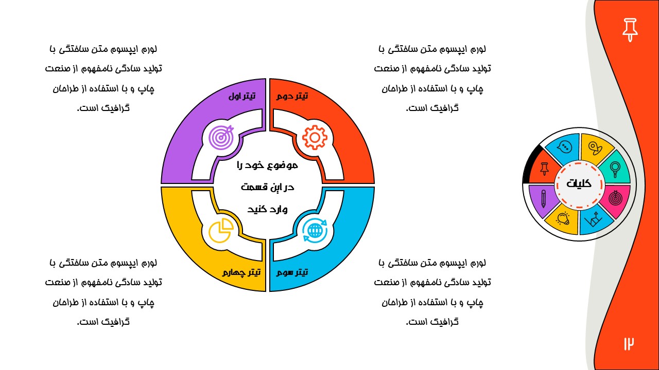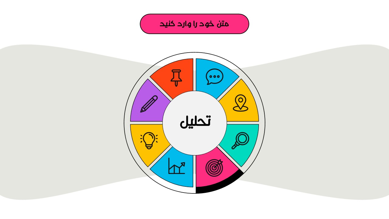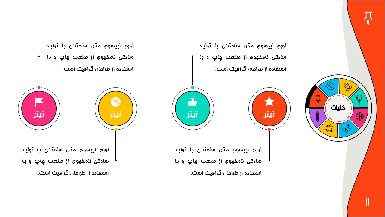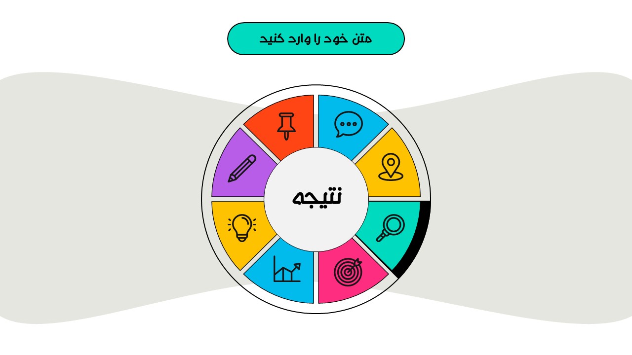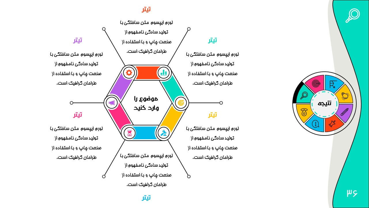 هر بخش این تم دو اسلاید اینفوگرافیک مختلف دارد که هرکدام ویژگی های خاص خود را دارند. همچنین منوی رنگی دایره ای به زیباتر بودن این قالب اضافه میکند. در این قالب حرفه ای میتوانید هر ویرایشی خواستید اعمال کنید.